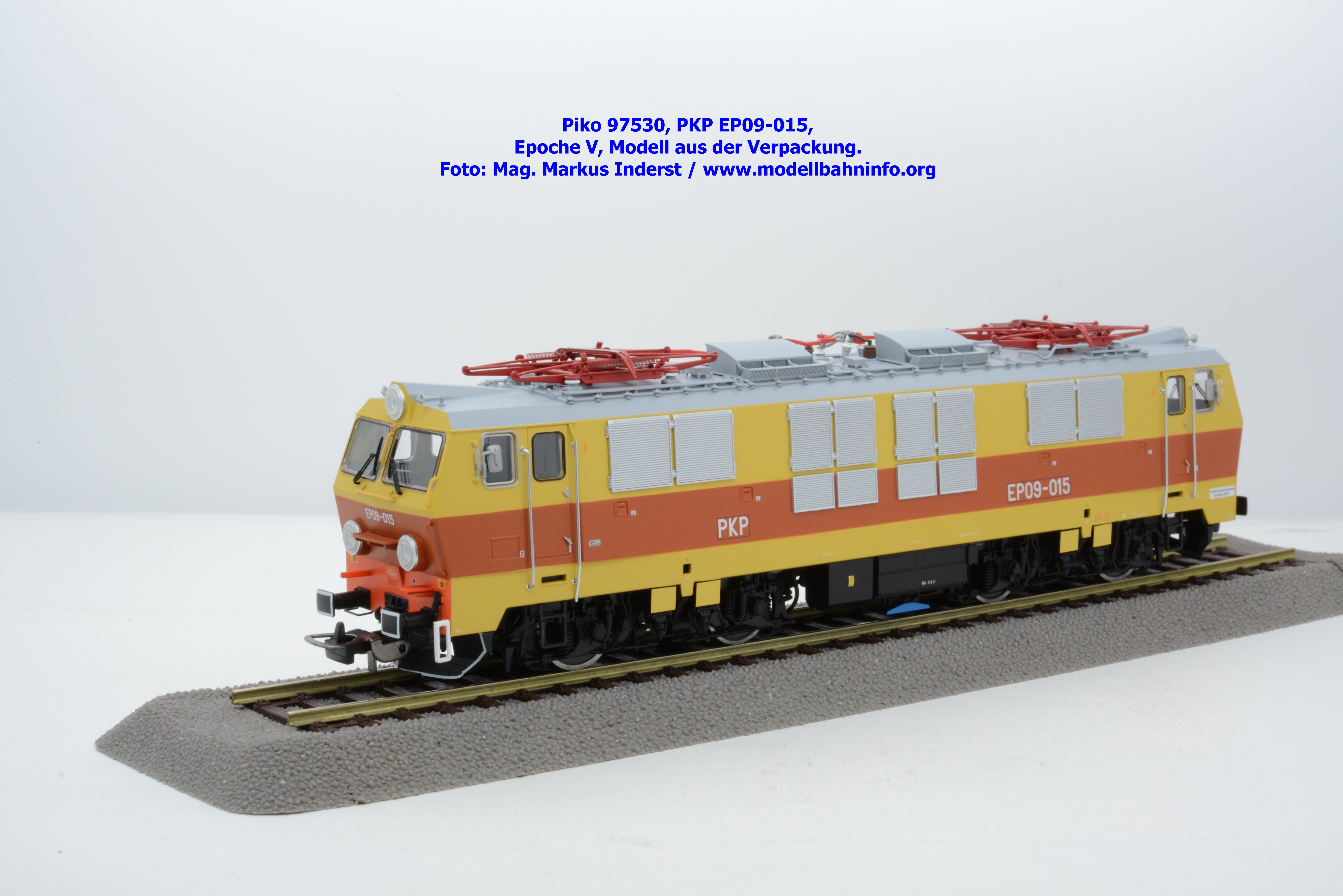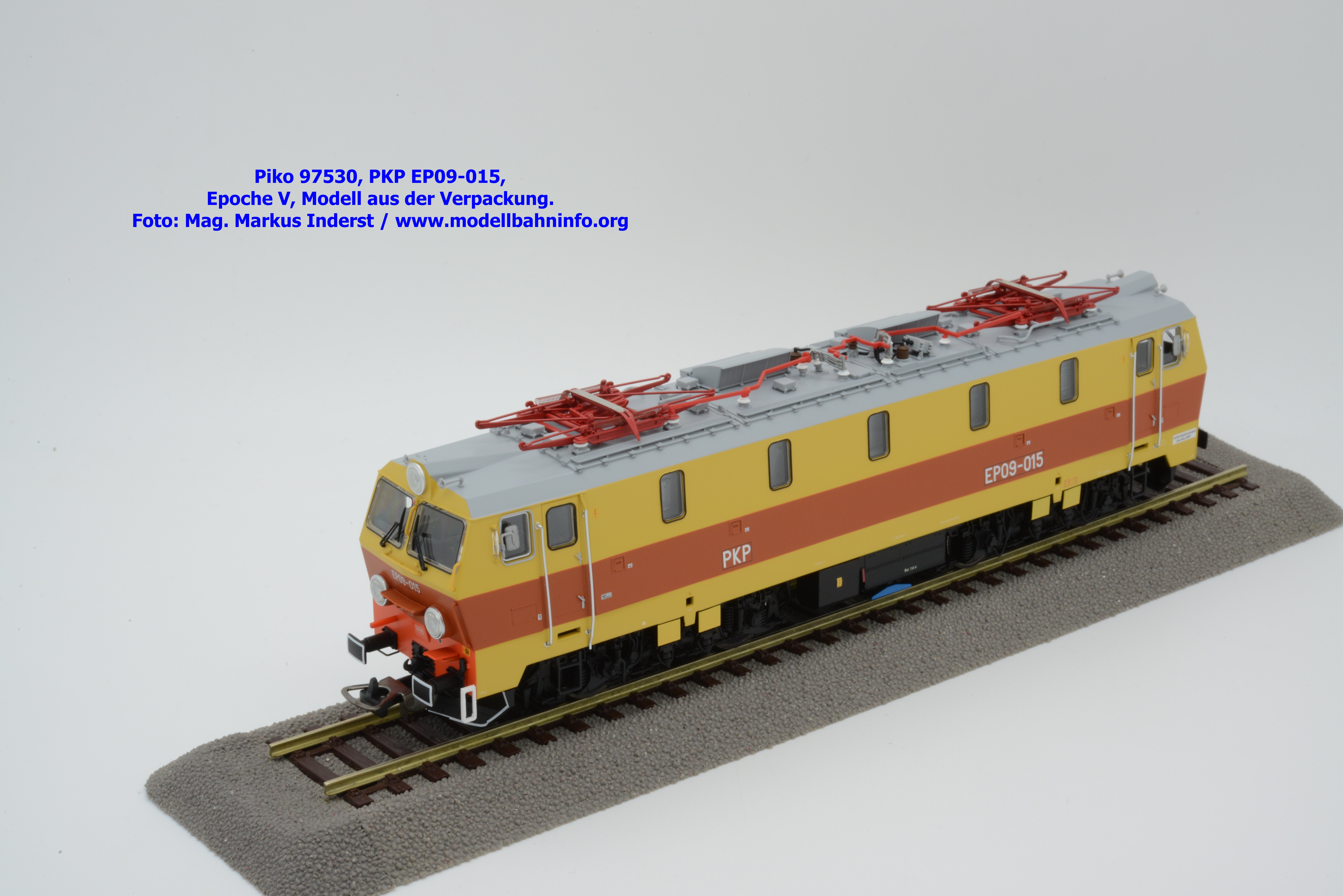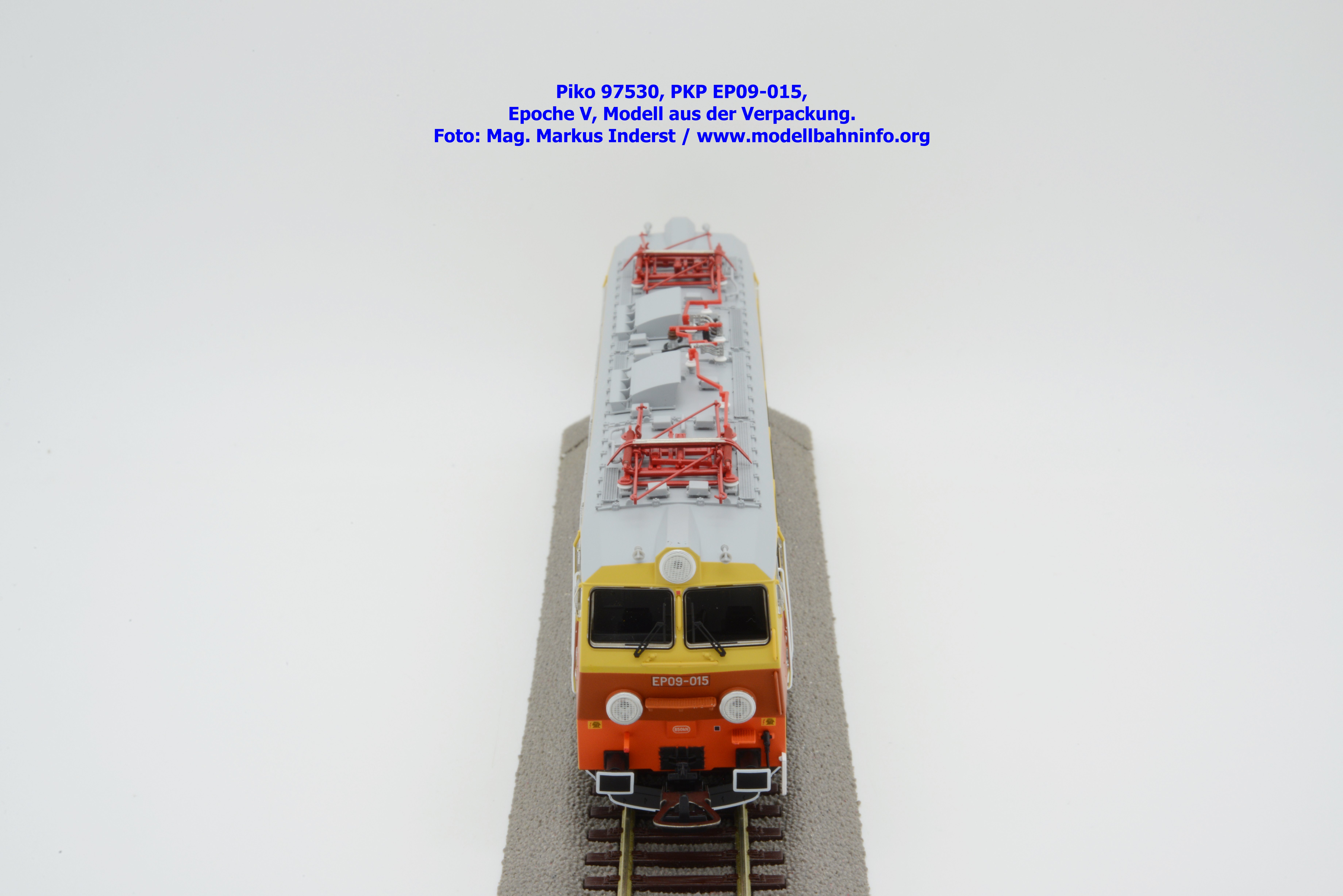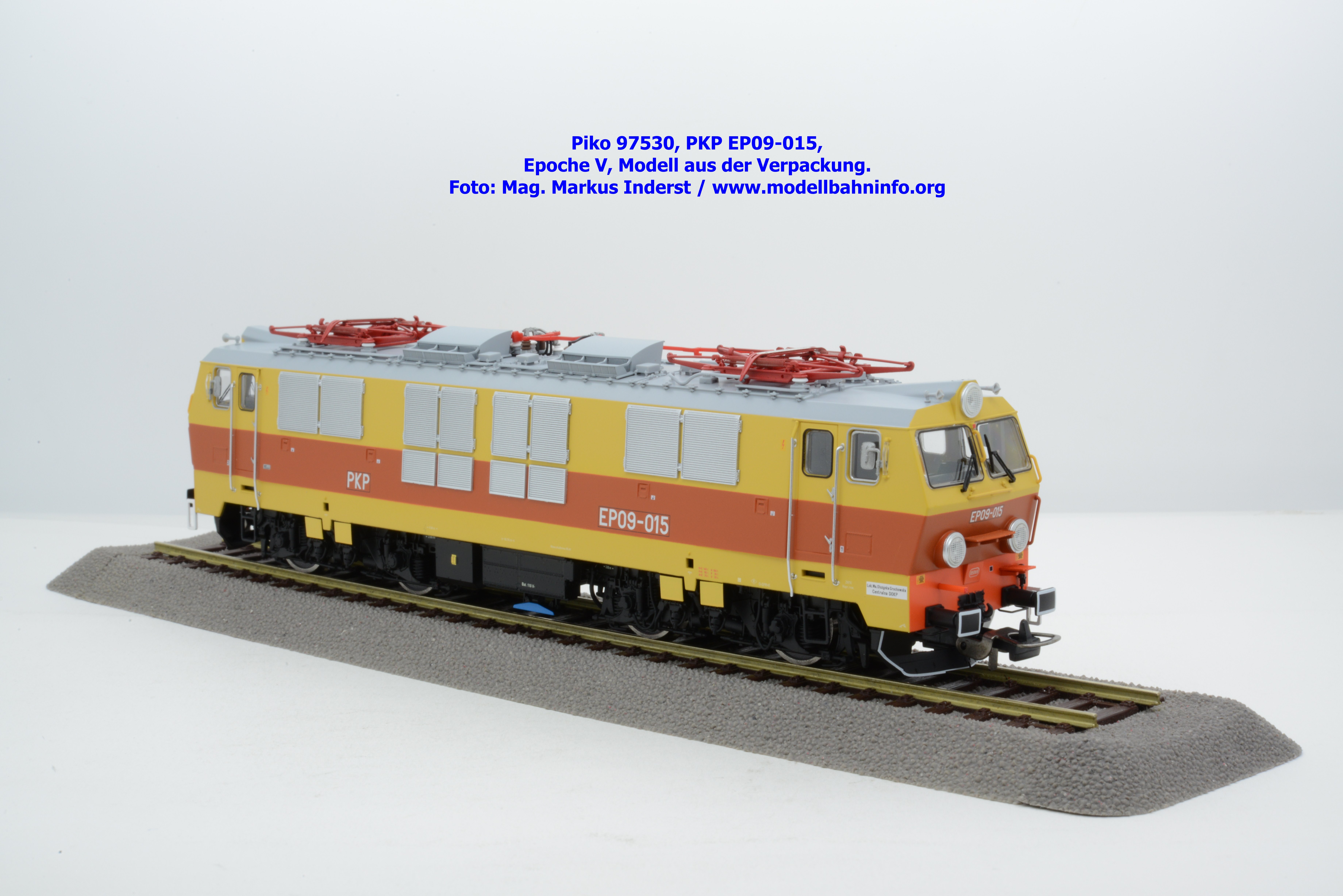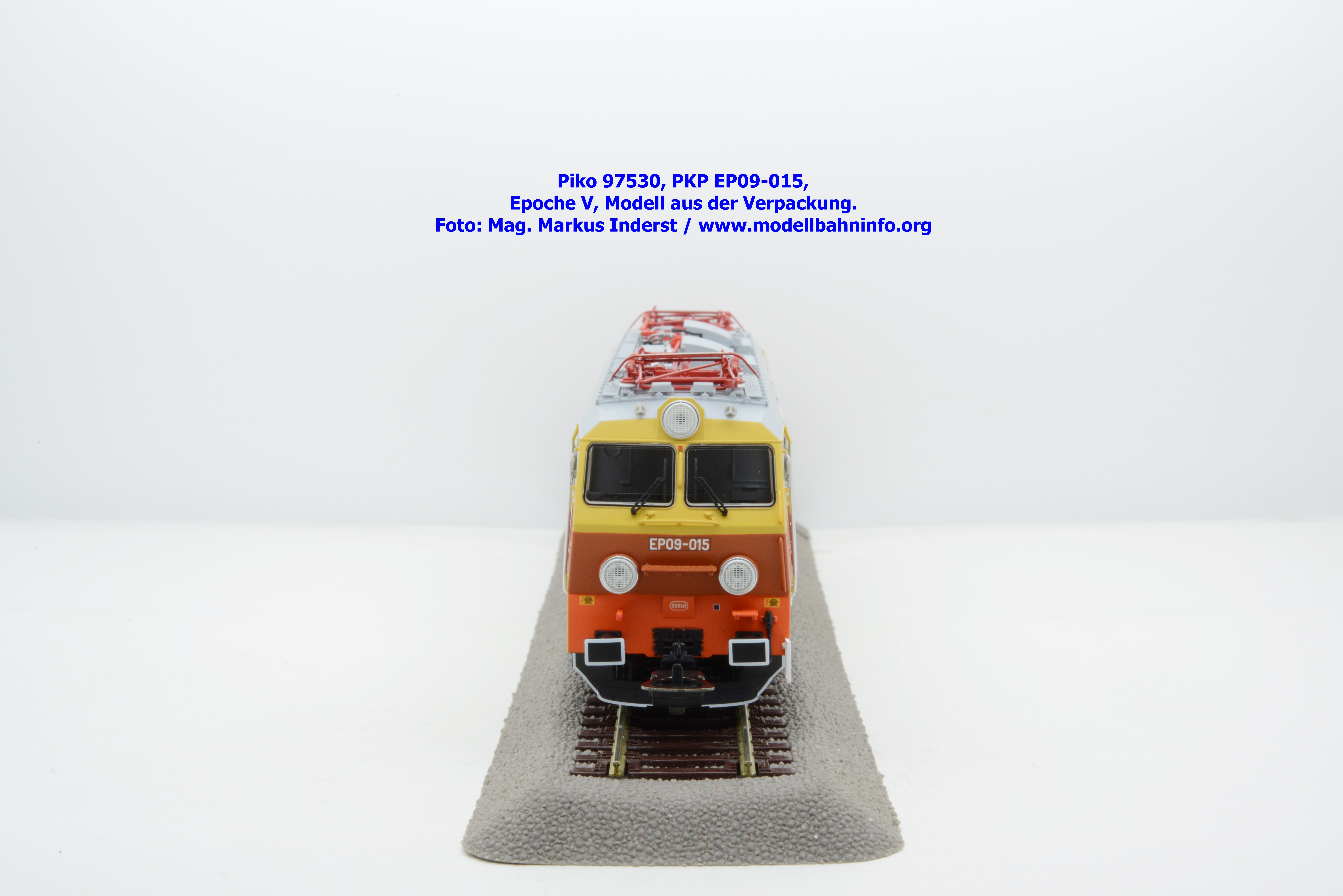 Das vierte Modell der EP 09 sieht eine weitere Farb- und Beschriftungsvariante dar, die diesmal auf den ersten Blick fast gänzlich in gelber Farbe lackiert ist. Doch der Schein trügt, denn das Modell verfügt über eine hellorange Bauchbinde. Das vorliegende Modell wurde mit der Loknummer EP 09-001 beschriftet. Allerdings sind am Modell keine Revisionsdaten zu finden. Im weißen Quader unterhalb des rechten Führerstandes ist die Beheimatungsangaben Lok. Kr. – Prokocim, DOKP Poludniowa. Gegenüber den früheren Ausführungen kommen hierbei vor allem die silbern ausgeführten Rückspiegel sehr gut zur Geltung. Das Modell wird von Piko in zwei Ausführung des Zweileiter-Gleichstromsystems offeriert. Die analoge Modellausführung weist den UVP von € 249,– auf, währenddessen die digitale Modellausführung mit dem Piko Digital-Decoder unter der Artikelnummer zum UVP von € 359,– erhältlich ist.