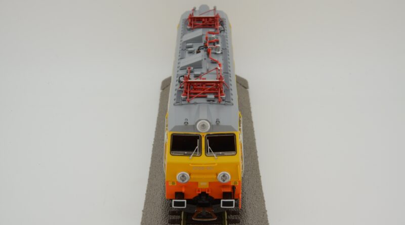 Der Blick auf das Dach bringt weitere Detaillierungen hervor. Das Modell ist mit zwei neukonstruierten Einholmstromabnehmern bestückt. Am Dach sind verschiedene Dachstege eingesetzt, die als lackierte Ätzteile ausgeführt sind. Des weiteren wurden dort die vier Dachfelder mit allen Befestigungsteilen wunderschön realisiert und darauf sowohl die weißen Dachisolatoren wie auch die rote Dachleitung montiert. Zudem sind auf dem Dach verschiedene Aufbauten unterschiedlicher Größe berücksichtigt worden. Über dem Führerstand ist das aufgesetzte Klimagerät zu sehen. Die Drehgestellblenden der Neukonstruktion sind dreidimensional durchgebildet und weisen mehrere Leitungsführungen auf. Die Bremsbacken sind auf Radlaufebene situiert, zudem wurden die Sandfallrohre bis knapp über die Schienenoberkante geführt. Zudem sei noch der Blick auf die Unterseite des Modells geworfen, indem dort jeweils ein vom Schneeräumer zur mittigen Trafoaufhängung befindlicher Untergurt montiert ist. Dieser ist aber beim Anlagenbetrieb über Weichenstraßen nicht betriebsbehindernd.