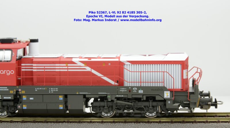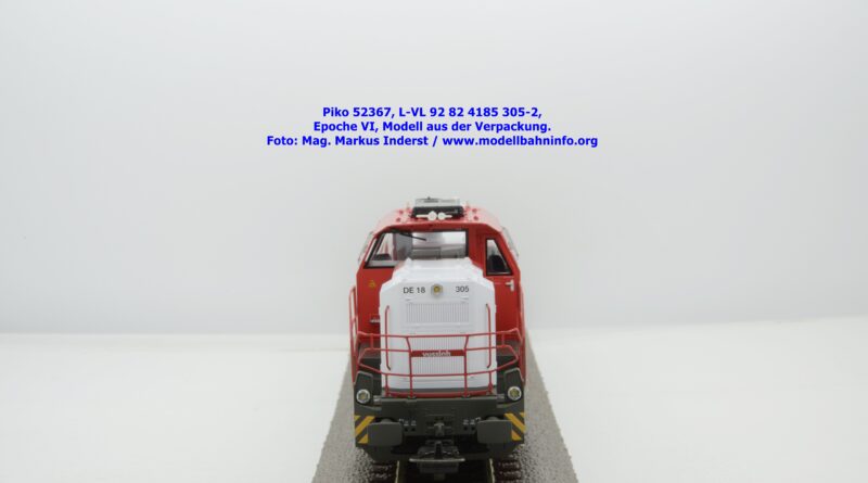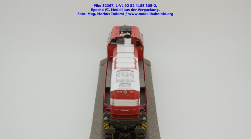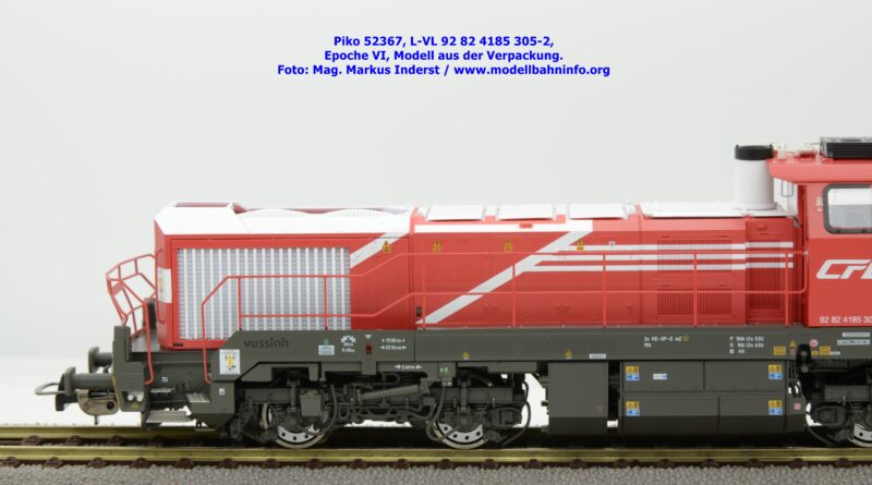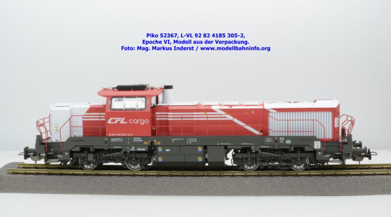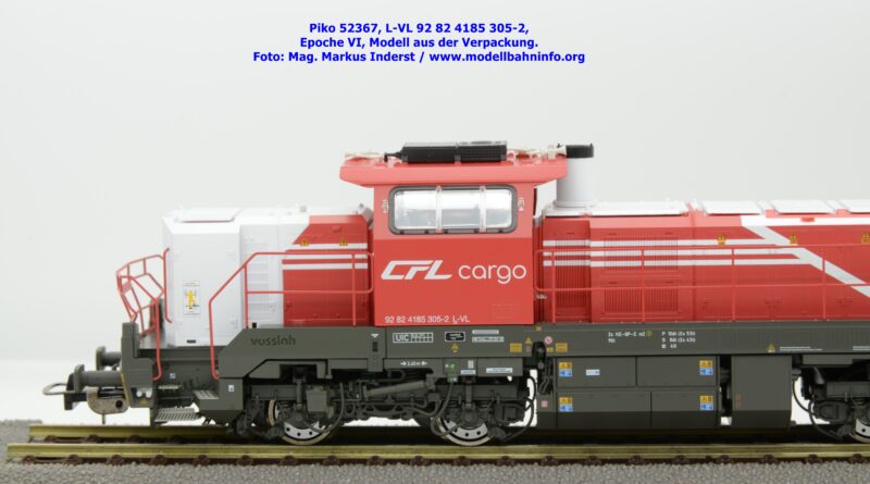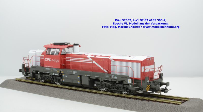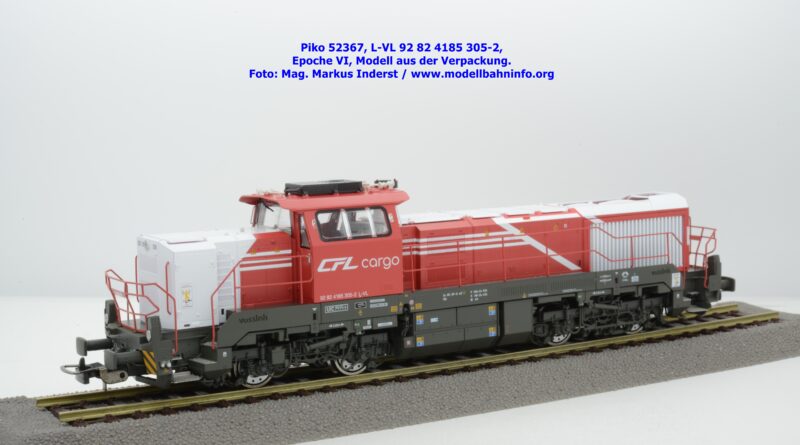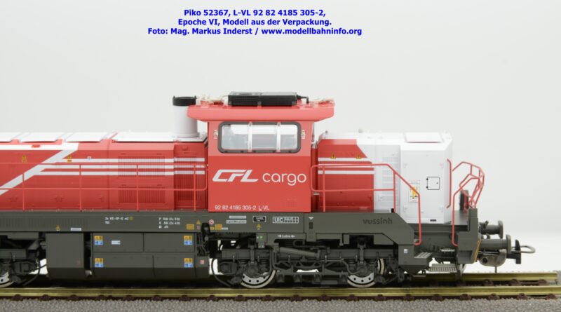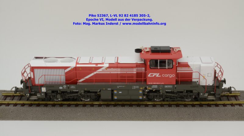 Die DE 18 ist auch im Fuhrpark der CFL Cargo vorzufinden. Das Unternehmen beschaffte diese vierachsigen Mittelführerstandslokomotiven als Ersatz mit leistungsschwächere Leasingmaschinen. Die CFL Cargo hat von der DE 18 zumindest 14 entsprechende Maschinen ab 2017 übernommen, deren Design sich mittlerweile auch änderte. Piko hat die DE 18 der CFL Cargo in der unveränderten Ausführung anderer Besteller ausgeführt und dabei auf der rechten Seite den Aggregatkasten für die Energieversorgung im Stand (sog. Hatz-Generator) vergessen. Die Modellausführung verfügt über ein einheitlich lackiertes Führerhaus, wiewohl die Maschinen bei der Auslieferung noch über eine weiße Kontrastfläche verfügten. Das Piko Modell ist mit der Loknummer 92 82 4185 305-2 und der Halterkennung L-VL angeschrieben. Im Revisionsraster steht das Abnahmedatum mit REV Vossloh Lokomotives 27.03.18. Das Modell verfügt über zahlreiche, mehrfarbige Bedruckungen. Es wird in drei Ausführungen angeboten, und zwar in der Zweileiter-Gleichstrom-Ausführung ohne Digitalkomponenten zum UVP von € 239,–, dann als digitales Zweileiter-Gleichstrom-Modell unter der Artikelnummer 52368 zum UVP von € 349,– sowie als Dreileiter-Wechselstrom-Modell mit der Artikelnummer 52369.