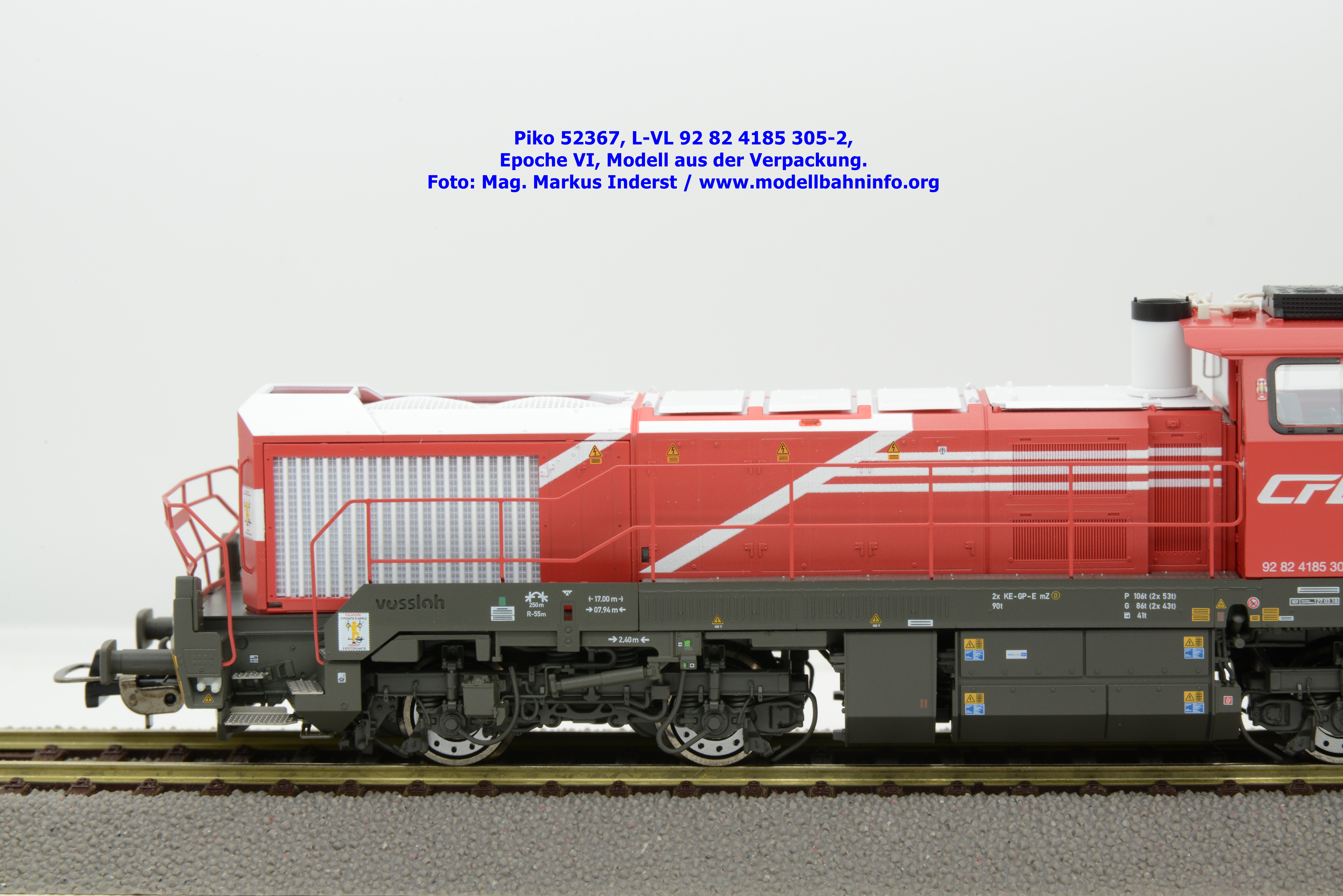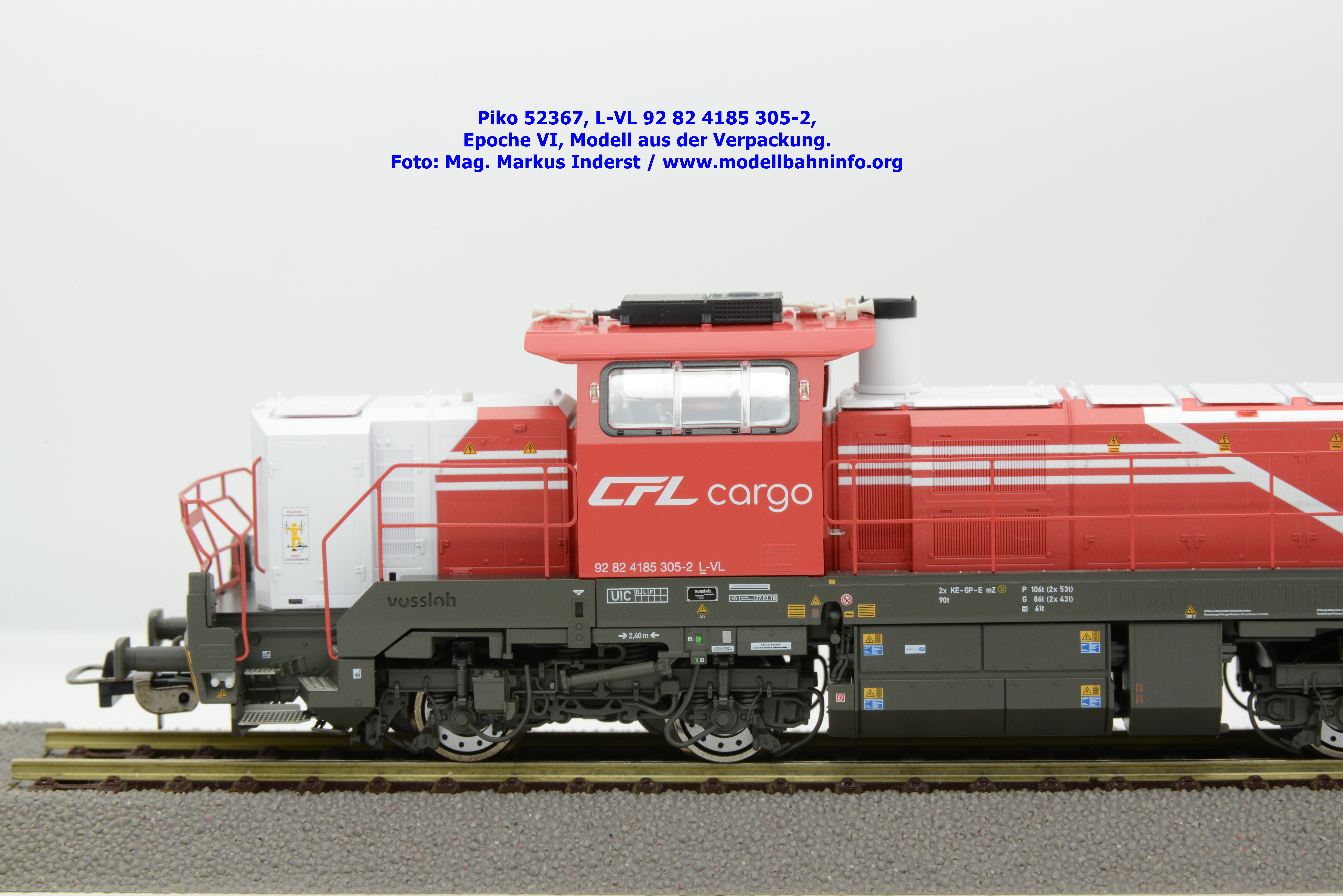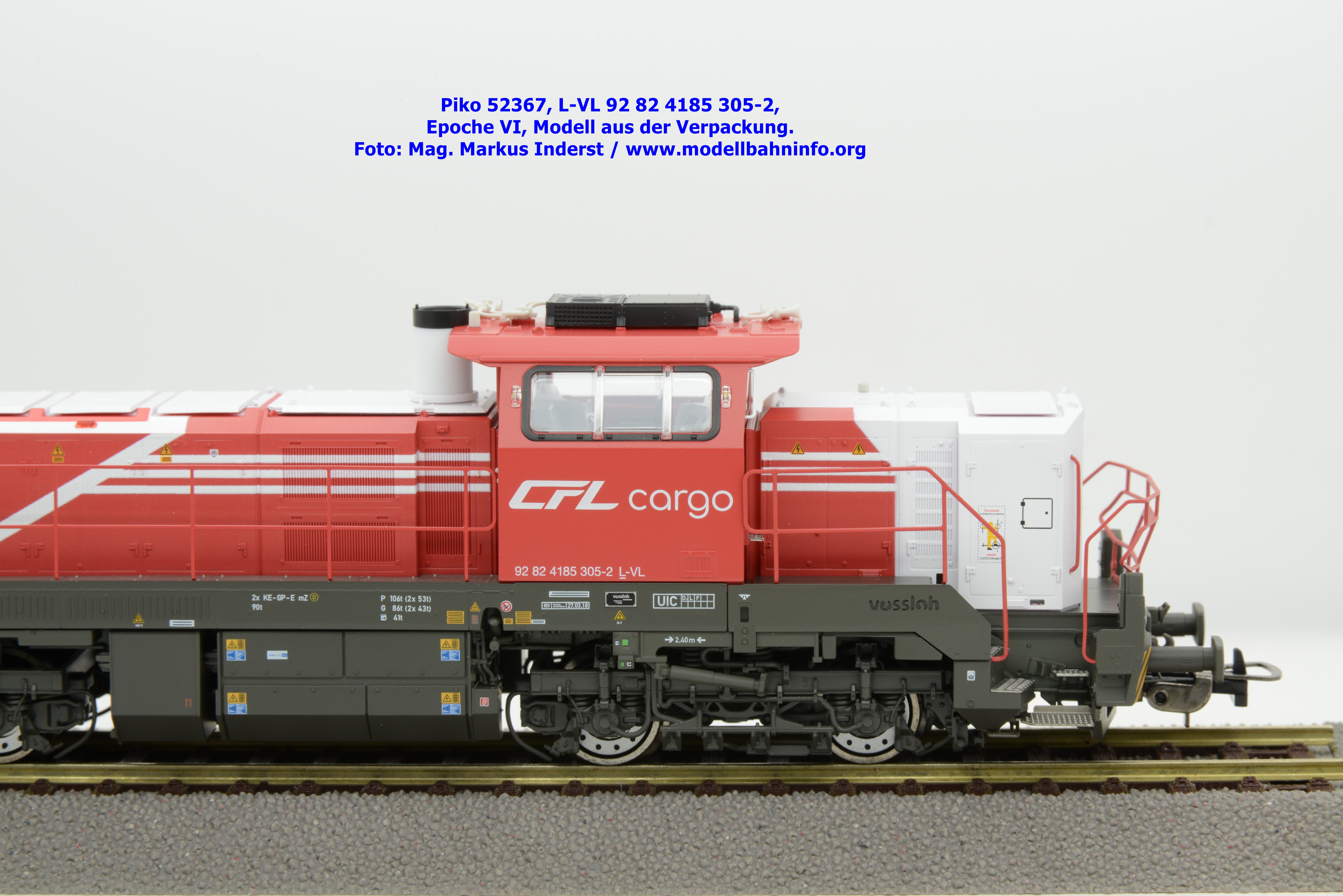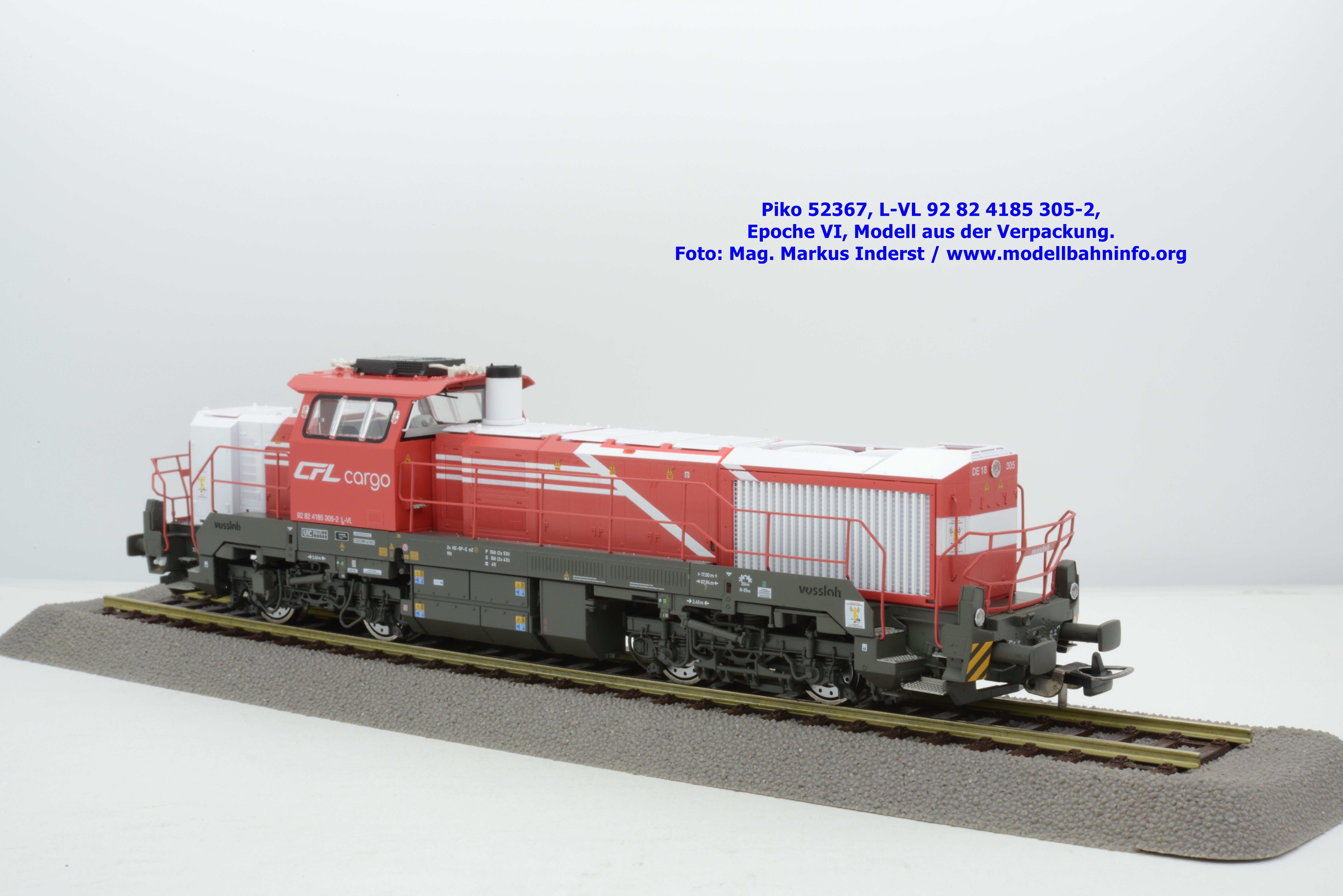 Die DE 18 ist auch im Fuhrpark der CFL Cargo vorzufinden. Das Unternehmen beschaffte diese vierachsigen Mittelführerstandslokomotiven als Ersatz mit leistungsschwächere Leasingmaschinen. Die CFL Cargo hat von der DE 18 zumindest 14 entsprechende Maschinen ab 2017 übernommen, deren Design sich mittlerweile auch änderte. Piko hat die DE 18 der CFL Cargo in der unveränderten Ausführung anderer Besteller ausgeführt und dabei auf der rechten Seite den Aggregatkasten für die Energieversorgung im Stand (sog. Hatz-Generator) vergessen. Die Modellausführung verfügt über ein einheitlich lackiertes Führerhaus, wiewohl die Maschinen bei der Auslieferung noch über eine weiße Kontrastfläche verfügten. Das Piko Modell ist mit der Loknummer 92 82 4185 305-2 und der Halterkennung L-VL angeschrieben. Im Revisionsraster steht das Abnahmedatum mit REV Vossloh Lokomotives 27.03.18. Das Modell verfügt über zahlreiche, mehrfarbige Bedruckungen. Es wird in drei Ausführungen angeboten, und zwar in der Zweileiter-Gleichstrom-Ausführung ohne Digitalkomponenten zum UVP von € 239,–, dann als digitales Zweileiter-Gleichstrom-Modell unter der Artikelnummer 52368 zum UVP von € 349,– sowie als Dreileiter-Wechselstrom-Modell mit der Artikelnummer 52369.