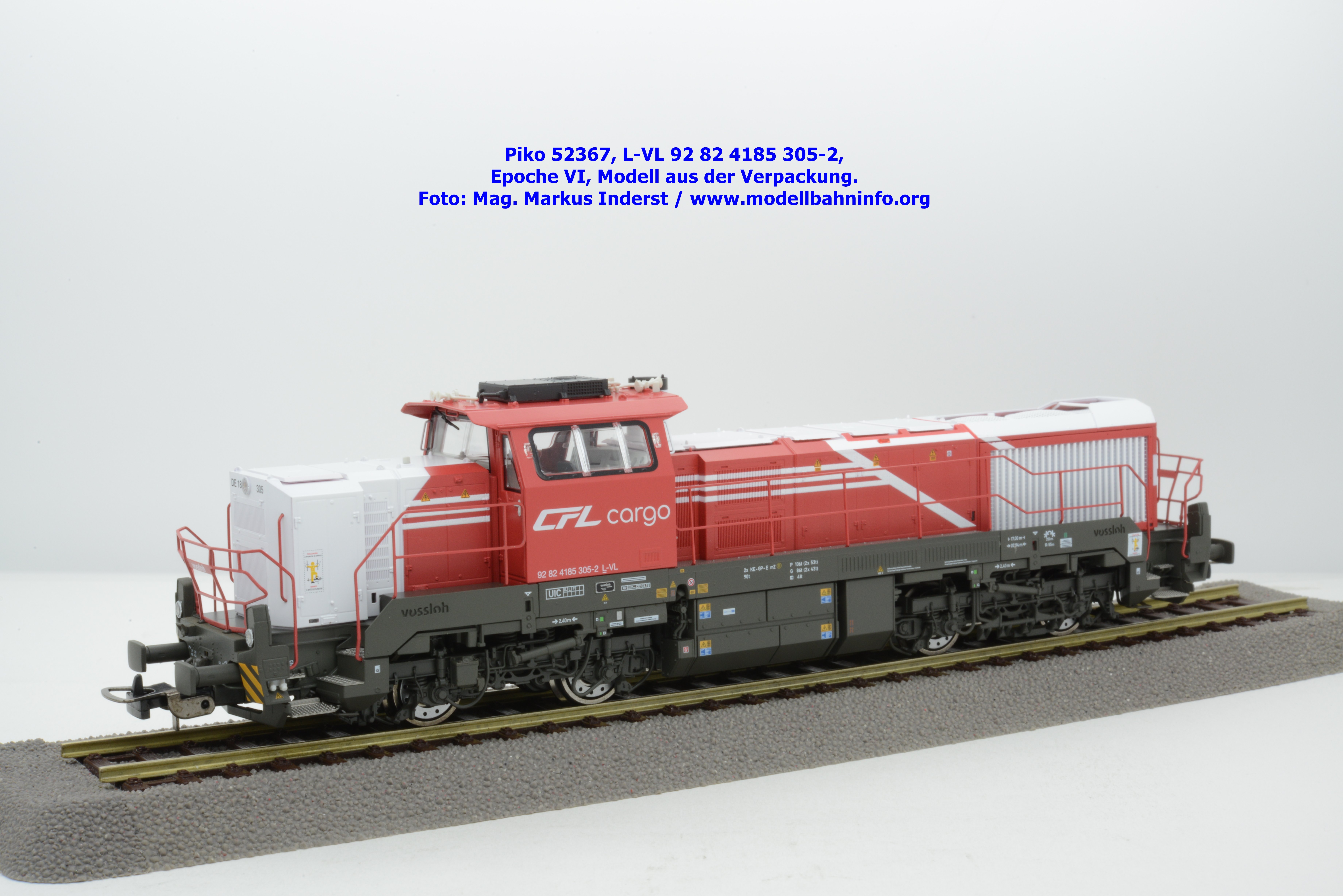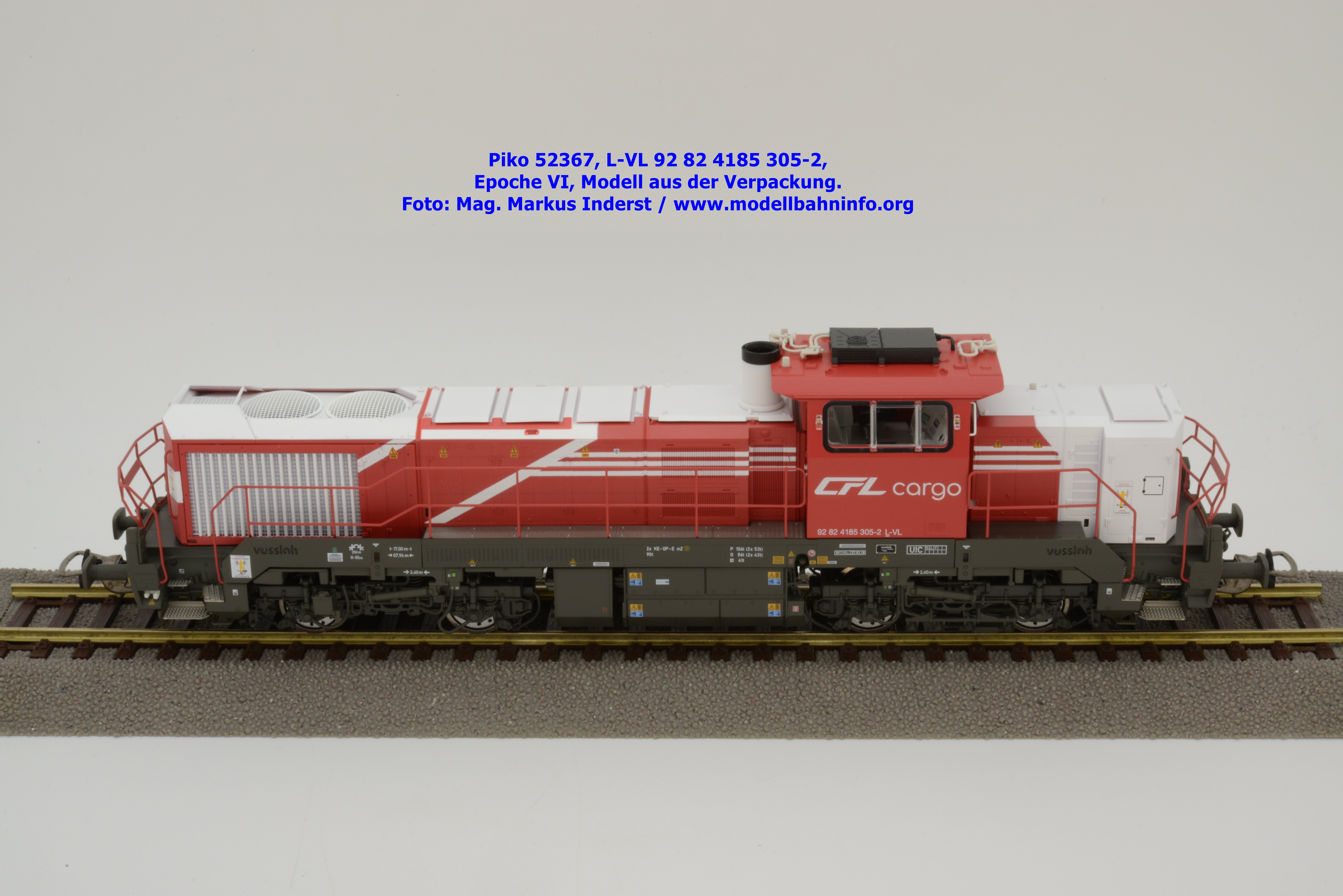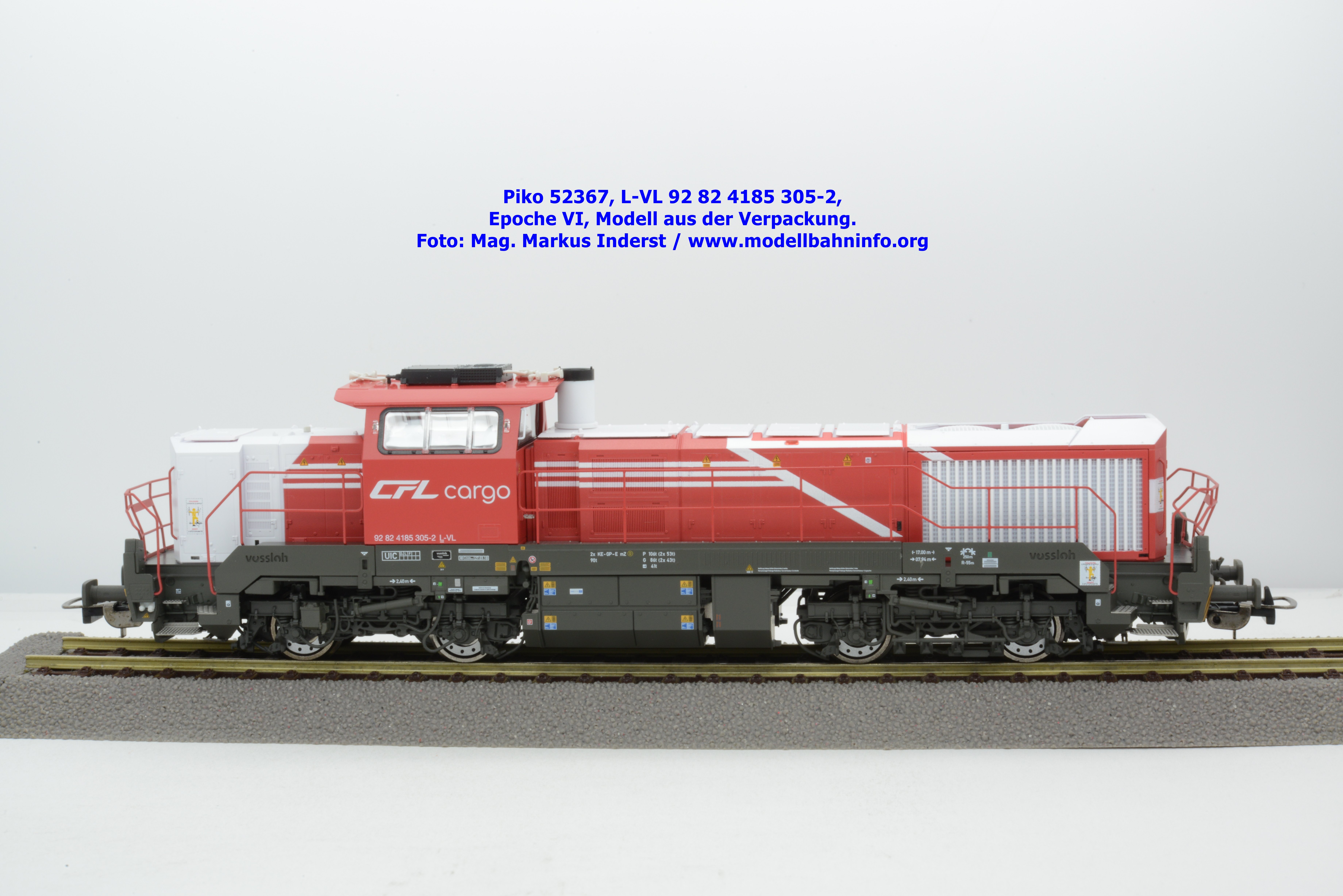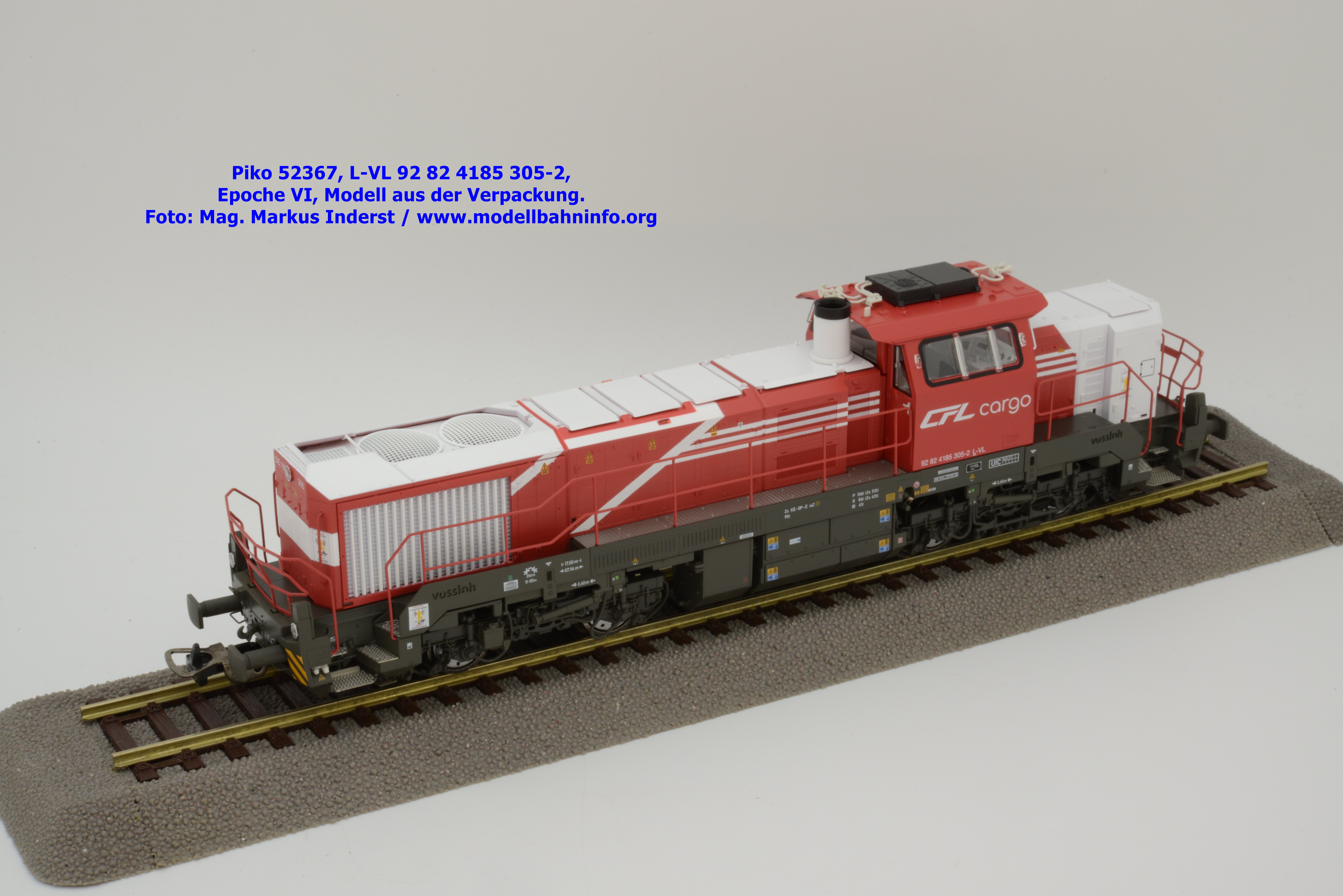Die DE 18 ist auch im Fuhrpark der CFL Cargo vorzufinden. Das Unternehmen beschaffte diese vierachsigen Mittelführerstandslokomotiven als Ersatz mit leistungsschwächere Leasingmaschinen. Die CFL Cargo hat von der DE 18 zumindest 14 entsprechende Maschinen ab 2017 übernommen, deren Design sich mittlerweile auch änderte. Piko hat die DE 18 der CFL Cargo in der unveränderten Ausführung anderer Besteller ausgeführt und dabei auf der rechten Seite den Aggregatkasten für die Energieversorgung im Stand (sog. Hatz-Generator) vergessen. Die Modellausführung verfügt über ein einheitlich lackiertes Führerhaus, wiewohl die Maschinen bei der Auslieferung noch über eine weiße Kontrastfläche verfügten. Das Piko Modell ist mit der Loknummer 92 82 4185 305-2 und der Halterkennung L-VL angeschrieben. Im Revisionsraster steht das Abnahmedatum mit REV Vossloh Lokomotives 27.03.18. Das Modell verfügt über zahlreiche, mehrfarbige Bedruckungen. Es wird in drei Ausführungen angeboten, und zwar in der Zweileiter-Gleichstrom-Ausführung ohne Digitalkomponenten zum UVP von € 239,–, dann als digitales Zweileiter-Gleichstrom-Modell unter der Artikelnummer 52368 zum UVP von € 349,– sowie als Dreileiter-Wechselstrom-Modell mit der Artikelnummer 52369.