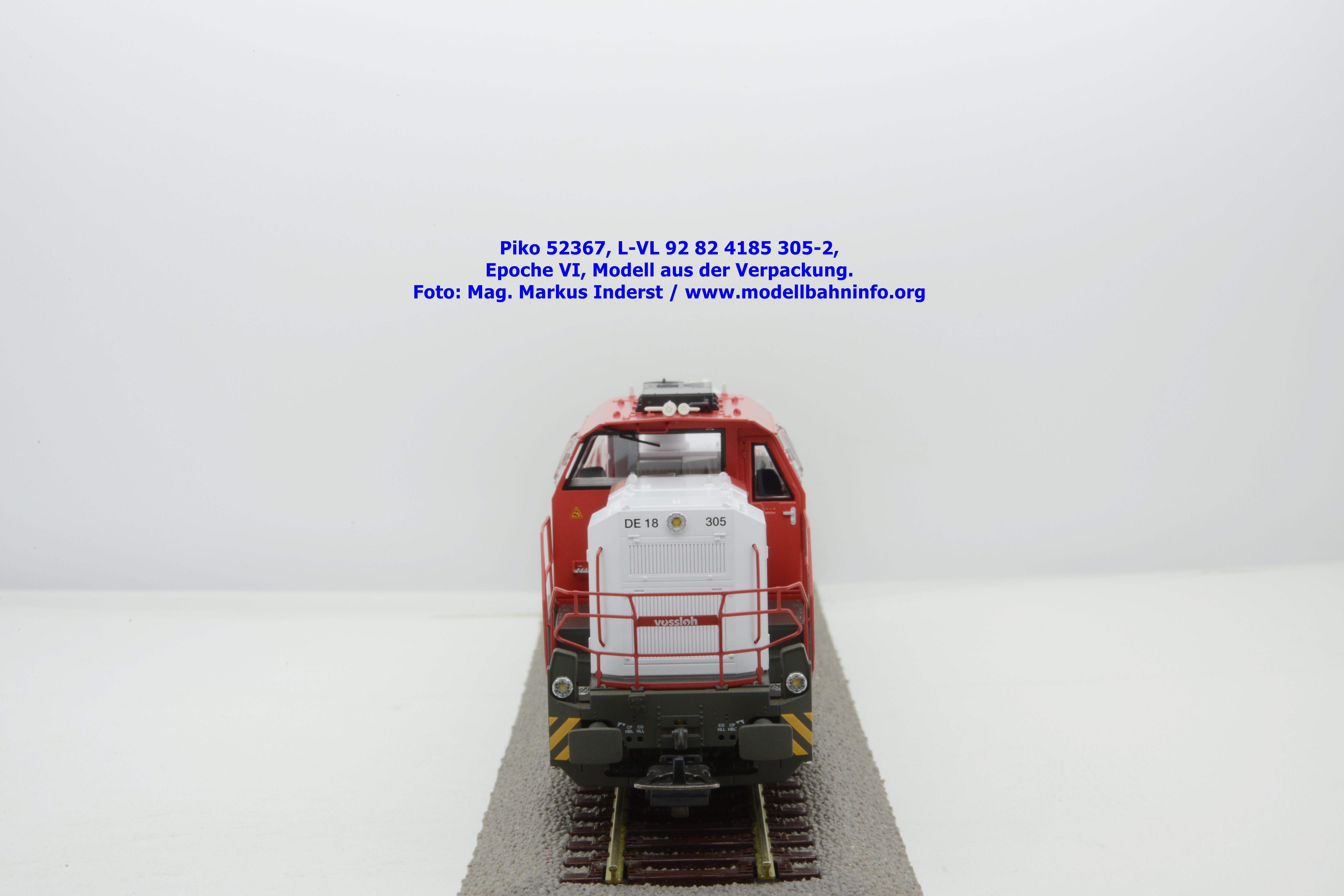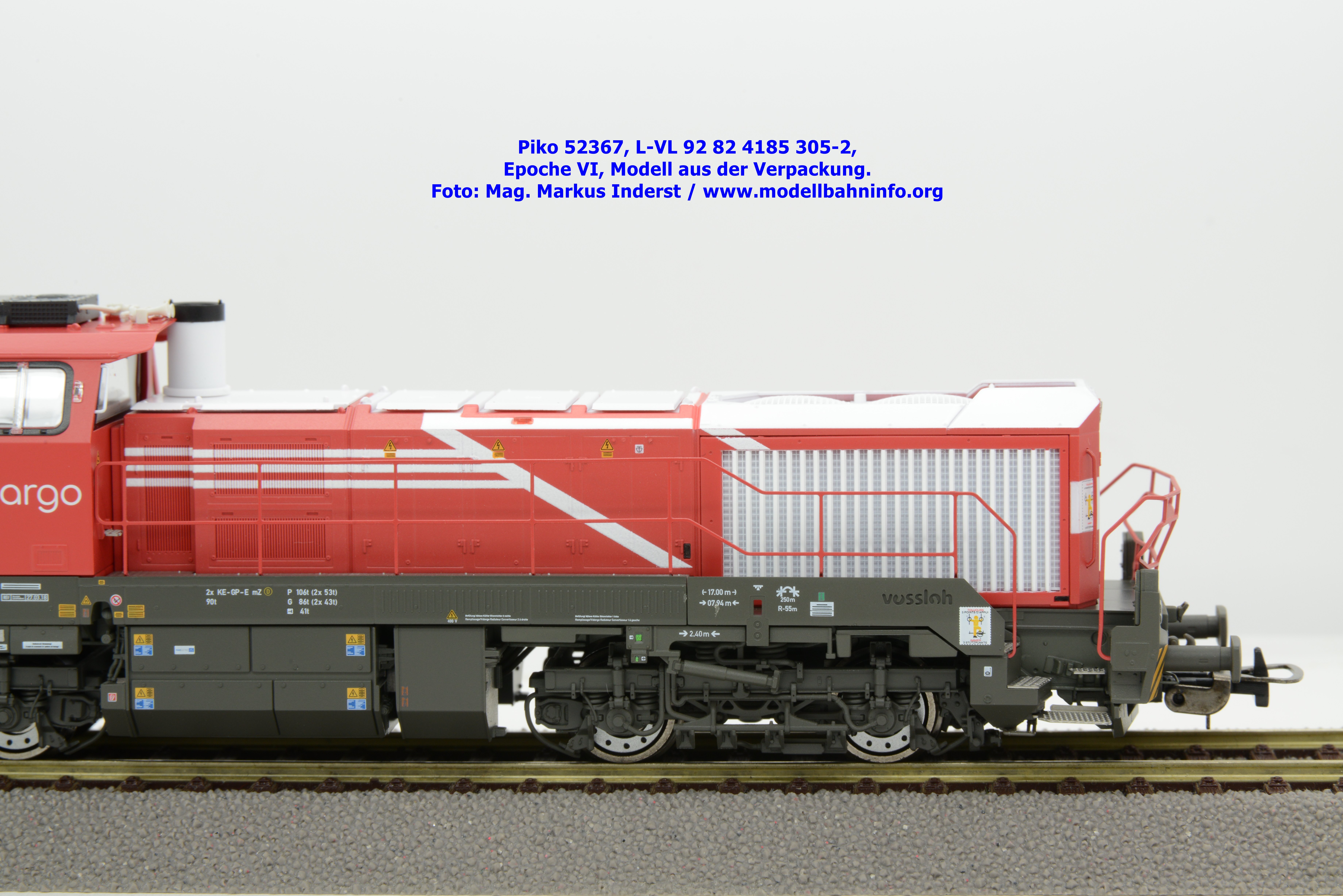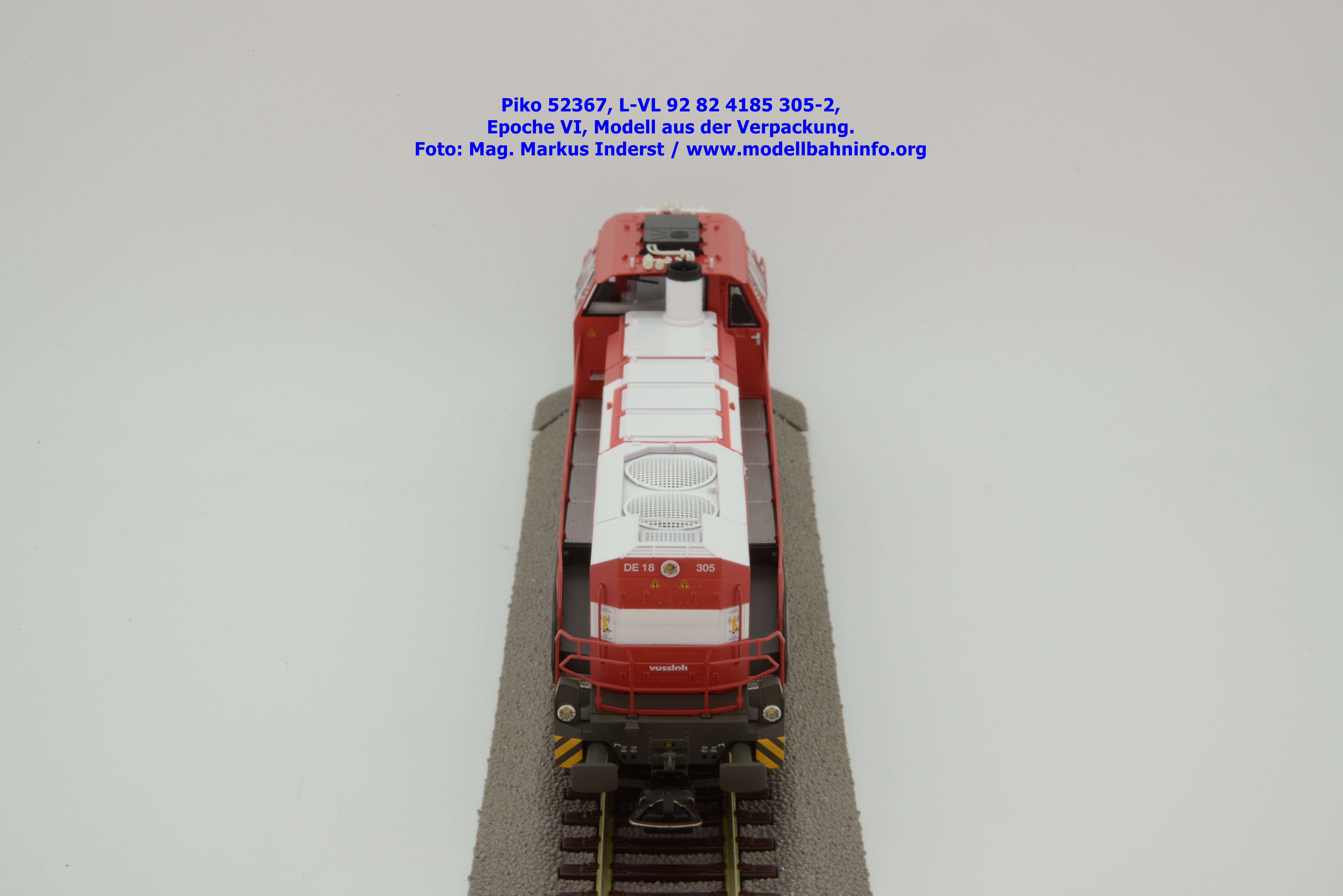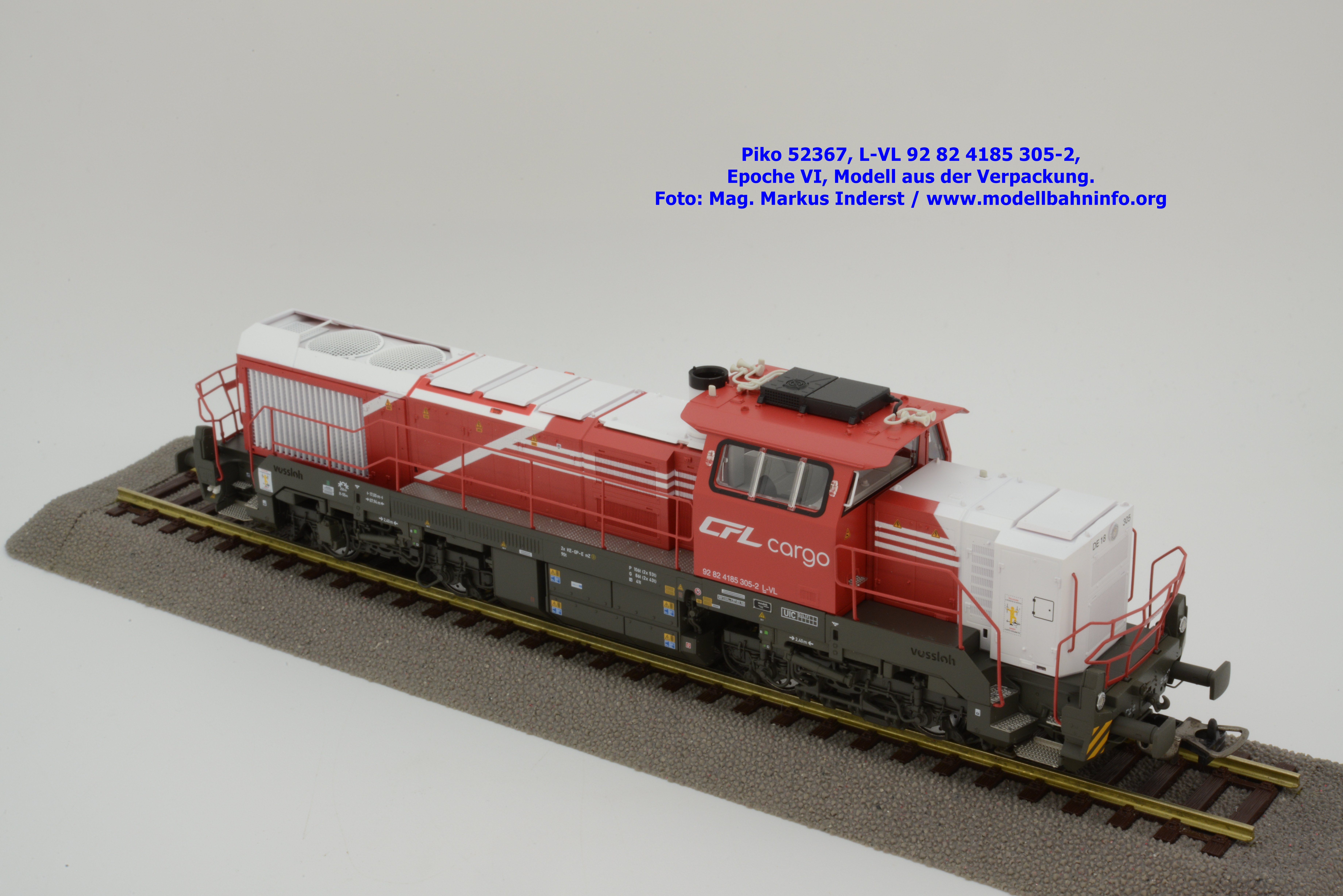 Die DE 18 ist auch im Fuhrpark der CFL Cargo vorzufinden. Das Unternehmen beschaffte diese vierachsigen Mittelführerstandslokomotiven als Ersatz mit leistungsschwächere Leasingmaschinen. Die CFL Cargo hat von der DE 18 zumindest 14 entsprechende Maschinen ab 2017 übernommen, deren Design sich mittlerweile auch änderte. Piko hat die DE 18 der CFL Cargo in der unveränderten Ausführung anderer Besteller ausgeführt und dabei auf der rechten Seite den Aggregatkasten für die Energieversorgung im Stand (sog. Hatz-Generator) vergessen. Die Modellausführung verfügt über ein einheitlich lackiertes Führerhaus, wiewohl die Maschinen bei der Auslieferung noch über eine weiße Kontrastfläche verfügten. Das Piko Modell ist mit der Loknummer 92 82 4185 305-2 und der Halterkennung L-VL angeschrieben. Im Revisionsraster steht das Abnahmedatum mit REV Vossloh Lokomotives 27.03.18. Das Modell verfügt über zahlreiche, mehrfarbige Bedruckungen. Es wird in drei Ausführungen angeboten, und zwar in der Zweileiter-Gleichstrom-Ausführung ohne Digitalkomponenten zum UVP von € 239,–, dann als digitales Zweileiter-Gleichstrom-Modell unter der Artikelnummer 52368 zum UVP von € 349,– sowie als Dreileiter-Wechselstrom-Modell mit der Artikelnummer 52369.