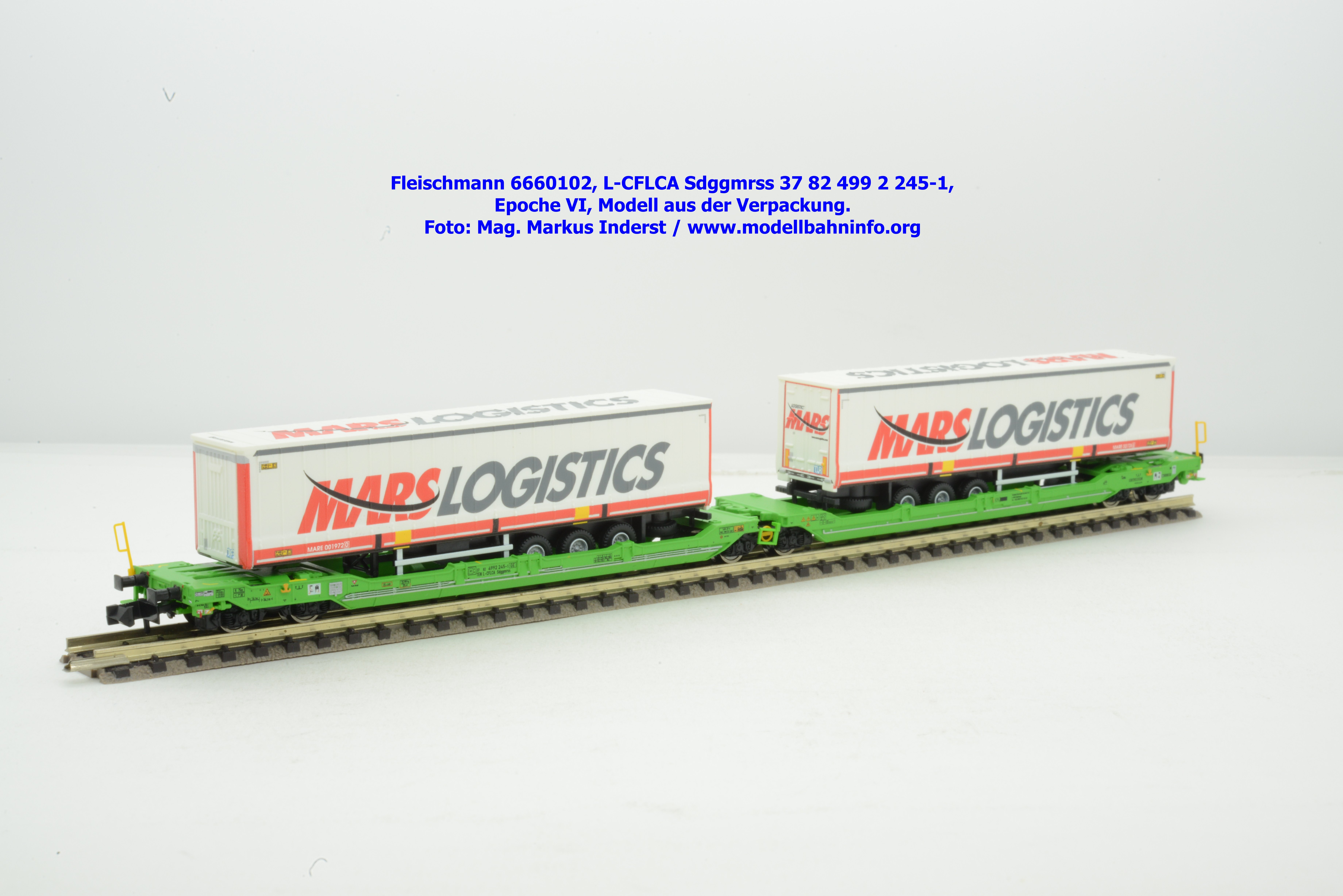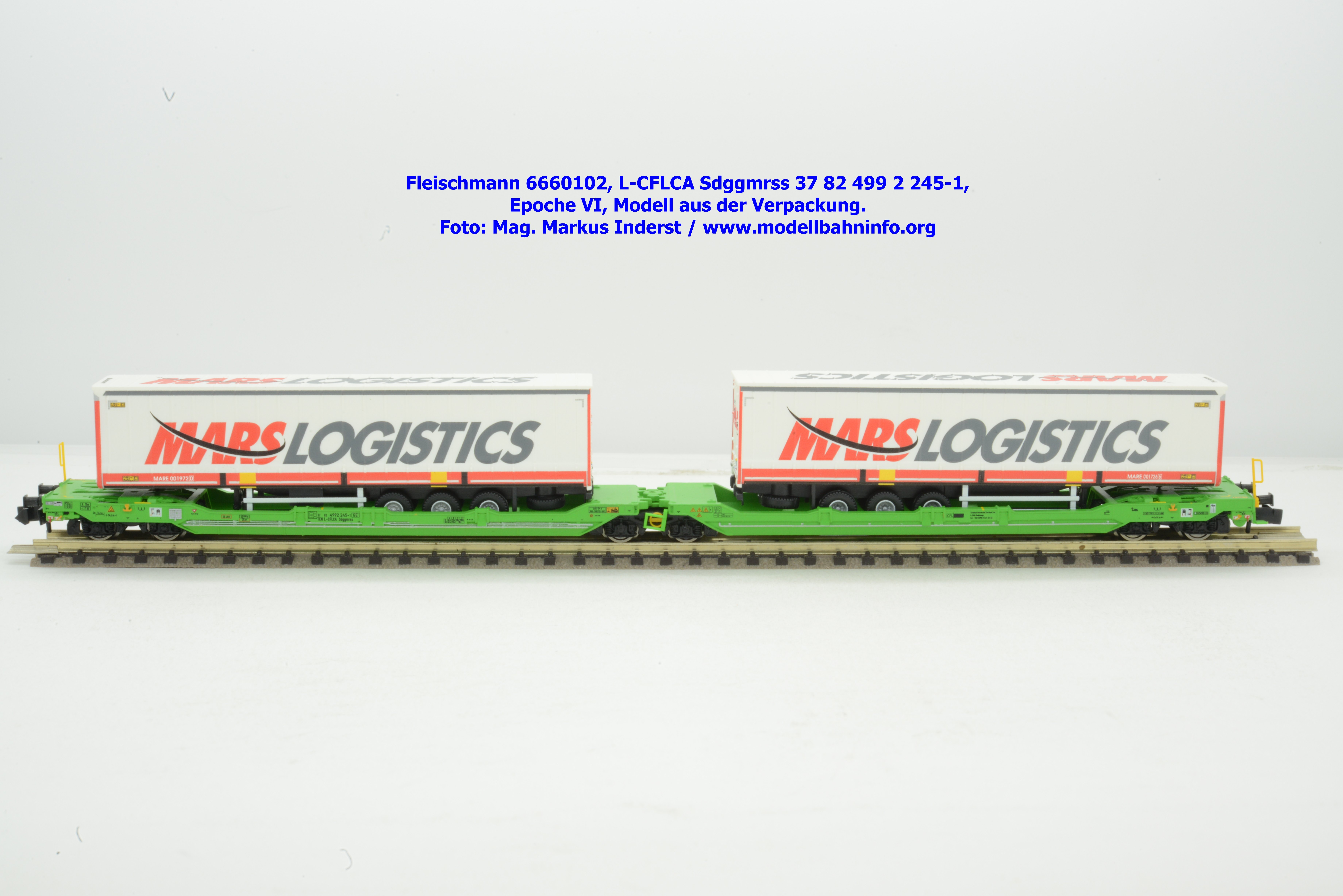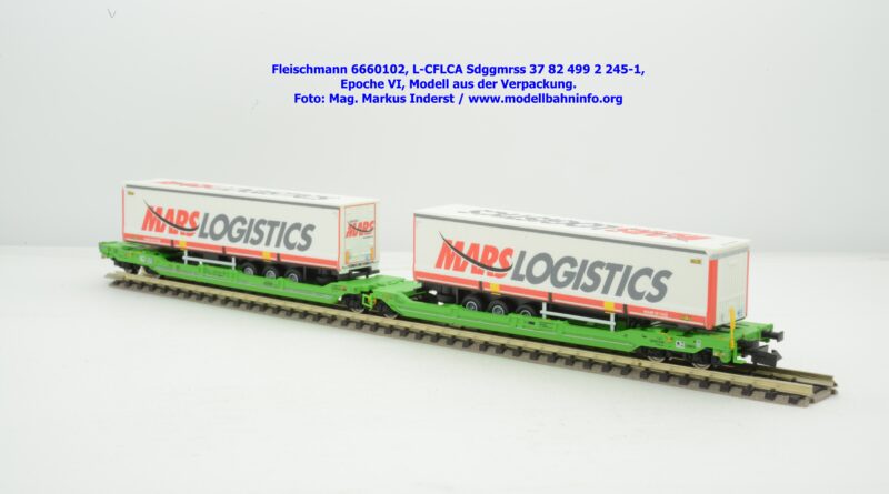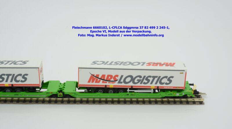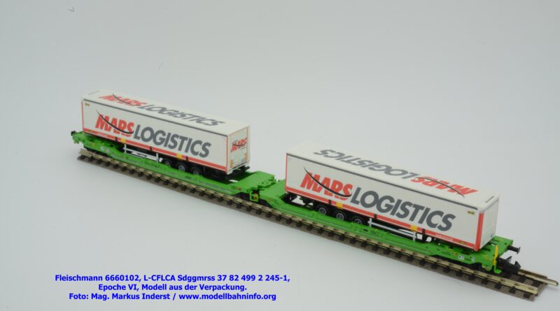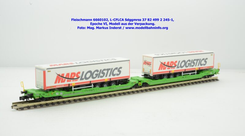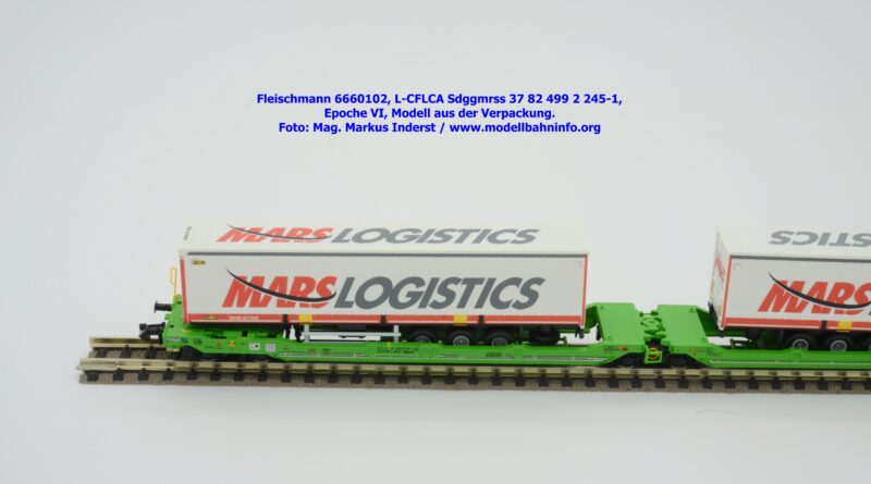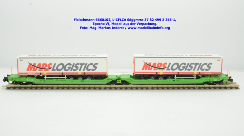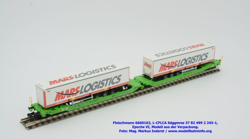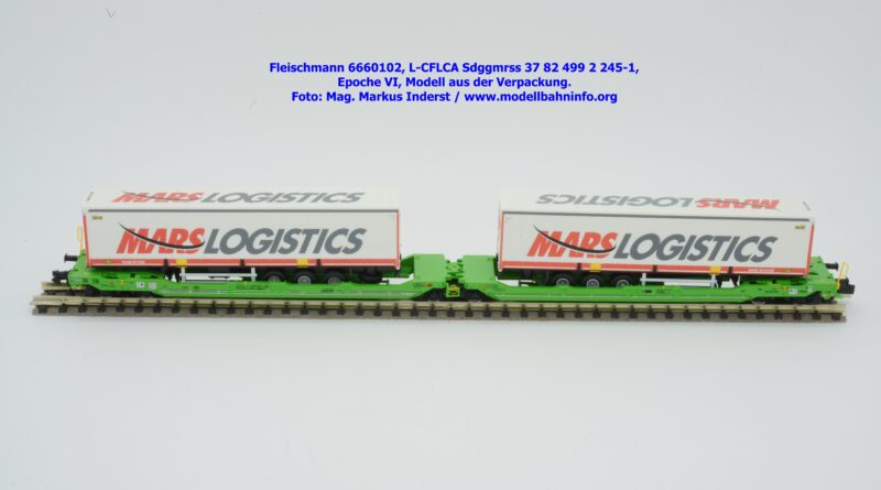 Der KLV-Zug MARS, welcher über die Tauernroute läuft, übt eine besondere Anziehung bei Eisenbahnfreunden aus. Der MARS-Zug wird als Ganzzug betrieben und verkehrt im Alpenraum planmäßig in den Nachtstunden. Fleischmann hat dieses besondere Vorbild im Rahmen des Herbst-Neuheitenprogramms 2025 aufgenommen, indem der Taschenwagen T 3000e von CFL Cargo mit der bekannten, hellgrünen Farbgebung ausgeführt ist. Der Wagen ist mit der Gattungsbezeichnung Sdggmrss angeschrieben. Die NVR-Nummer gesteht aus der Halterkennung L-CFLCA und der Wagennummer 37 82 499 2 245-1. Das Untersuchungsdatum ist mit der Anschrift 4 REV TVP 11.11.21 +3M im Revisionsraster festgehalten, etwas rechts davon ist noch ein neueres Untersuchungsdatum mit der Angabe 3 VSP AP 28.11.23 aufgedruckt. Die Beladung besteht aus zwei Sattelauflieger der Spedition MARS LOGISTICS. Das Modell gelangte mit dem UVP von € 99,90 in den Fachhandel.