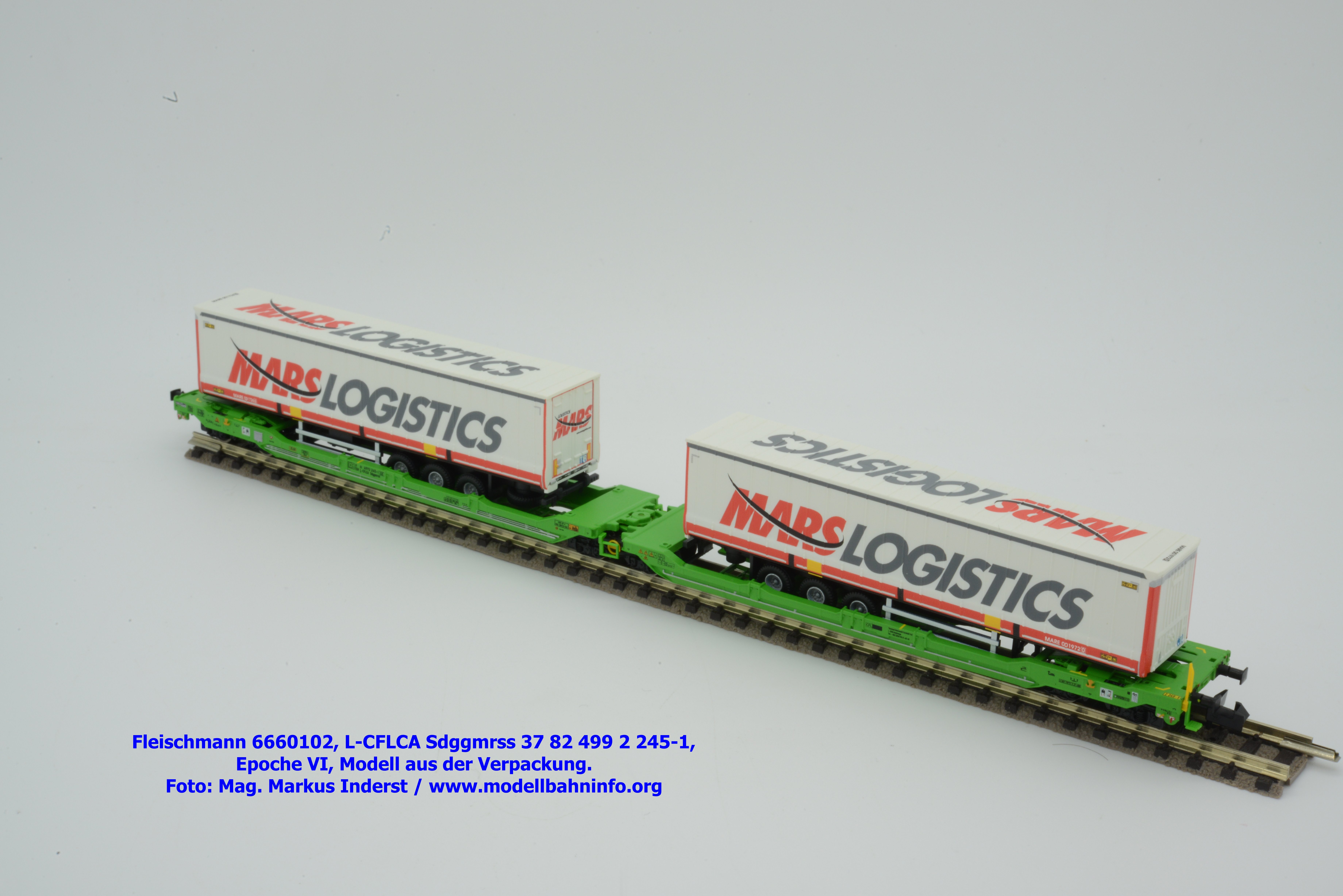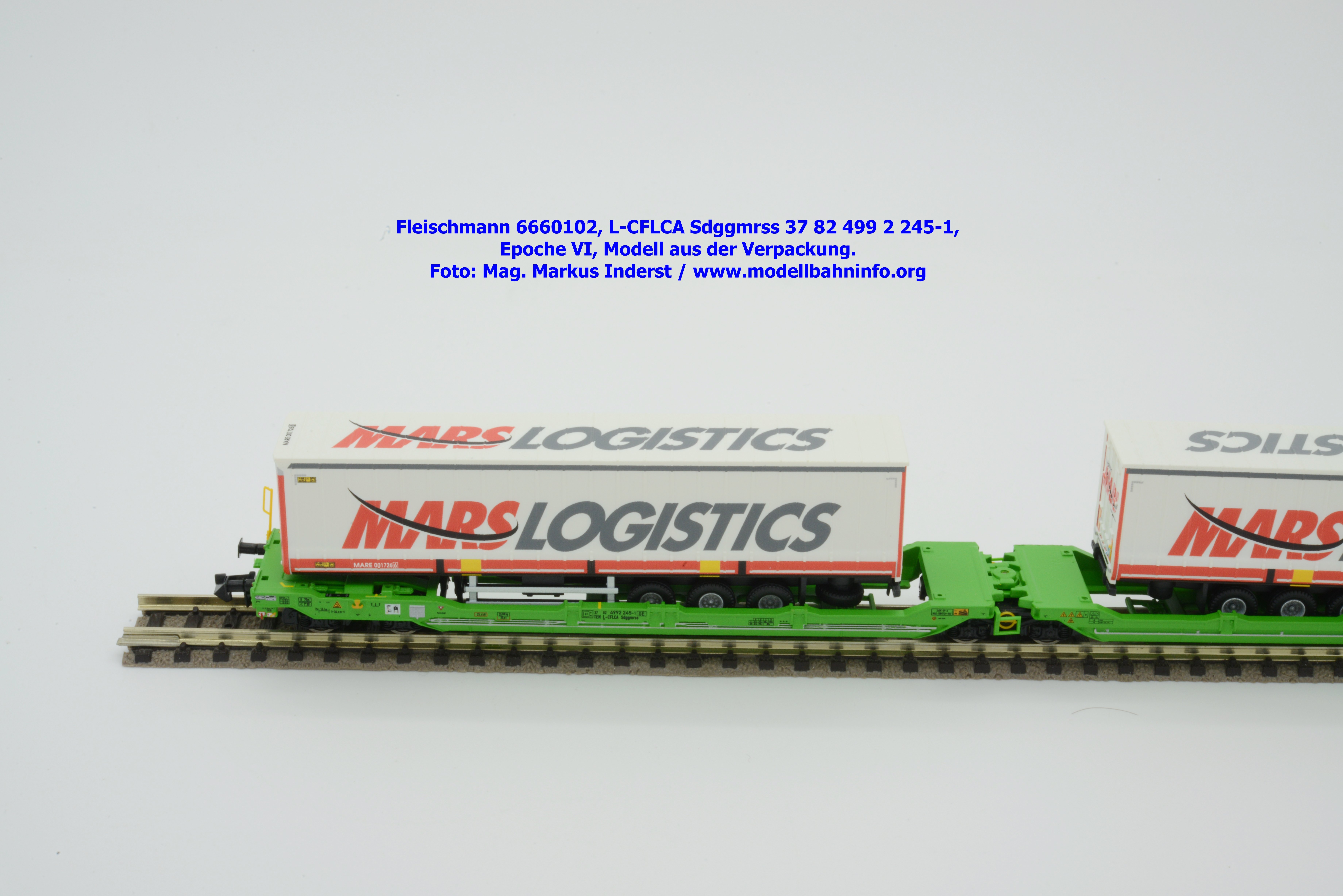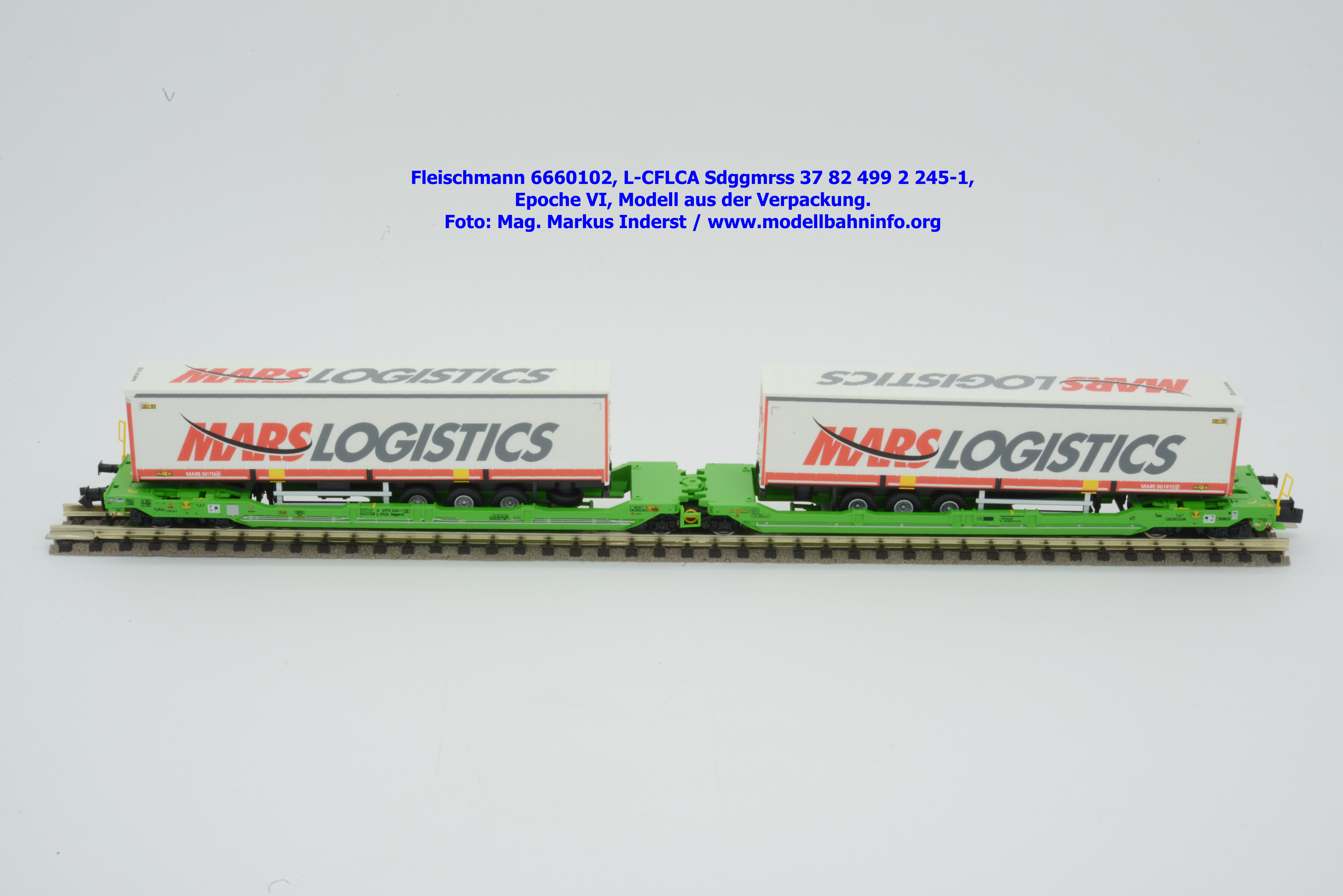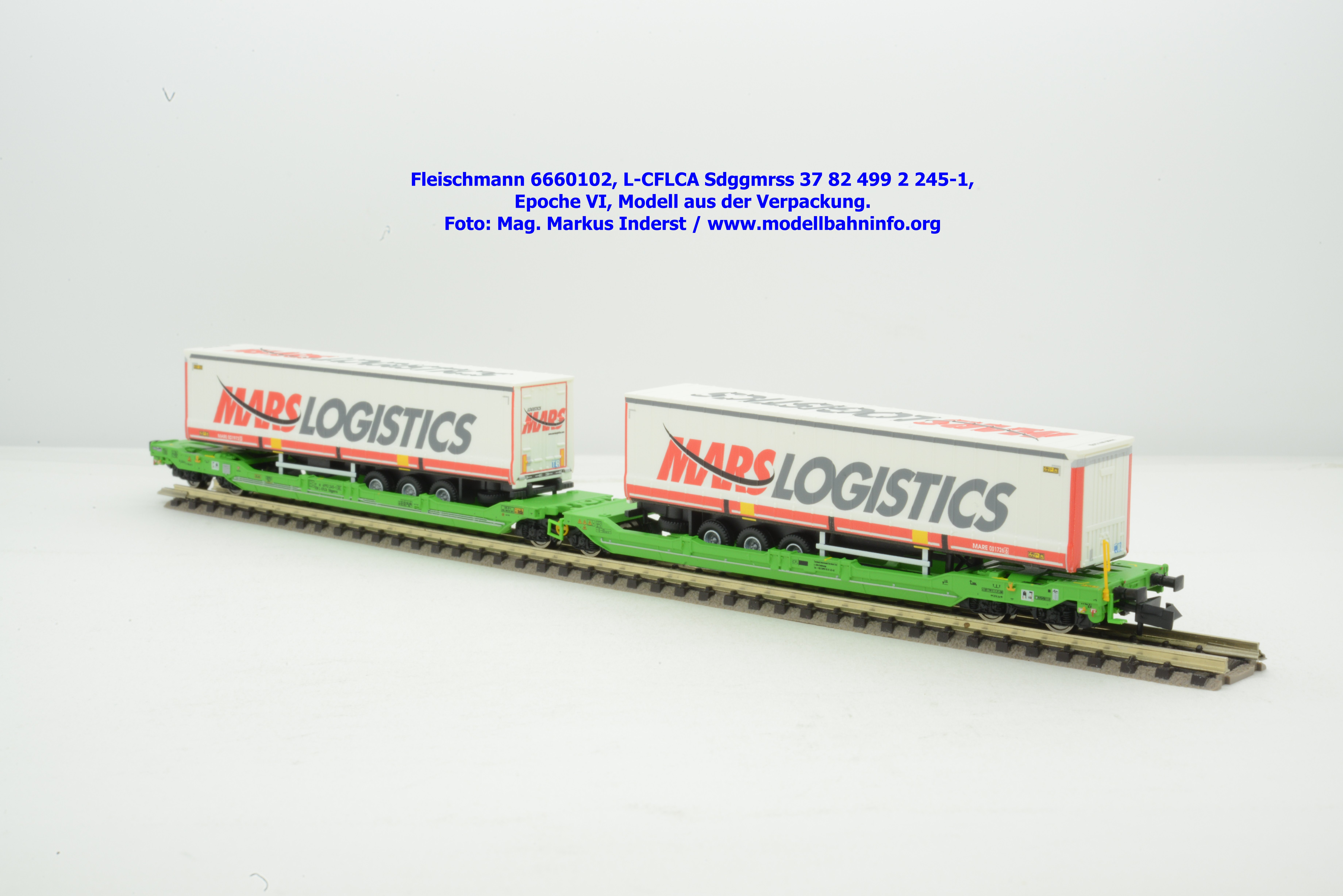 Der KLV-Zug MARS, welcher über die Tauernroute läuft, übt eine besondere Anziehung bei Eisenbahnfreunden aus. Der MARS-Zug wird als Ganzzug betrieben und verkehrt im Alpenraum planmäßig in den Nachtstunden. Fleischmann hat dieses besondere Vorbild im Rahmen des Herbst-Neuheitenprogramms 2025 aufgenommen, indem der Taschenwagen T 3000e von CFL Cargo mit der bekannten, hellgrünen Farbgebung ausgeführt ist. Der Wagen ist mit der Gattungsbezeichnung Sdggmrss angeschrieben. Die NVR-Nummer gesteht aus der Halterkennung L-CFLCA und der Wagennummer 37 82 499 2 245-1. Das Untersuchungsdatum ist mit der Anschrift 4 REV TVP 11.11.21 +3M im Revisionsraster festgehalten, etwas rechts davon ist noch ein neueres Untersuchungsdatum mit der Angabe 3 VSP AP 28.11.23 aufgedruckt. Die Beladung besteht aus zwei Sattelauflieger der Spedition MARS LOGISTICS. Das Modell gelangte mit dem UVP von € 99,90 in den Fachhandel.