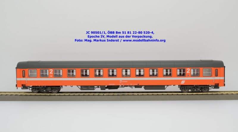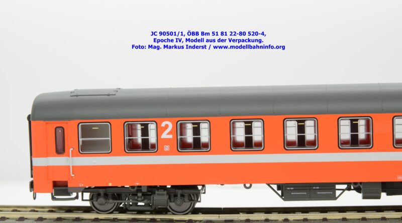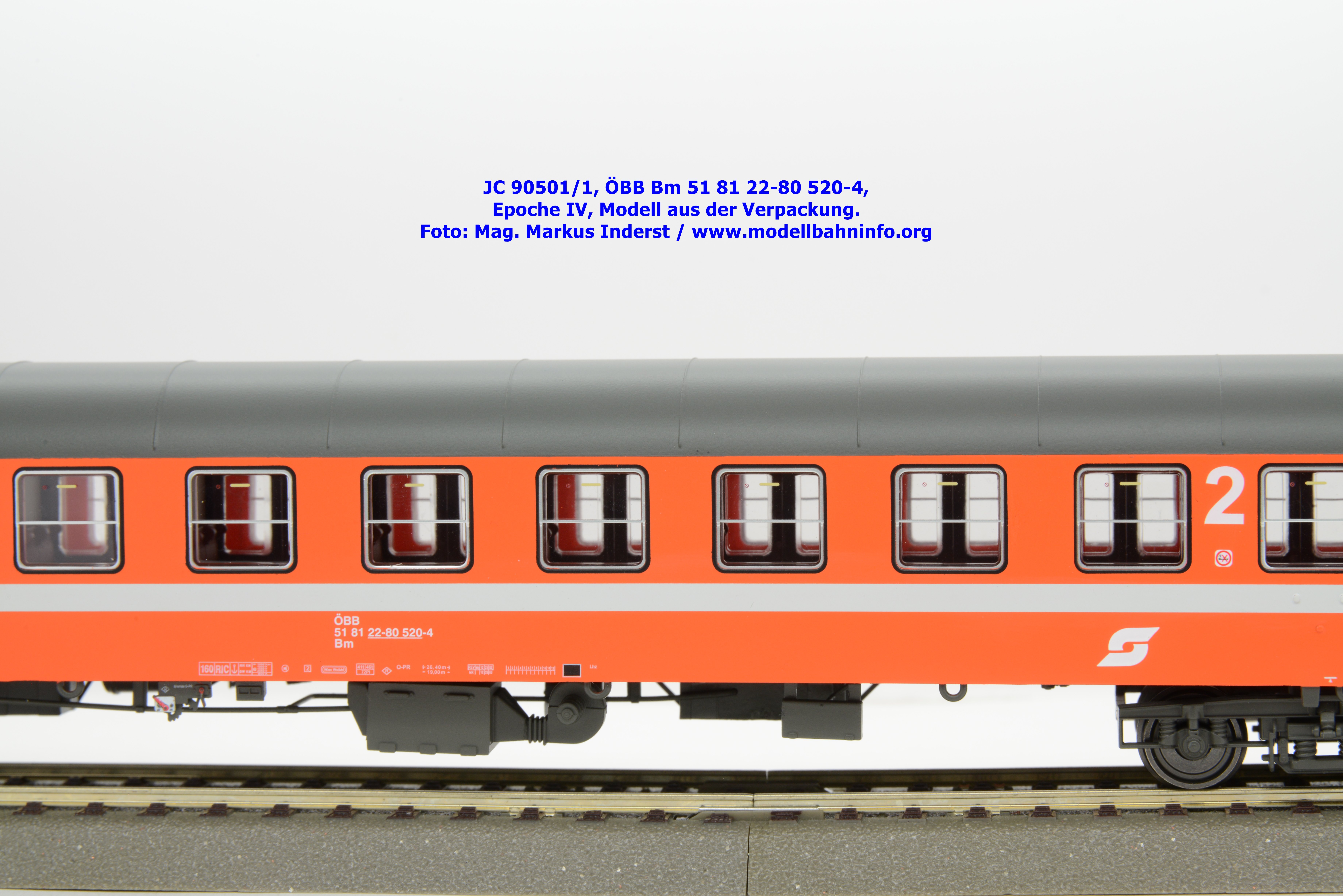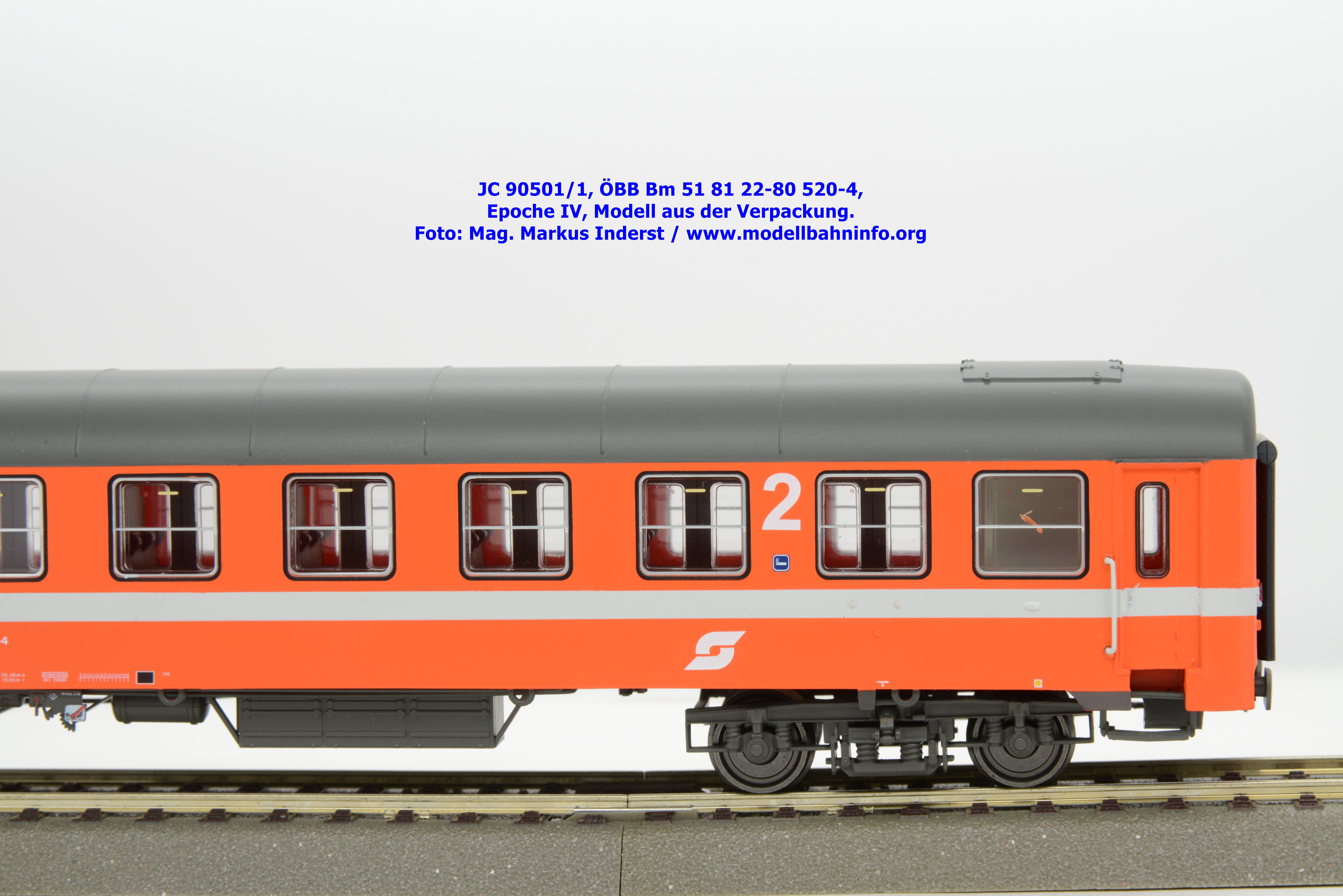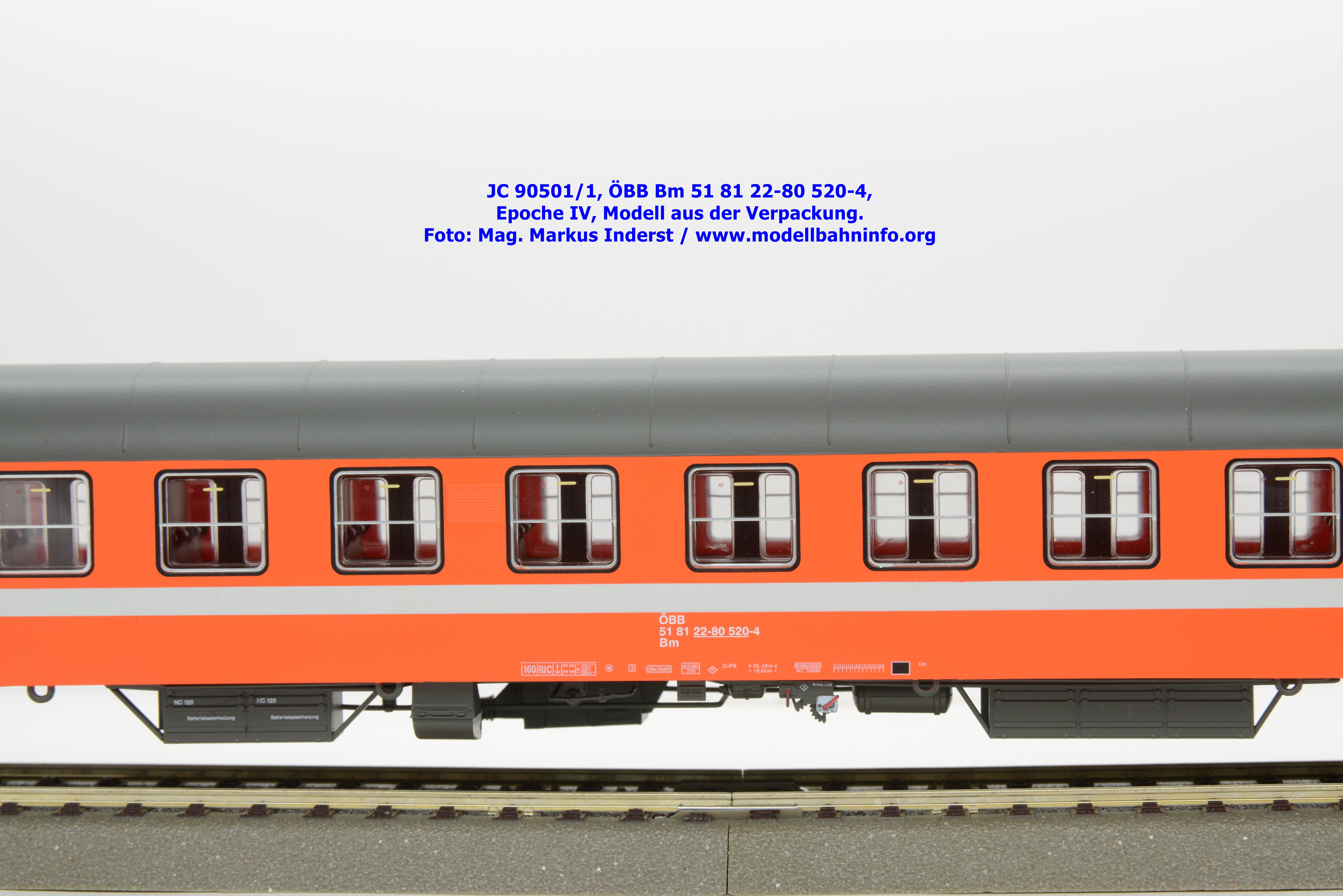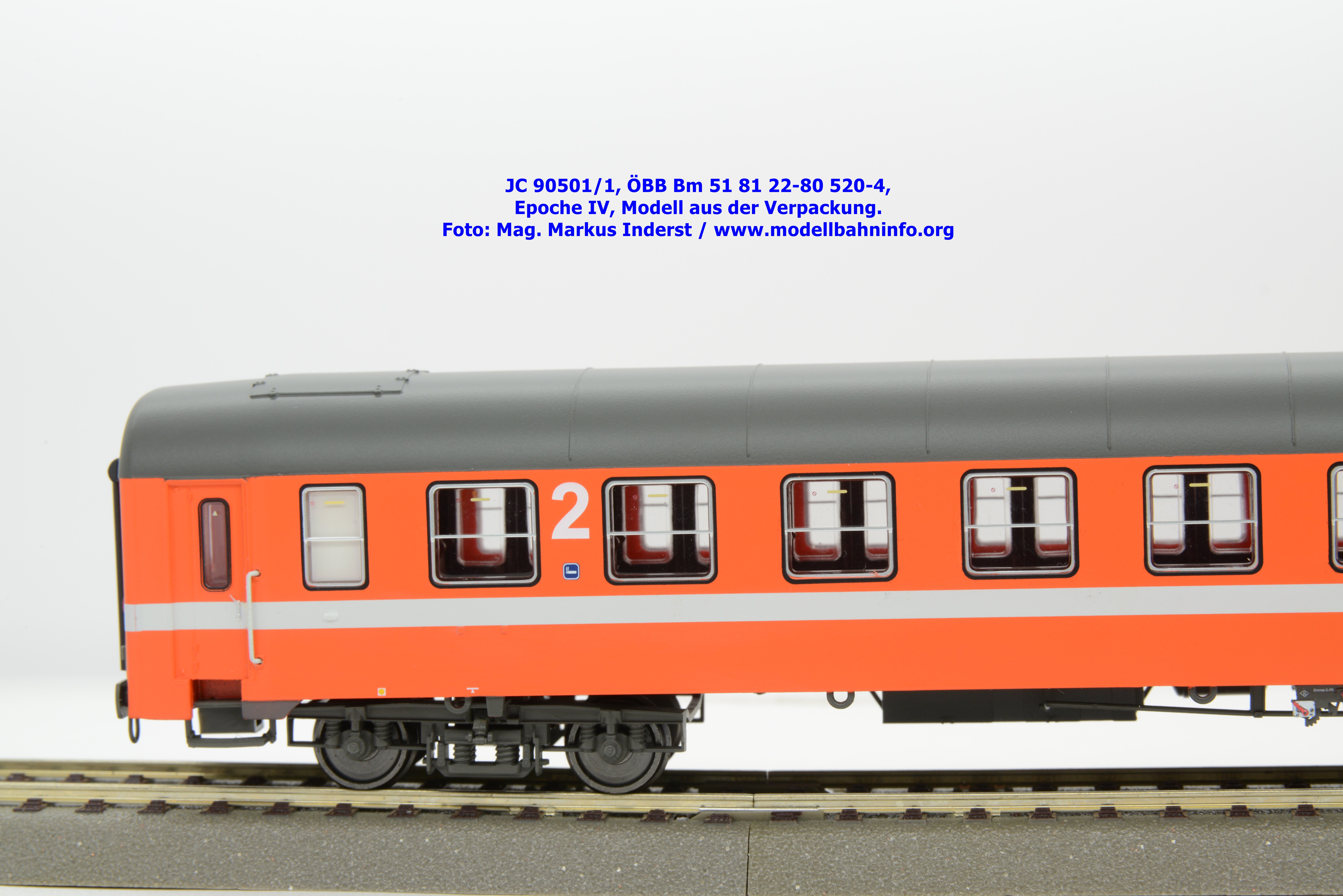 Dieser Schnellzugwagen der 2. Klasse gehört der 2. Serie der UIC-X-Vorserienwagen an. Das Modell ist mit der Gattungsbezeichnung Bm und der Wagennummer 51 81 22-80 520-4 bedruckt, als Heimatbahnhof ist „Wien-Wstbf.“ angeschrieben. Es ist bedauerlich, daß der bekannte Beschriftungsfehler vor der Produktion dieser Modelle nicht korrigiert wurde. Im Revisionsraster stehen die Untersuchungsdaten mit der Angabe REV Ws 12.03.82. Das Modell ist mit Drehgestellen der Bauart MD 36/IA versehen.