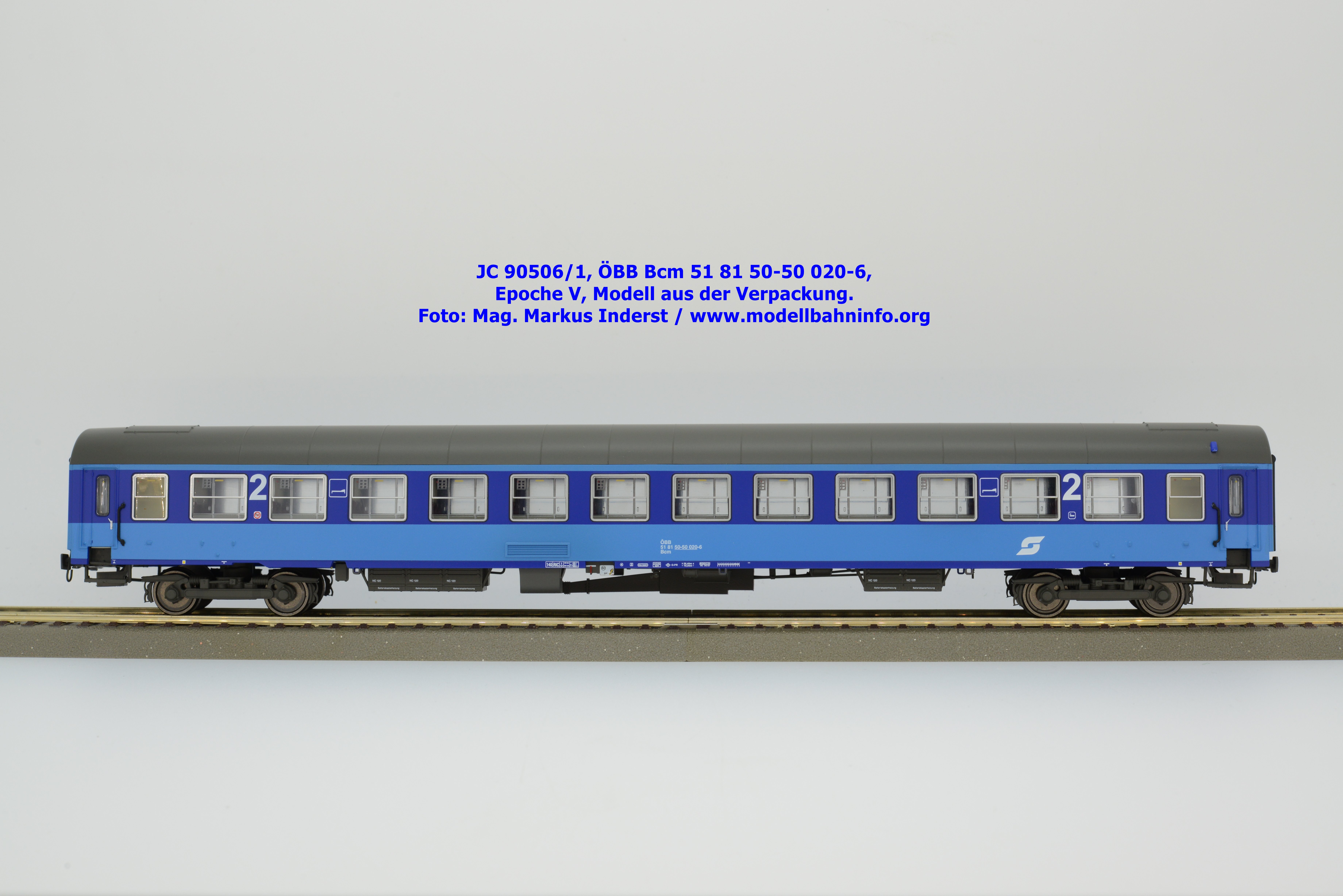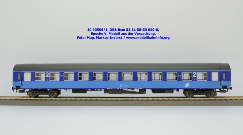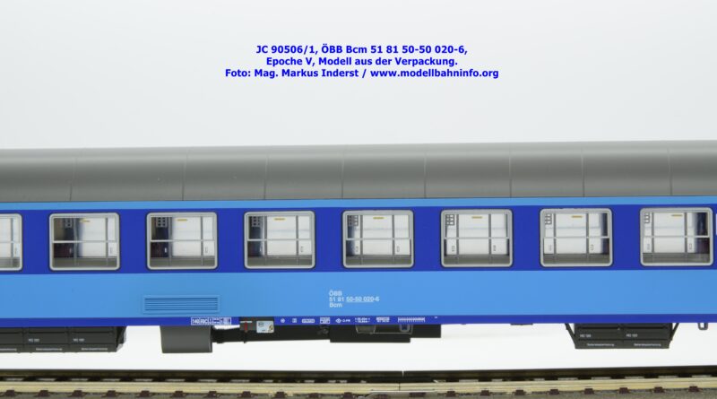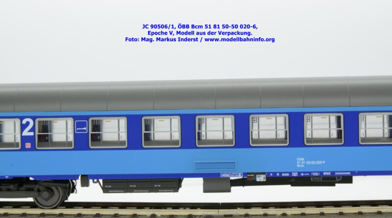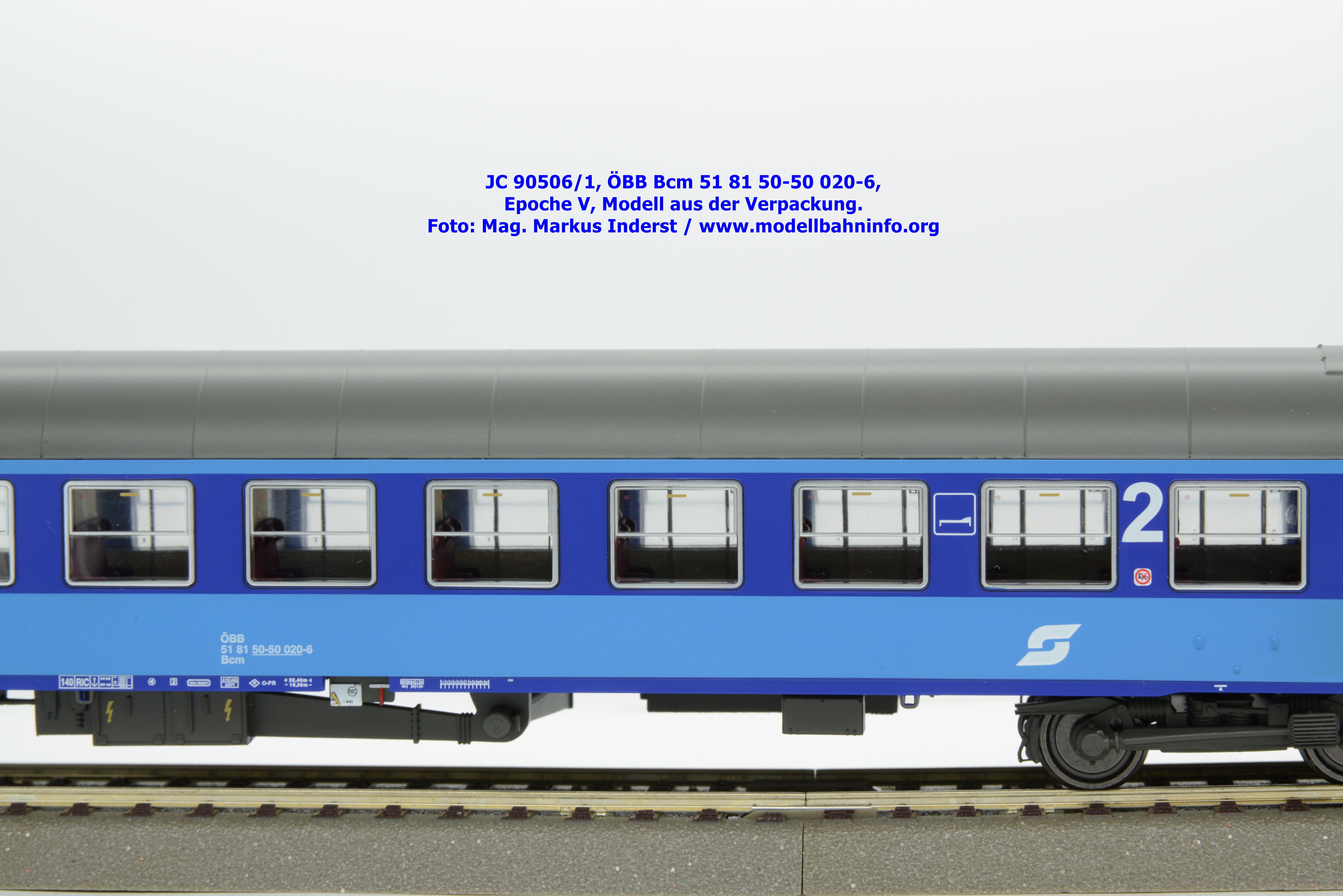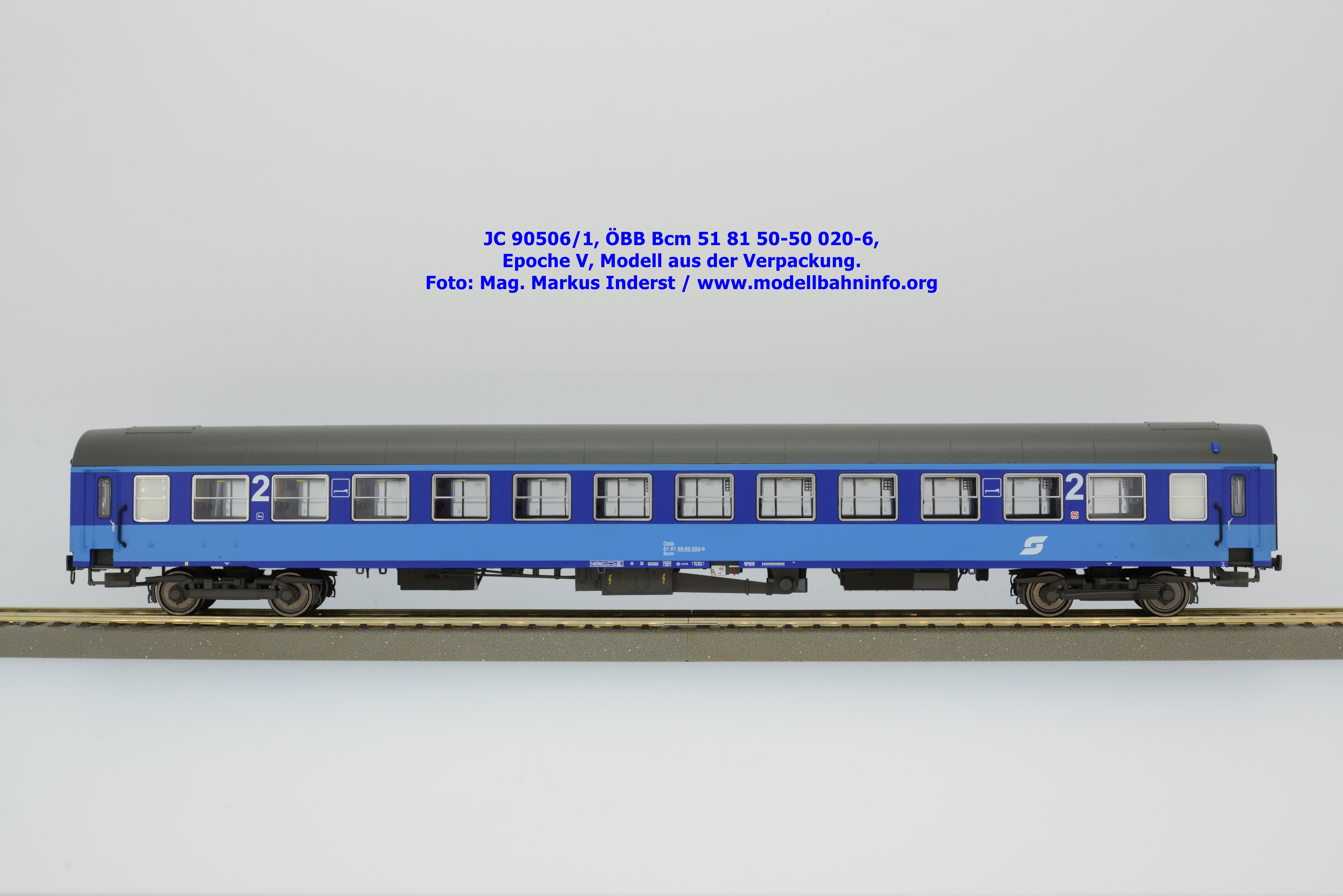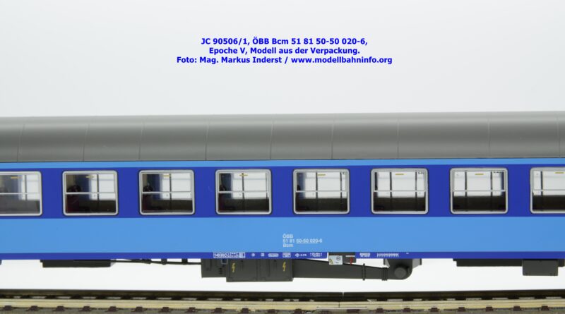 Die ÖBB haben zeitweise Farbversuche bei Ihren Liegewagen durchgeführt, indem zwei verschiedene Farbtöne in Hell- und Dunkelblau angewendet wurden. Diese Lackierung erhielt der als Bcm 51 81 50-50 020-6 beschriftete Liegewagen, der seinen Heimatbahnhof in „Wien Südbhf“ hat. Die Revisionsanschriften werden mit REV Ws 18. 5.92 angegeben, somit reiht sich das Modell in die Epoche V ein. Der Vorbildwagen gehört einer Serie von drei Liegewagen an, die 1963 in der Werft Linz gebaut wurden. Die Musterlackierung wurde 1991 in den Farbtönen Lichtblau (RAL 5012) und Ultramarinblau (RAL 5002) umgesetzt. Alle drei Wagen liefen auf Drehgestellen der Bauart Wegmann 15. Beim genauen Abgleich mit Vorbildfotos erkennt man eine inkorrekte Darstellung des Fensterbandes.