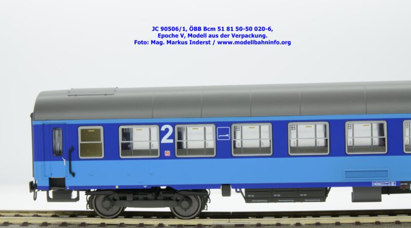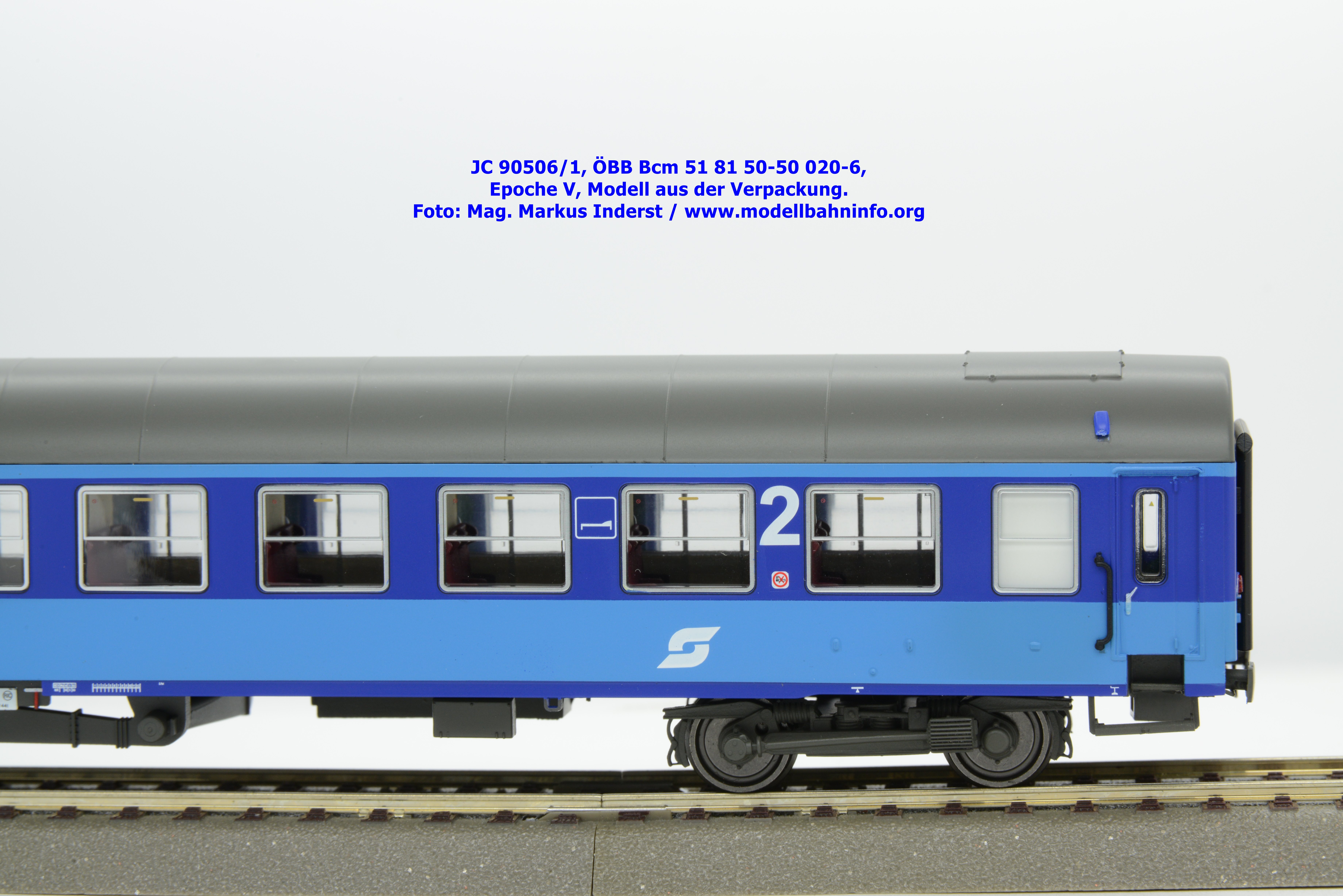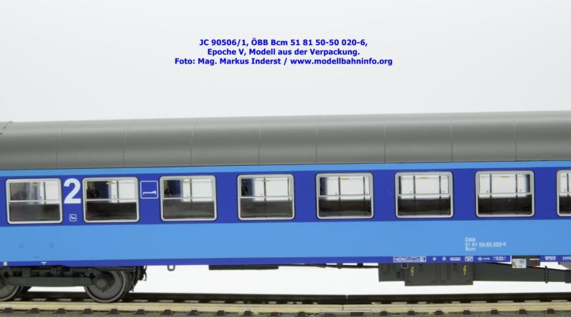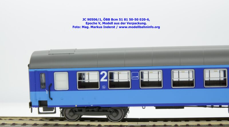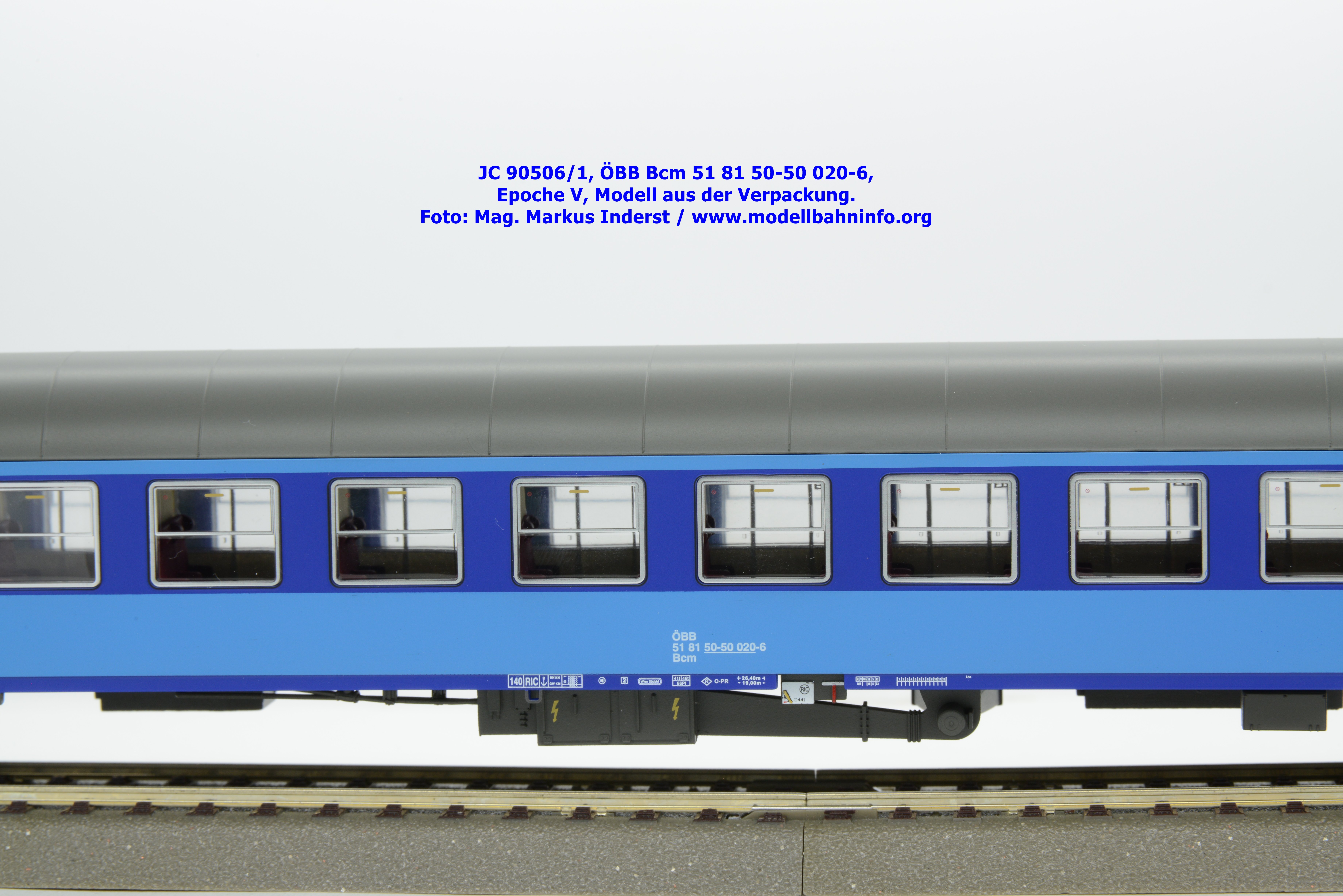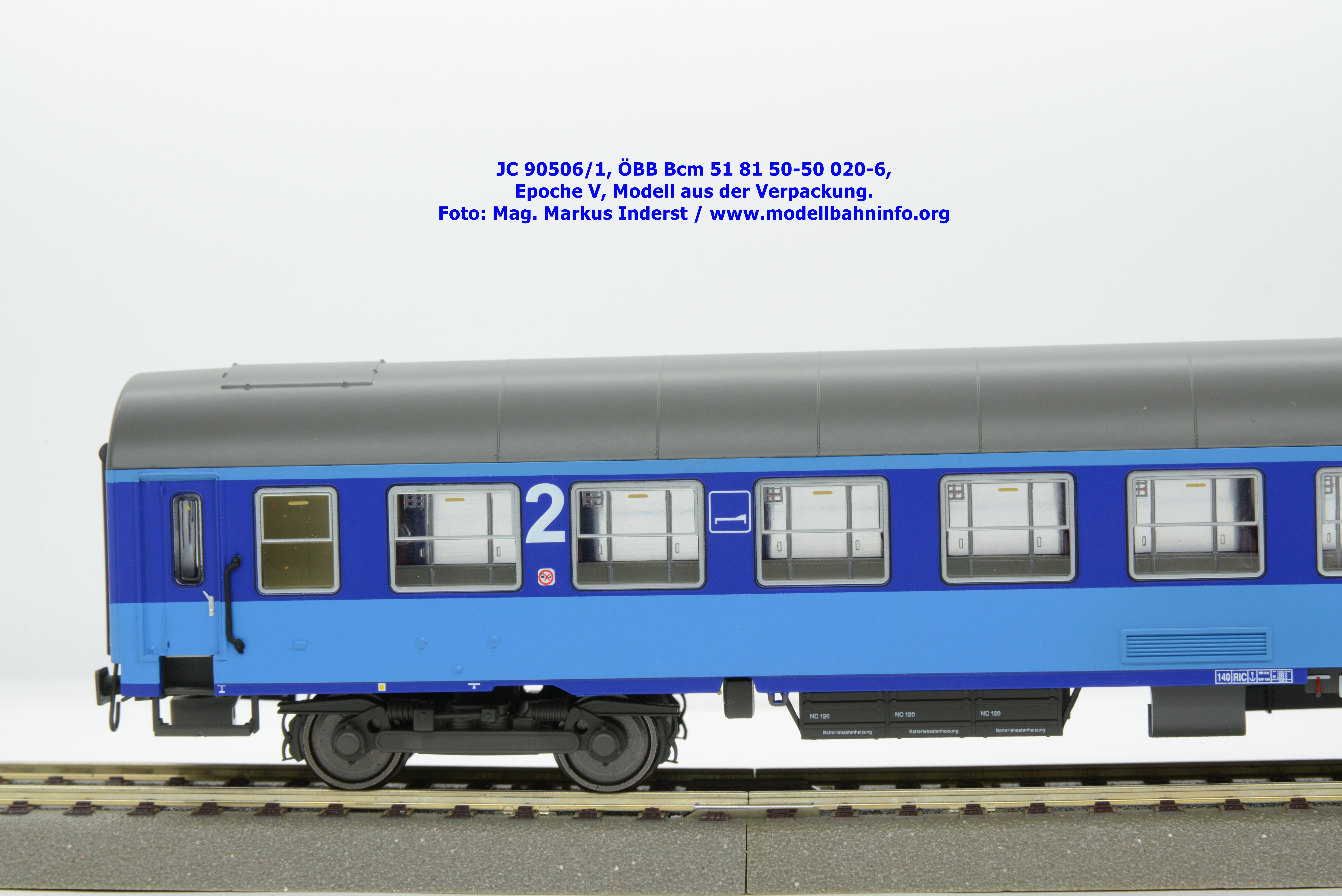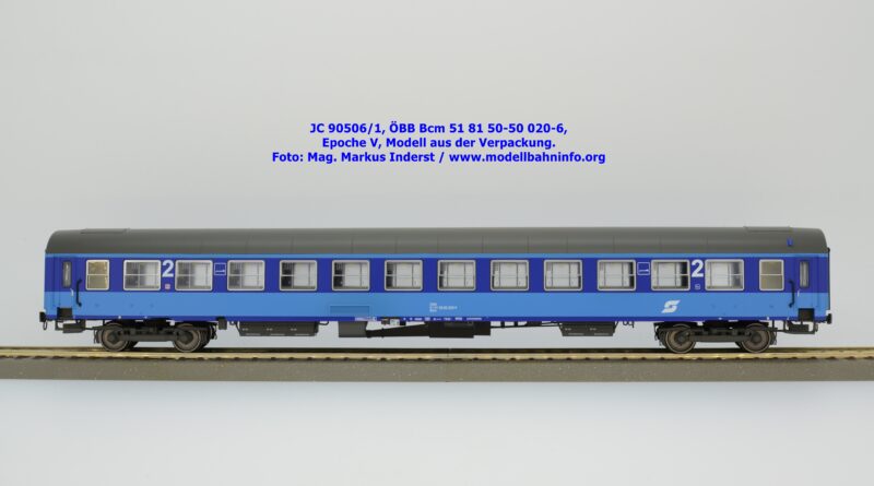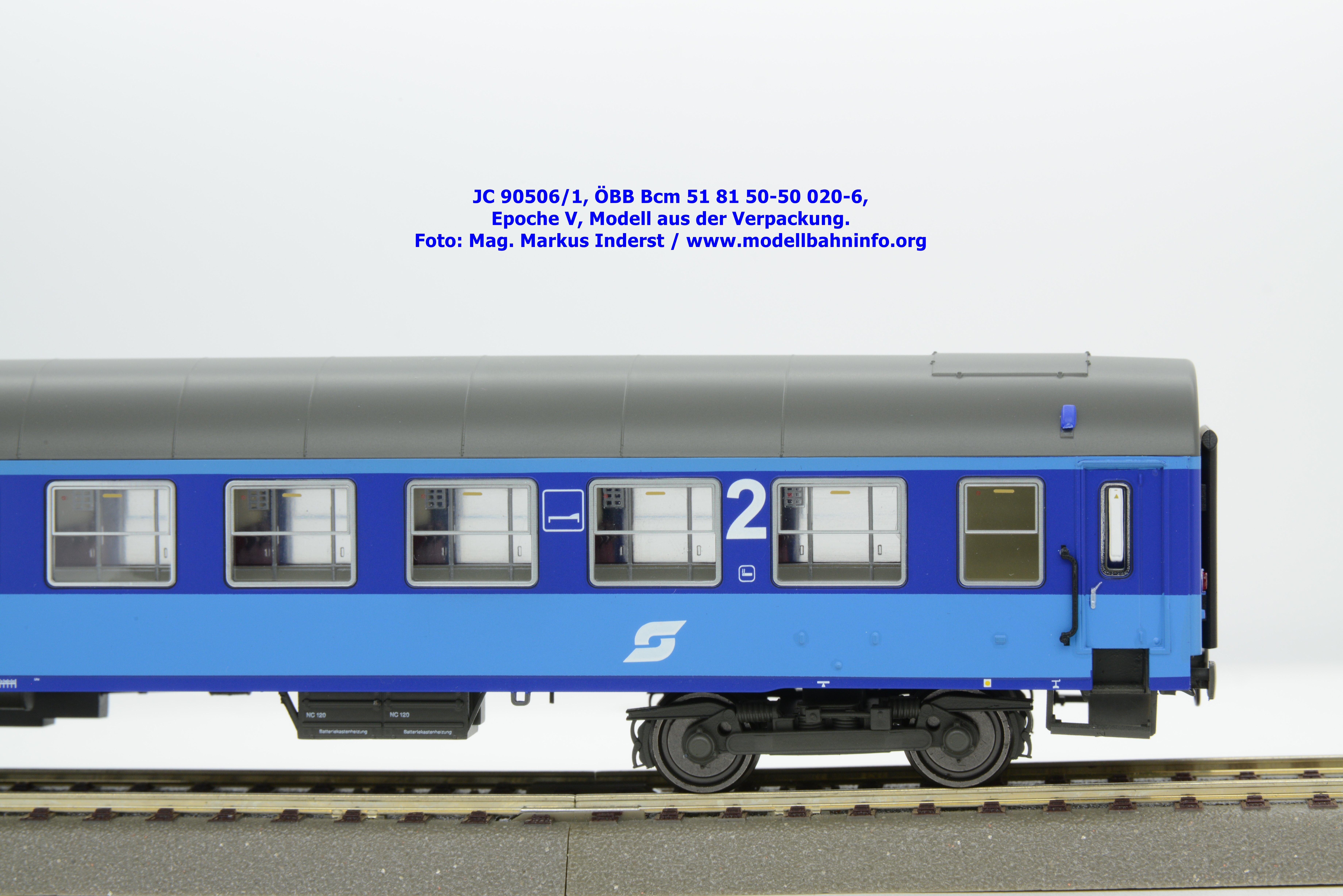 Die ÖBB haben zeitweise Farbversuche bei Ihren Liegewagen durchgeführt, indem zwei verschiedene Farbtöne in Hell- und Dunkelblau angewendet wurden. Diese Lackierung erhielt der als Bcm 51 81 50-50 020-6 beschriftete Liegewagen, der seinen Heimatbahnhof in „Wien Südbhf“ hat. Die Revisionsanschriften werden mit REV Ws 18. 5.92 angegeben, somit reiht sich das Modell in die Epoche V ein. Der Vorbildwagen gehört einer Serie von drei Liegewagen an, die 1963 in der Werft Linz gebaut wurden. Die Musterlackierung wurde 1991 in den Farbtönen Lichtblau (RAL 5012) und Ultramarinblau (RAL 5002) umgesetzt. Alle drei Wagen liefen auf Drehgestellen der Bauart Wegmann 15. Beim genauen Abgleich mit Vorbildfotos erkennt man eine inkorrekte Darstellung des Fensterbandes.