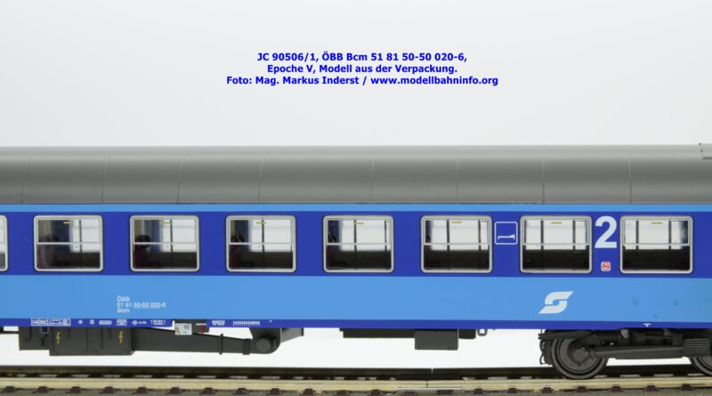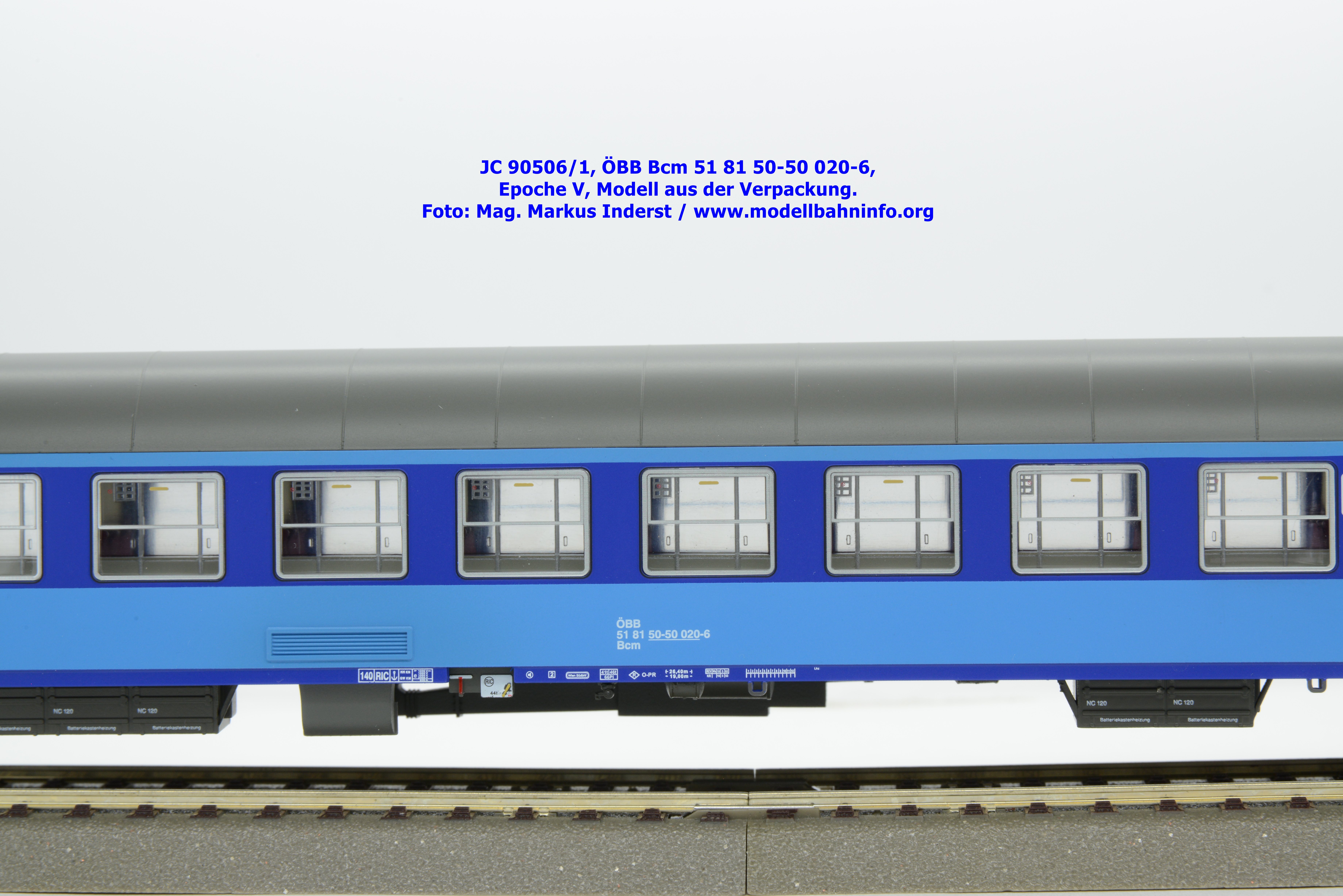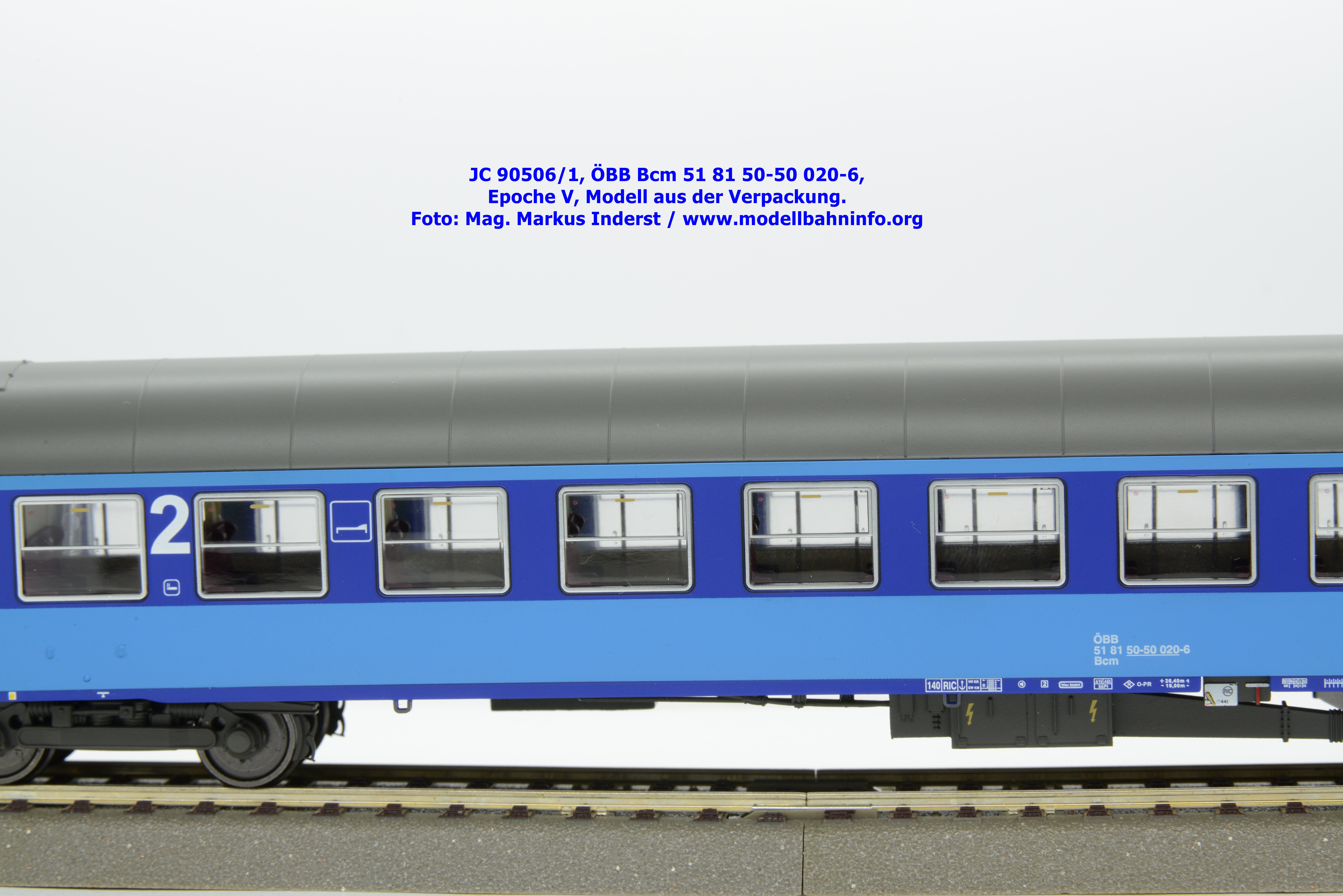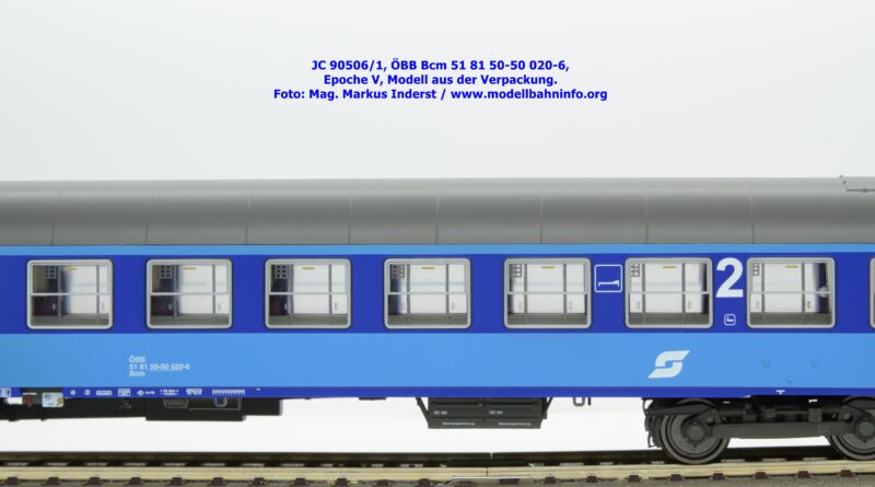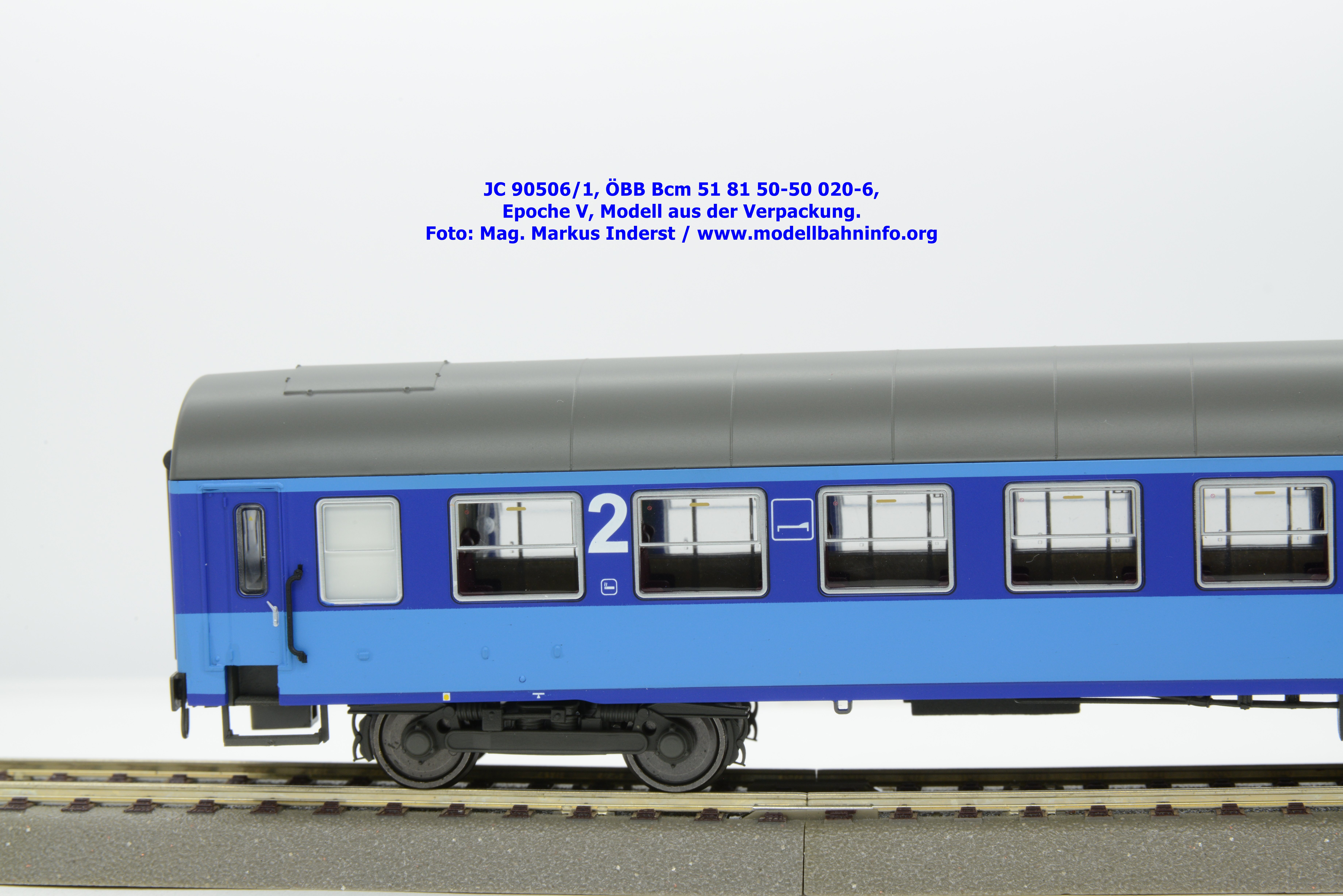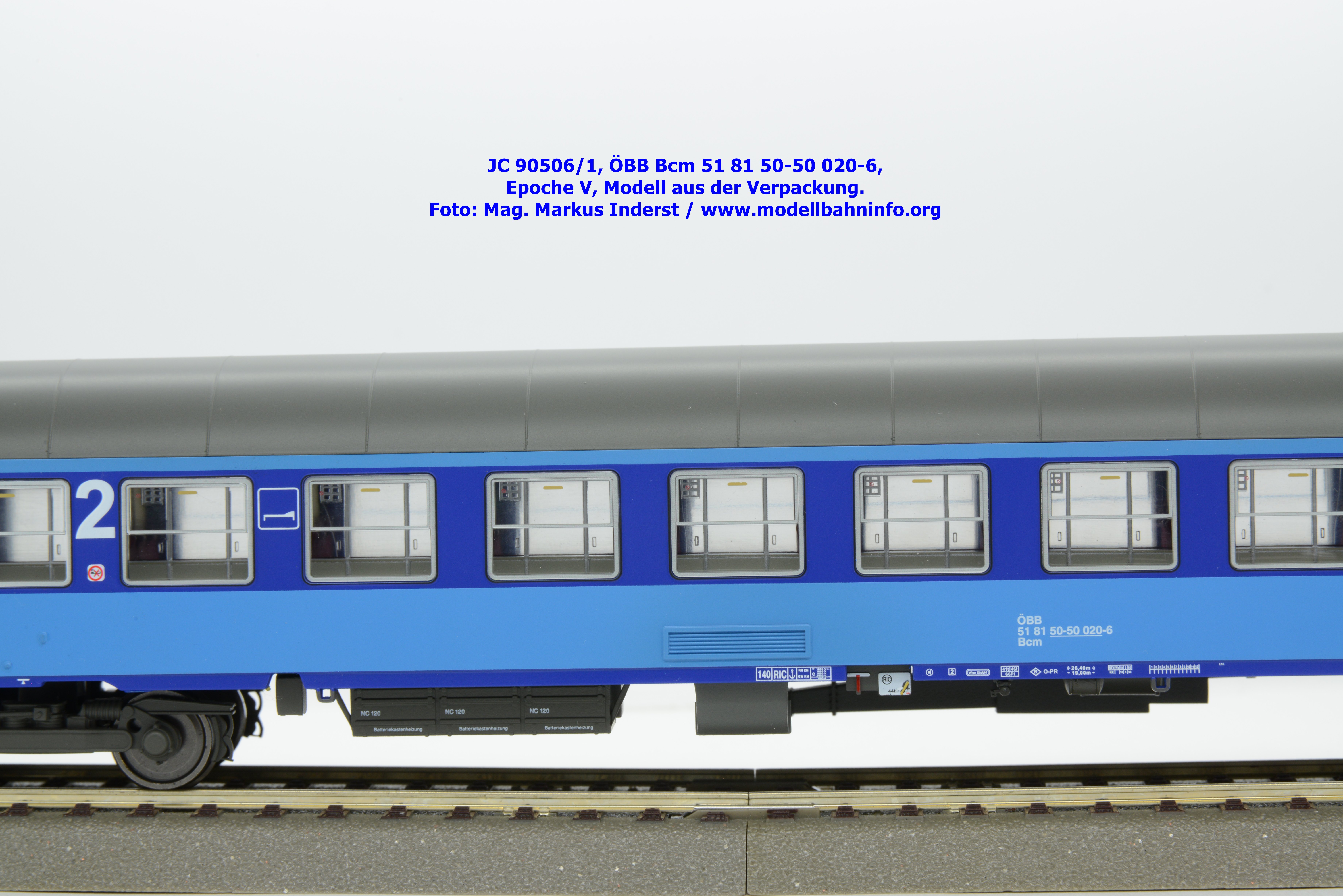Die ÖBB haben zeitweise Farbversuche bei Ihren Liegewagen durchgeführt, indem zwei verschiedene Farbtöne in Hell- und Dunkelblau angewendet wurden. Diese Lackierung erhielt der als Bcm 51 81 50-50 020-6 beschriftete Liegewagen, der seinen Heimatbahnhof in „Wien Südbhf“ hat. Die Revisionsanschriften werden mit REV Ws 18. 5.92 angegeben, somit reiht sich das Modell in die Epoche V ein. Der Vorbildwagen gehört einer Serie von drei Liegewagen an, die 1963 in der Werft Linz gebaut wurden. Die Musterlackierung wurde 1991 in den Farbtönen Lichtblau (RAL 5012) und Ultramarinblau (RAL 5002) umgesetzt. Alle drei Wagen liefen auf Drehgestellen der Bauart Wegmann 15. Beim genauen Abgleich mit Vorbildfotos erkennt man eine inkorrekte Darstellung des Fensterbandes.