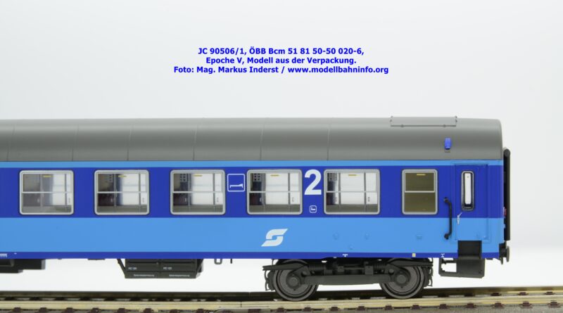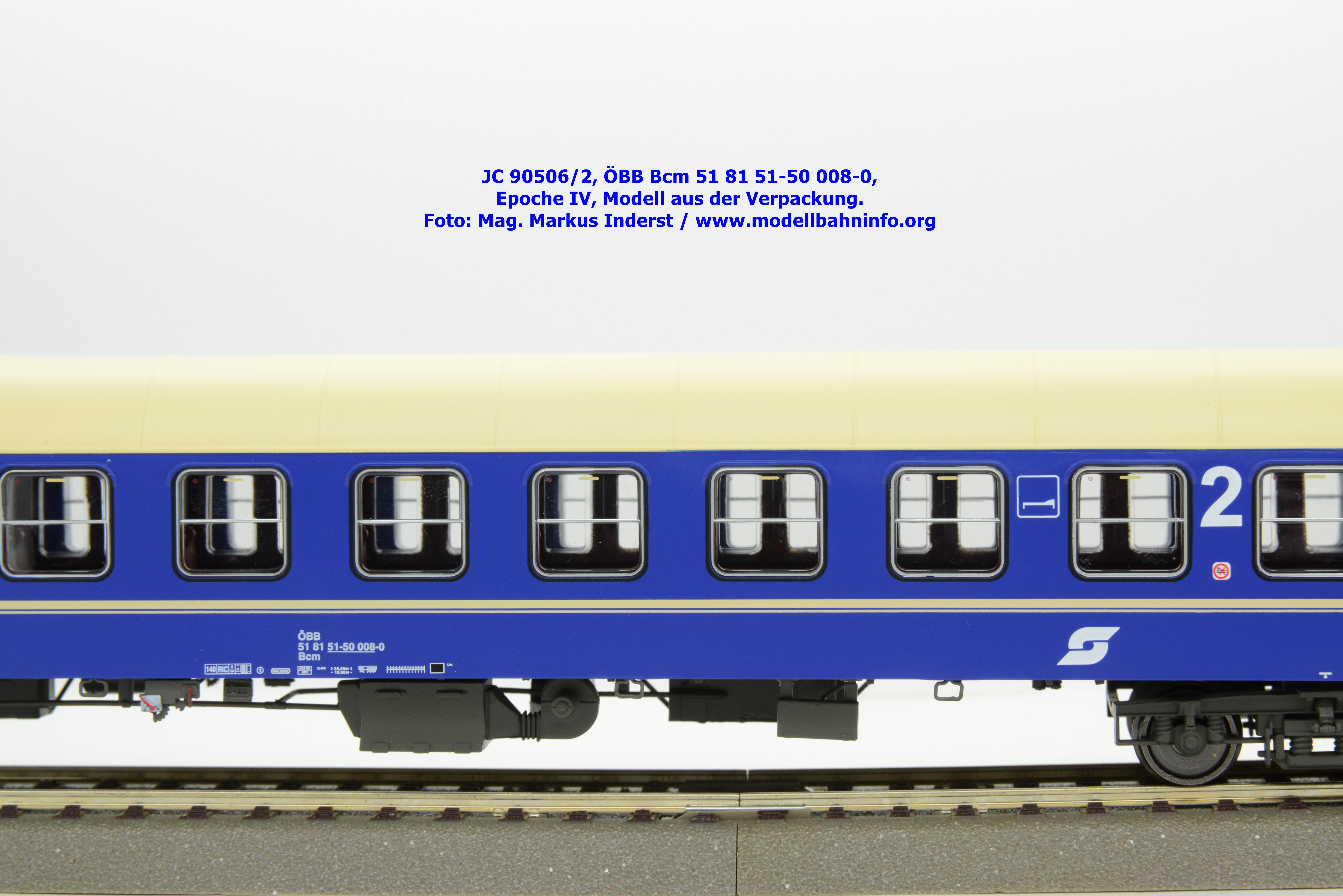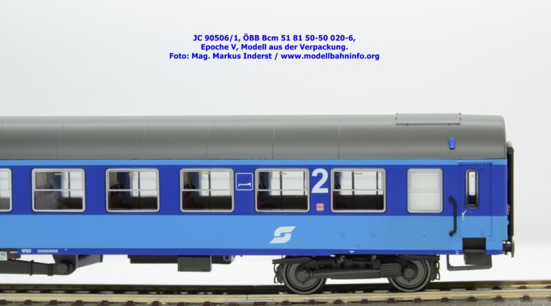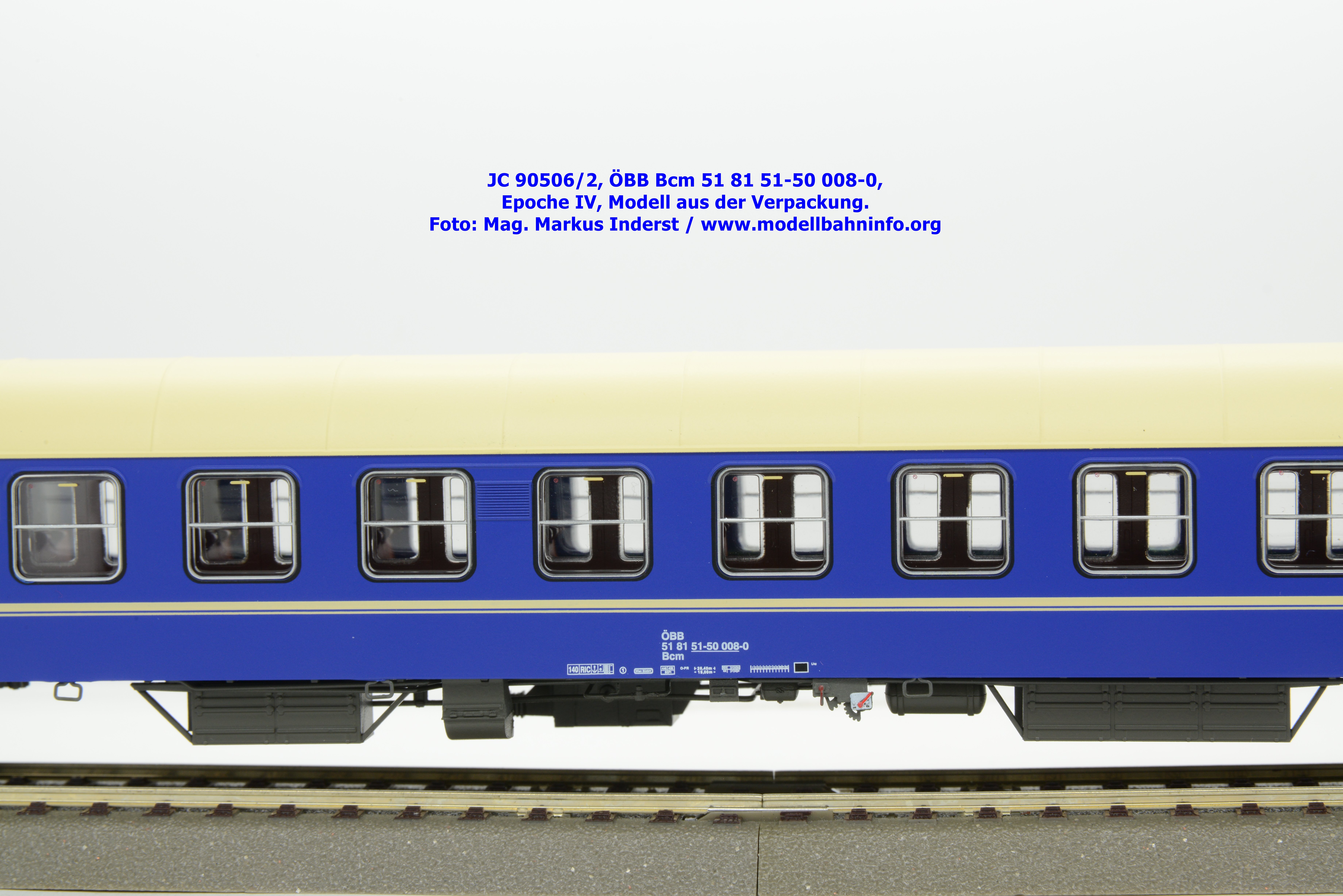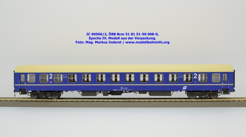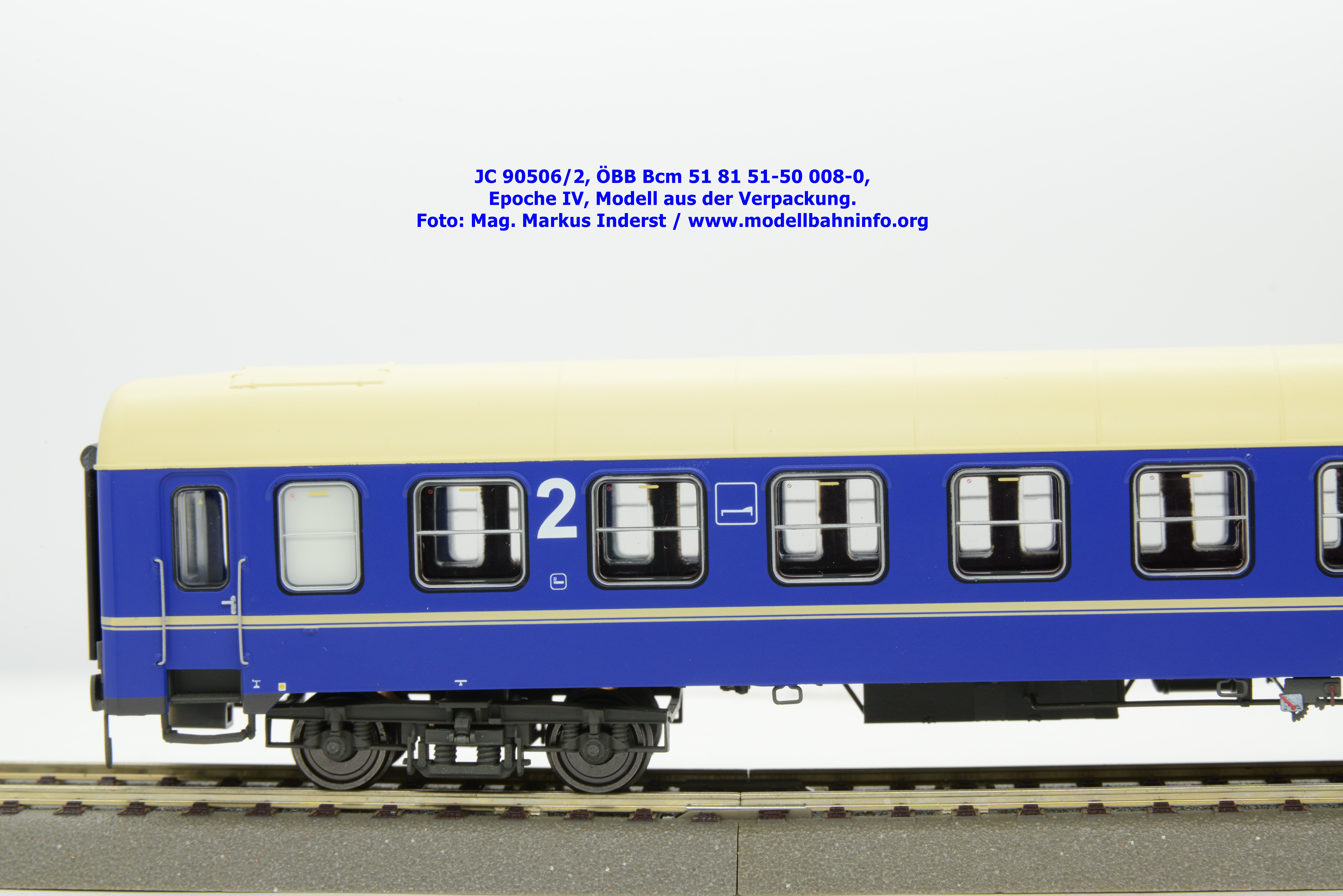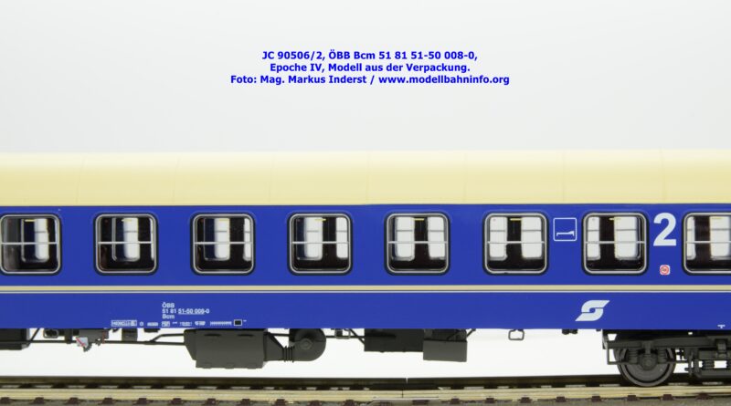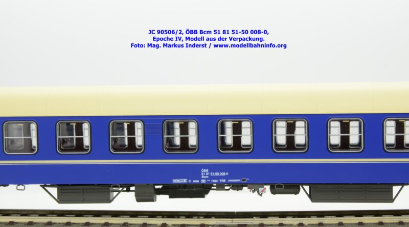 Die ÖBB haben zeitweise Farbversuche bei Ihren Liegewagen durchgeführt, indem zwei verschiedene Farbtöne in Hell- und Dunkelblau angewendet wurden. Diese Lackierung erhielt der als Bcm 51 81 50-50 020-6 beschriftete Liegewagen, der seinen Heimatbahnhof in „Wien Südbhf“ hat. Die Revisionsanschriften werden mit REV Ws 18. 5.92 angegeben, somit reiht sich das Modell in die Epoche V ein. Der Vorbildwagen gehört einer Serie von drei Liegewagen an, die 1963 in der Werft Linz gebaut wurden. Die Musterlackierung wurde 1991 in den Farbtönen Lichtblau (RAL 5012) und Ultramarinblau (RAL 5002) umgesetzt. Alle drei Wagen liefen auf Drehgestellen der Bauart Wegmann 15. Beim genauen Abgleich mit Vorbildfotos erkennt man eine inkorrekte Darstellung des Fensterbandes.