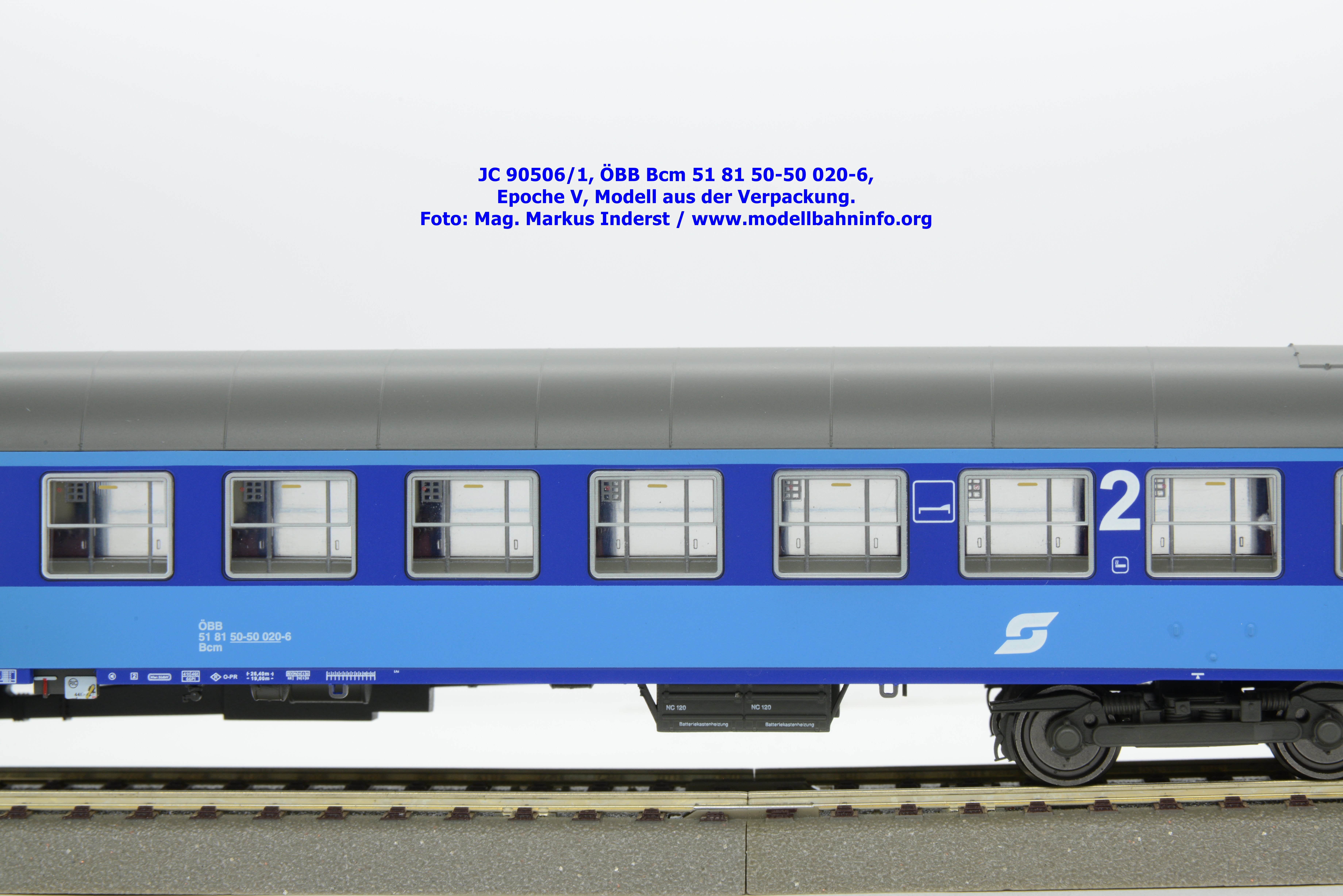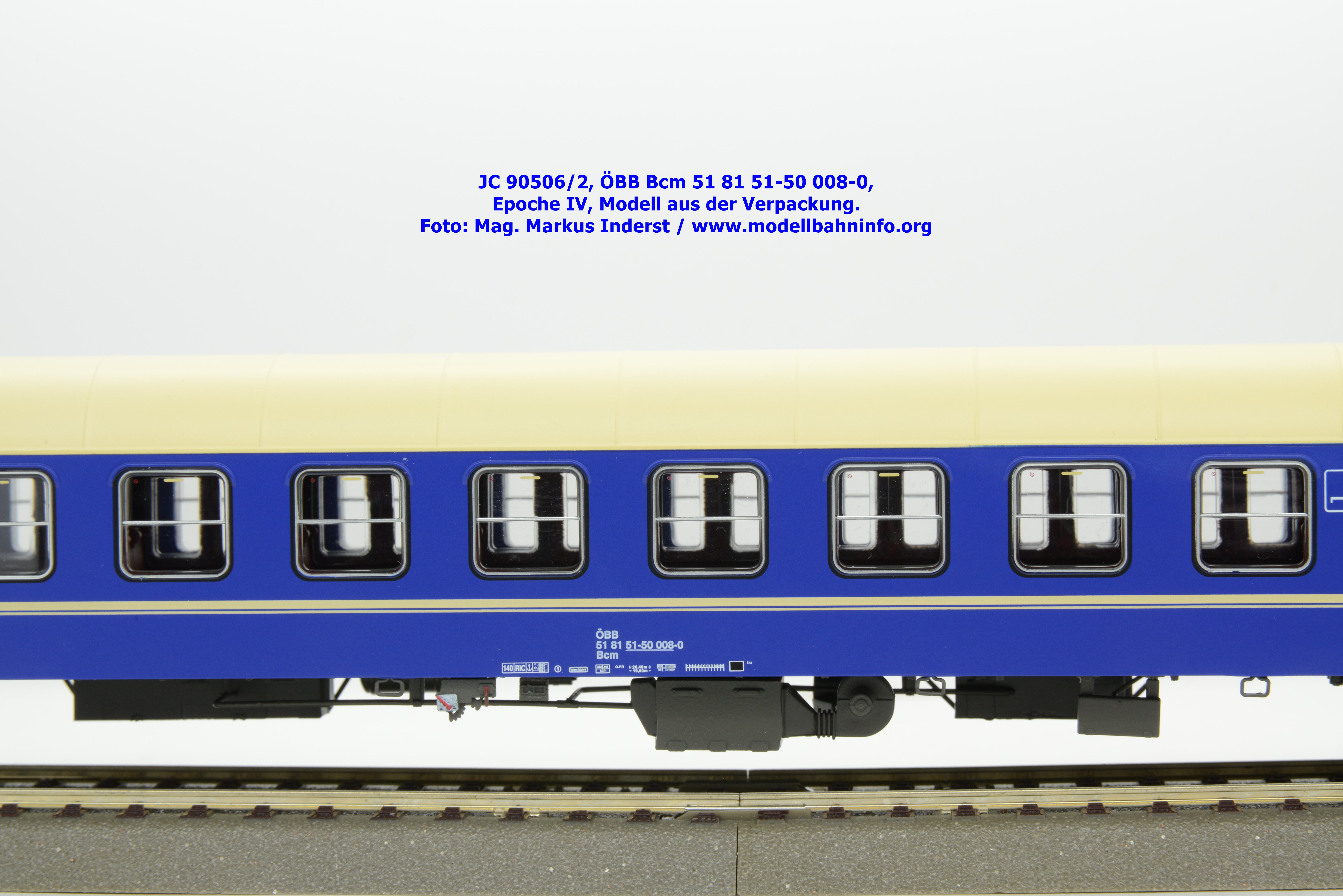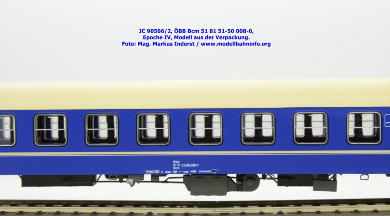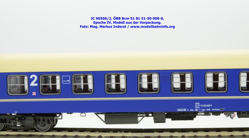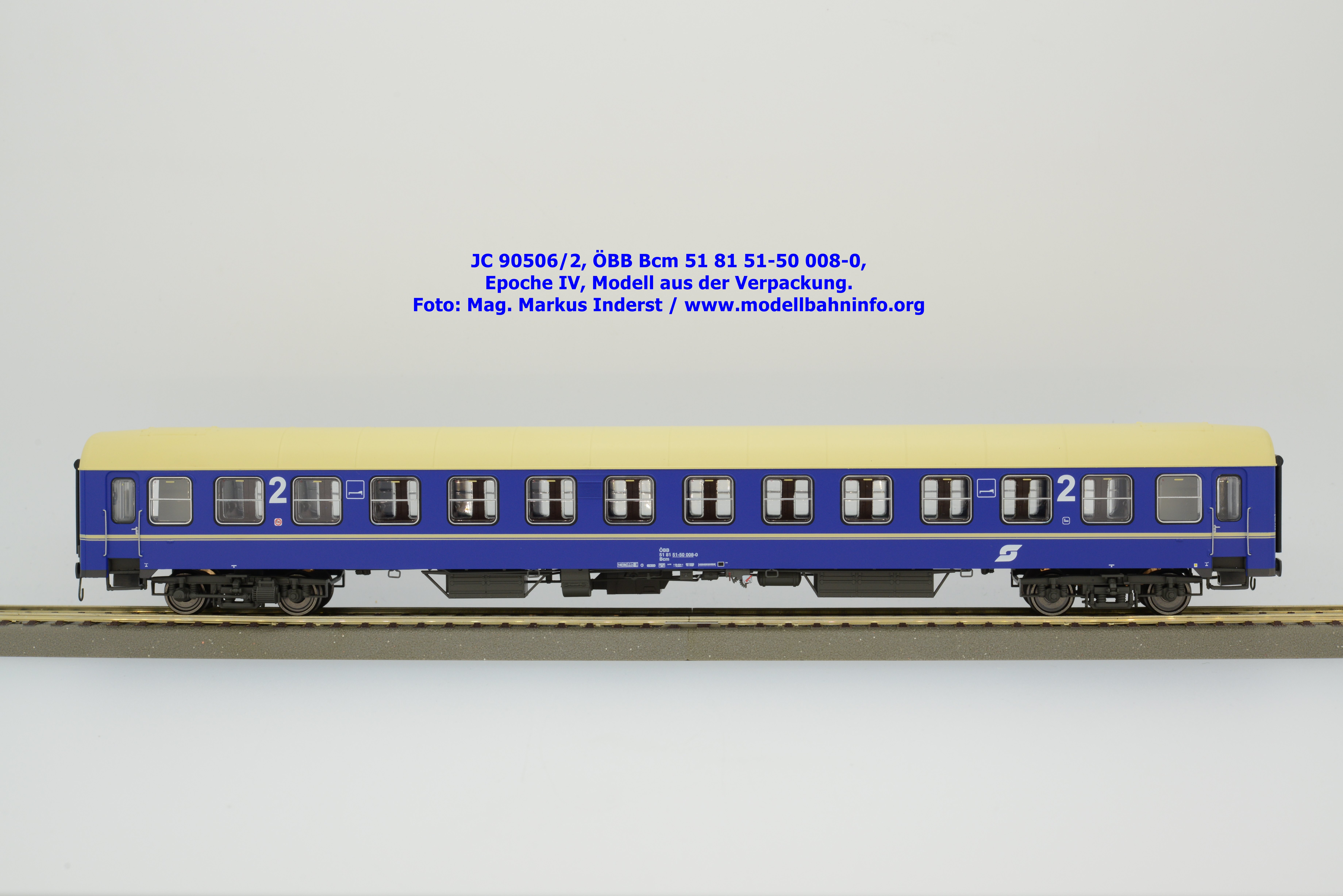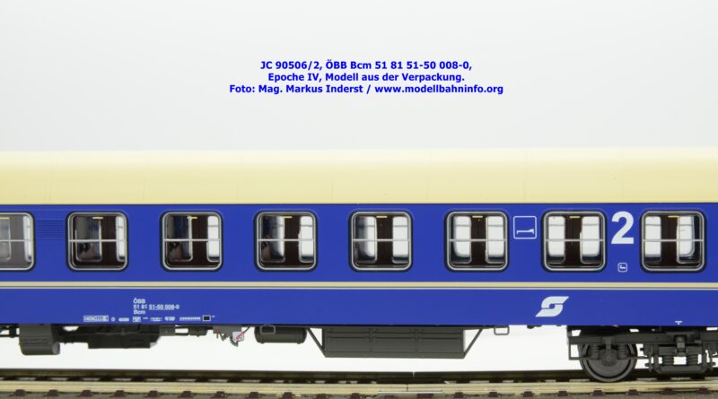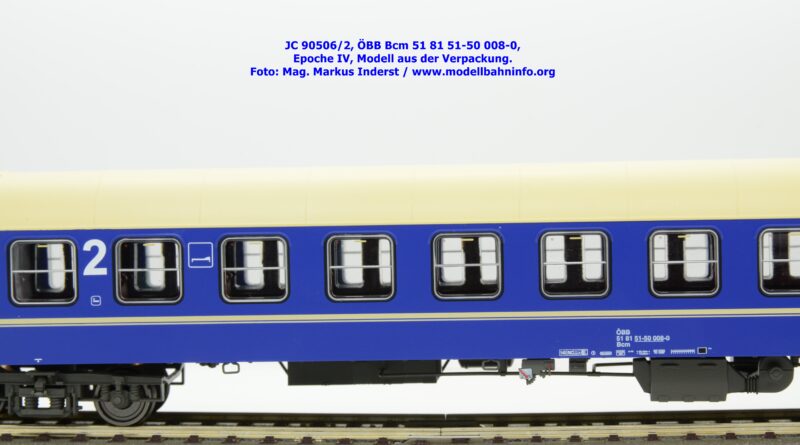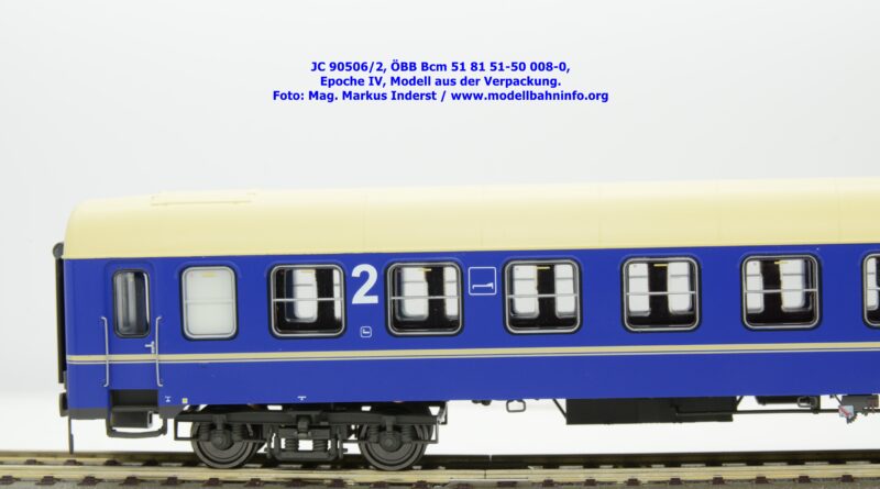Die ÖBB haben zeitweise Farbversuche bei Ihren Liegewagen durchgeführt, indem zwei verschiedene Farbtöne in Hell- und Dunkelblau angewendet wurden. Diese Lackierung erhielt der als Bcm 51 81 50-50 020-6 beschriftete Liegewagen, der seinen Heimatbahnhof in „Wien Südbhf“ hat. Die Revisionsanschriften werden mit REV Ws 18. 5.92 angegeben, somit reiht sich das Modell in die Epoche V ein. Der Vorbildwagen gehört einer Serie von drei Liegewagen an, die 1963 in der Werft Linz gebaut wurden. Die Musterlackierung wurde 1991 in den Farbtönen Lichtblau (RAL 5012) und Ultramarinblau (RAL 5002) umgesetzt. Alle drei Wagen liefen auf Drehgestellen der Bauart Wegmann 15. Beim genauen Abgleich mit Vorbildfotos erkennt man eine inkorrekte Darstellung des Fensterbandes.