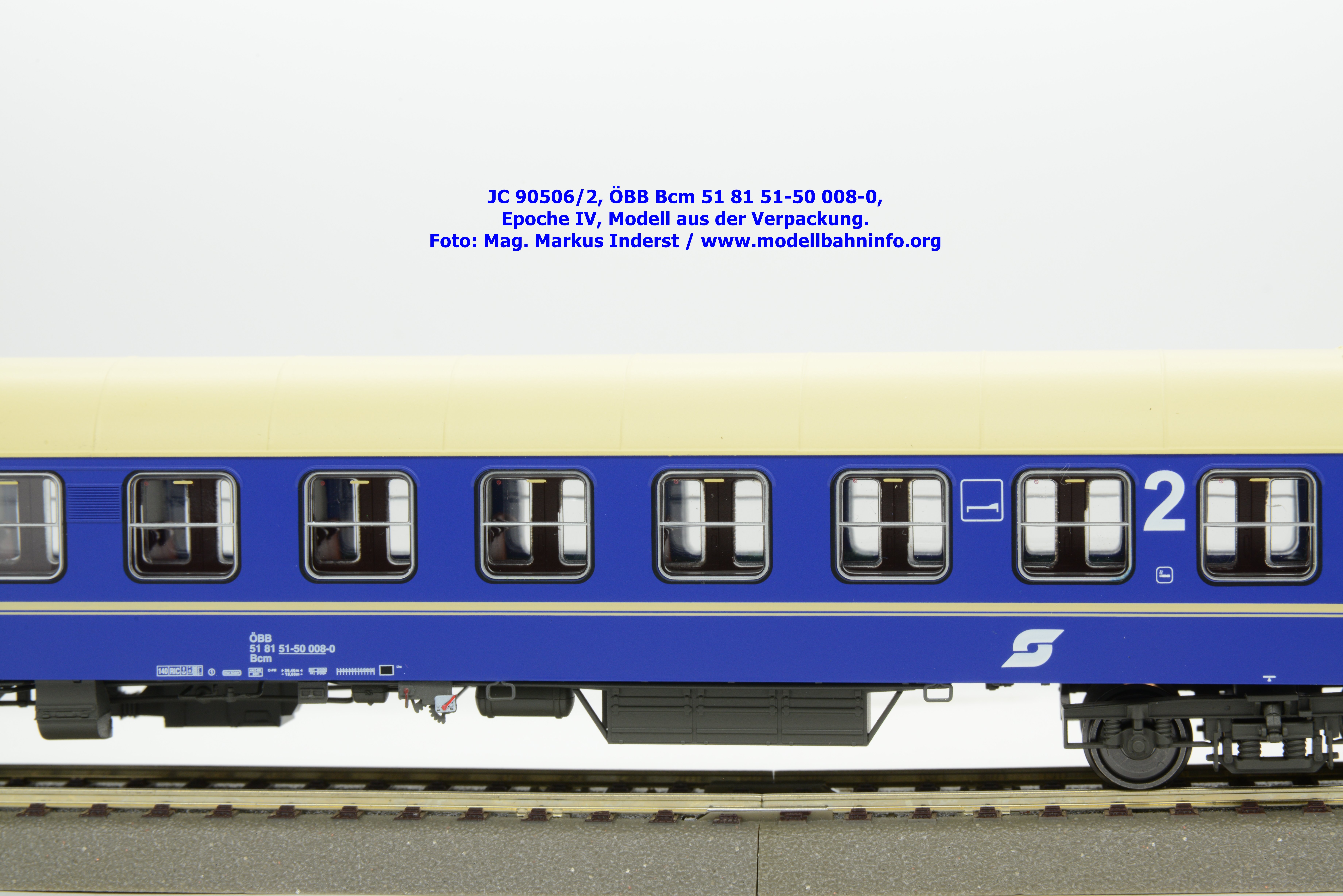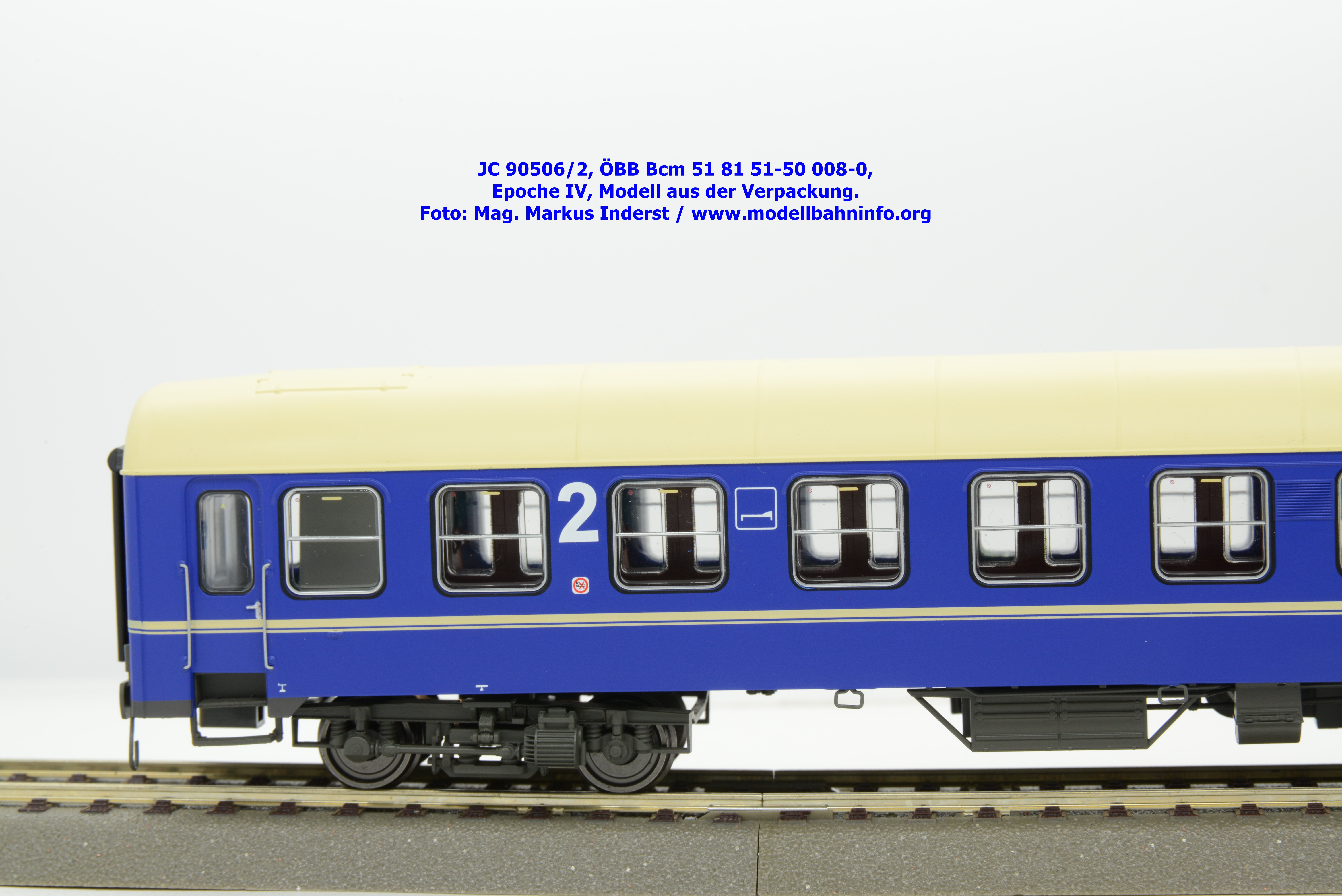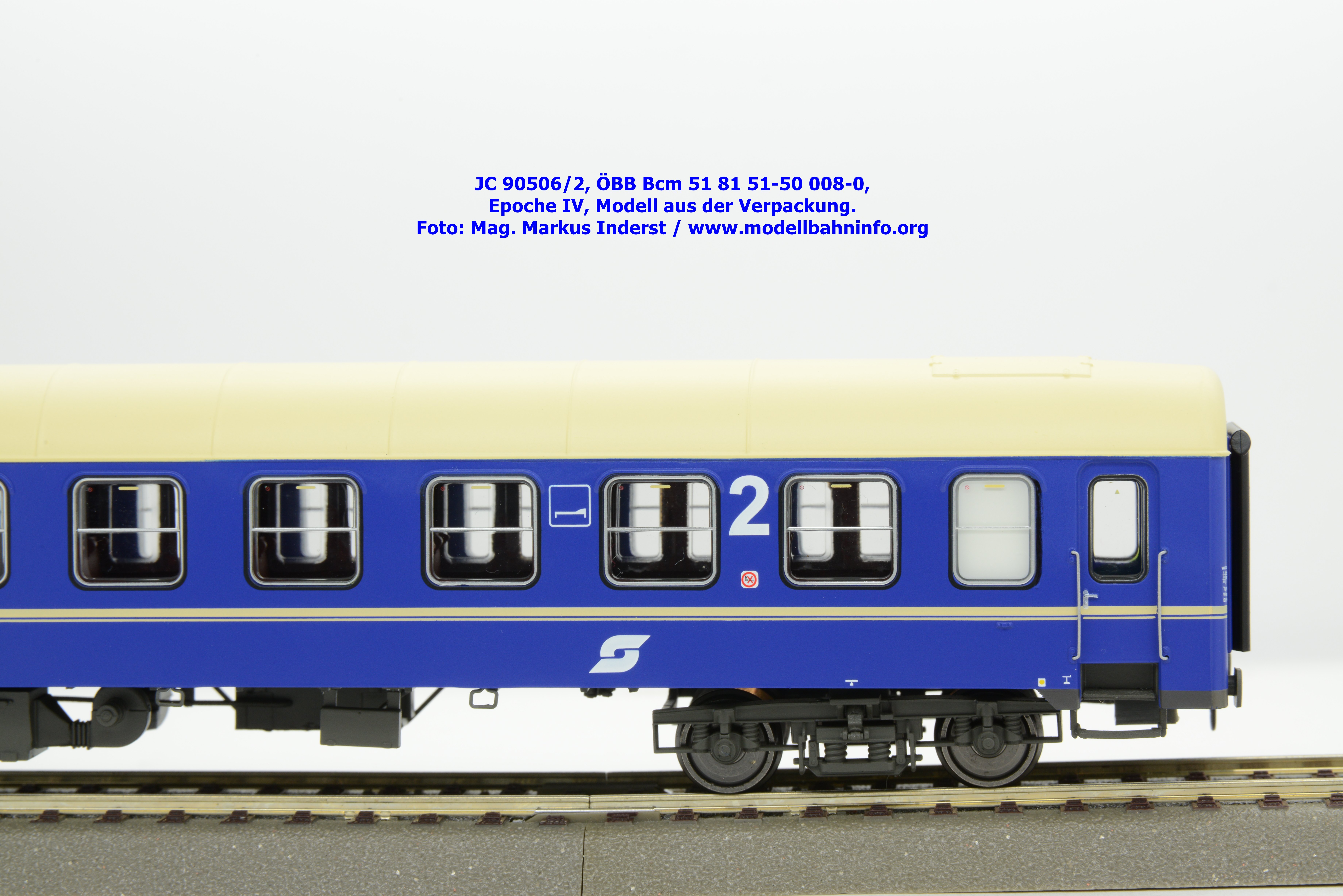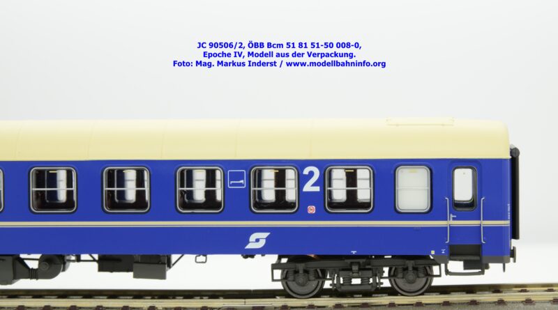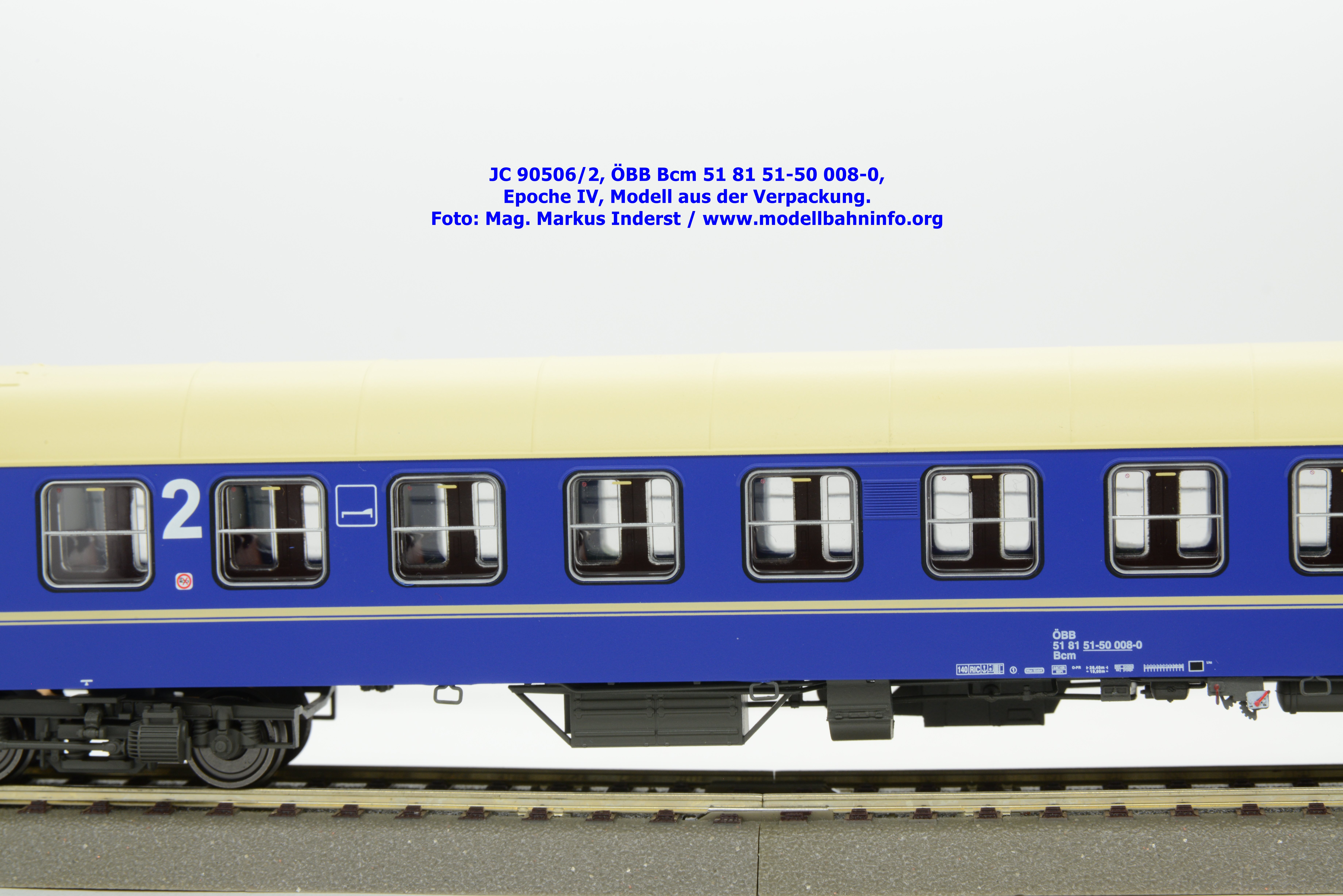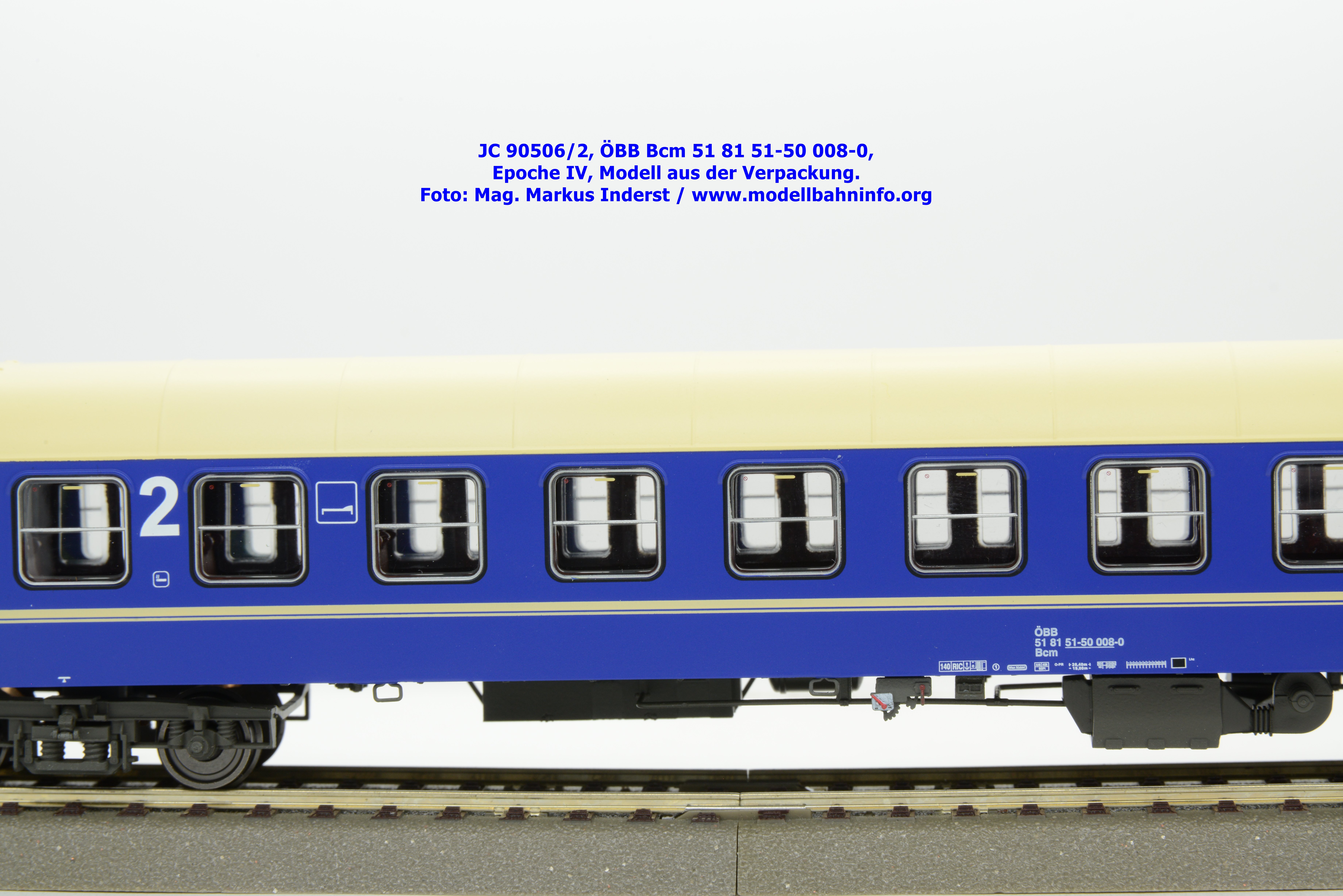 Die ÖBB haben zeitweise Farbversuche bei Ihren Liegewagen durchgeführt, indem zwei verschiedene Farbtöne in Hell- und Dunkelblau angewendet wurden. Diese Lackierung erhielt der als Bcm 51 81 50-50 020-6 beschriftete Liegewagen, der seinen Heimatbahnhof in „Wien Südbhf“ hat. Die Revisionsanschriften werden mit REV Ws 18. 5.92 angegeben, somit reiht sich das Modell in die Epoche V ein. Der Vorbildwagen gehört einer Serie von drei Liegewagen an, die 1963 in der Werft Linz gebaut wurden. Die Musterlackierung wurde 1991 in den Farbtönen Lichtblau (RAL 5012) und Ultramarinblau (RAL 5002) umgesetzt. Alle drei Wagen liefen auf Drehgestellen der Bauart Wegmann 15. Beim genauen Abgleich mit Vorbildfotos erkennt man eine inkorrekte Darstellung des Fensterbandes.