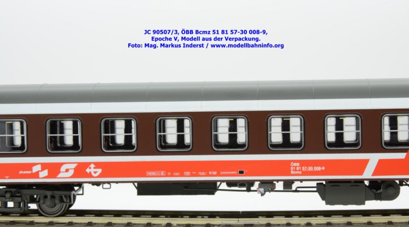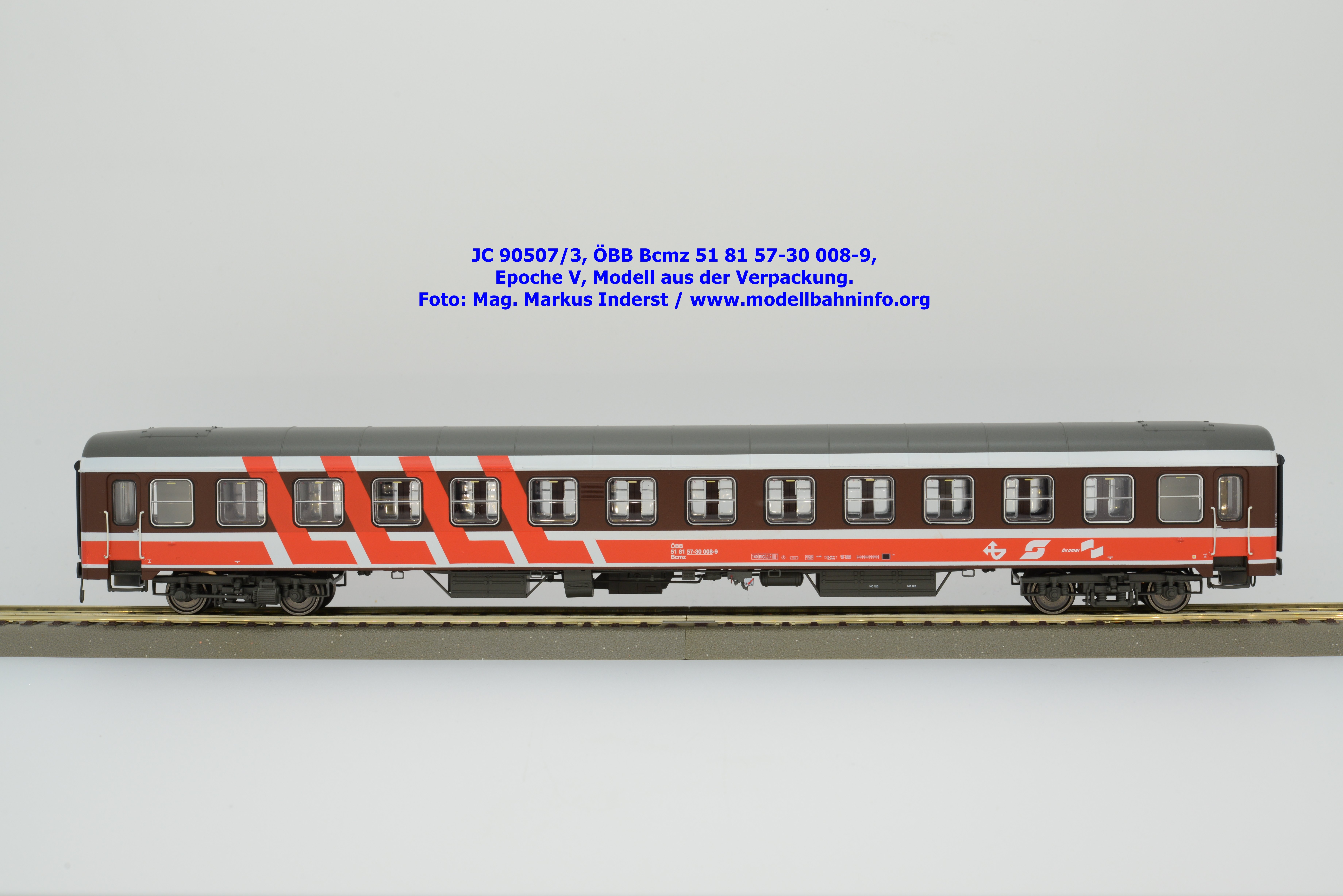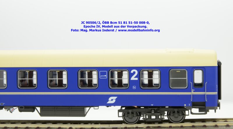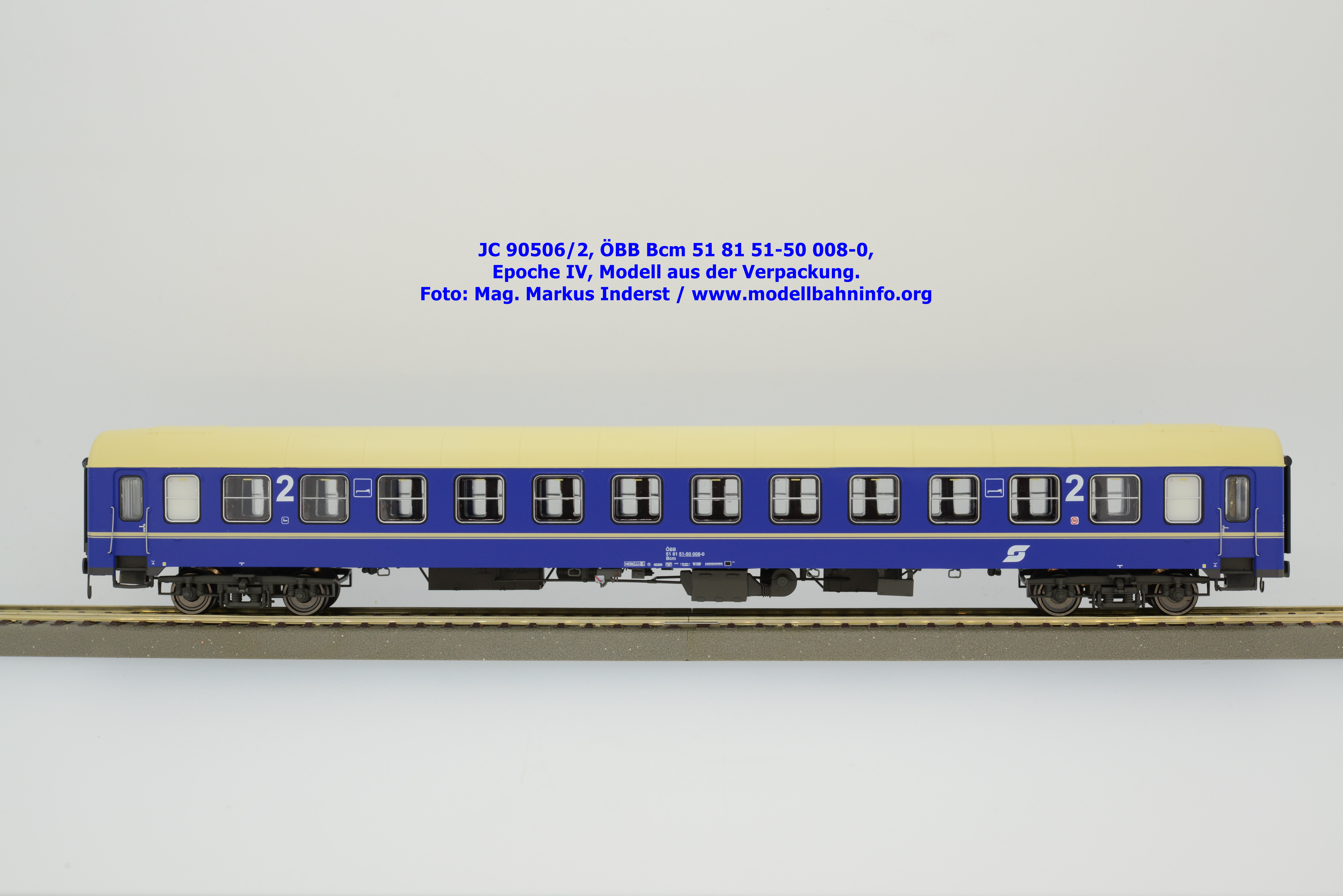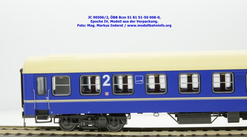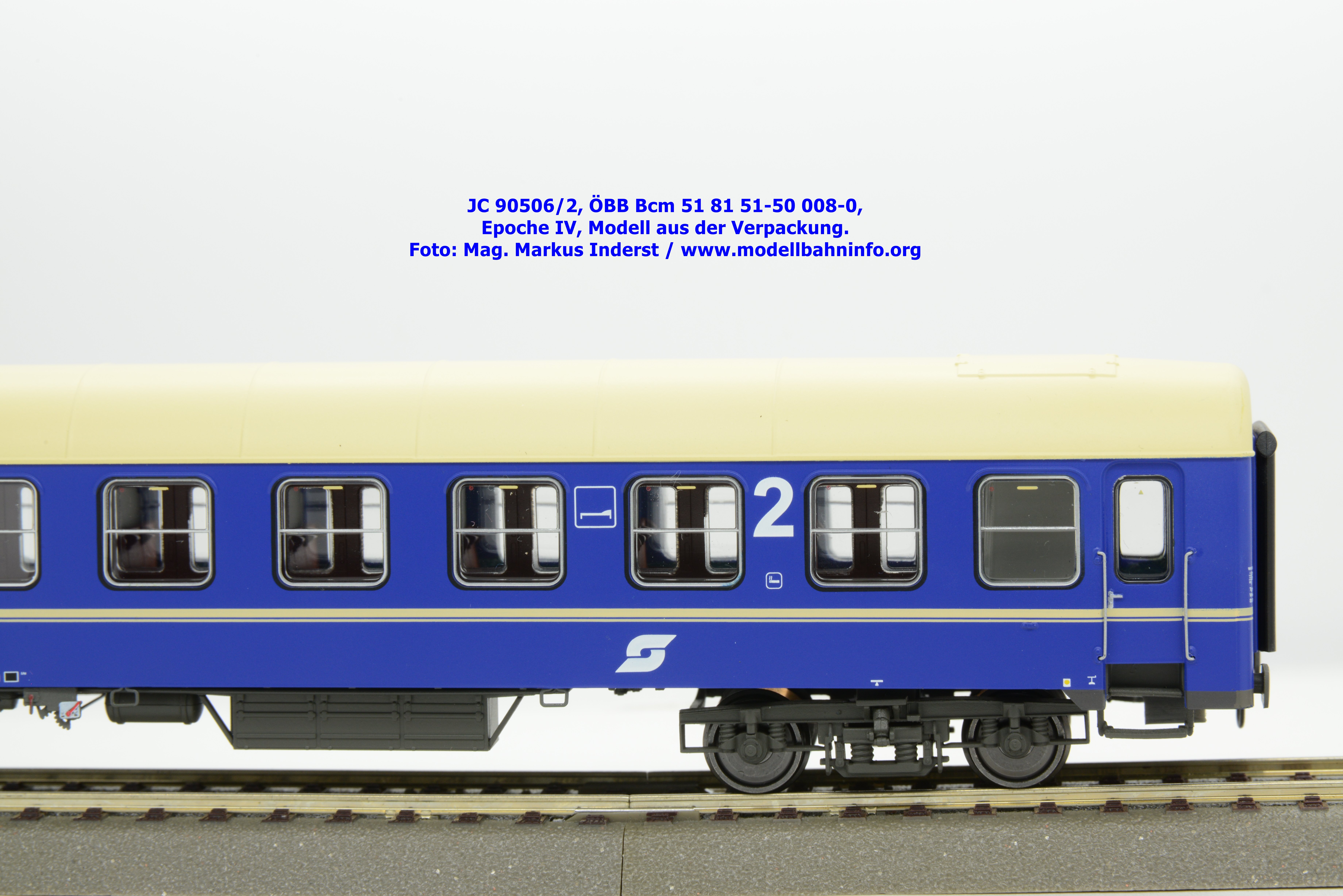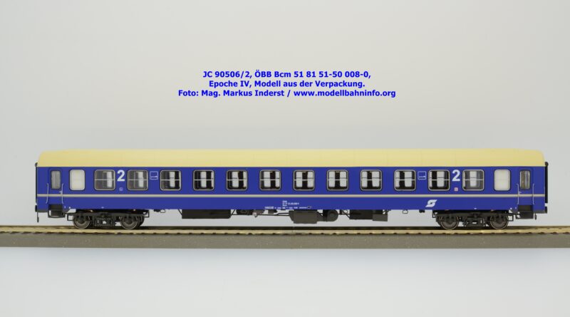 Die ÖBB haben zeitweise Farbversuche bei Ihren Liegewagen durchgeführt, indem zwei verschiedene Farbtöne in Hell- und Dunkelblau angewendet wurden. Diese Lackierung erhielt der als Bcm 51 81 50-50 020-6 beschriftete Liegewagen, der seinen Heimatbahnhof in „Wien Südbhf“ hat. Die Revisionsanschriften werden mit REV Ws 18. 5.92 angegeben, somit reiht sich das Modell in die Epoche V ein. Der Vorbildwagen gehört einer Serie von drei Liegewagen an, die 1963 in der Werft Linz gebaut wurden. Die Musterlackierung wurde 1991 in den Farbtönen Lichtblau (RAL 5012) und Ultramarinblau (RAL 5002) umgesetzt. Alle drei Wagen liefen auf Drehgestellen der Bauart Wegmann 15. Beim genauen Abgleich mit Vorbildfotos erkennt man eine inkorrekte Darstellung des Fensterbandes.