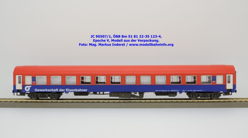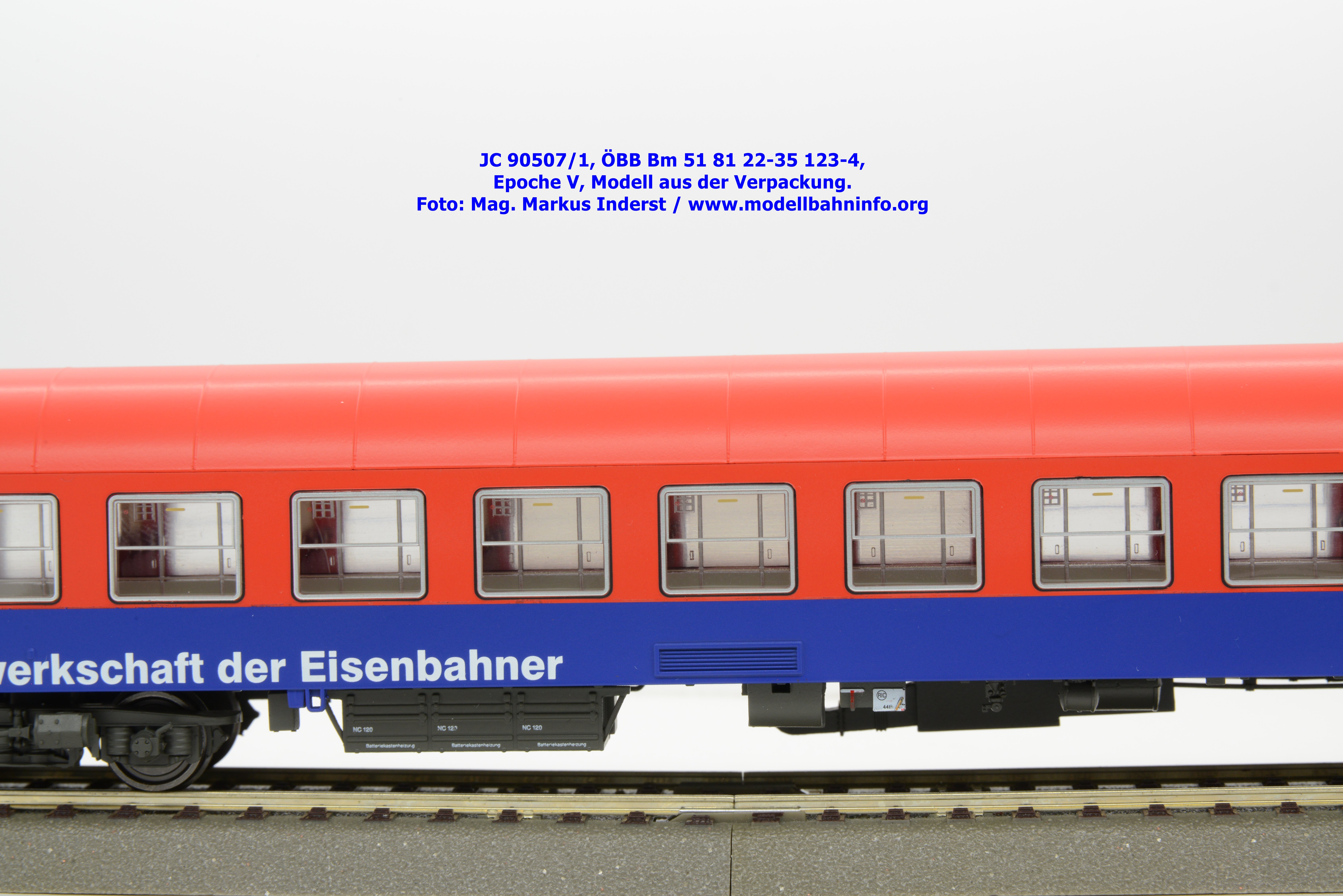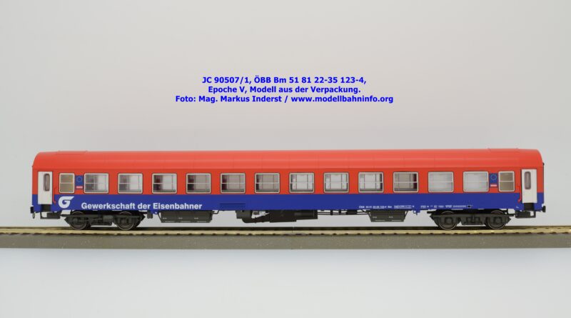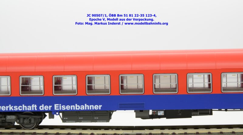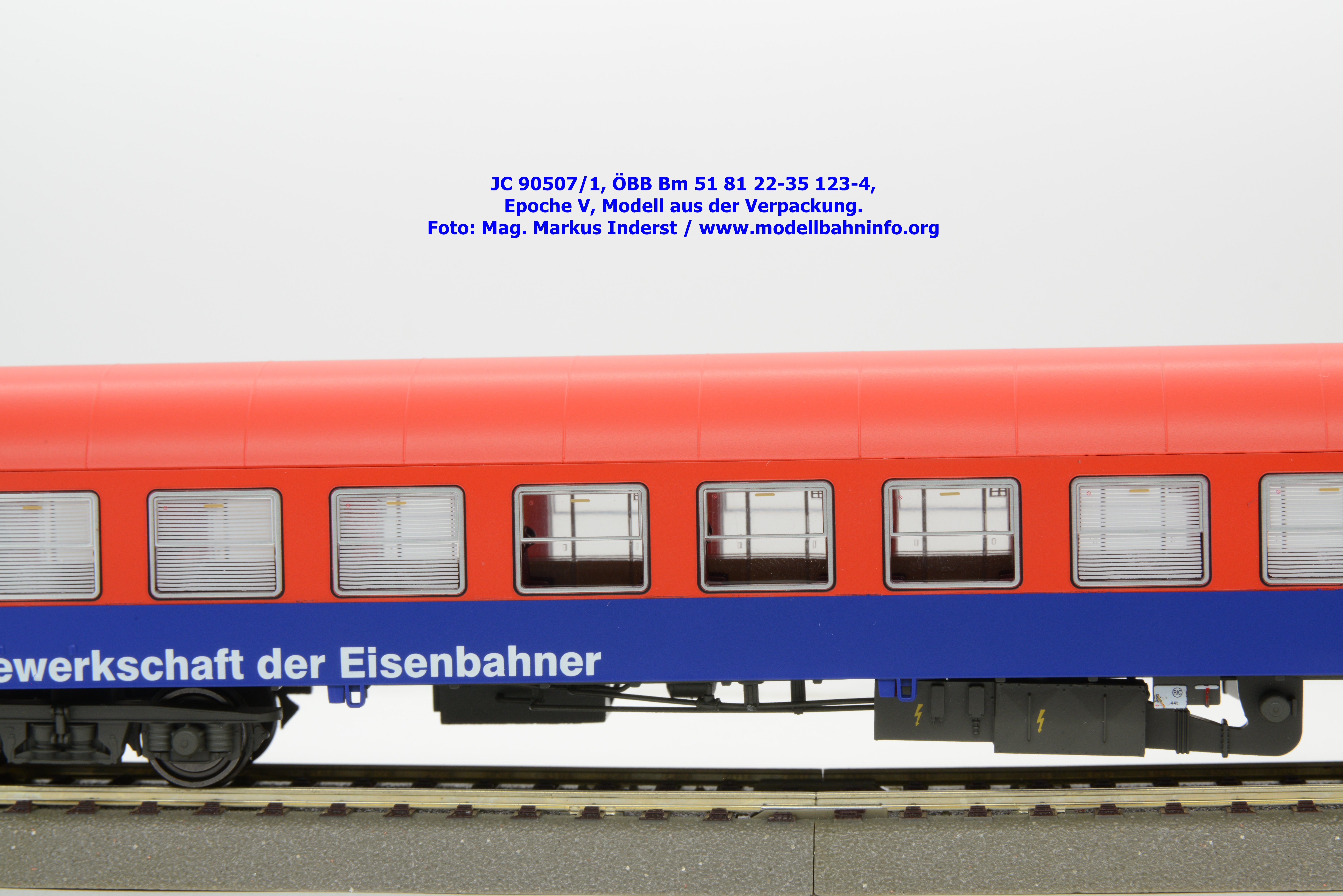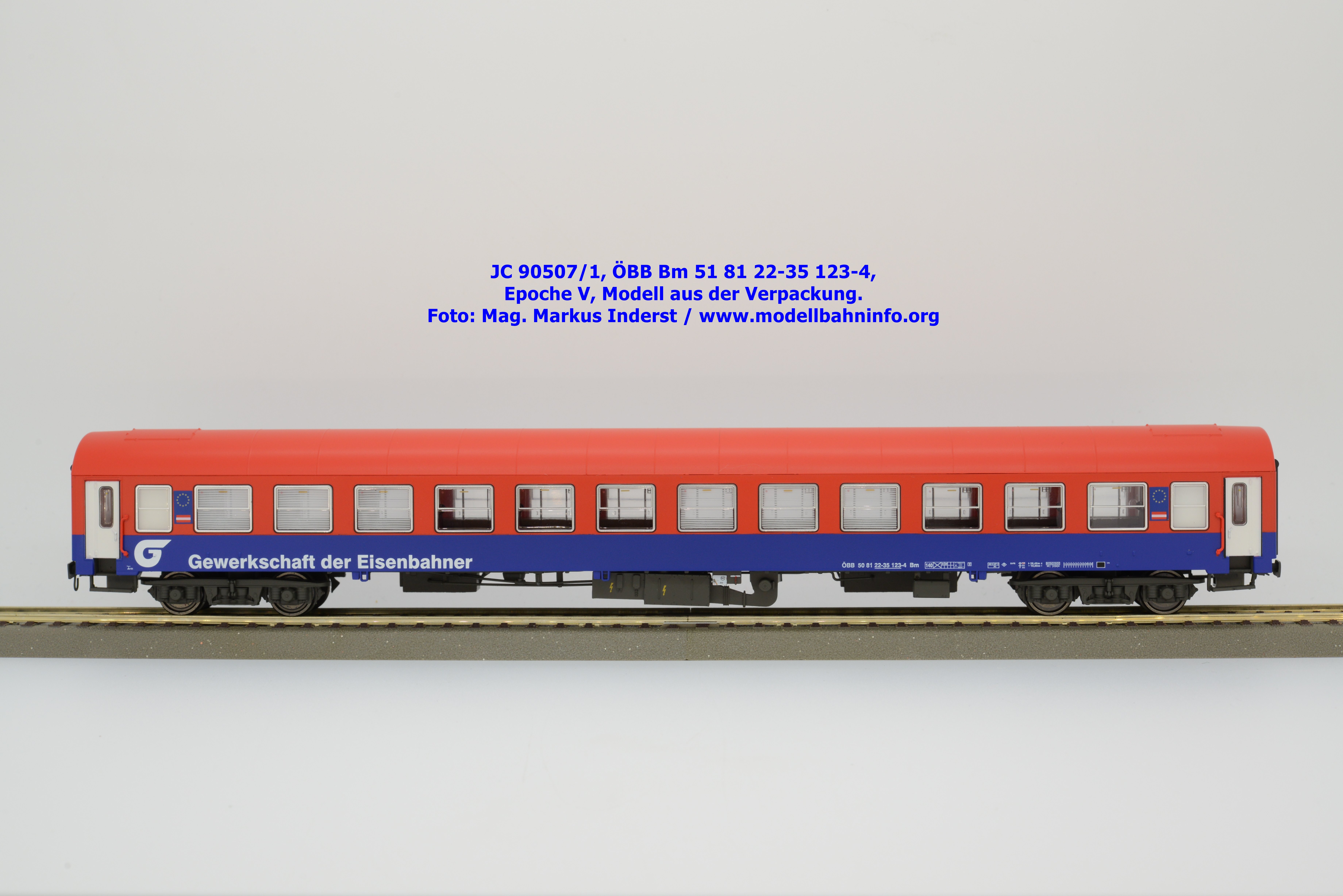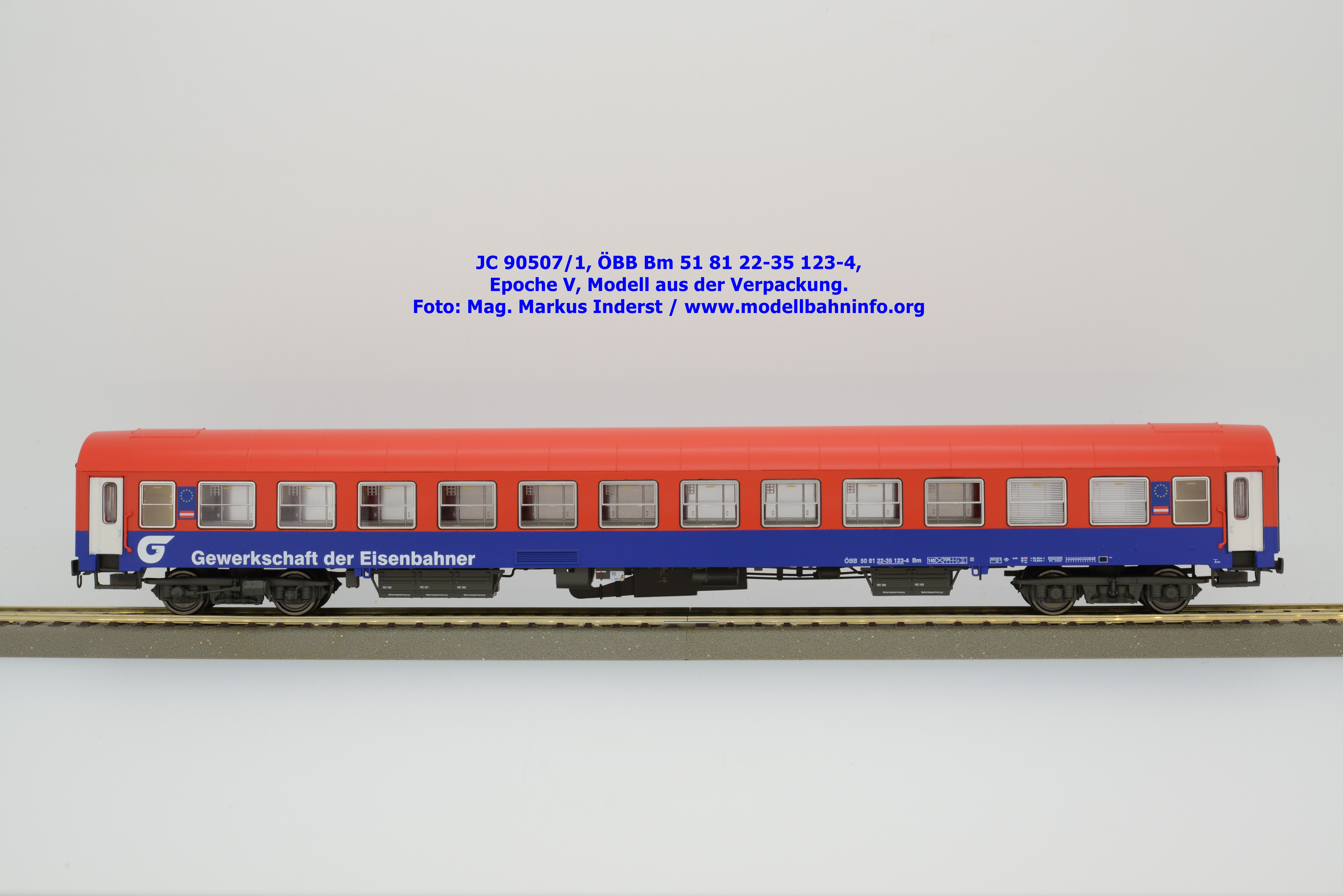 Der blau-rot-lackierte Personenwagen war lange Zeit im Areal der Zfl. Linz abgestellt und diente wohl als Konferenzwagen für die Gewerkschaft der Eisenbahner. Diese ließ den Wagen in den Farben rot und dunkelblau lackierten und wurde mit den Wagenanschriften Bm 50 81 22-35 123-4 im Bestand der ÖBB geführt. Das Modell ist mit den Untersuchungsdaten REV Ws 21.06.93 beschriftet und reiht sich ebenfalls in die Epoche V ein. Auffallend sind die verbauten Drehgestelle, die in diesem Falle der Bauart SGP IV C entsprechen.