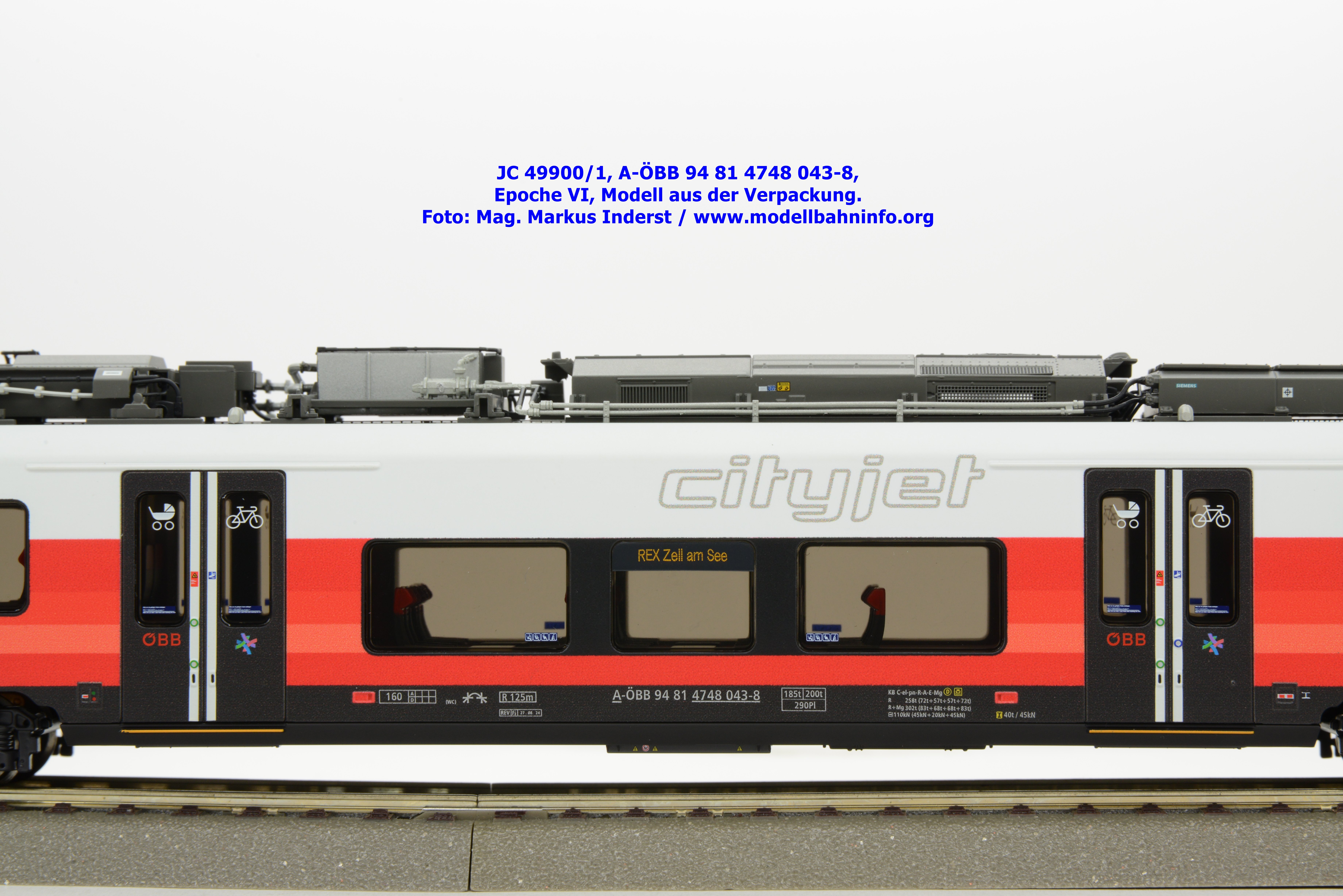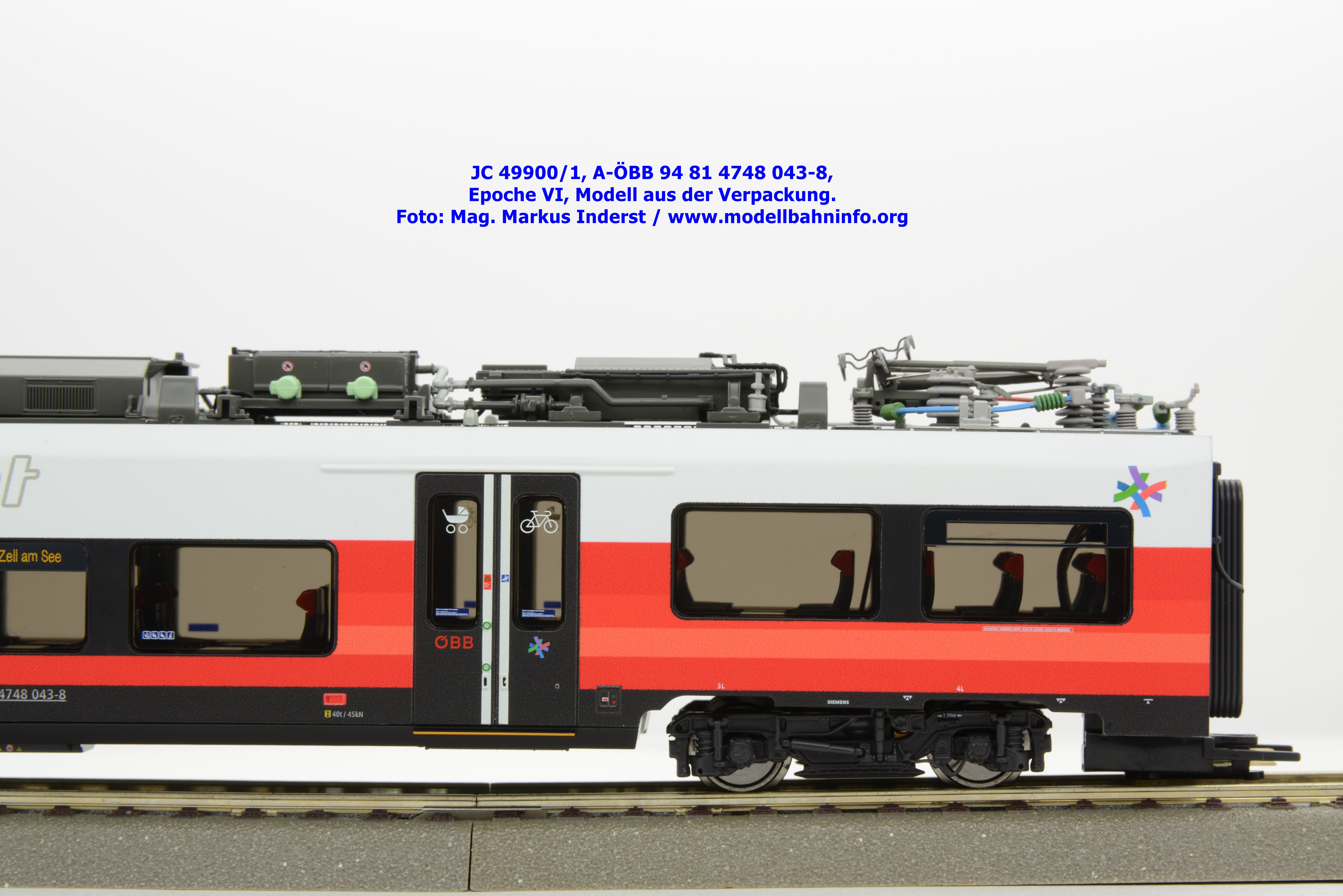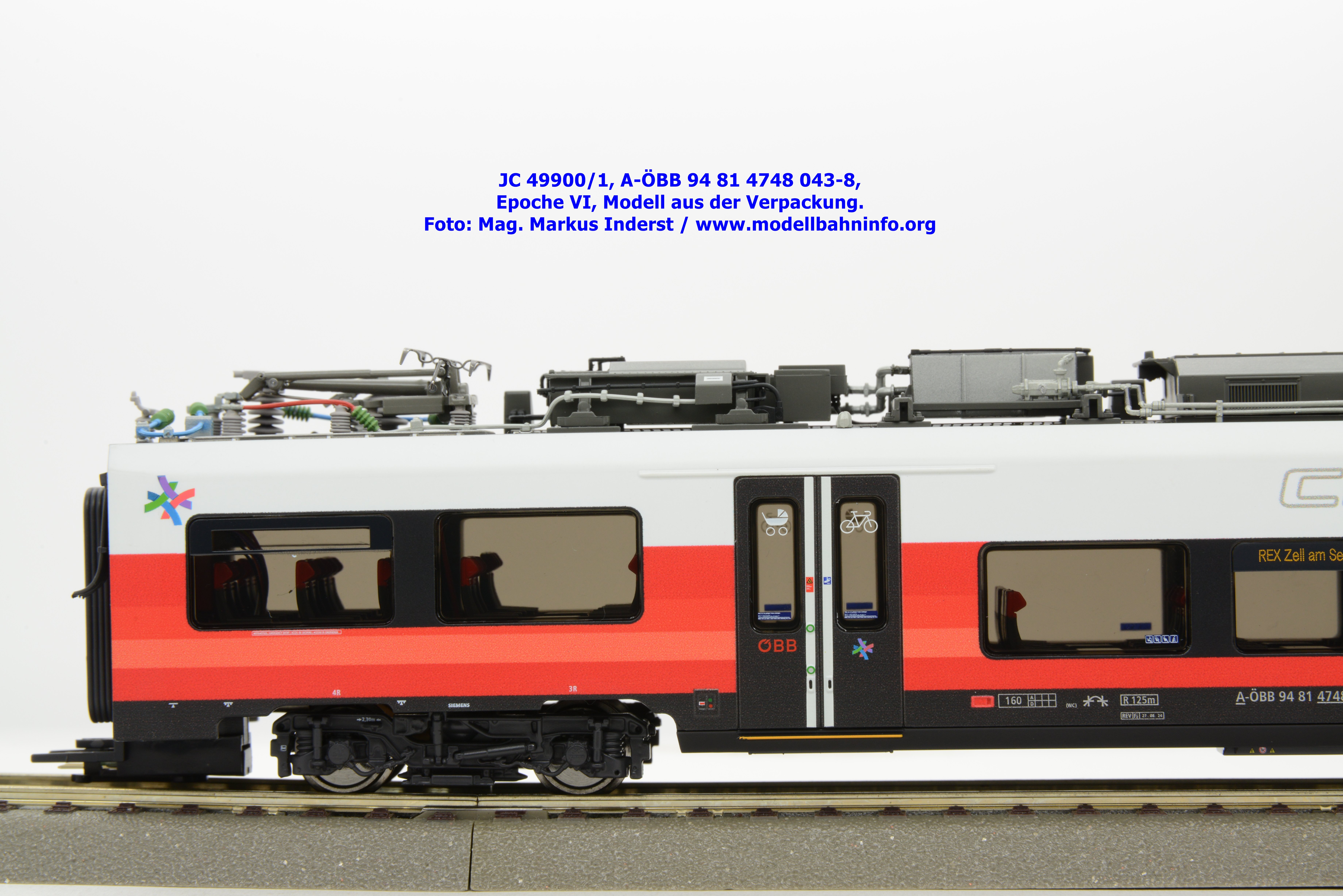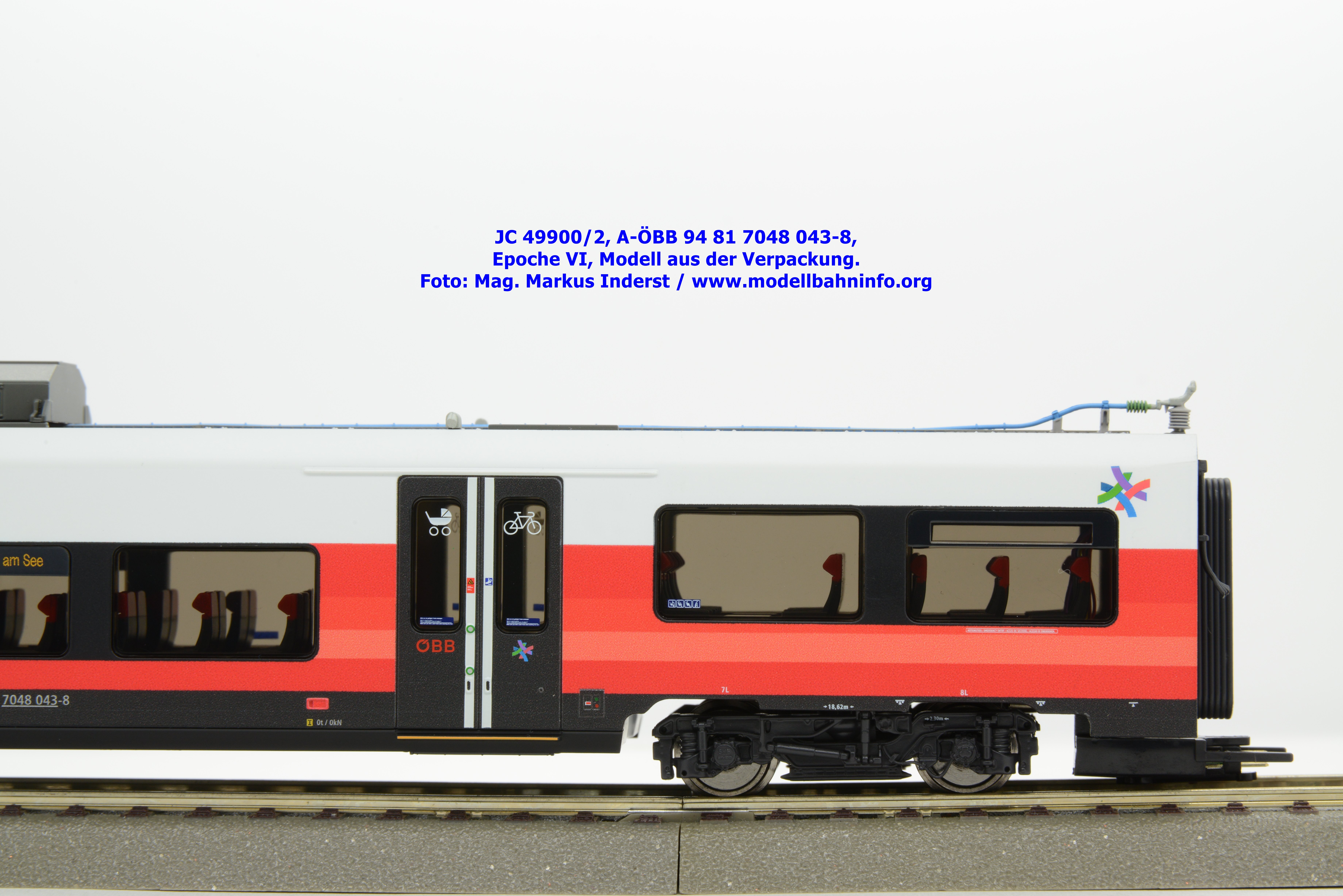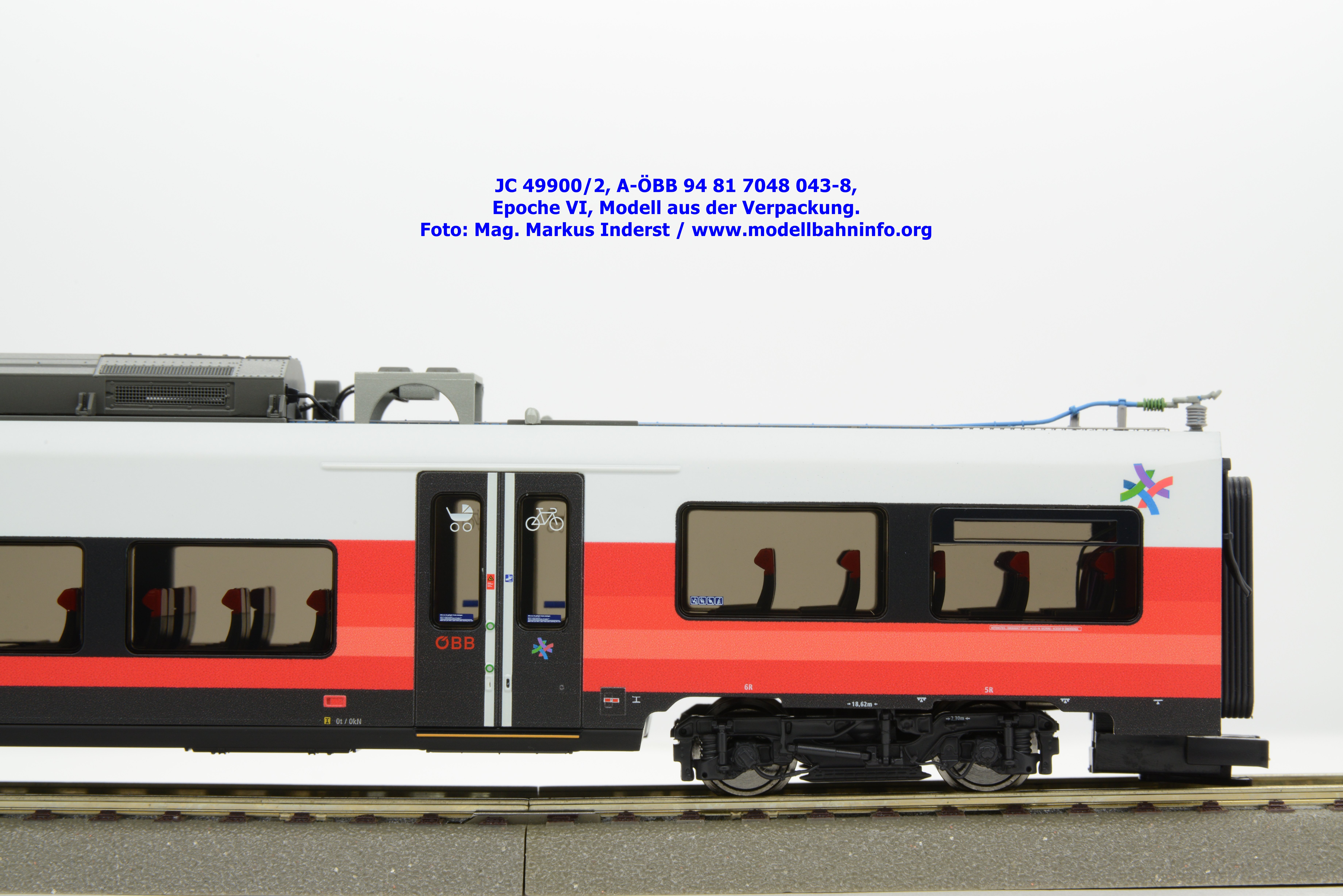 Der VMOBIL-Triebwagen ist mit den Fahrzeugnummern A-ÖBB 94 81 4748 004-0, 94 81 7048 004-0, 94 81 7048 504-9 und 94 81 4748 504-9 bedruckt. Am Fahrzeug stehen die Revisionsanschriften REV Fj 20.12.22 und REV Fj 21.12.22. Korrekt ist einheitlich die Angabe mit REV Fj 20.12.22. Obwohl die Bedruckung tadellos umgesetzt wurde, ist die Position der VMOBIL-Anschrift über dem Fensterband zu weit nach rechts gerückt. Außerdem fehlt bei einem Triebkopf die seitliche Aufschrift „S-Bahn“. Das Modelle sollte noch den Taufnamen „Nüziders“ tragen.