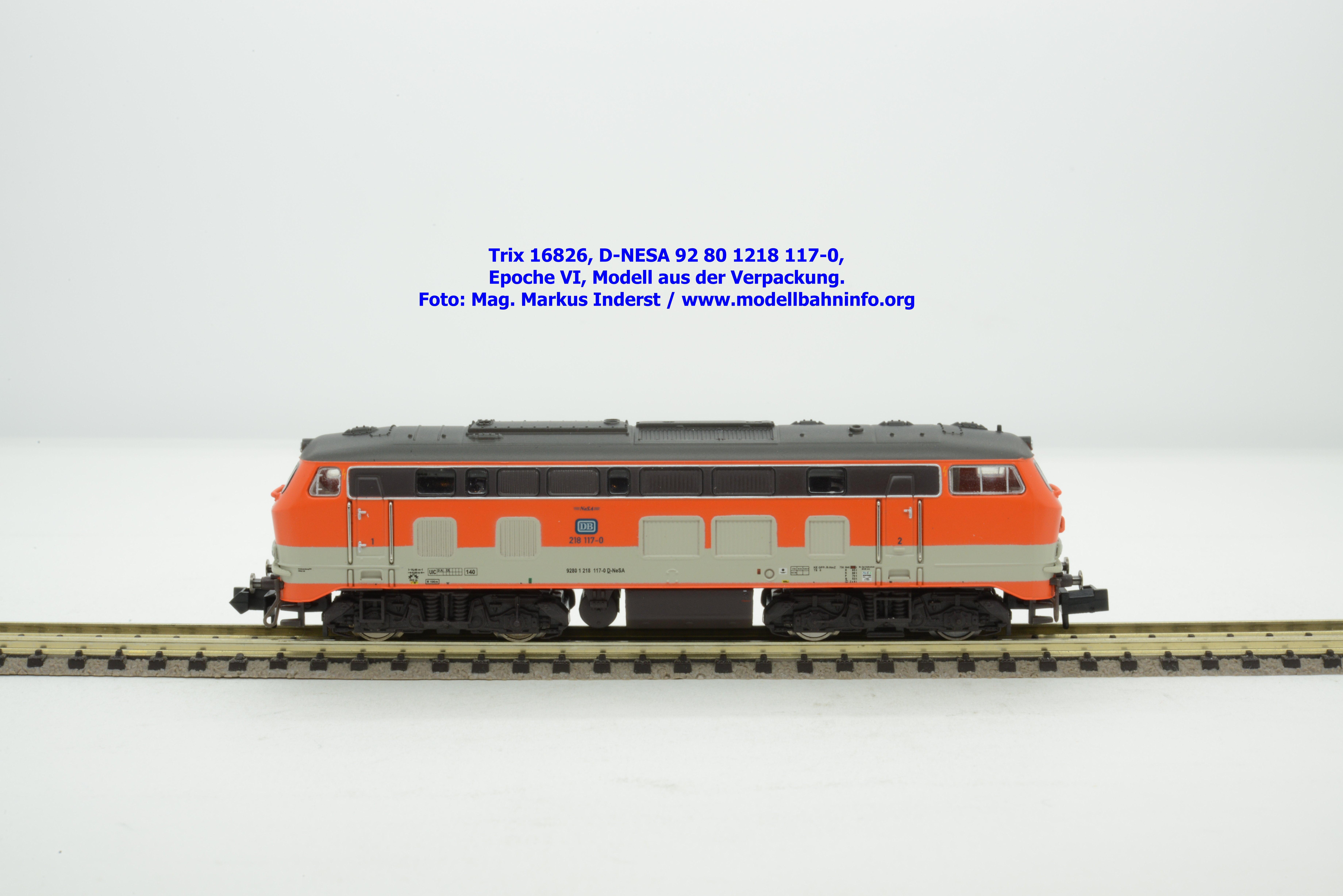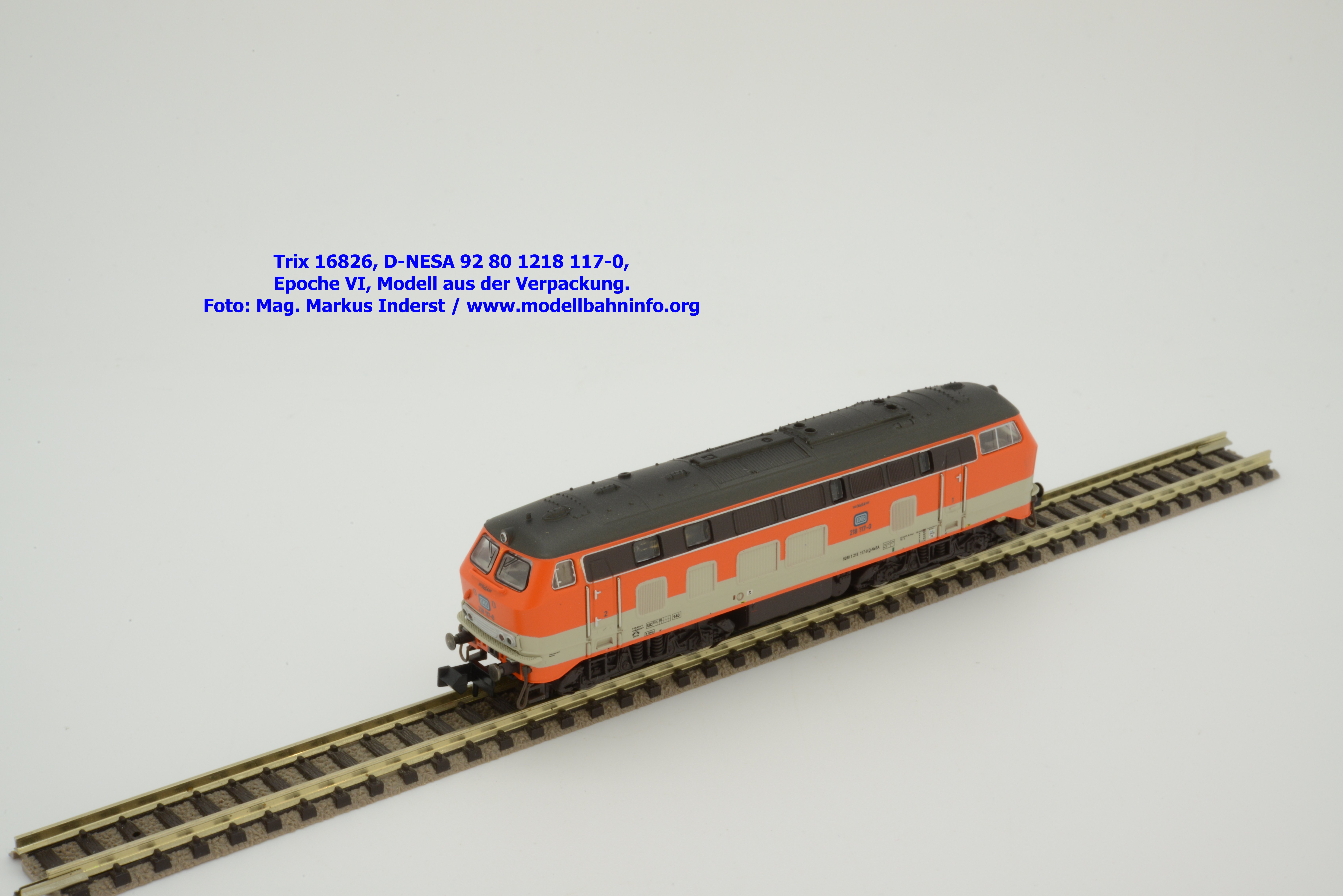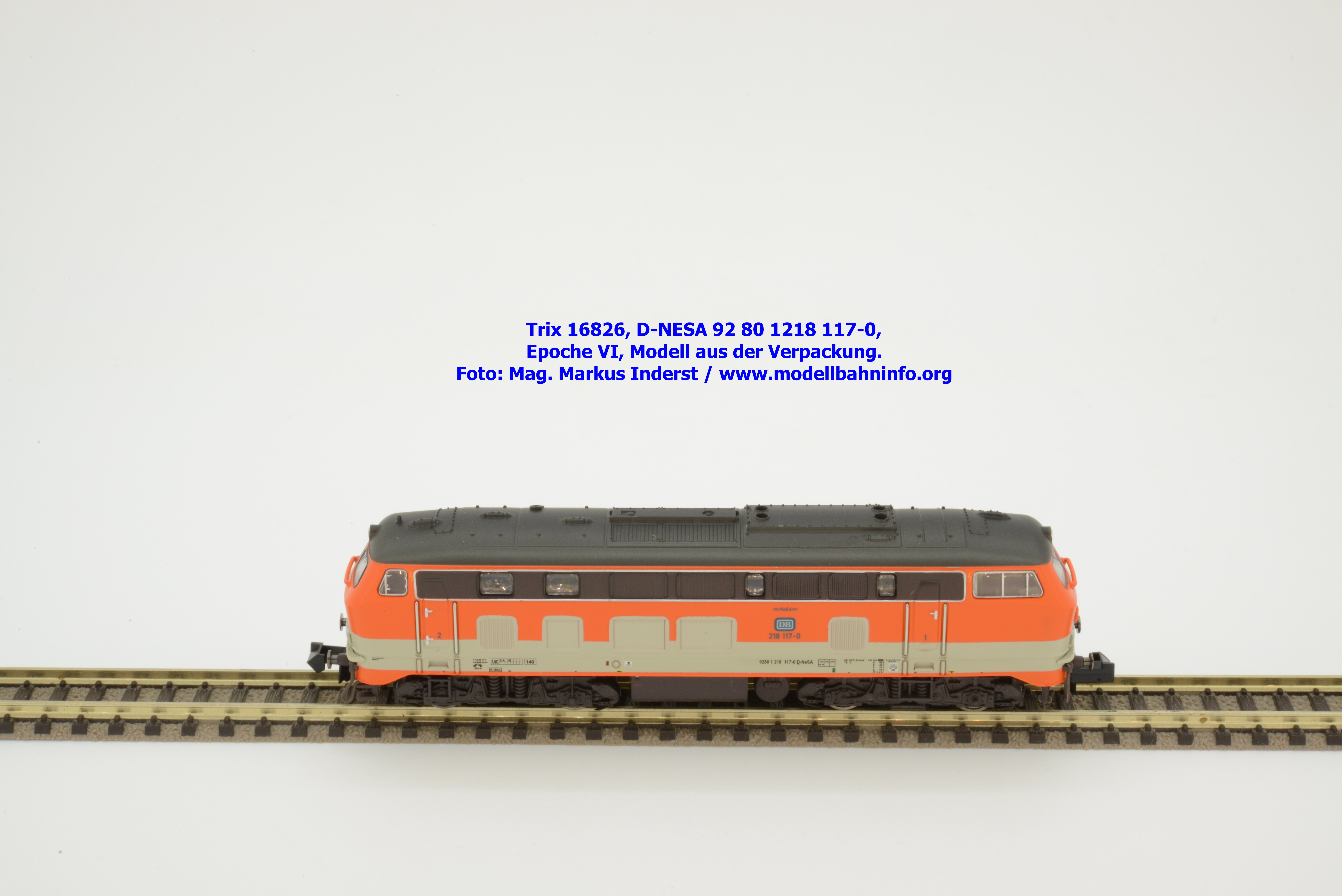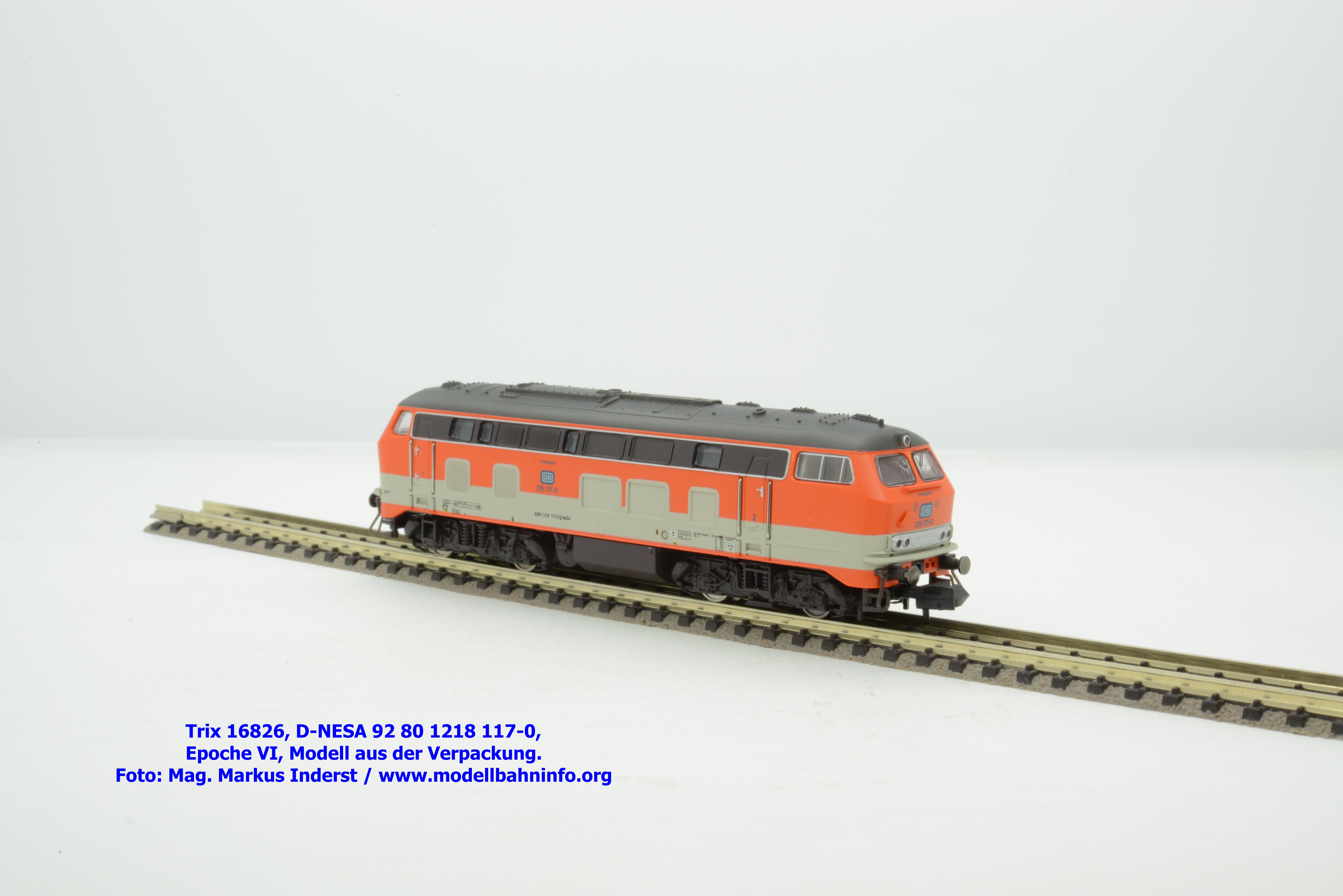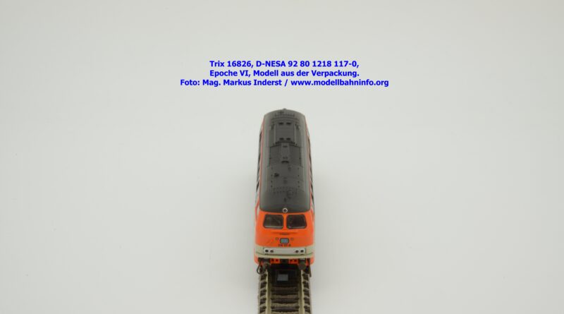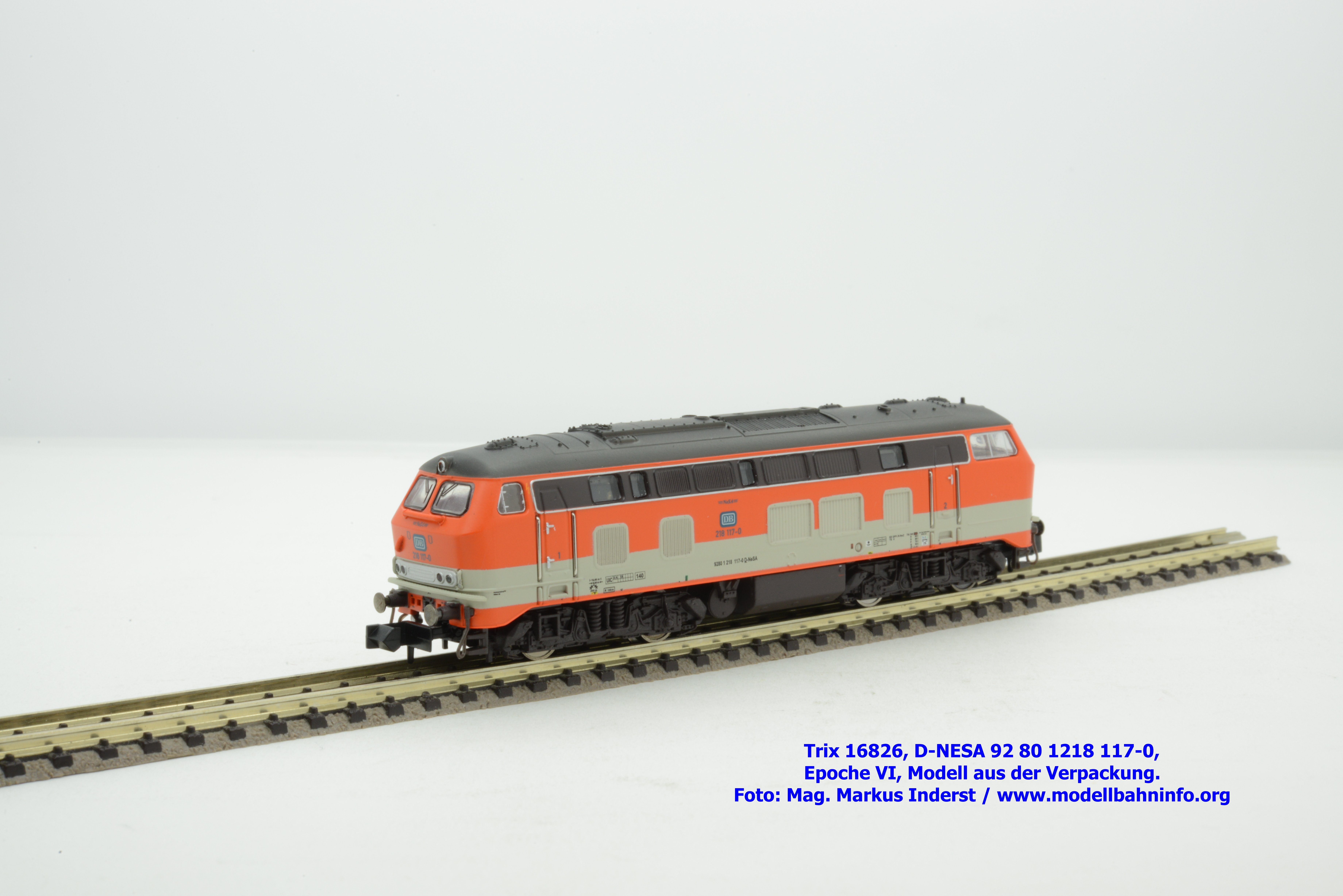 Das vorliegende Modell ist sauber lackiert und bedruckt und präsentiert sich im früheren City-Bahn-Design der DB. Mehrere, derartig lackierte Loks wurden zwischen Köln und Gummersbach eingesetzt, vor passenden DB-Wendezuggarnituren. Die Anschriften sind unter Lupe einwandfrei lesbar. Das Modell trägt die Loknummer 218 117-0 am Lokkasten, am Langträger findet sich die vollständige Betriebsnummer 92 1218 117-0 mit der Halterkennung D-NeSA. Heimatdienststelle ist keine angeführt. Die Anschriften im Revisionsraster sind aufgrund der abgedruckten Größe nicht lesbar.