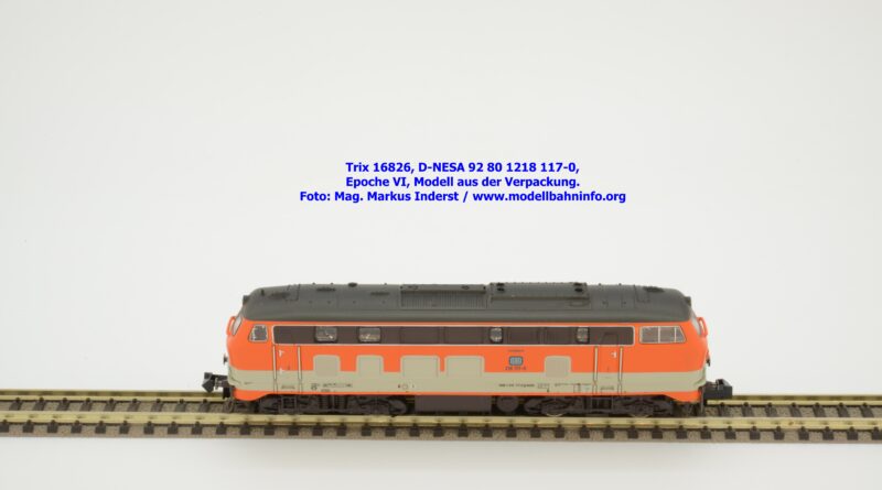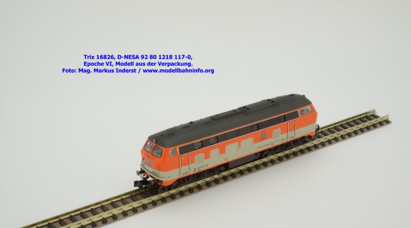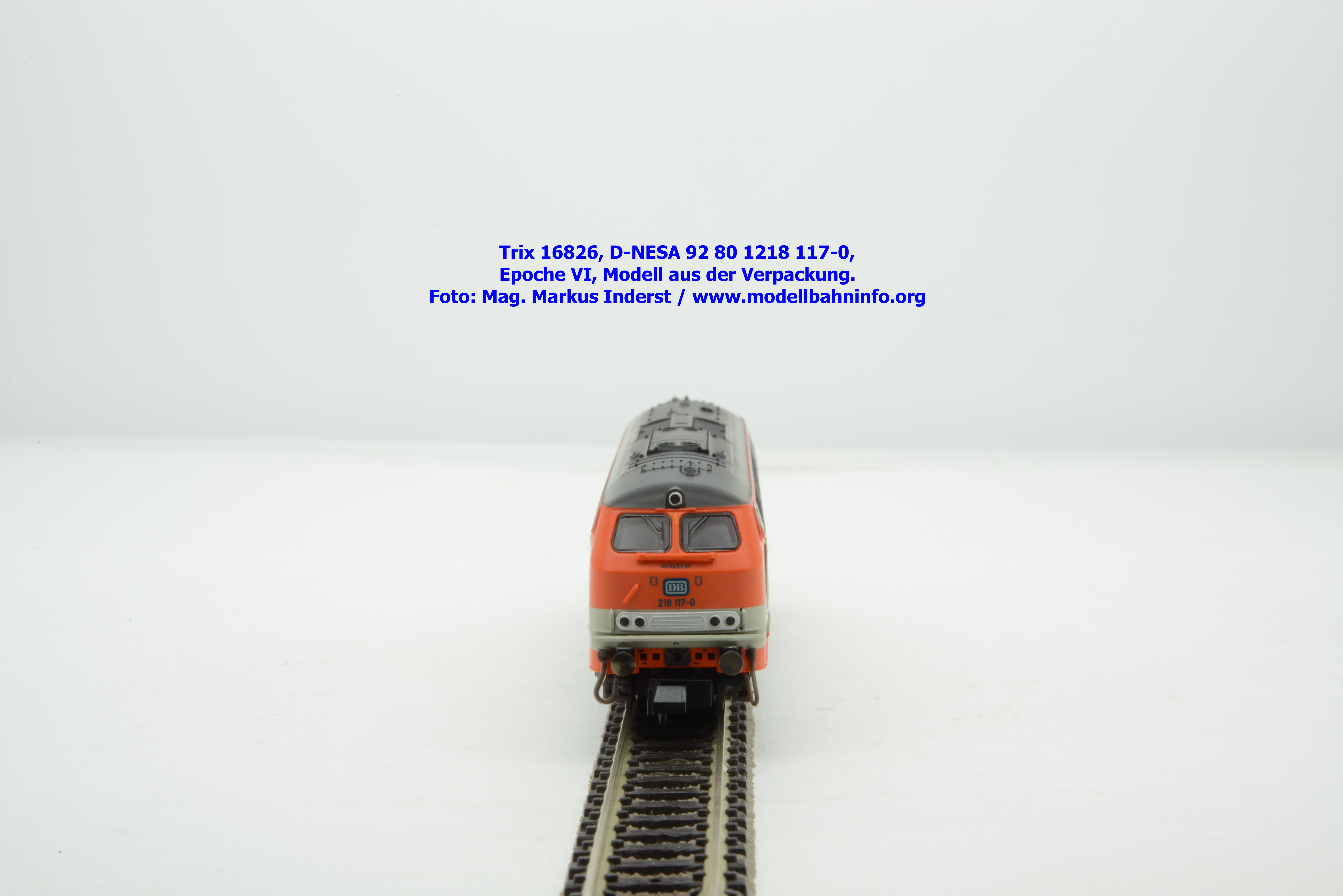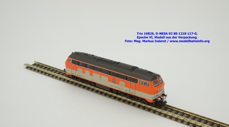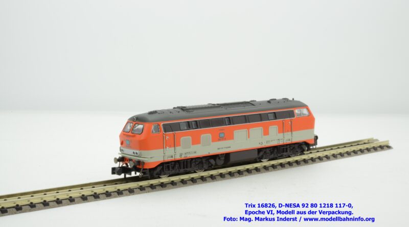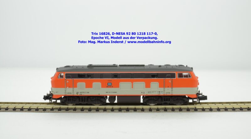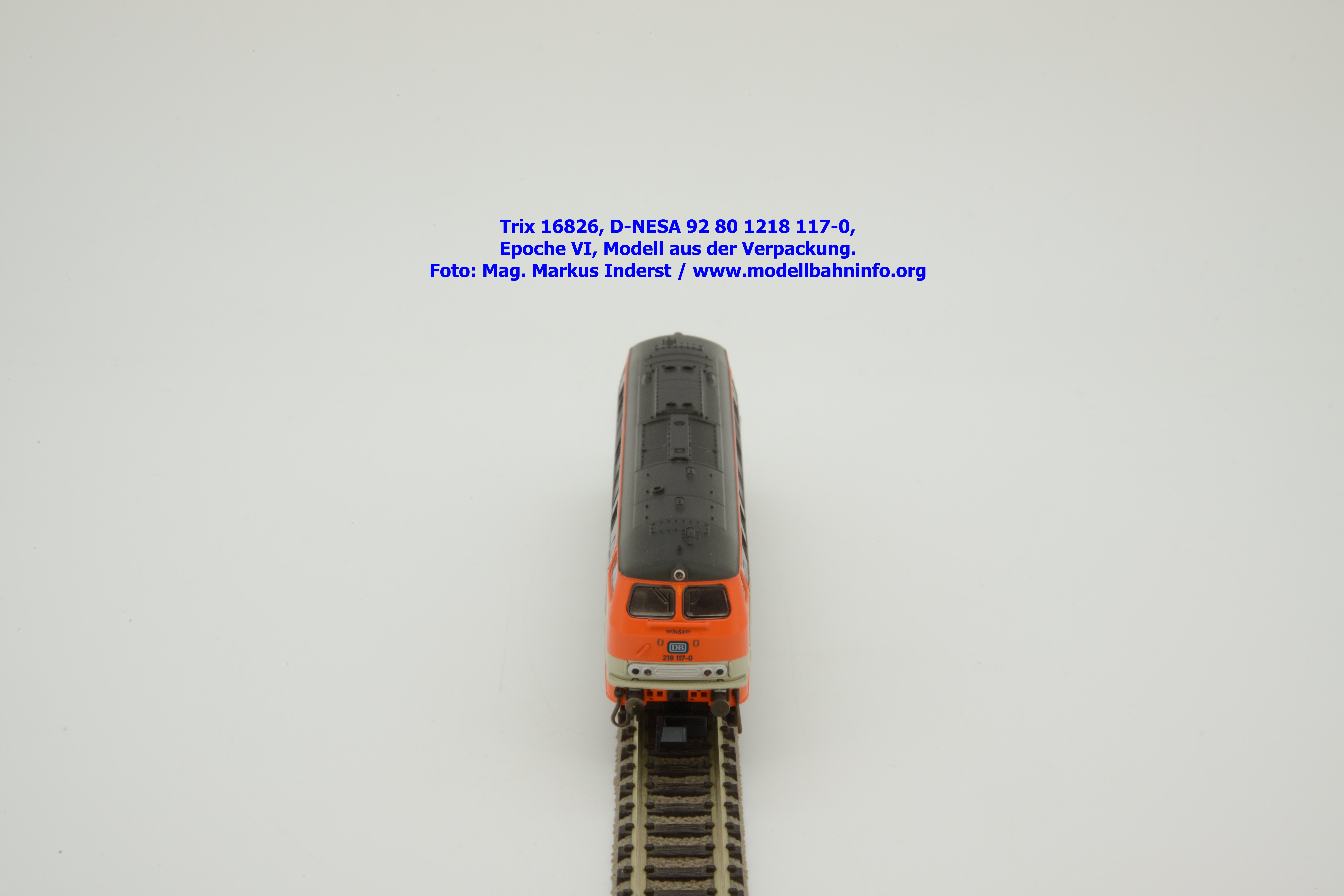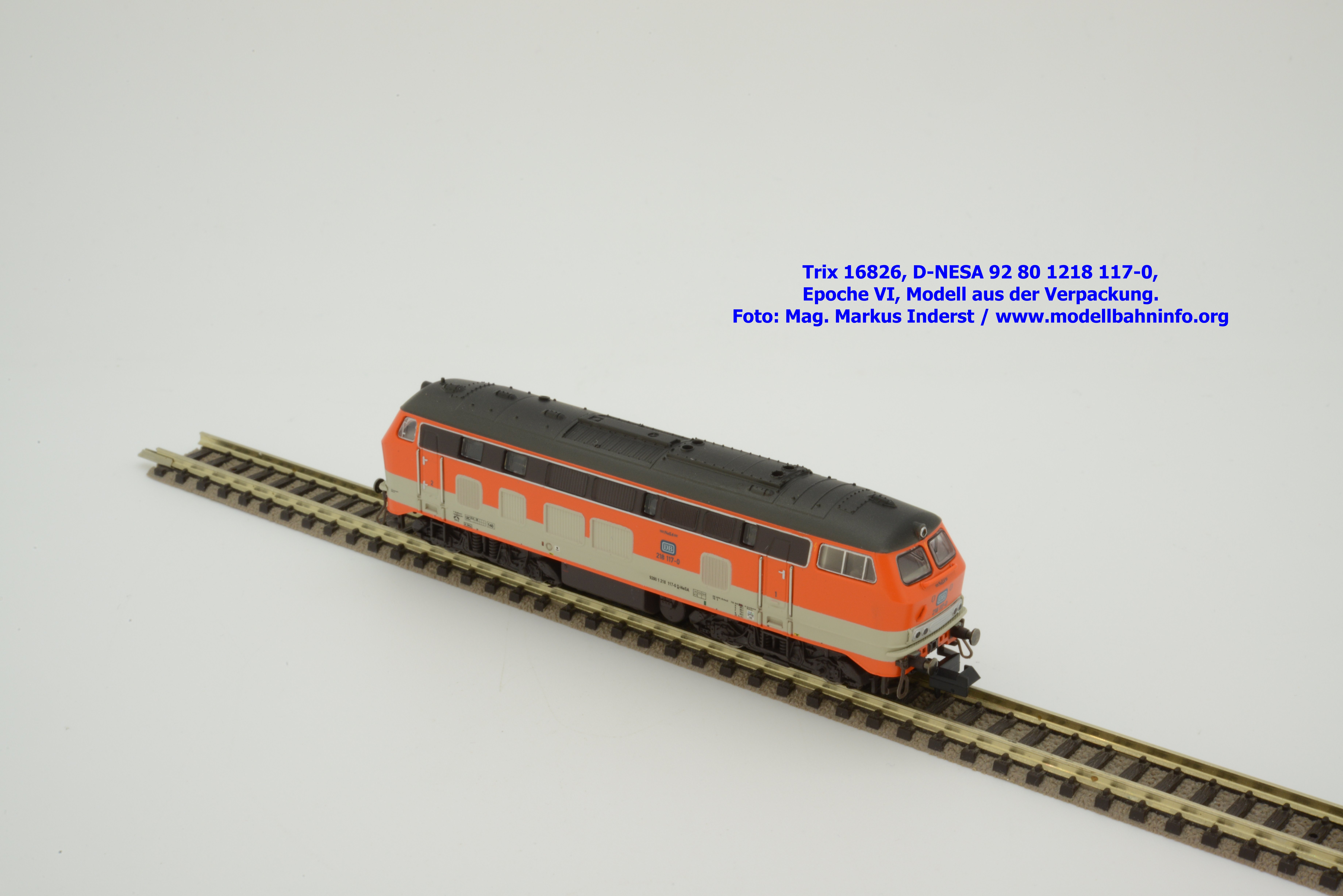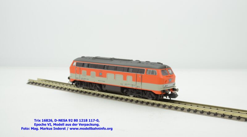 Das vorliegende Modell ist sauber lackiert und bedruckt und präsentiert sich im früheren City-Bahn-Design der DB. Mehrere, derartig lackierte Loks wurden zwischen Köln und Gummersbach eingesetzt, vor passenden DB-Wendezuggarnituren. Die Anschriften sind unter Lupe einwandfrei lesbar. Das Modell trägt die Loknummer 218 117-0 am Lokkasten, am Langträger findet sich die vollständige Betriebsnummer 92 1218 117-0 mit der Halterkennung D-NeSA. Heimatdienststelle ist keine angeführt. Die Anschriften im Revisionsraster sind aufgrund der abgedruckten Größe nicht lesbar.