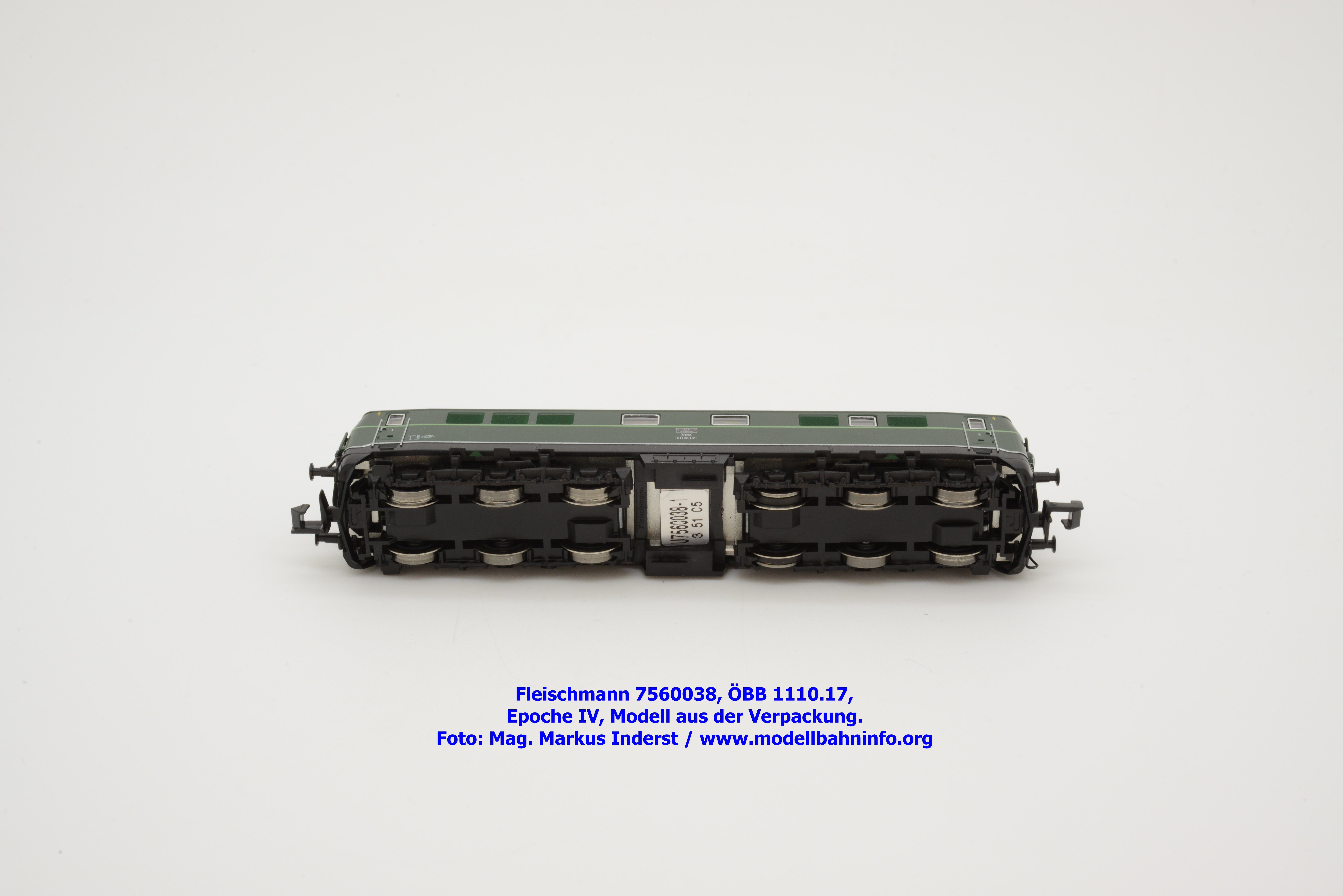 Das vorliegende Modell ist sauber lackiert, wobei die Formtrennkanten teilweise auch schon konstruktiv vorgegeben sind. Die mittlere Zierlinie ist im Farbton Resedagrün gehalten, im Übergang zum Rahmen ist eine weiße Zierlinie angebracht, die im Katalogbild bei der Ankündigung fehlt. Die Anschriften sind gut deckend und unter der Lupe hervorragend zu lesen. Fleischmann hat seiner Neukonstruktion die Loknummer 1110.17 vergeben. Die Lok ist in der Zfl. Innsbruck beheimatet und führt als letztes Untersuchungsdatum die Angabe Br. Unt. Lz 13. 3.72 auf.