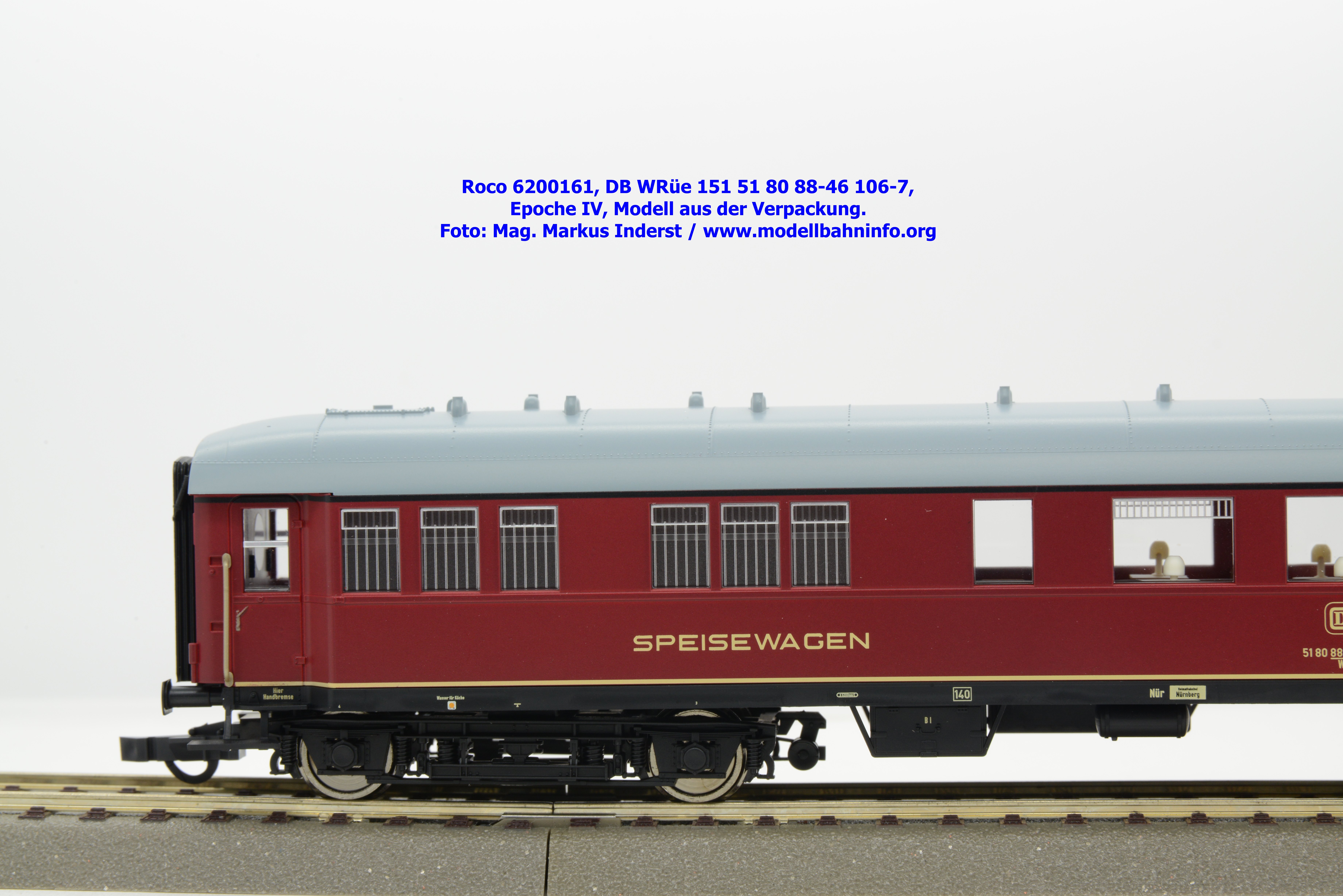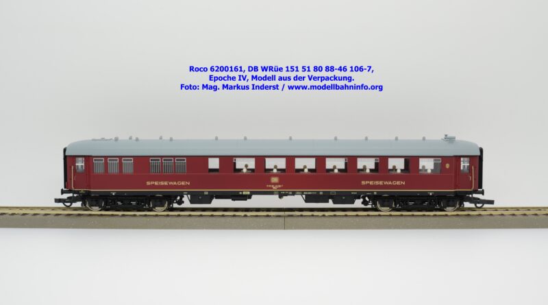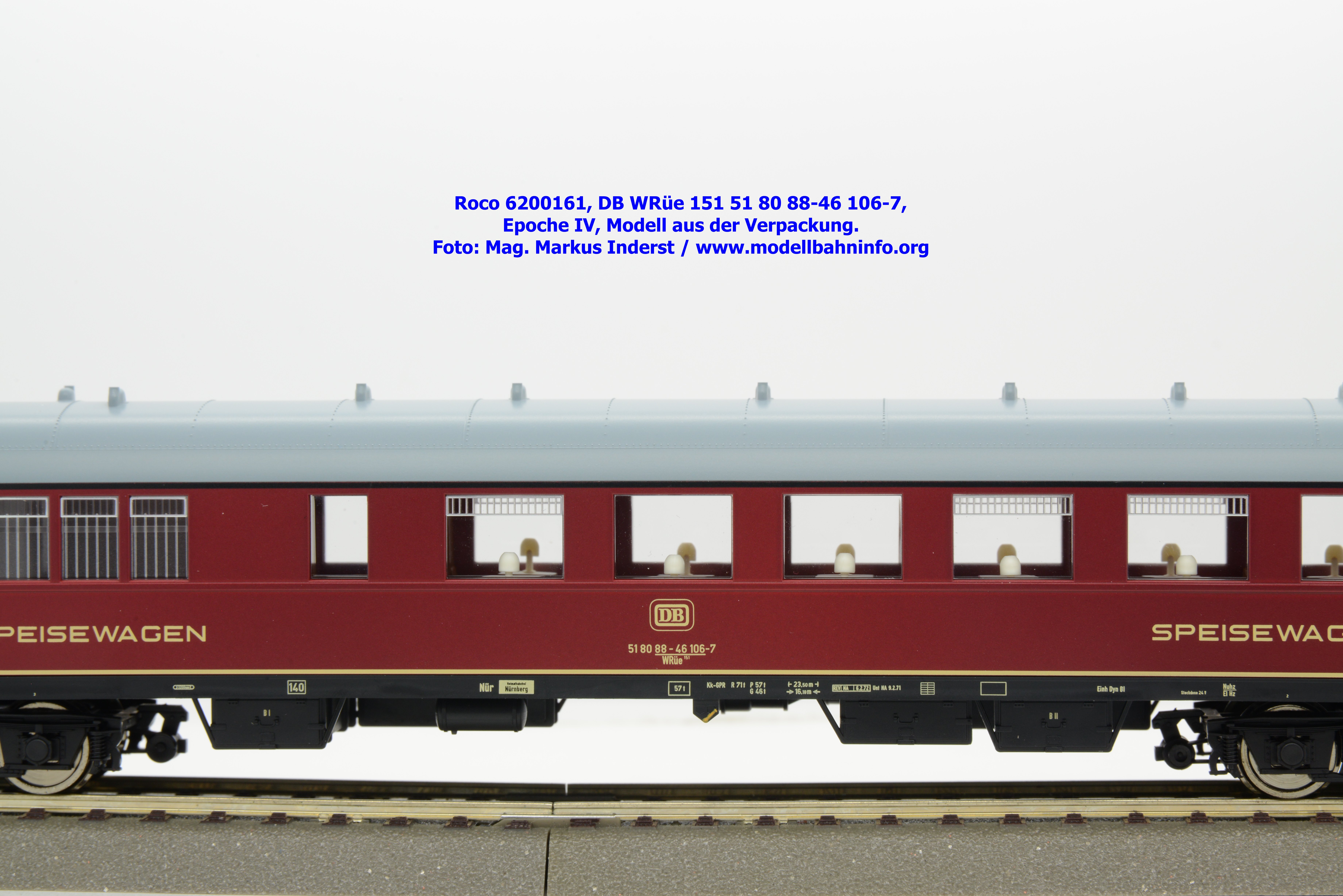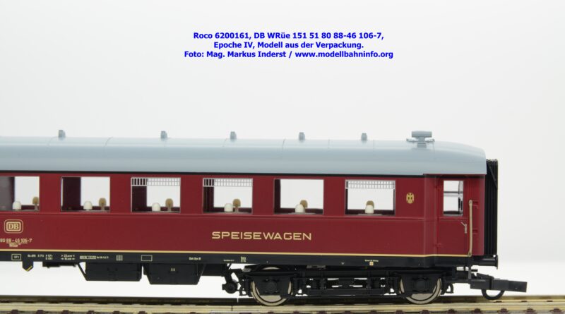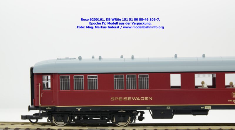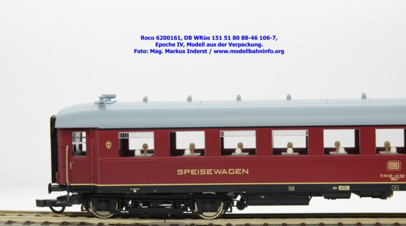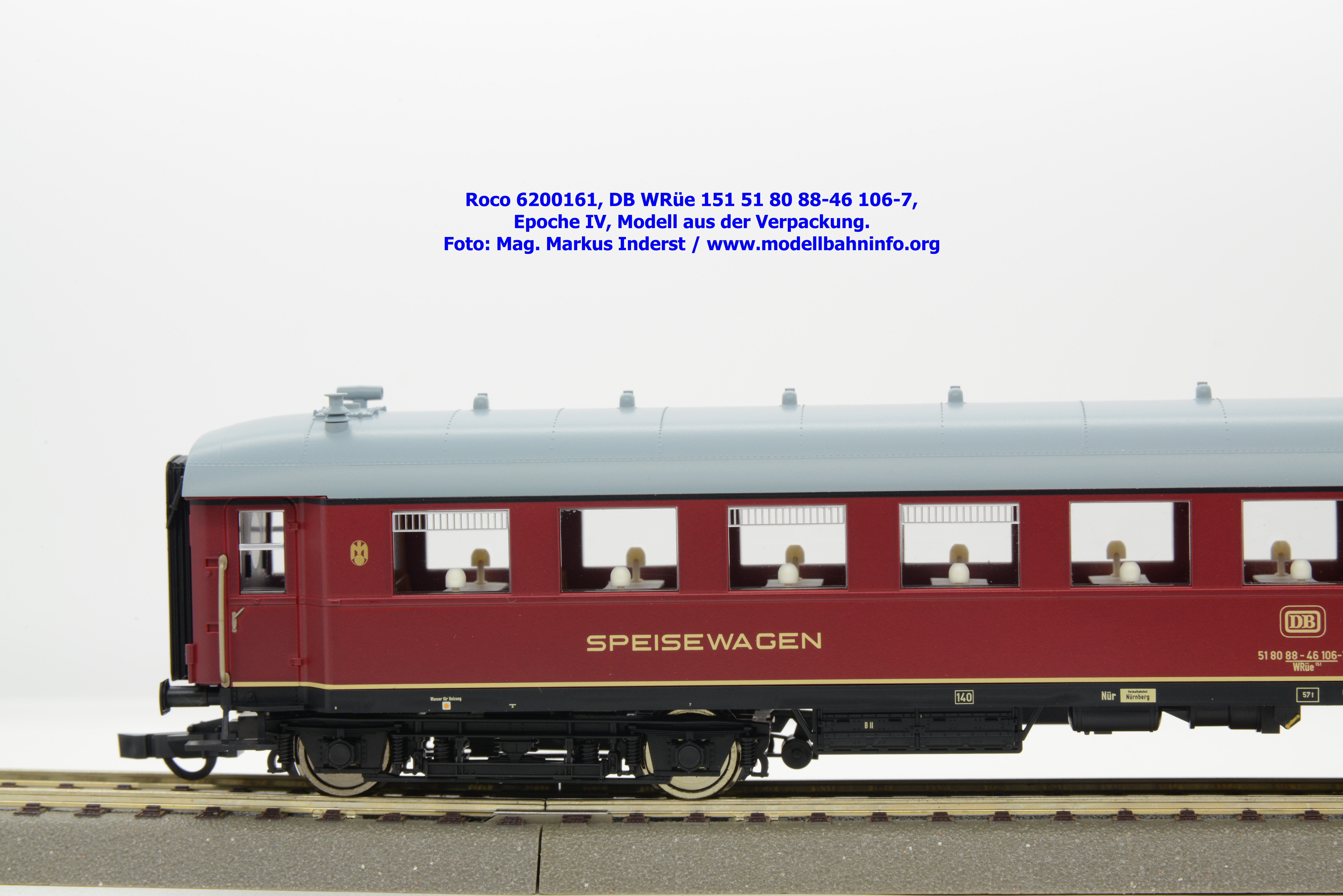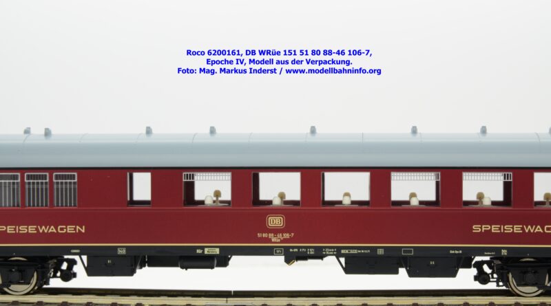 Der dazu passende Speisewagen gehört der Bauart WRüe 131 an. Der weinrot lackierte Vollspeisewagen ist mit der Wagennummer 51 80 88-46 106-7 bedruckt und ist aufgrund des Austauschverhältnisses international Einsetzbar. Die Fenstereinsätze des Modells sind mit verschiedenen Gravuren versehen. Nürnberg ist als Heimatbahnhof angeschrieben, die letzte Fahrzeuguntersuchung wird mit REV NA 6. 2.72 bzw. Unt NA 9. 2.71 angegeben.