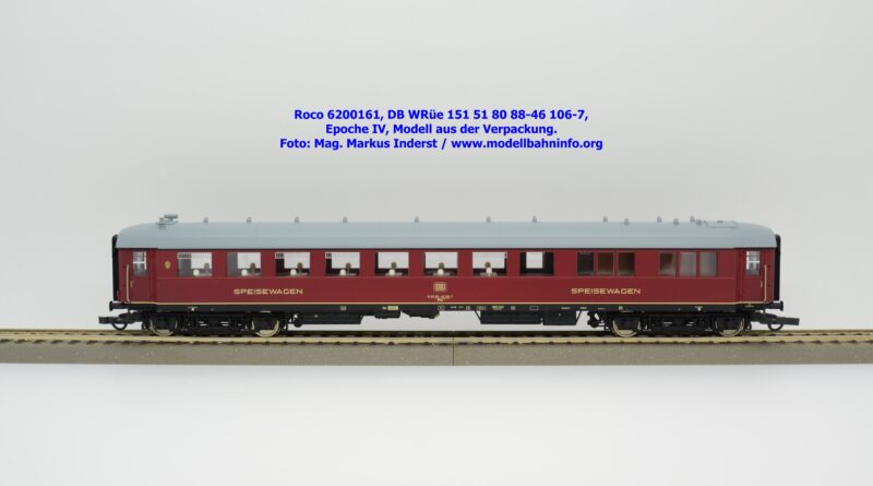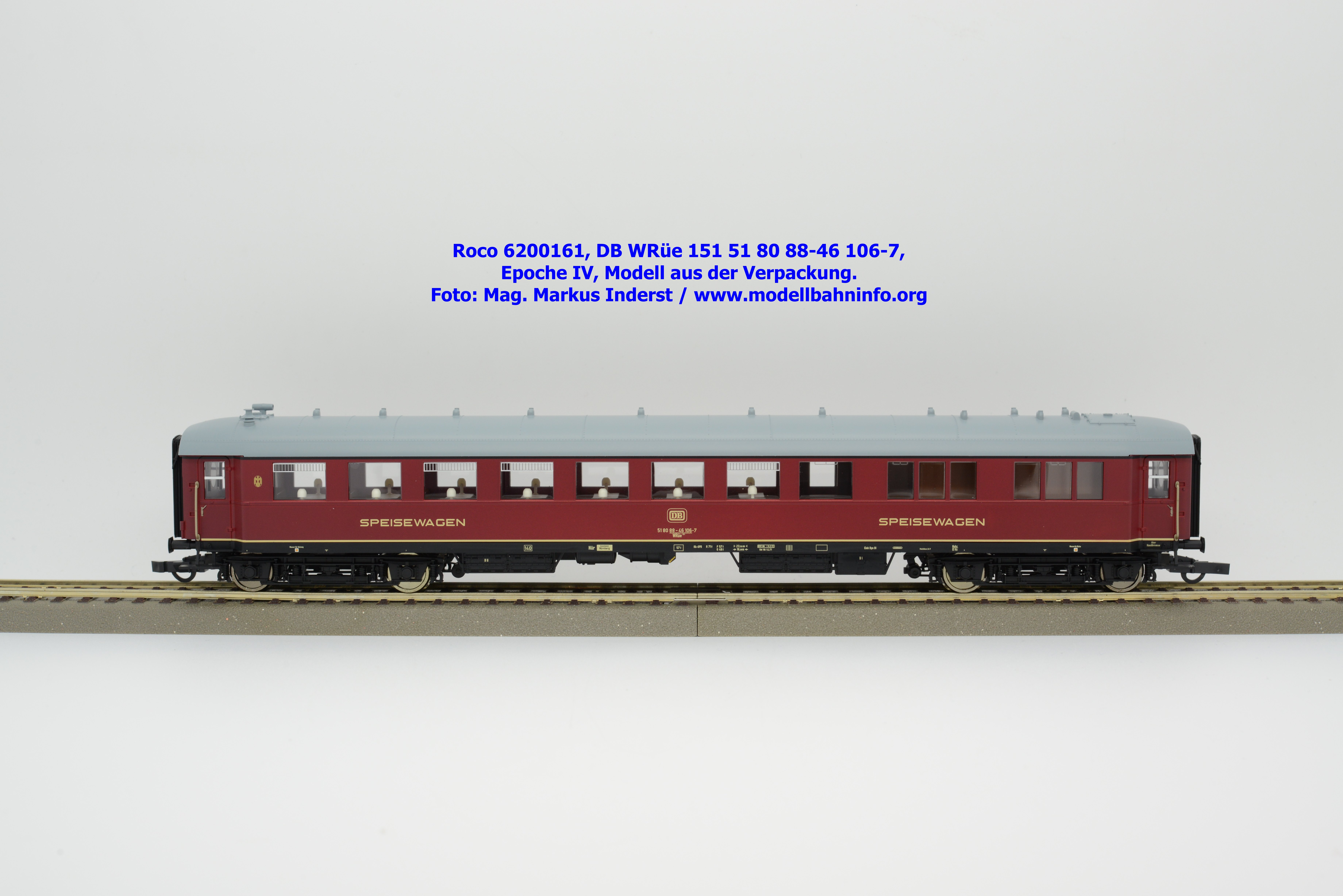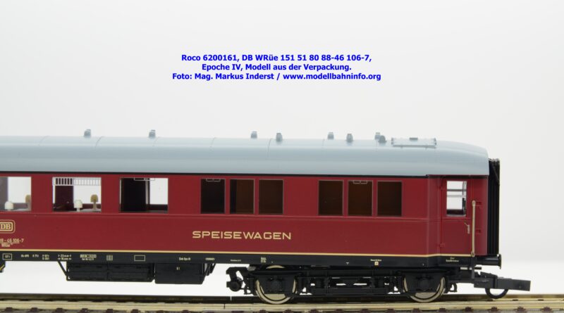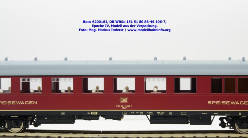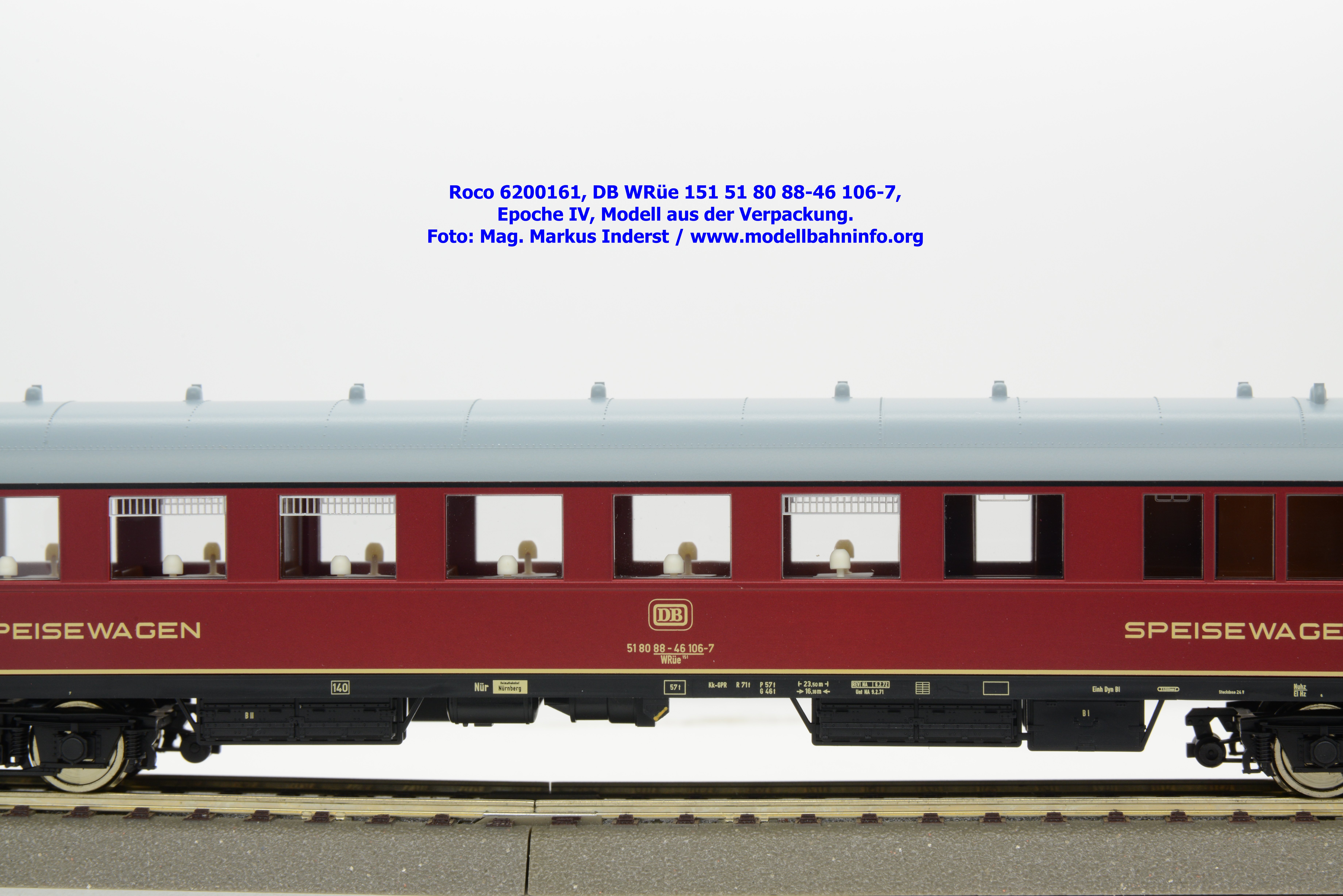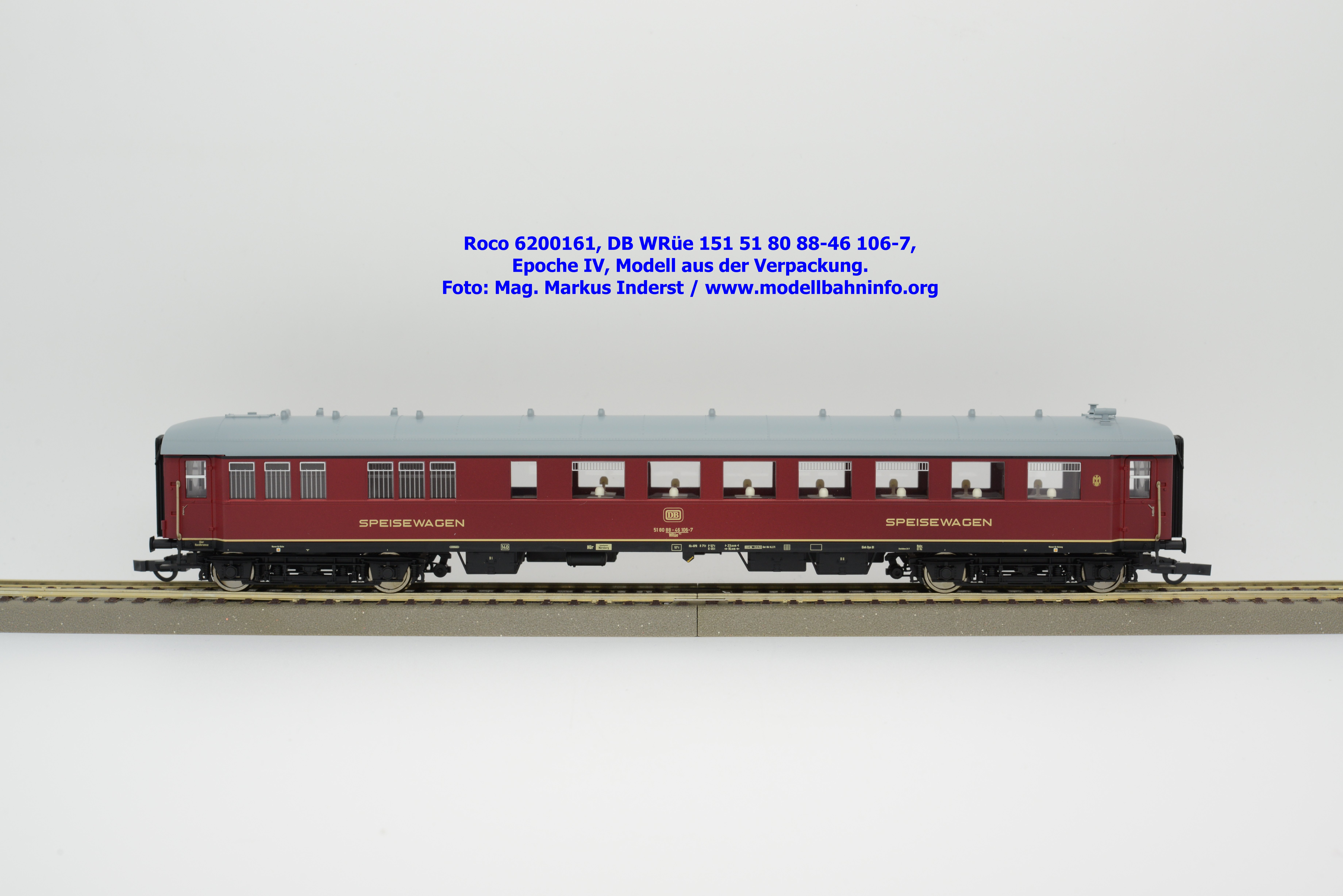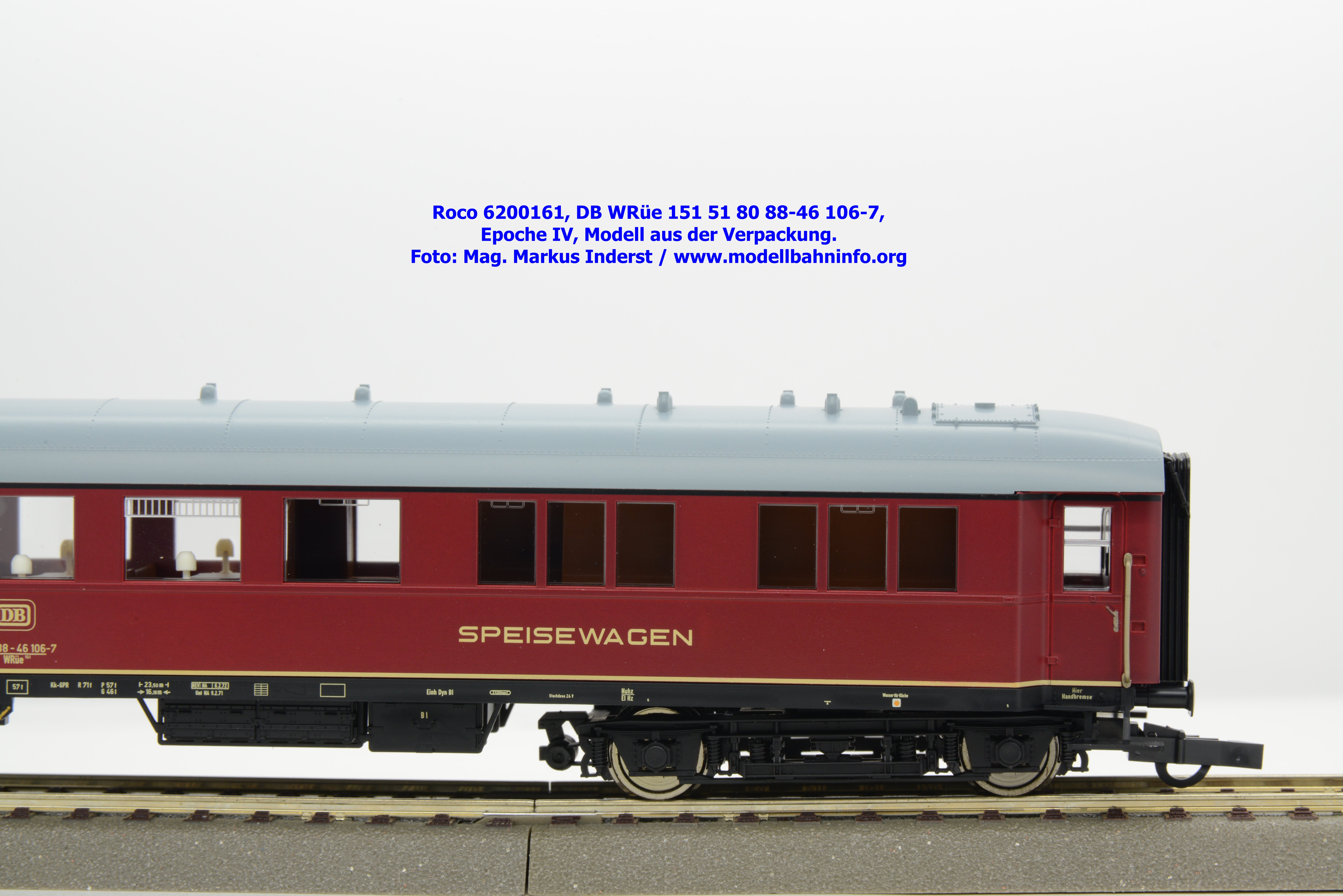 Der dazu passende Speisewagen gehört der Bauart WRüe 131 an. Der weinrot lackierte Vollspeisewagen ist mit der Wagennummer 51 80 88-46 106-7 bedruckt und ist aufgrund des Austauschverhältnisses international Einsetzbar. Die Fenstereinsätze des Modells sind mit verschiedenen Gravuren versehen. Nürnberg ist als Heimatbahnhof angeschrieben, die letzte Fahrzeuguntersuchung wird mit REV NA 6. 2.72 bzw. Unt NA 9. 2.71 angegeben.