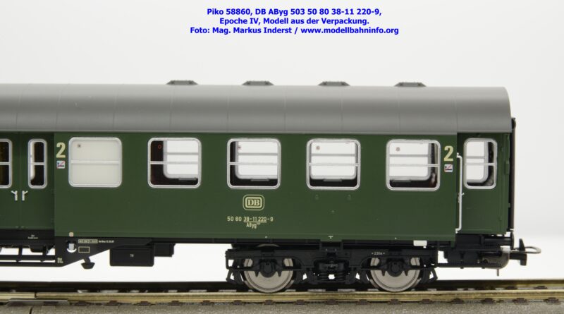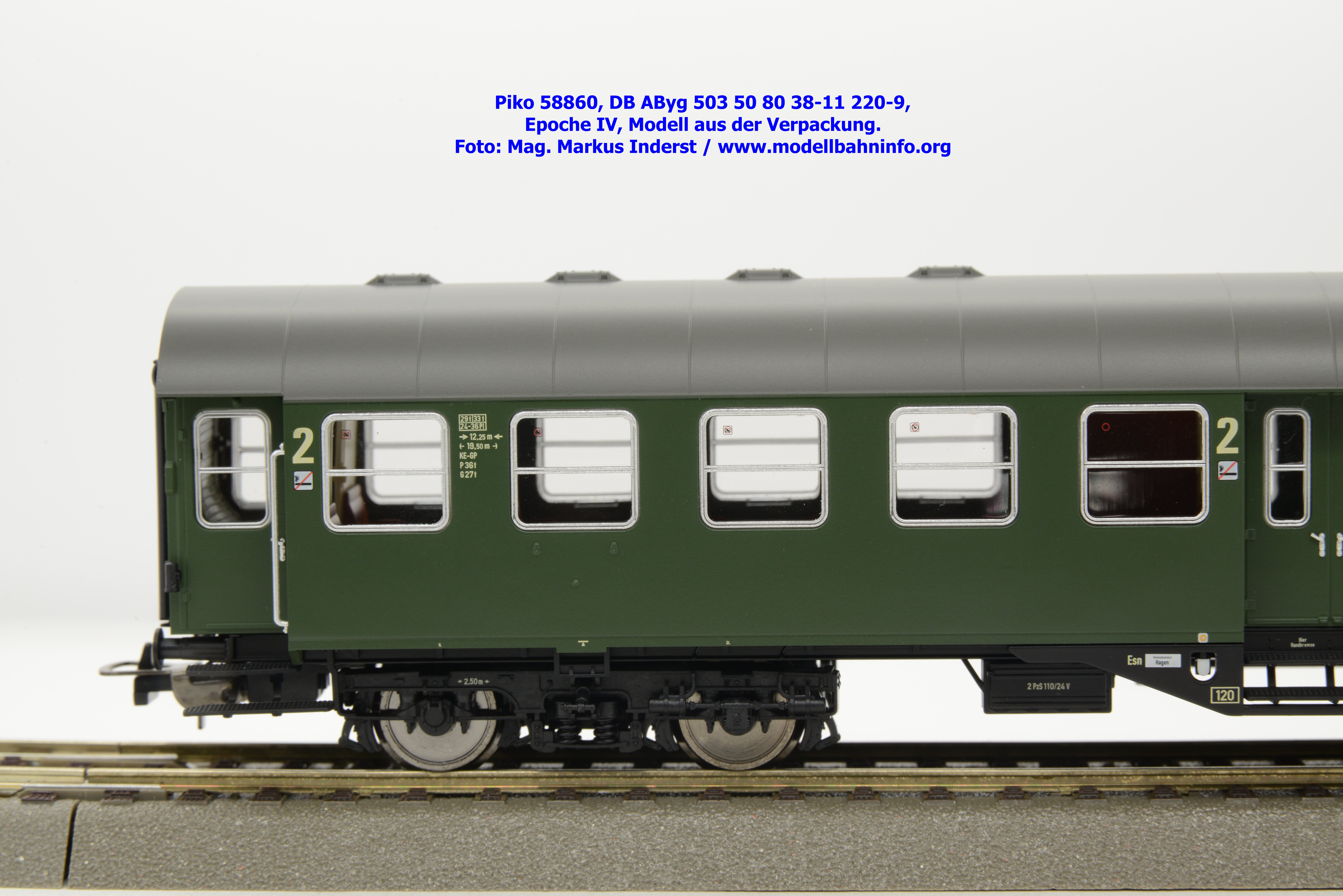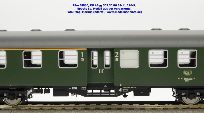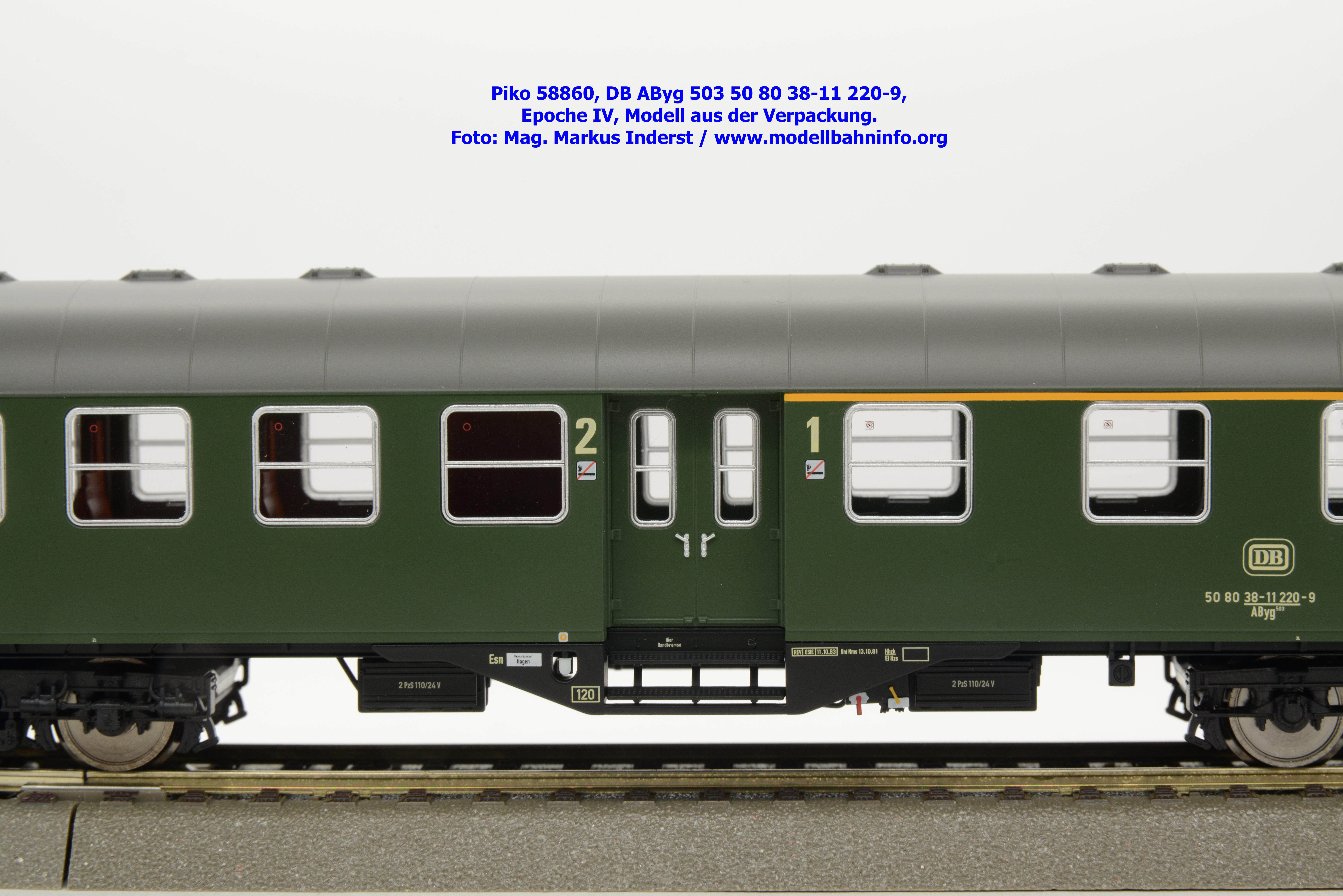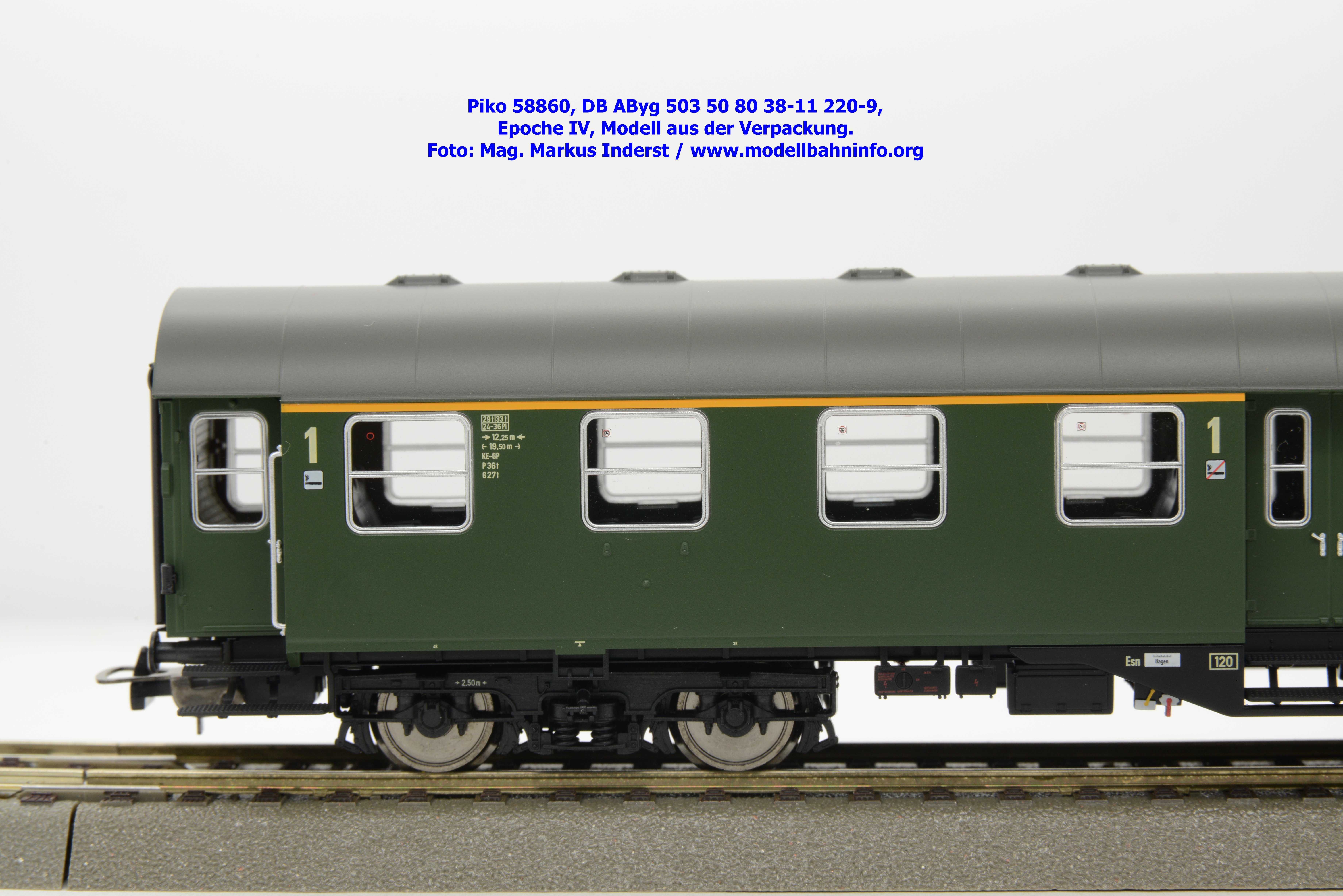 Das Modell des 1./2.-Klasse-Wagens gehört der Gattungsbezeichnung AByg 503 an und wurde mit der Wagennummer 50 80 38-11 220-9 bedruckt. Als Heimatbahnhof ist Hagen Hbf angegeben. Im Revisionsraster finden sich die Angaben REV ESIE 11.10.83 bzw. Unt Nms 13.10.81.