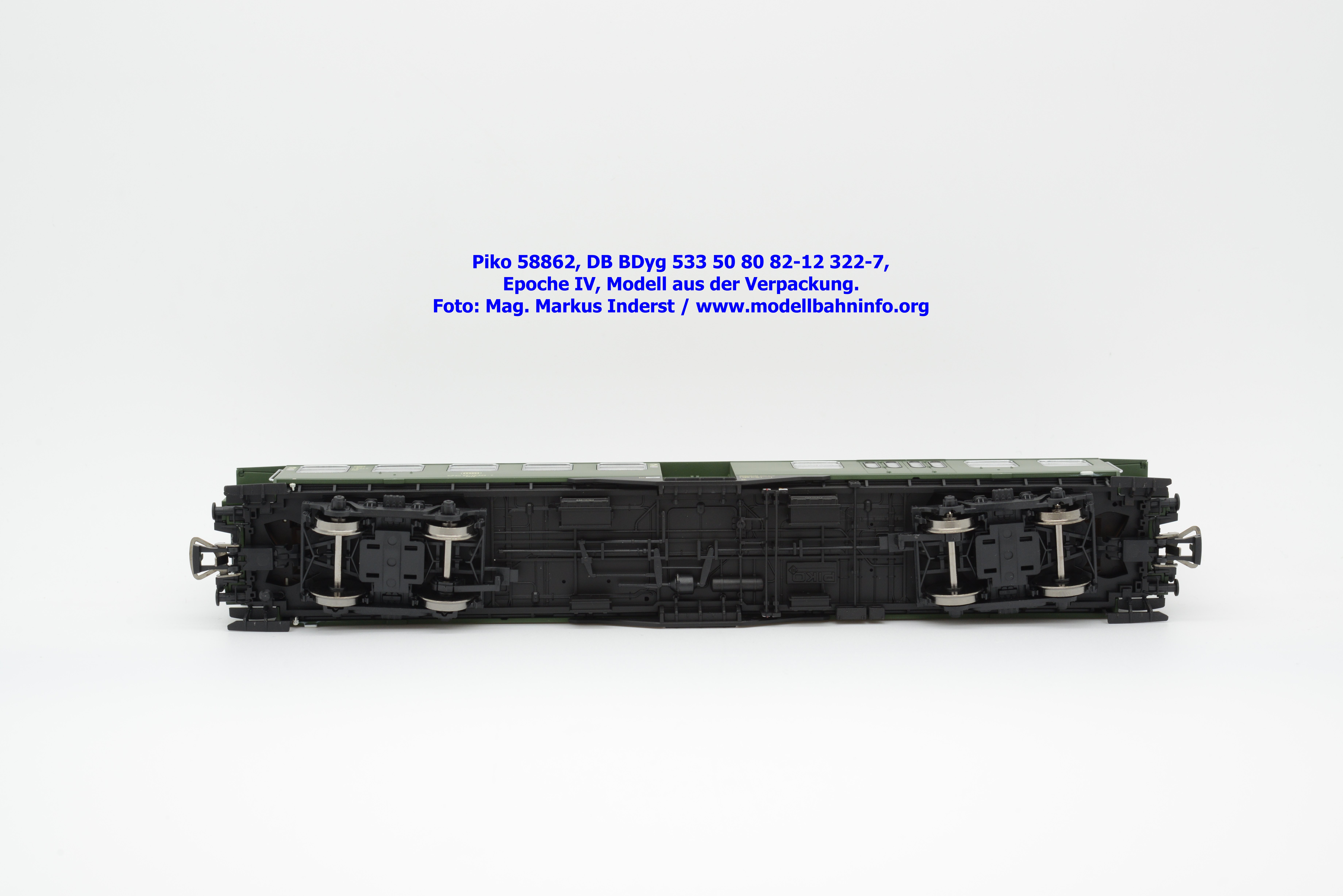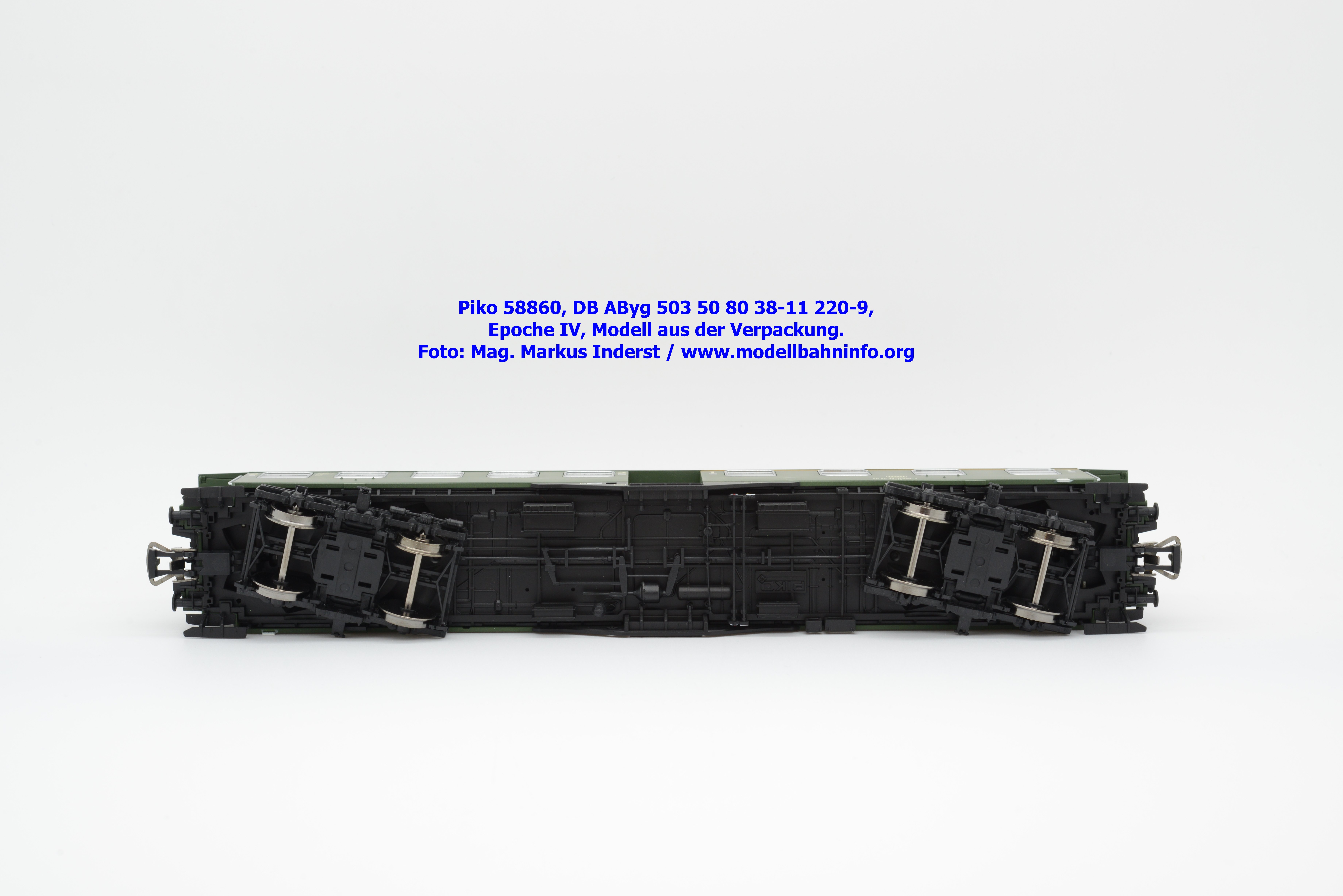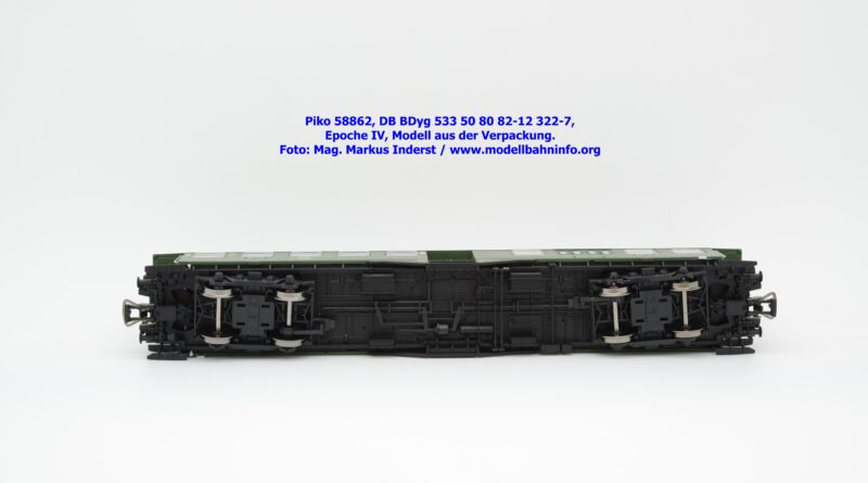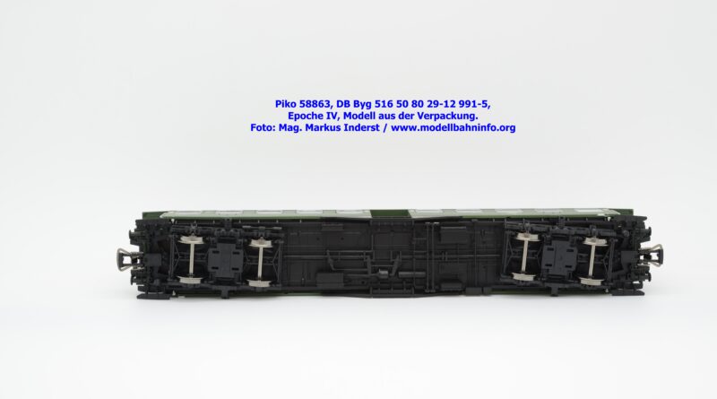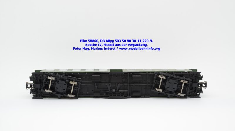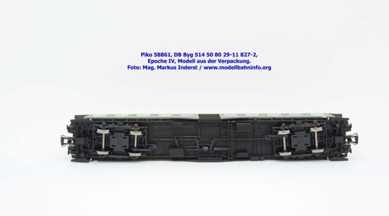 Der Wagenkasten ist auf das Chassis aufgesetzt, es läßt sich durch seitliches Spreizen der Seitenwände abziehen. Sichtbar wird der Innenraum mit Fahrgastabteilen und Zwischenwänden. Dieses Bauteil sitzt auf dem Chassis auf, welches an der Unterseite bei den Drehgestellen eine NEM-Kurzkupplungskulisse vereint. Am Wagenboden wurde die gesamte Bremsanlage gänzlich umgesetzt sowie zahlreiche Apparatekästen angeordnet. Die Drehgestelle sind an der Unterseite in das Chassis eingesetzt. Piko hat dabei die beiden Bauformen umgesetzt. Es gelangen die Ausführungen MD sowie die Schwanenhals-Drehgestelle zur Ausfertigung. Beide Konstruktionen sind sehr getreu umgesetzt und weisen feine Details auf. Als Störfaktor sind jedoch die blanken Radsätze anzuführen, die regelrecht aus dem Drehgestellrahmen herausglänzen. Eine dezente Brünierung hätte den Radsätzen nicht geschadet.