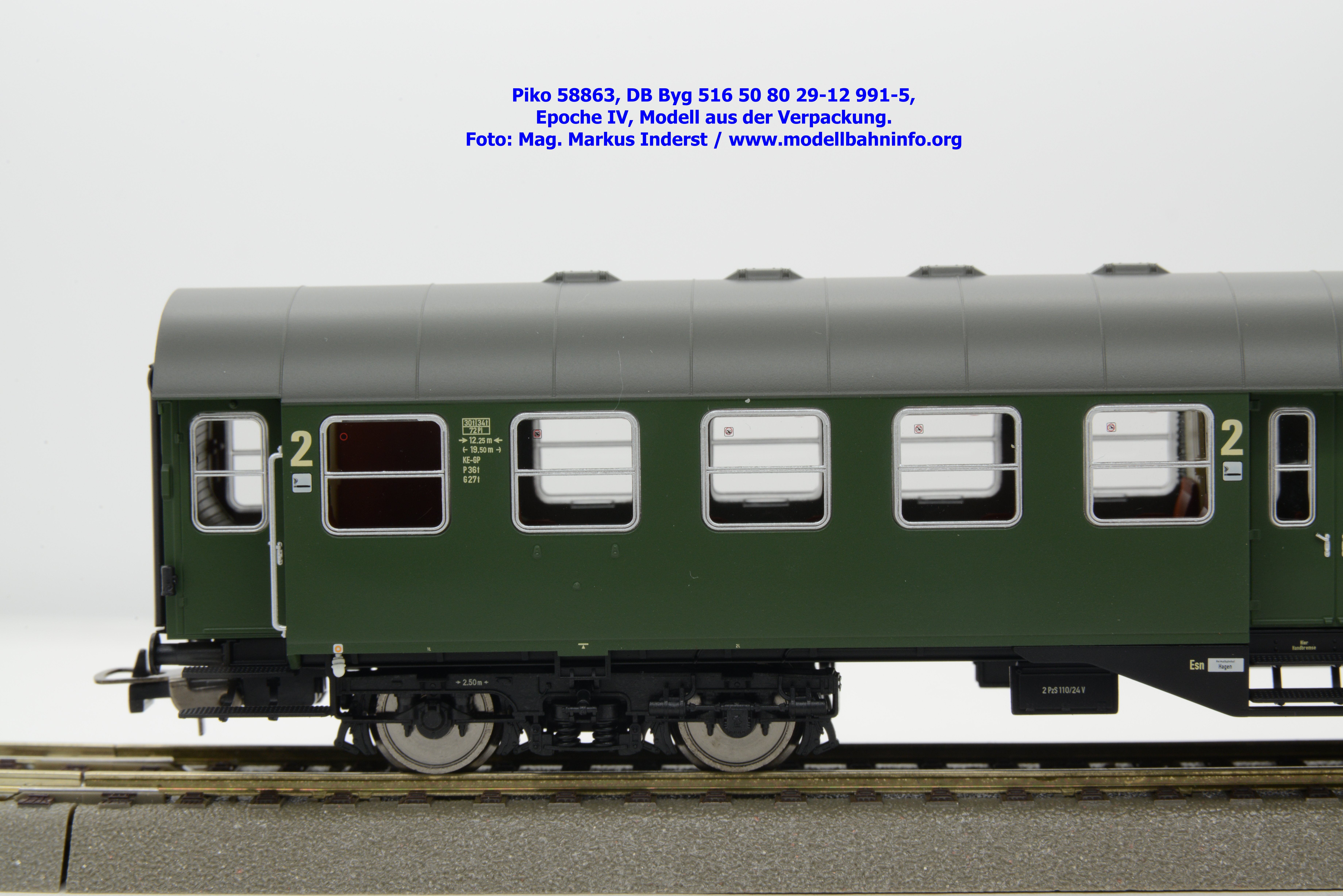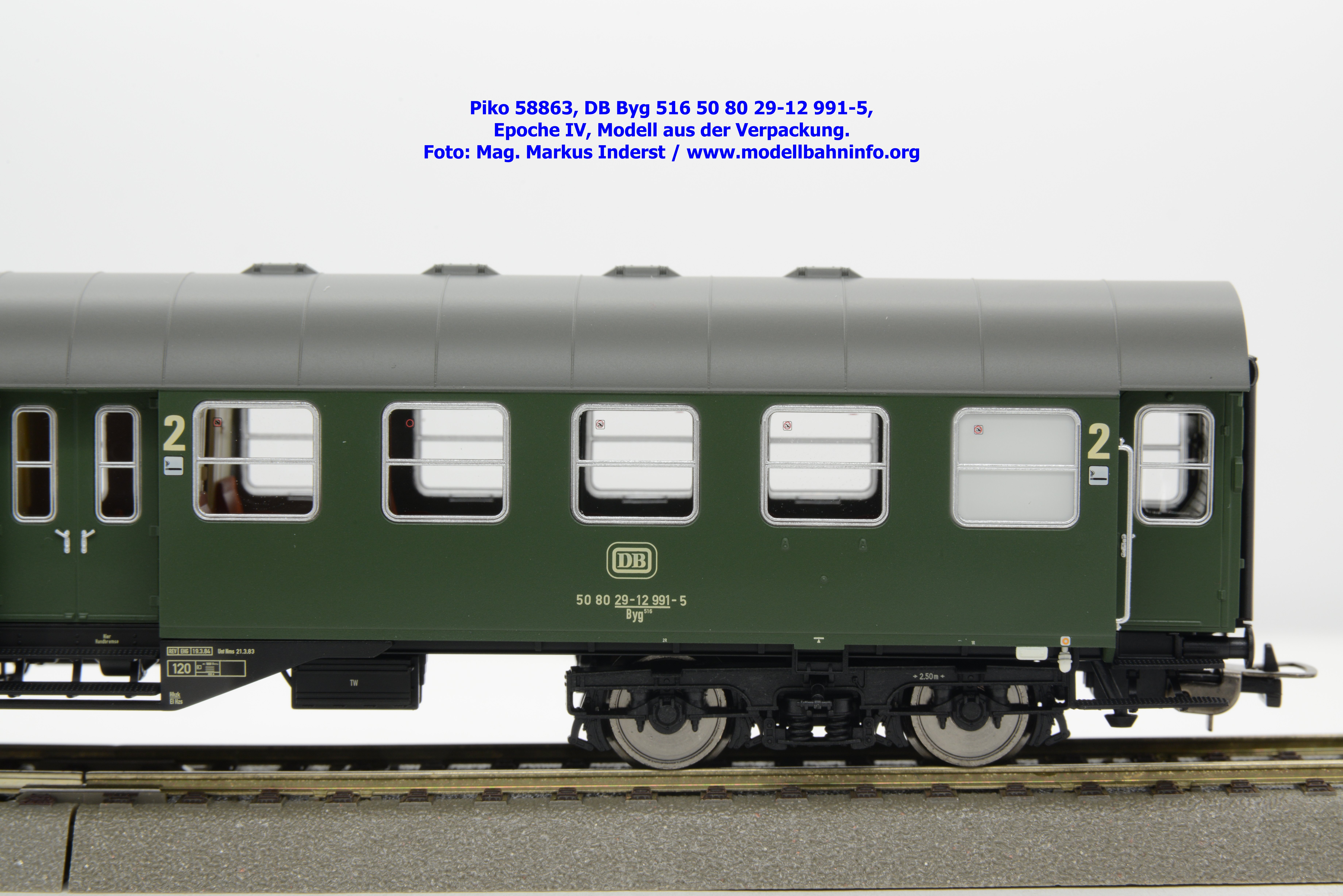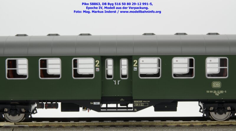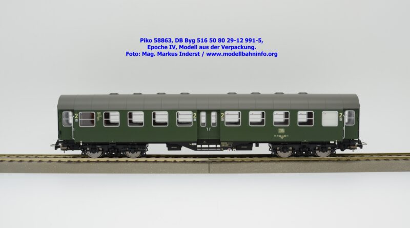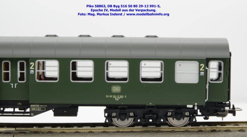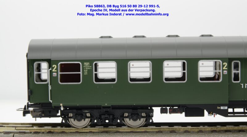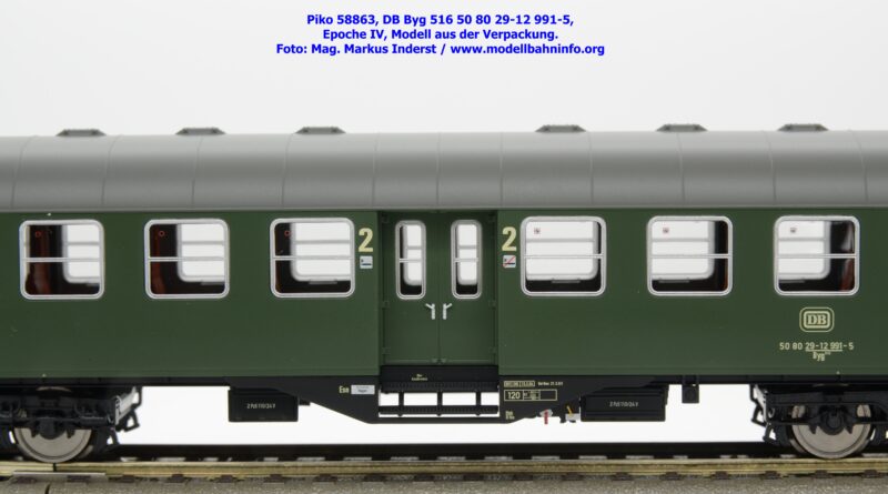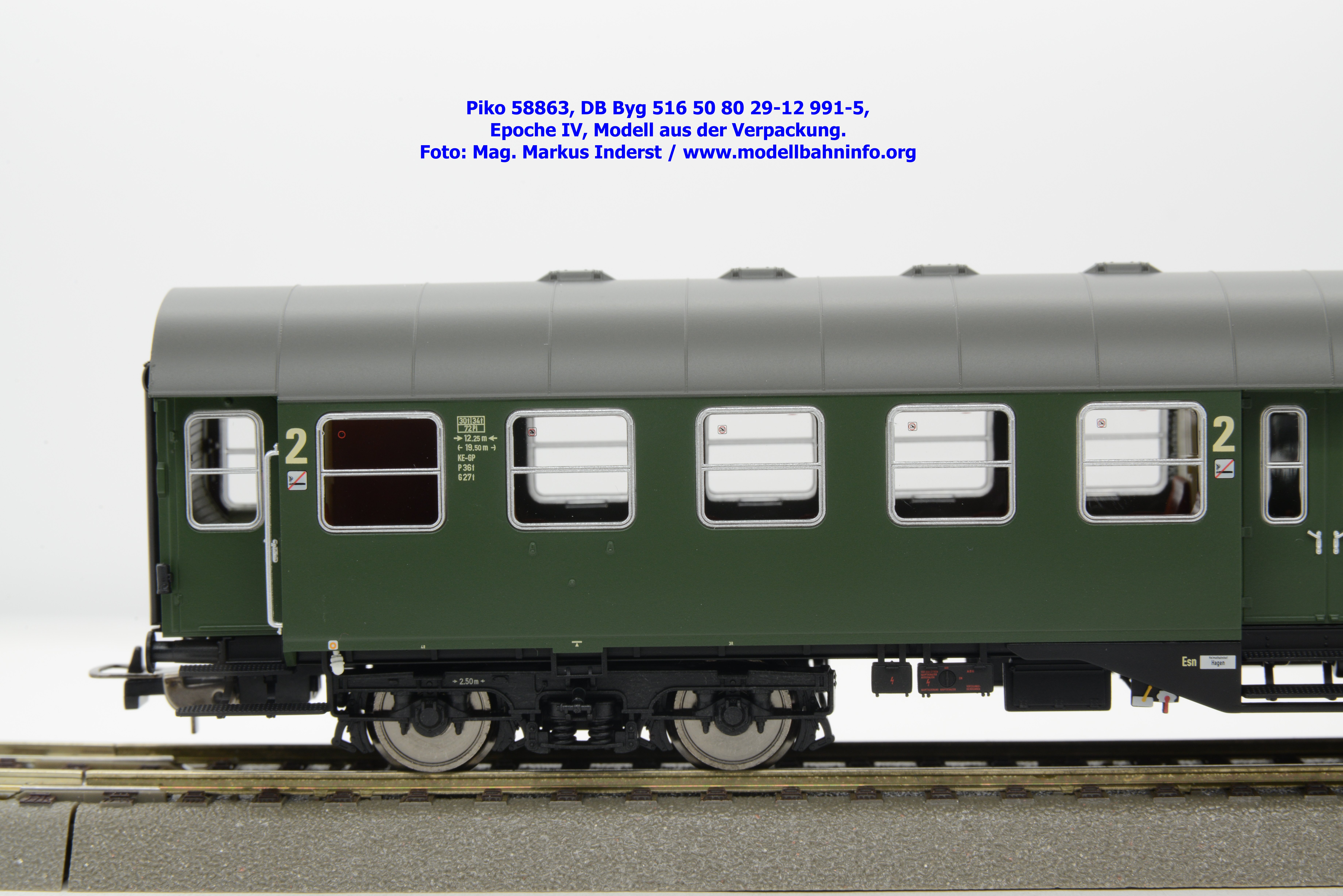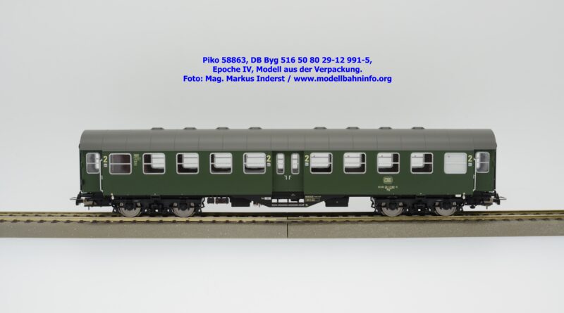 Dieser 2. Klasse Umbauwagen stellt nicht nur eine Formvariante bzw. Nummernvariante, sondern ergänzt das Sortiment der vierachsigen Umbauwagen durch eine weitere Modellkonstruktion. Im Unterschied zum 2. Klasse-Wagen mit der Artikelnummer 58861 wurde dieses Modell mit MD-Drehgestellen ausgestattet, wodurch dieser mit der Gattungsbezeichnung Byg 516 geführt wird. Das Modell trägt die Wagennummer 50 80 29-12 991-5 und die Untersuchungsdaten REV EHG 19. 3.84 bzw. Unt Nms 21. 3.83. Hagen gilt auch hier als Heimatbahnhof.