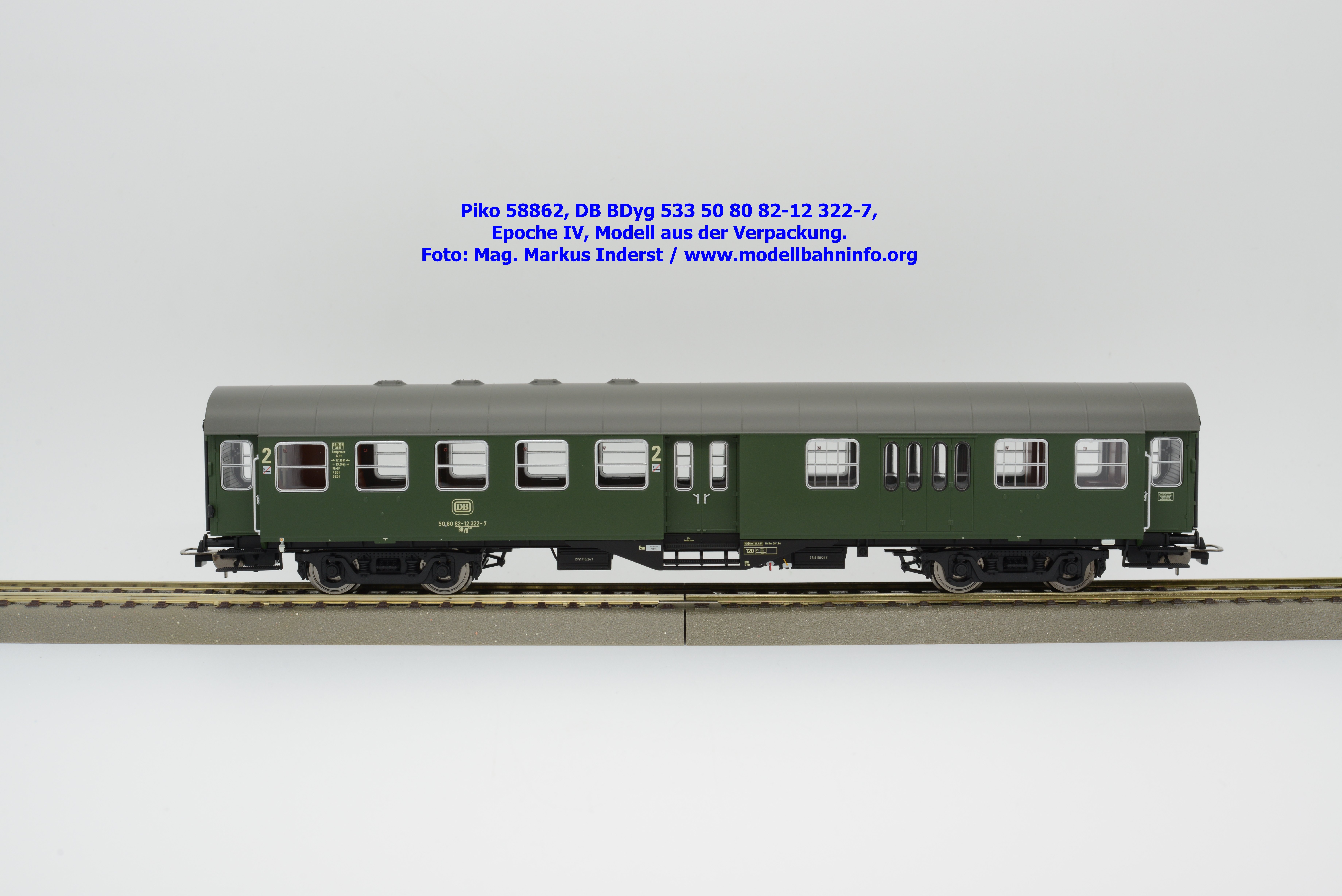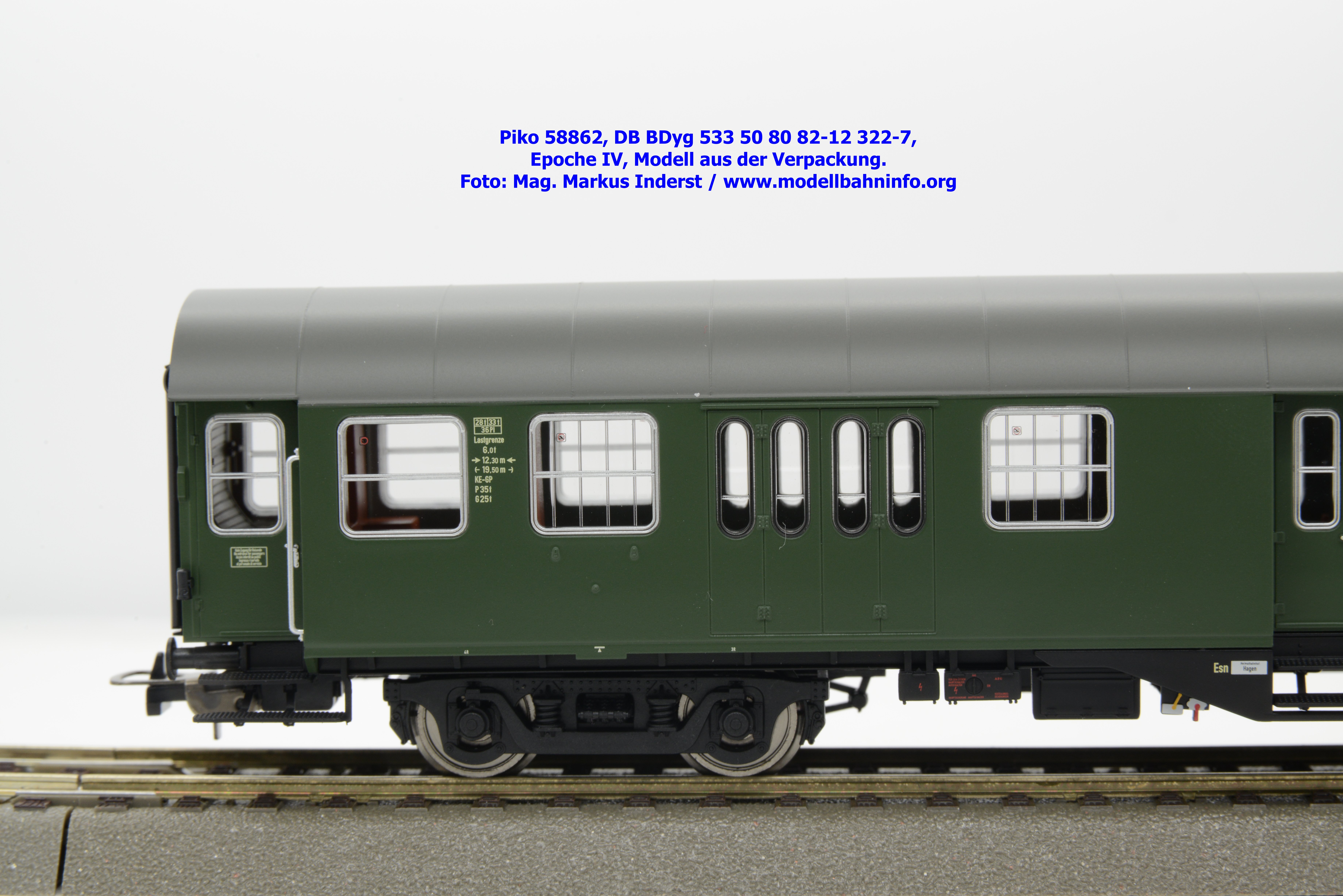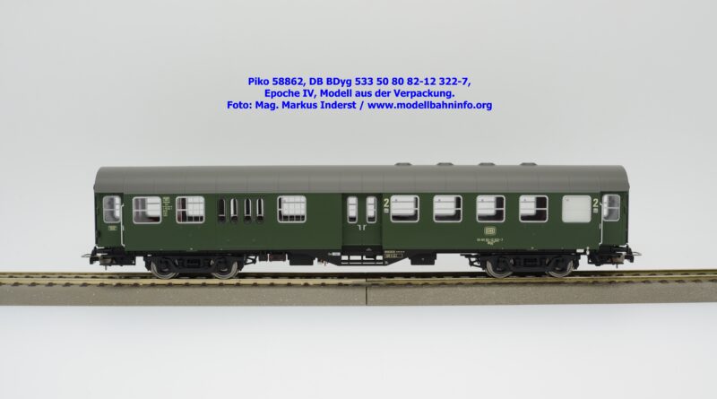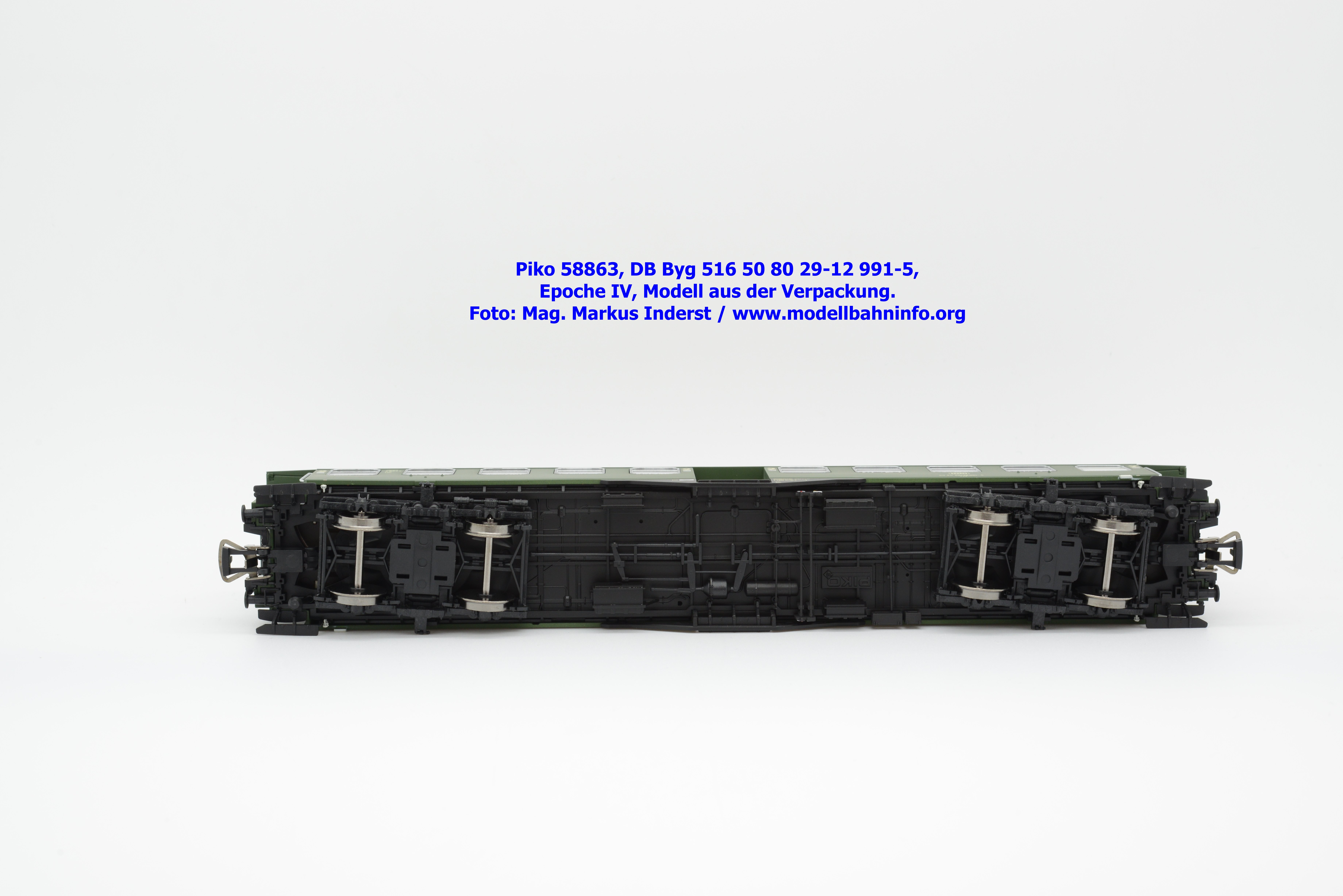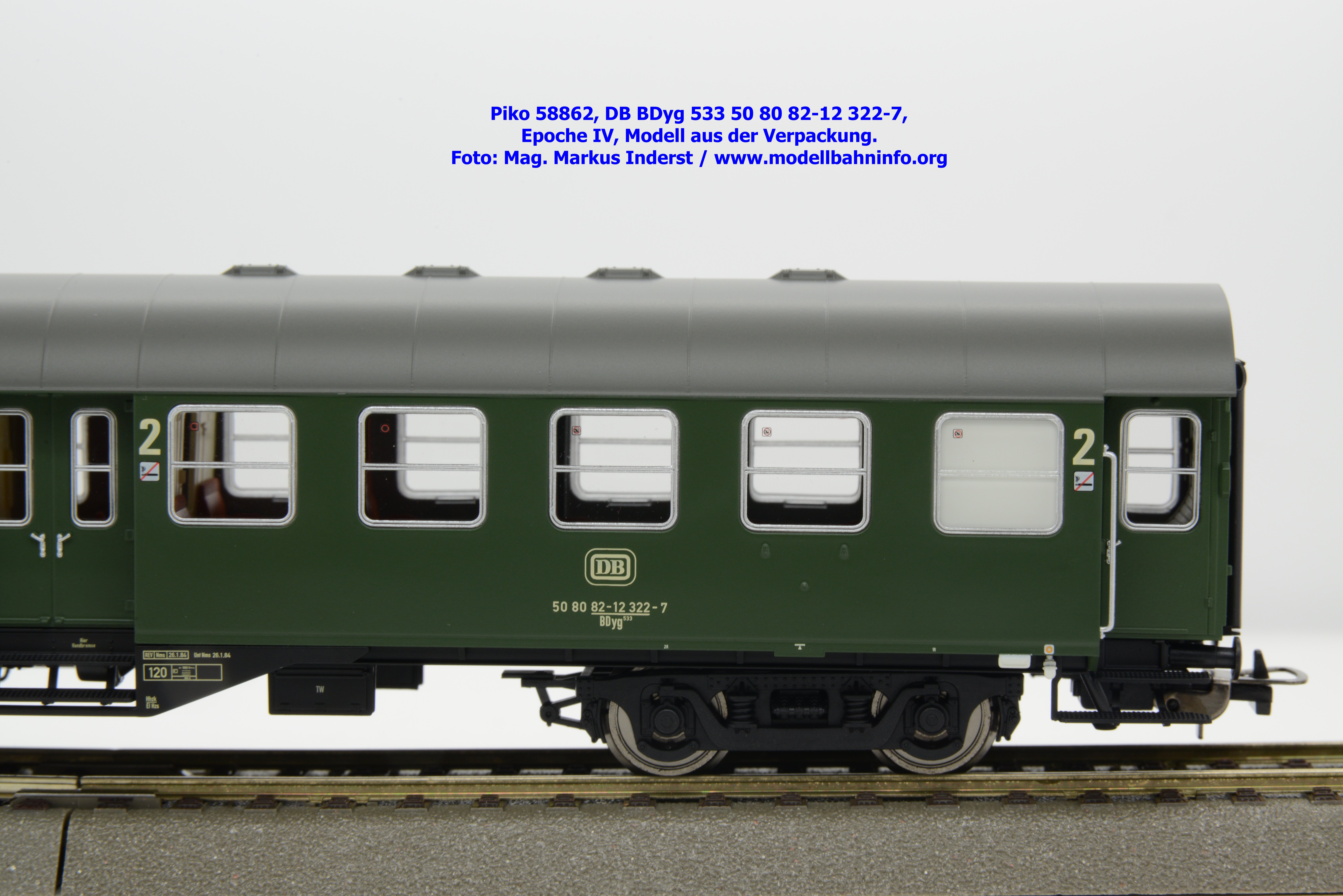 Dieser 2. Klasse Umbauwagen stellt nicht nur eine Formvariante bzw. Nummernvariante, sondern ergänzt das Sortiment der vierachsigen Umbauwagen durch eine weitere Modellkonstruktion. Im Unterschied zum 2. Klasse-Wagen mit der Artikelnummer 58861 wurde dieses Modell mit MD-Drehgestellen ausgestattet, wodurch dieser mit der Gattungsbezeichnung Byg 516 geführt wird. Das Modell trägt die Wagennummer 50 80 29-12 991-5 und die Untersuchungsdaten REV EHG 19. 3.84 bzw. Unt Nms 21. 3.83. Hagen gilt auch hier als Heimatbahnhof.