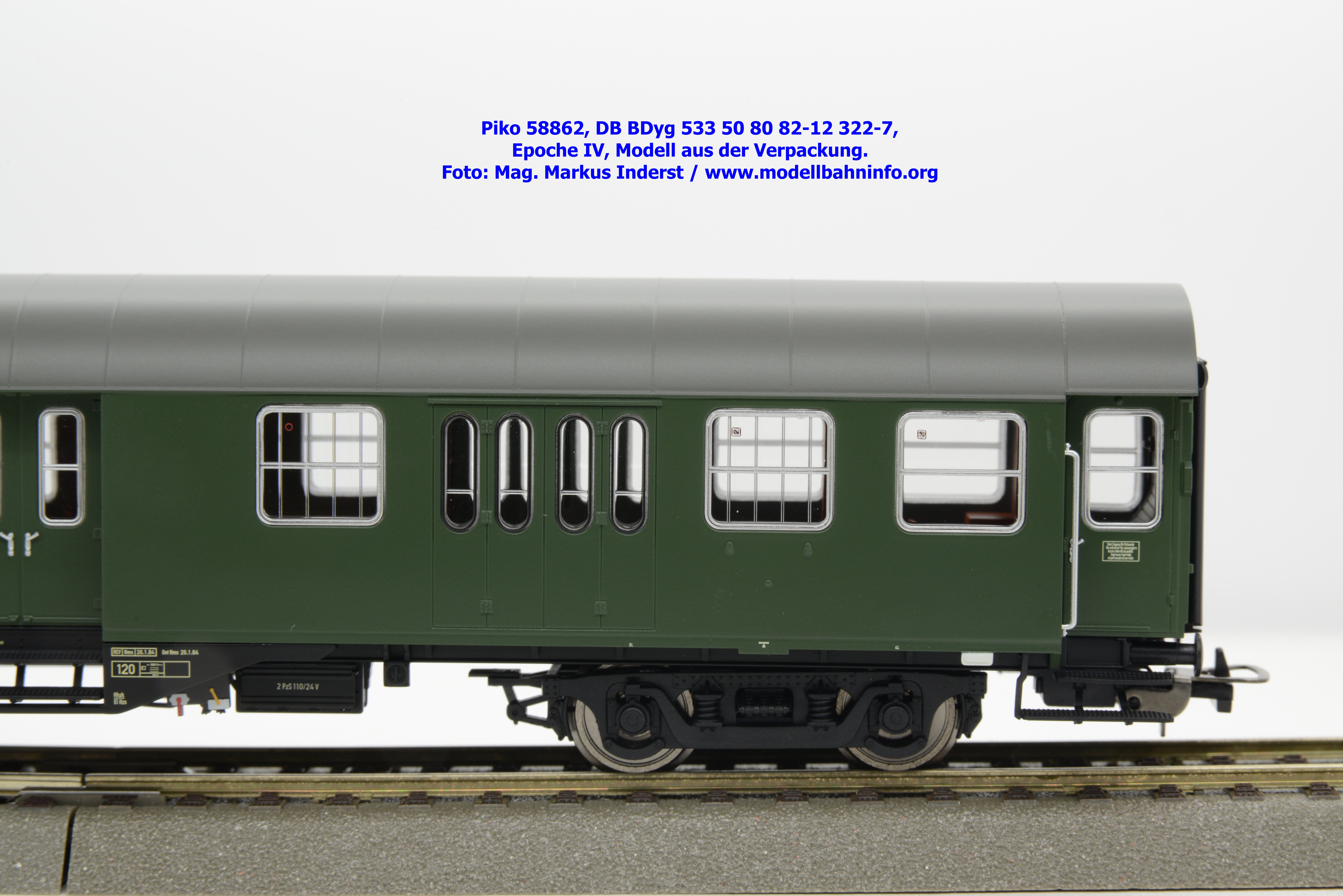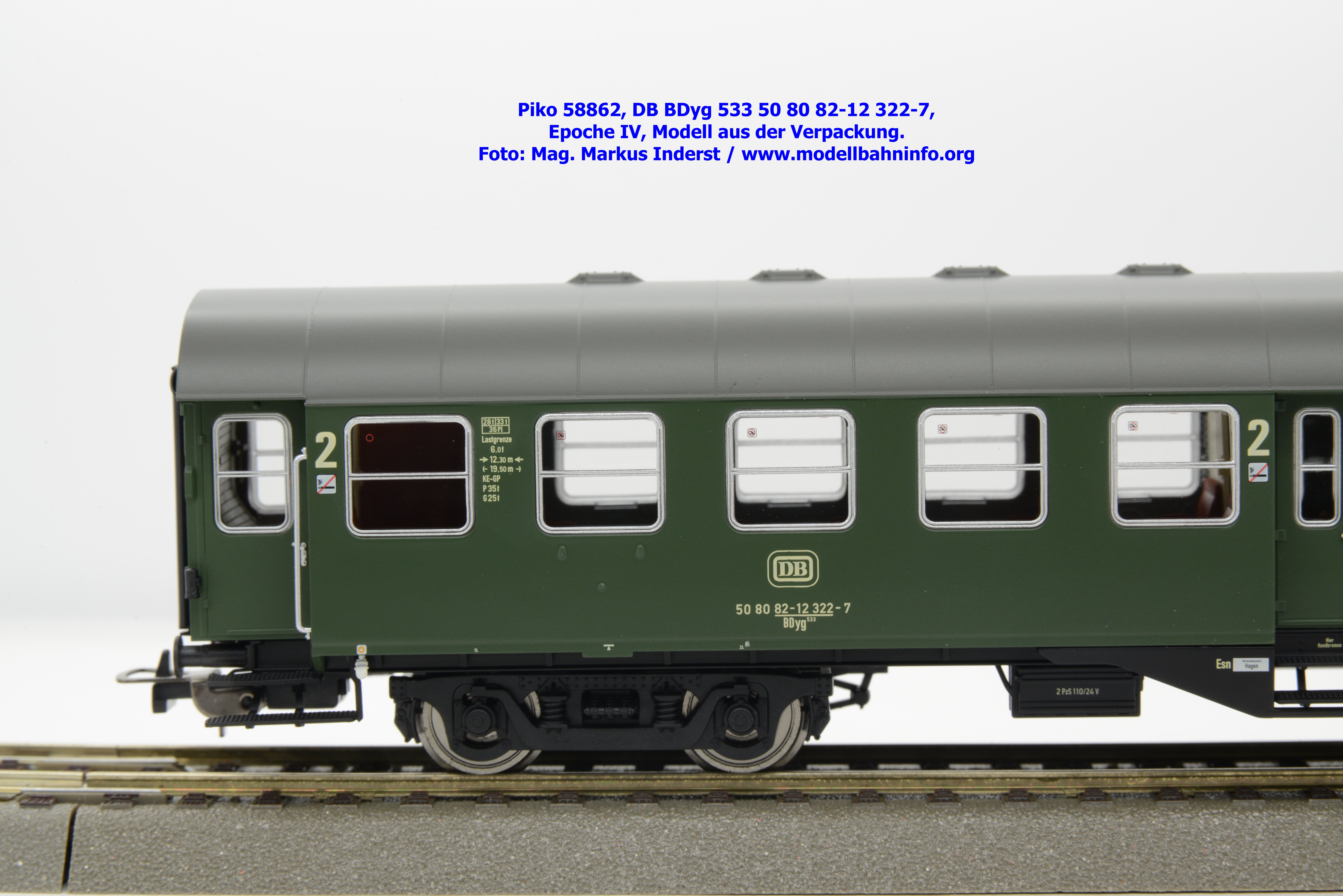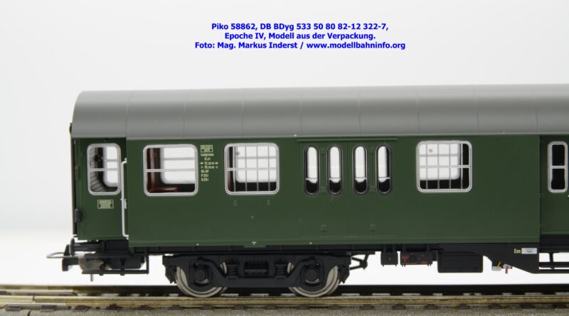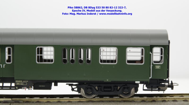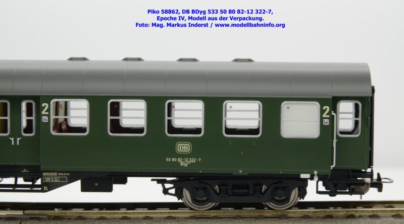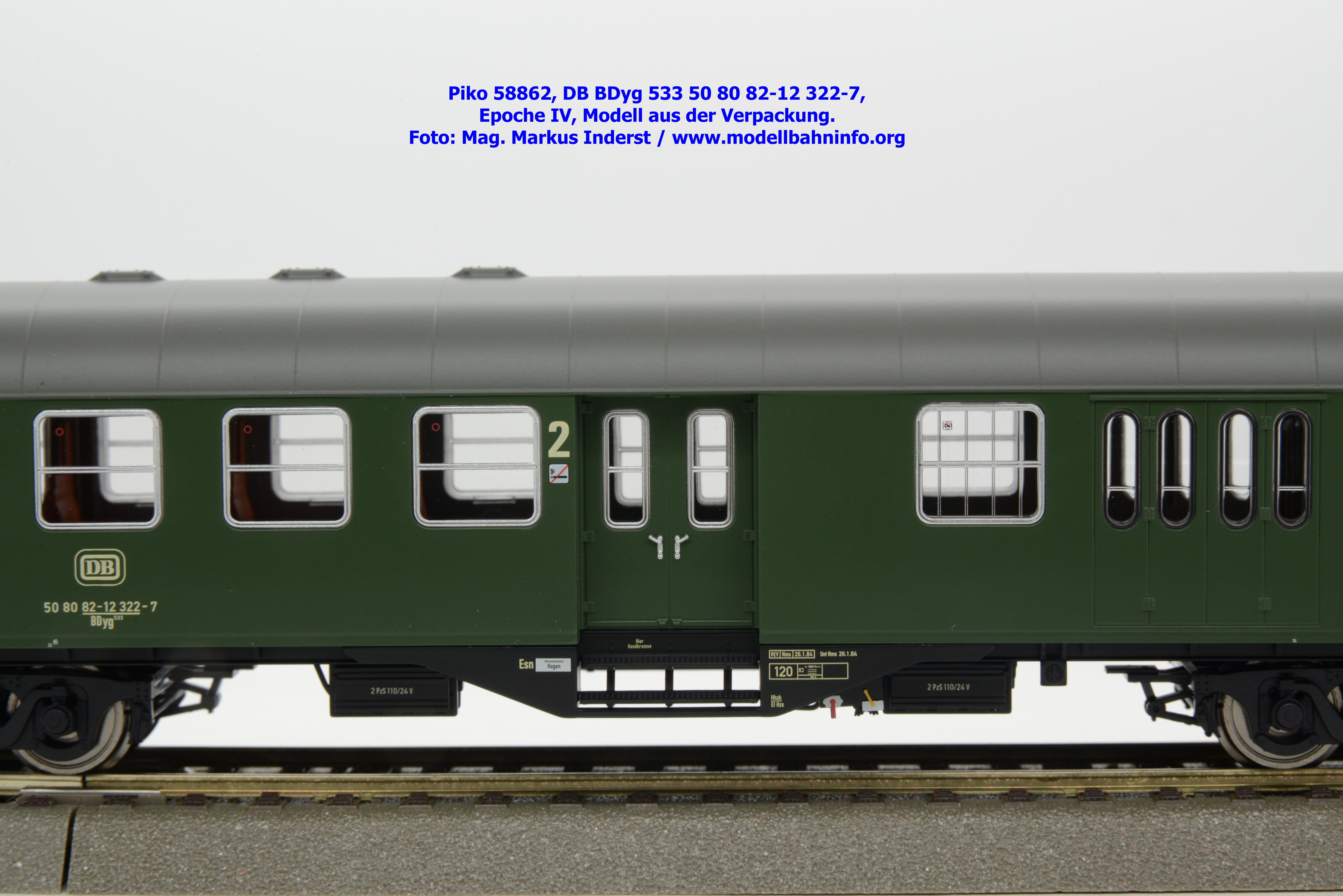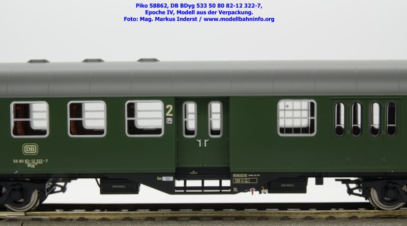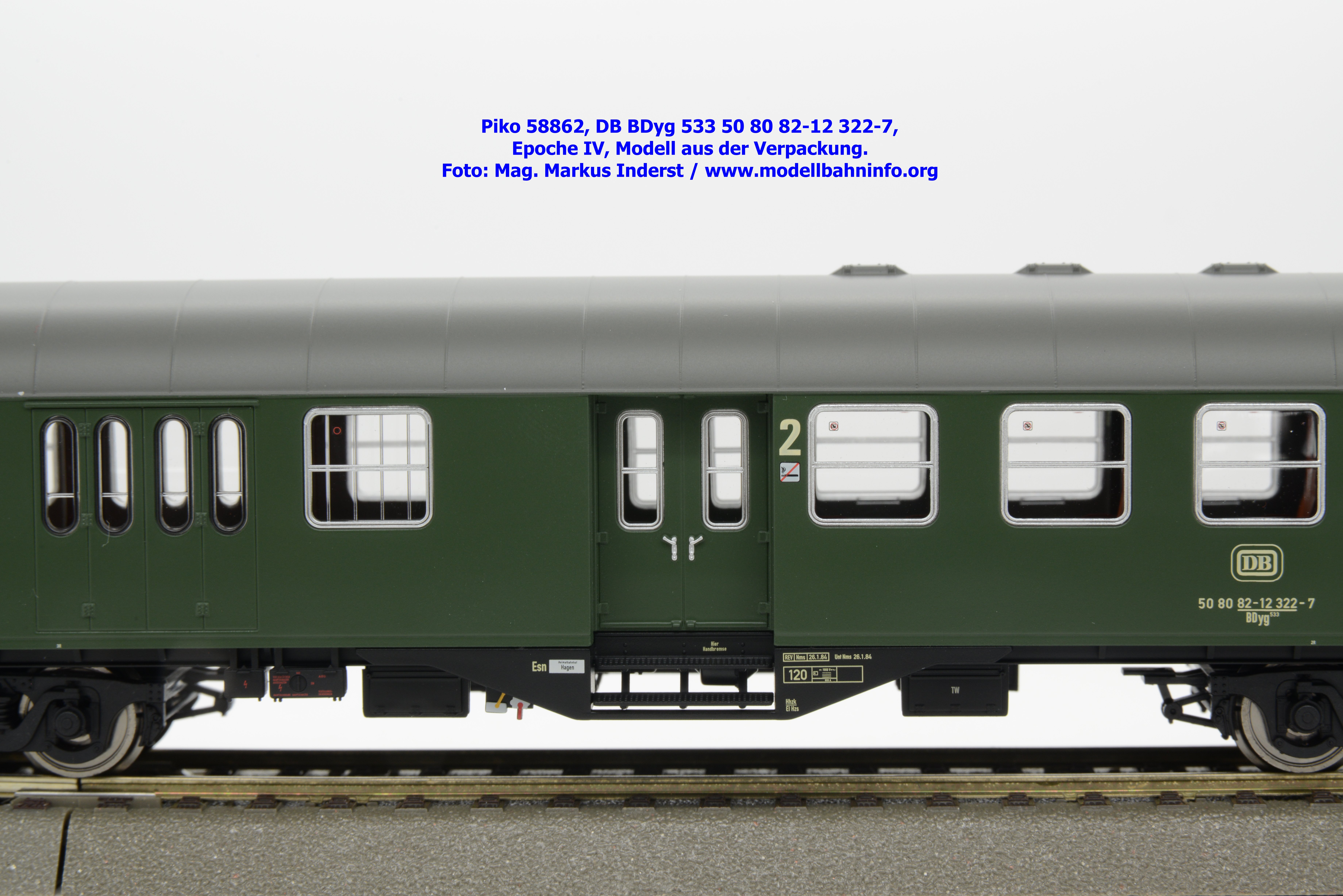 Die DB hat den 2. Klasse Halbgepäckwagen der vierachsigen Umbauwagen die Gattungsbezeichnung BDyg 533 zugewiesen. Das Modell weist die Wagennummer 50 80 82-12 322-7 auf, natürlich ist auch hierbei Hagen als Heimatbahnhof angegeben. Im Revisionsraster stehen die Untersuchungsdaten mit REV Nms 26. 1.84 bzw. Unt Nms 26.1.84.