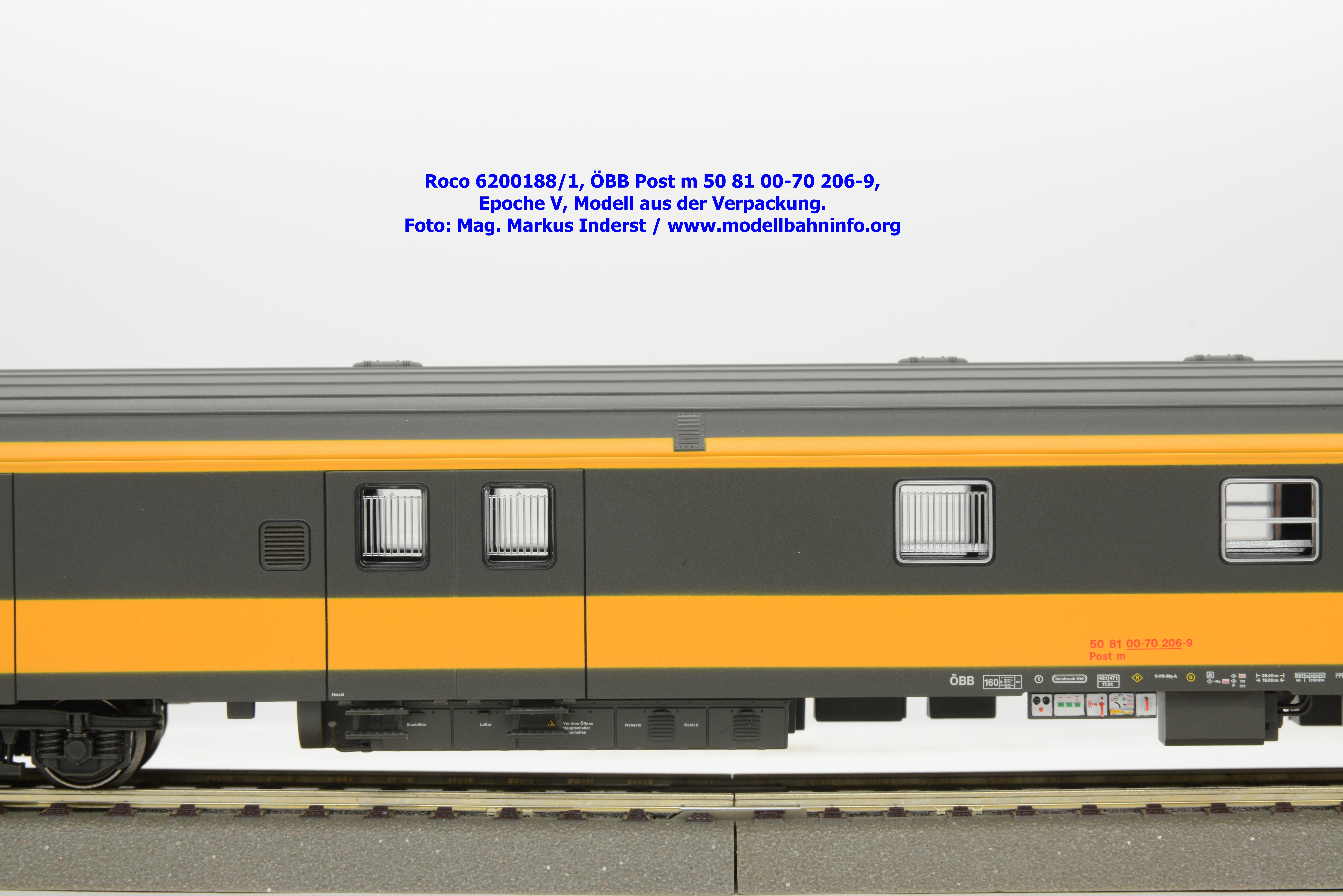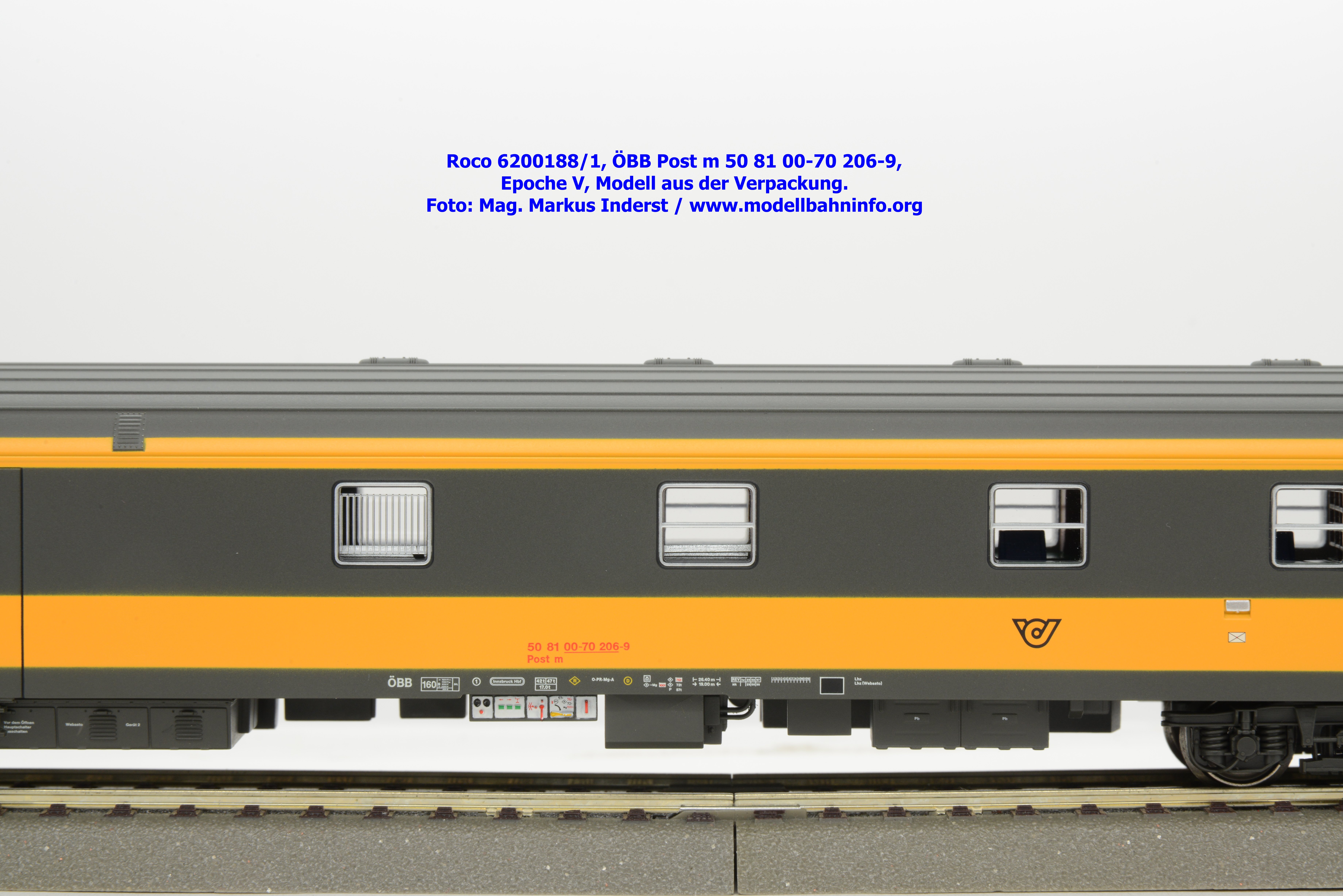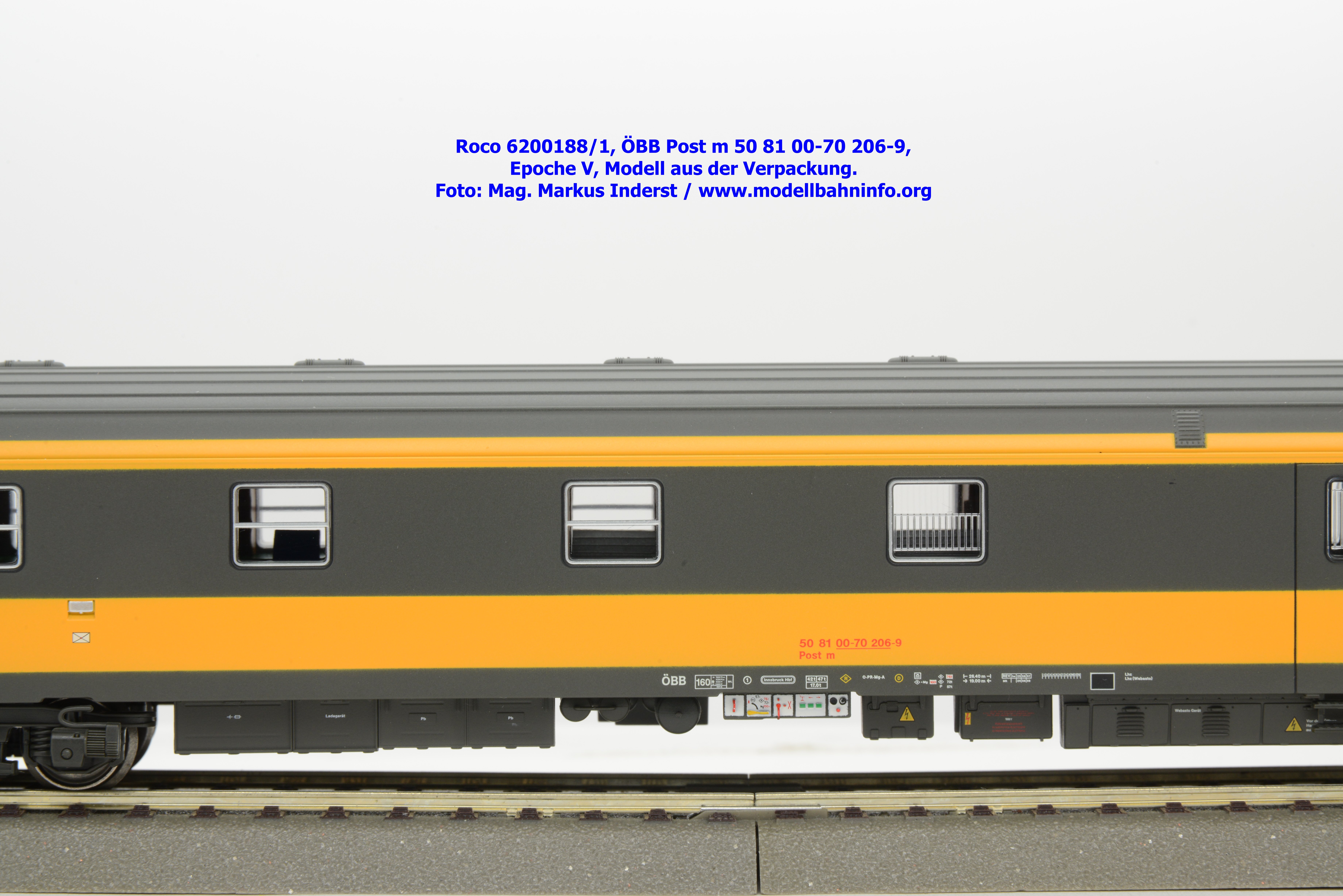 Das erste Modell in dem Wagenset ist als Postm 50 81 00-70 206-9 beschriftet. Der Wagen ist in Innsbruck beheimatet. Im Revisionsraster stehen die Angaben REV Iw 29. 8.97.