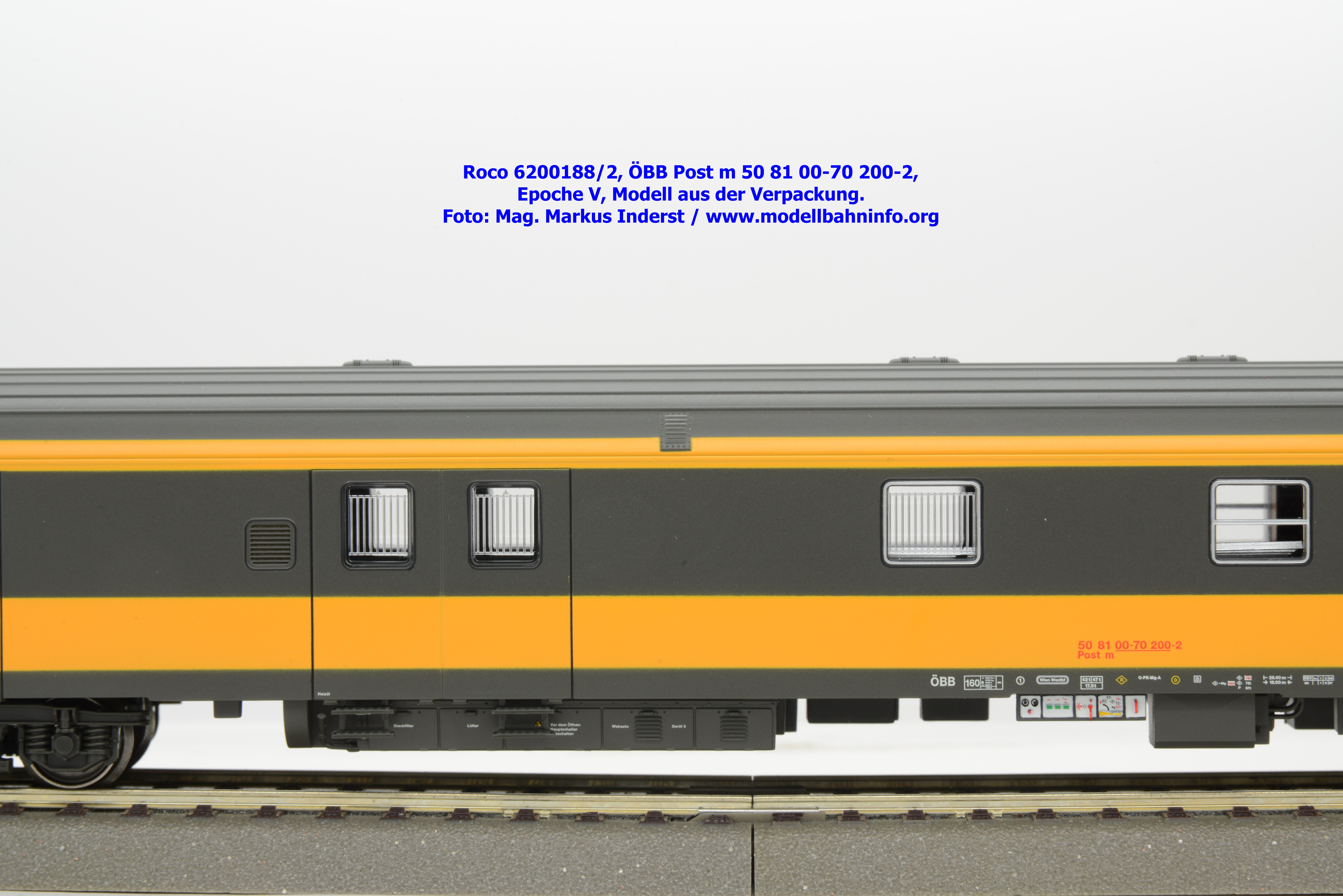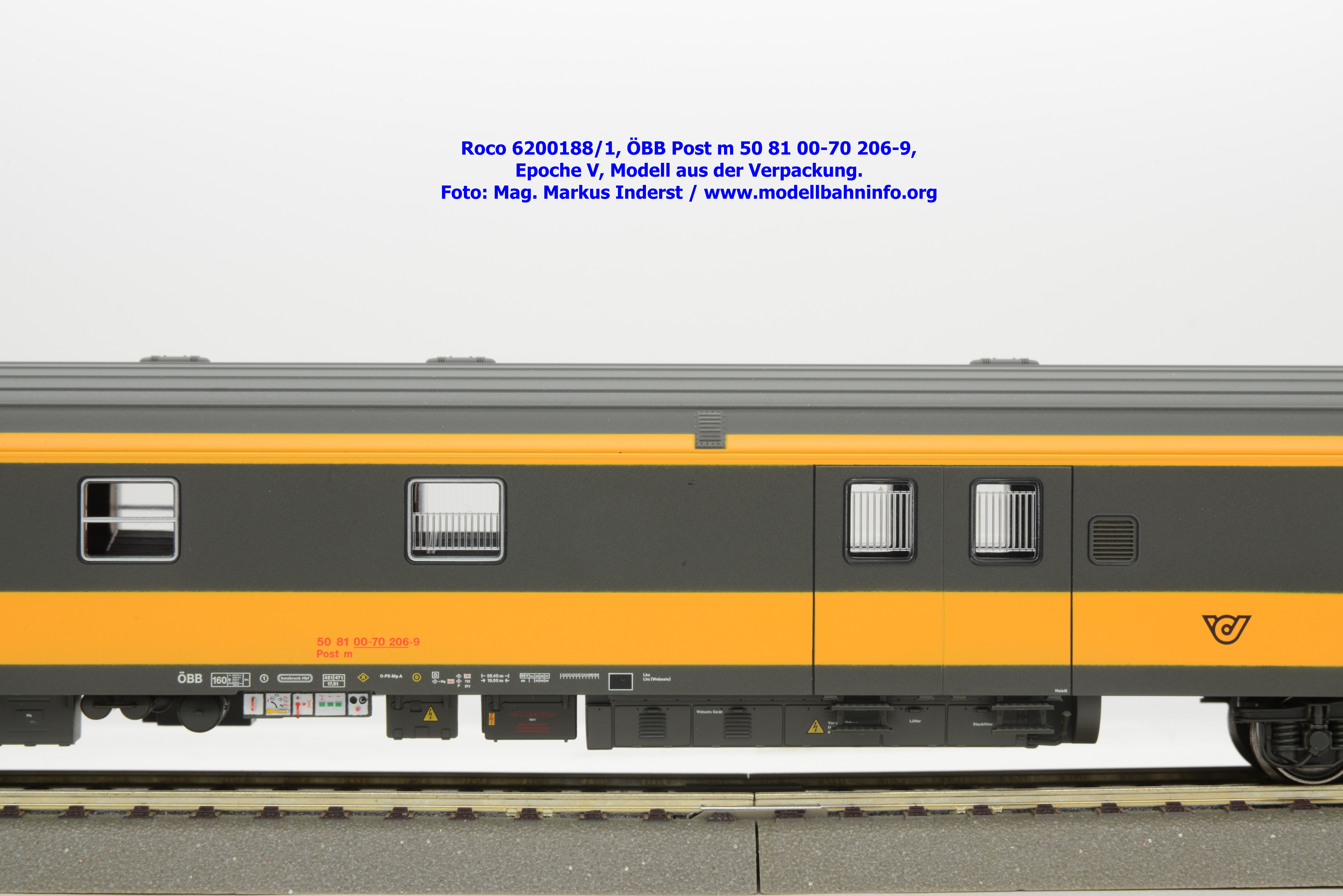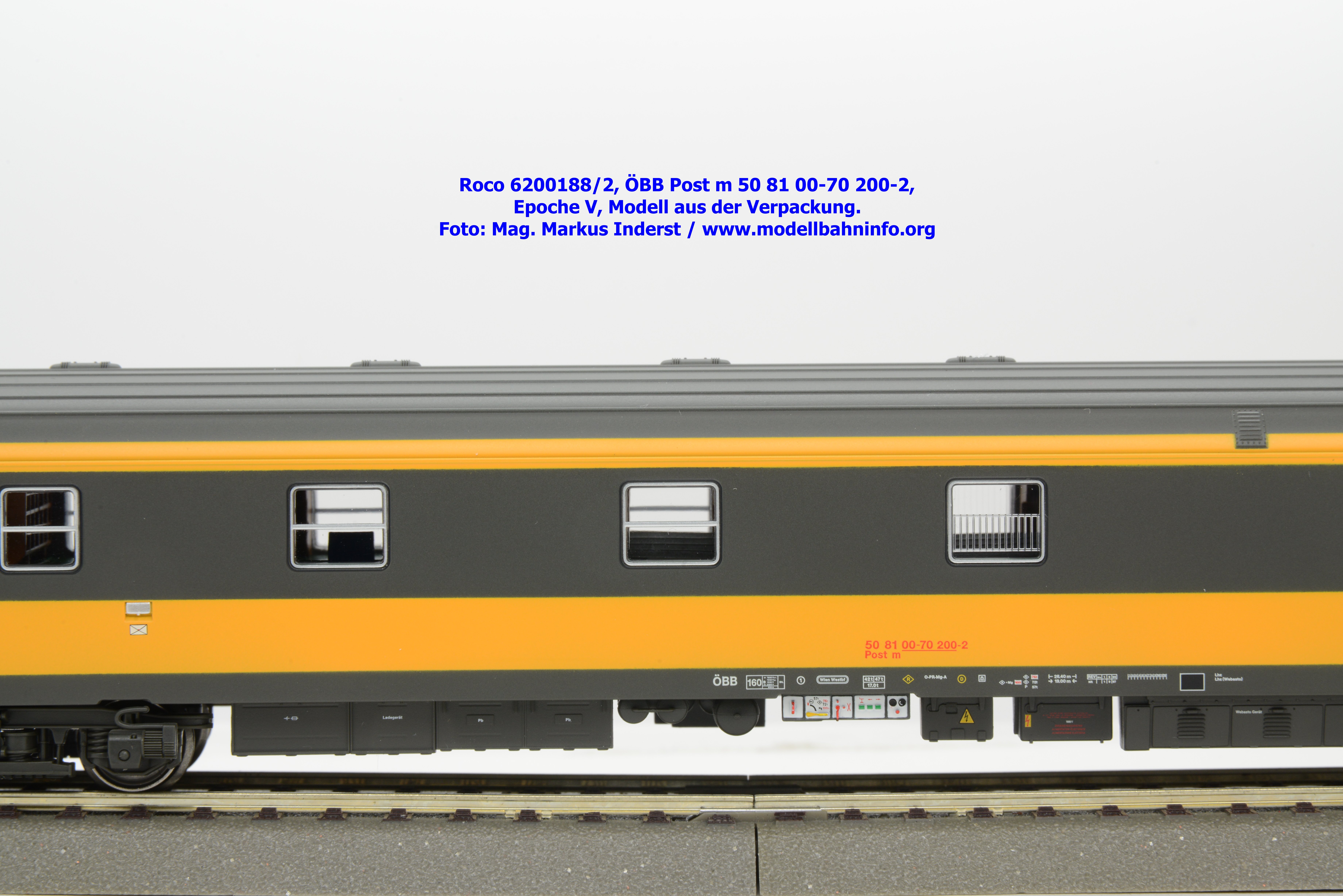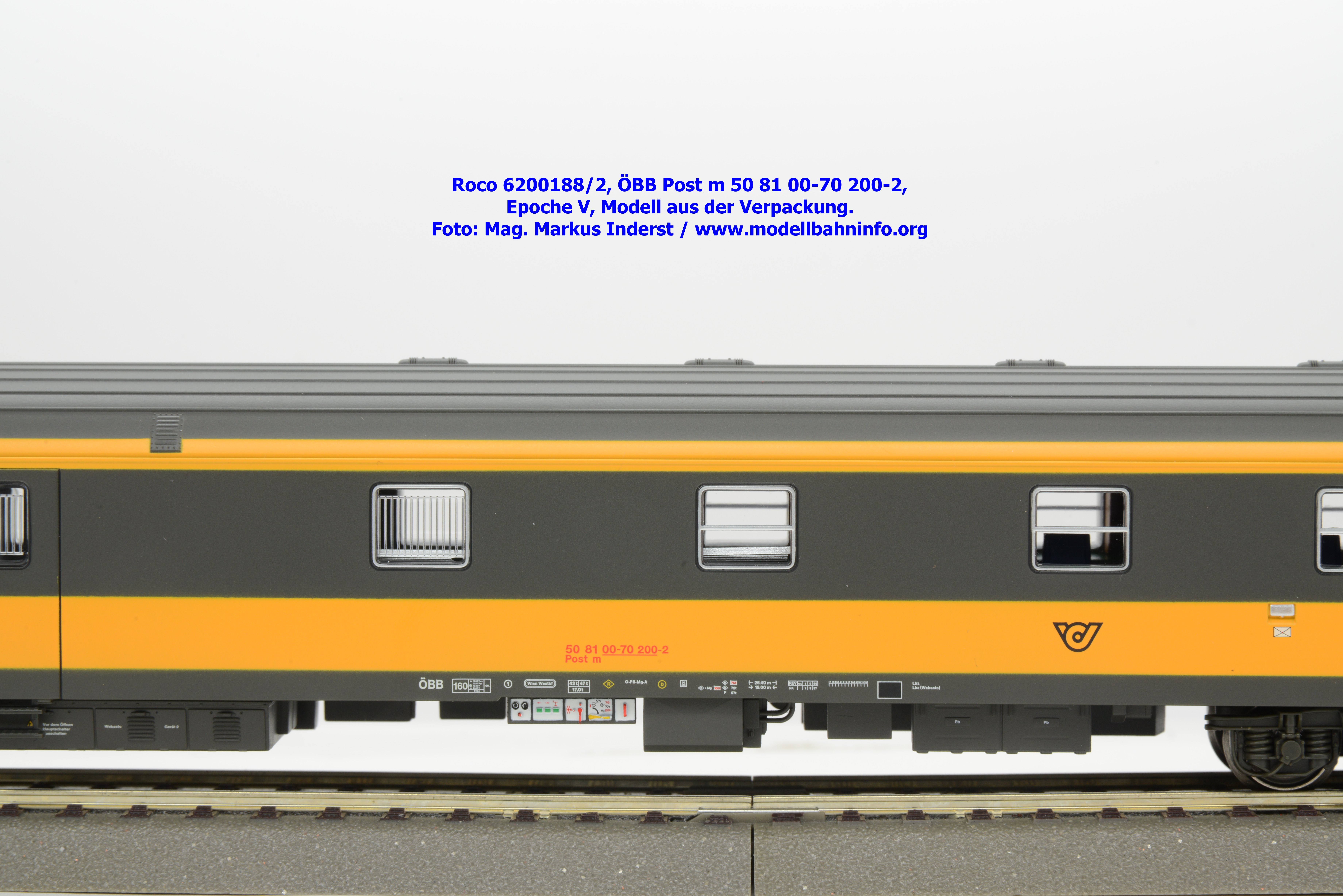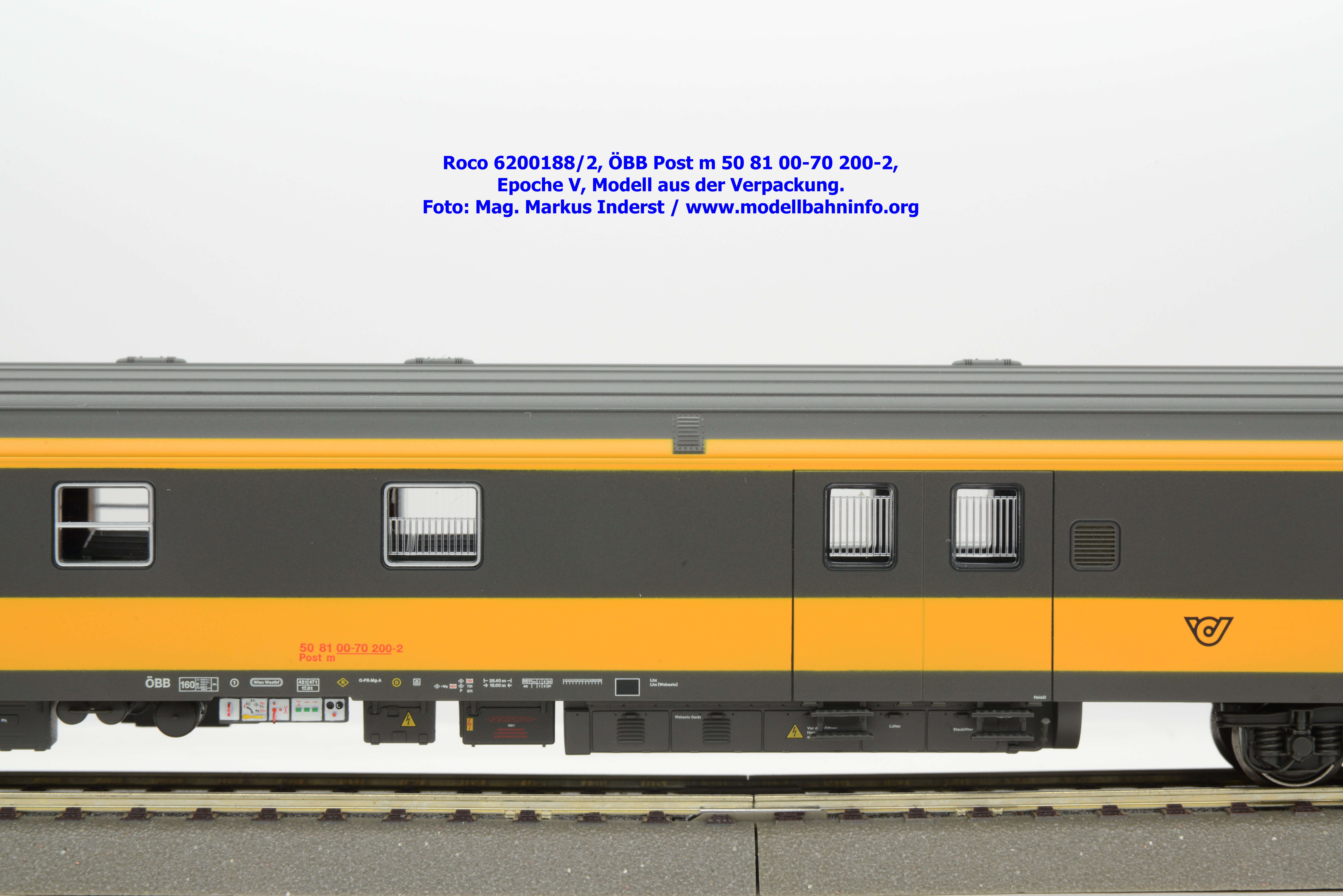 Das Schwestermodell ist mit den Fahrzeuganschriften Post m 50 81 00-70 200-2 bedruckt. Der Wagen ist in Wien-Westbf. beheimatet. Im Revisionsraster stehen die Angaben REV Ww 1. 9.96.