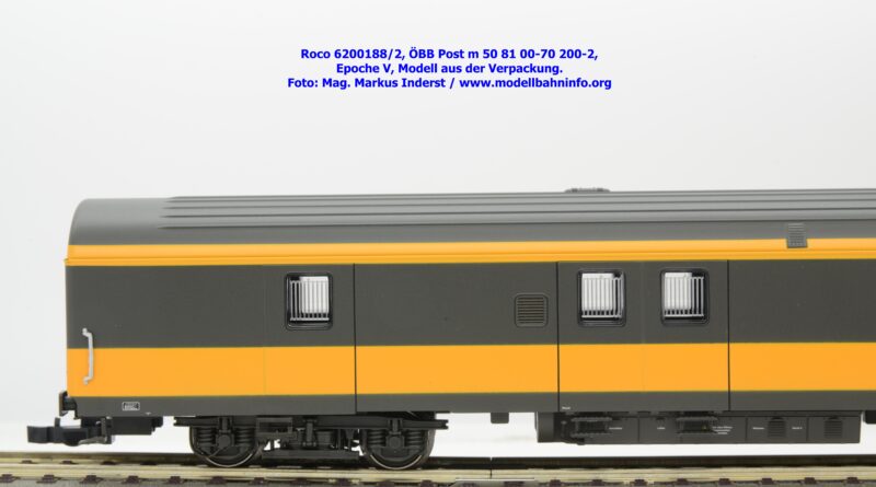 Roco hat bisher nur Postbeiwagen auf BAsis von zweiachsigen Güterwagen realisiert. Im Neuheitenblatt 2025 haben sich die Salzburger dem Thema angenommen, nachdem ein italienischer Mitbewerbung seit mehr als einem Dezennium damit ankündigt, diese umzusetzen. Jedenfalls war die Freude groß, daß Roco endlich einen österreichischen Postwagen als Neukonstruktion angekündigt hat. Zu Umsetzung gelangtee die Serie Post m 00-70 200ff. Die erstauflage ist im letzten Farbschema ausgeführt, indem die erstem Modelle in den Farben Gelb und Umbragrau lackiert sind. Bei der Indienststellung waren die Postwagen im Jaffa-Design lackiert.
