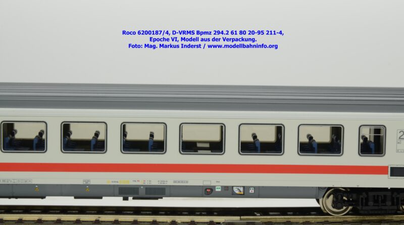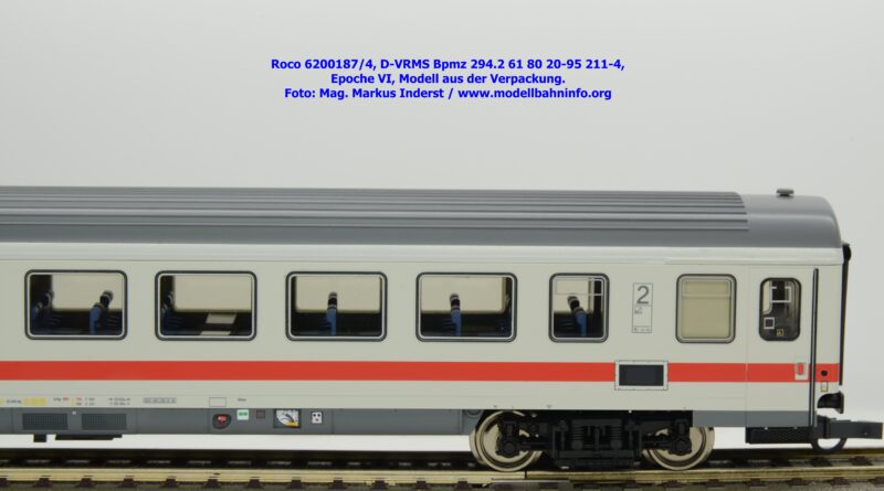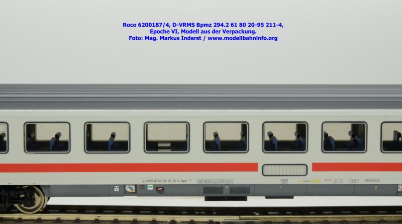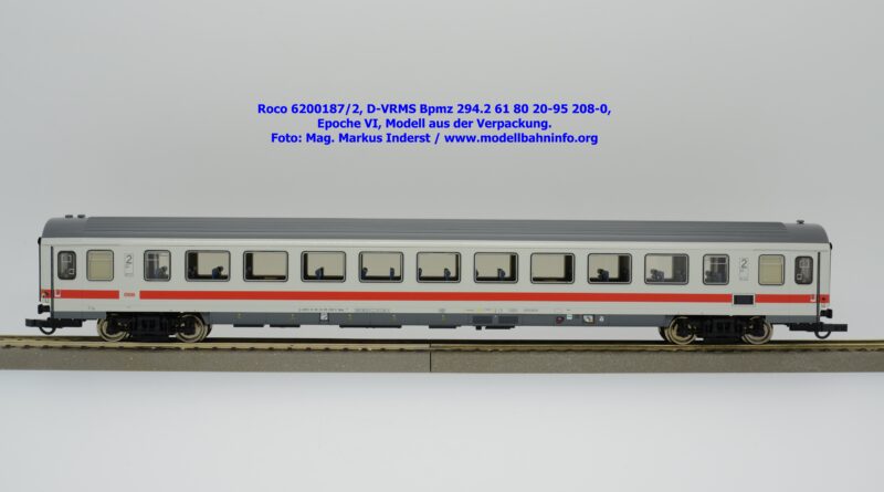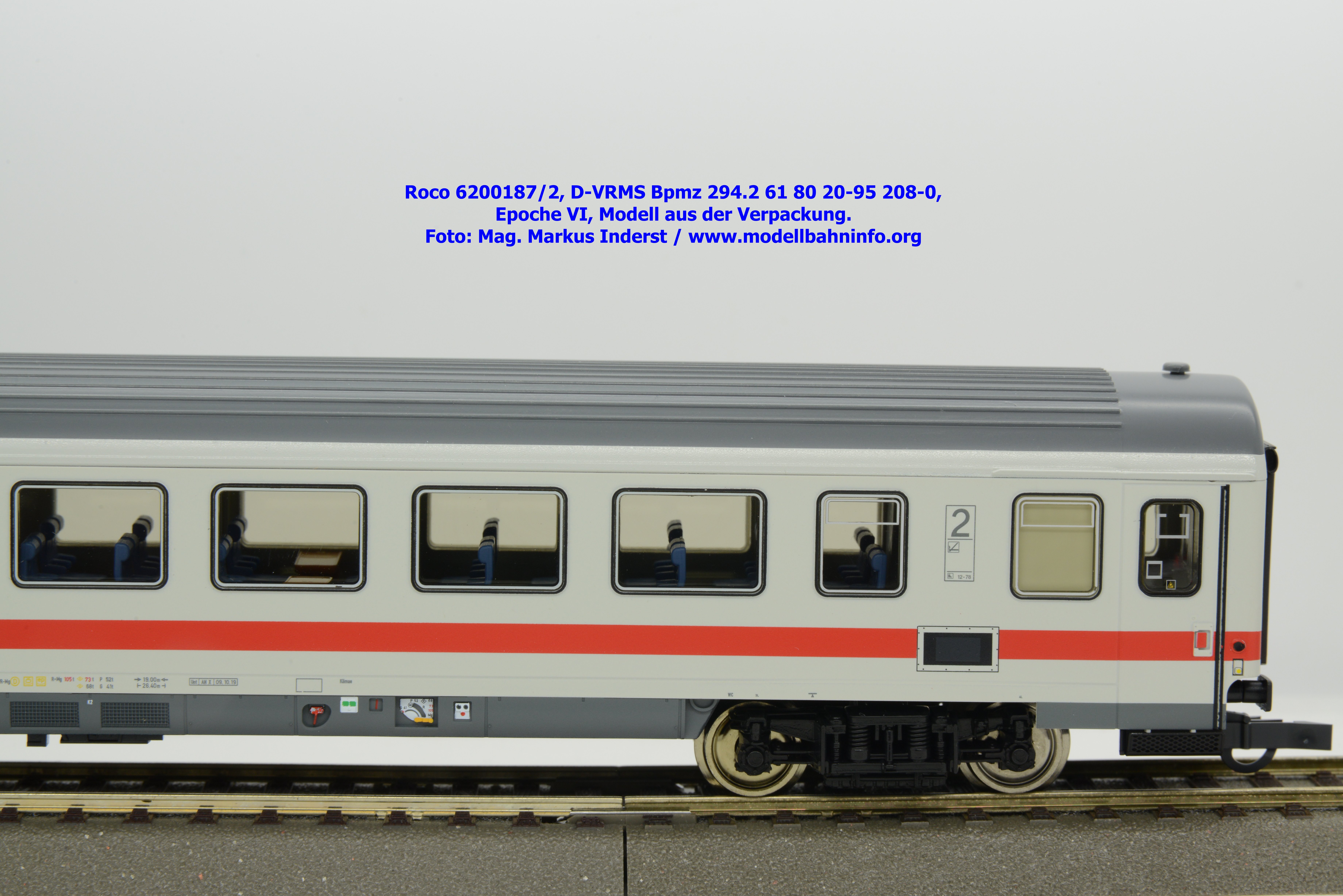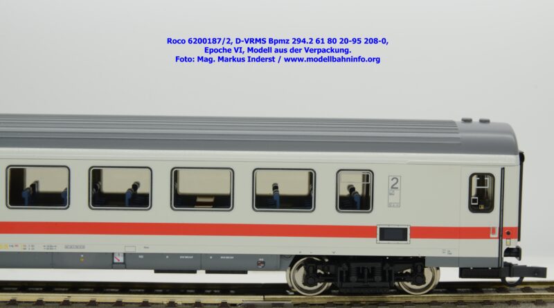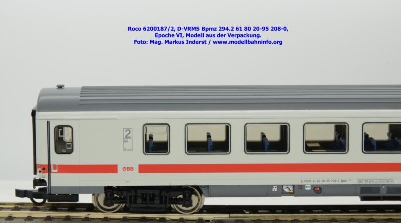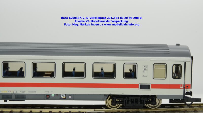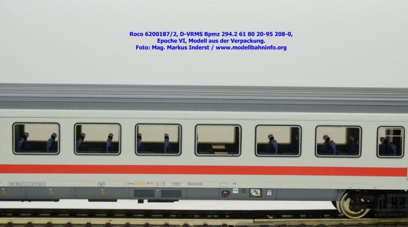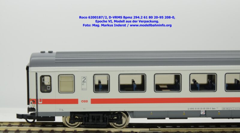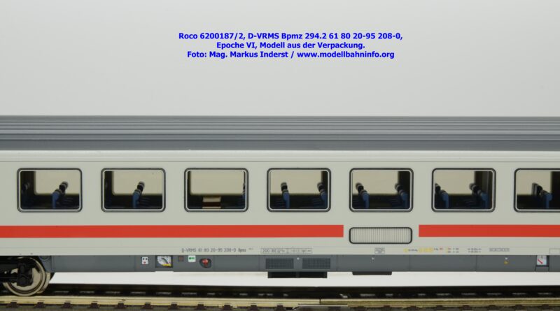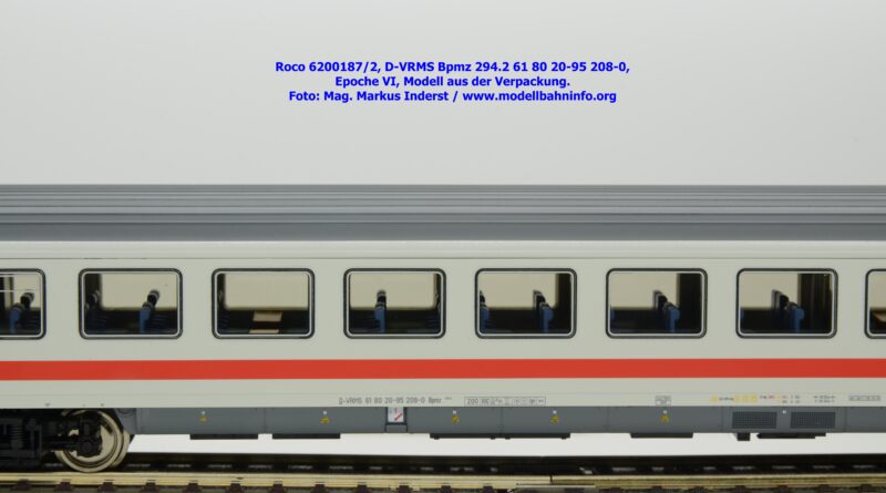 Dieses und die beiden weiteren Modelle gehören der Bauartbezeichnung Bpmz 294.2 an. Dieses Modell ist mit der Wagennummer 61 80 20-95 208-0 beschriftet, die Halterkennung ist wiederum D-VRMS. Im Revisionsraster stehen die Untersuchungsdaten Unt AN X 09.10.19.