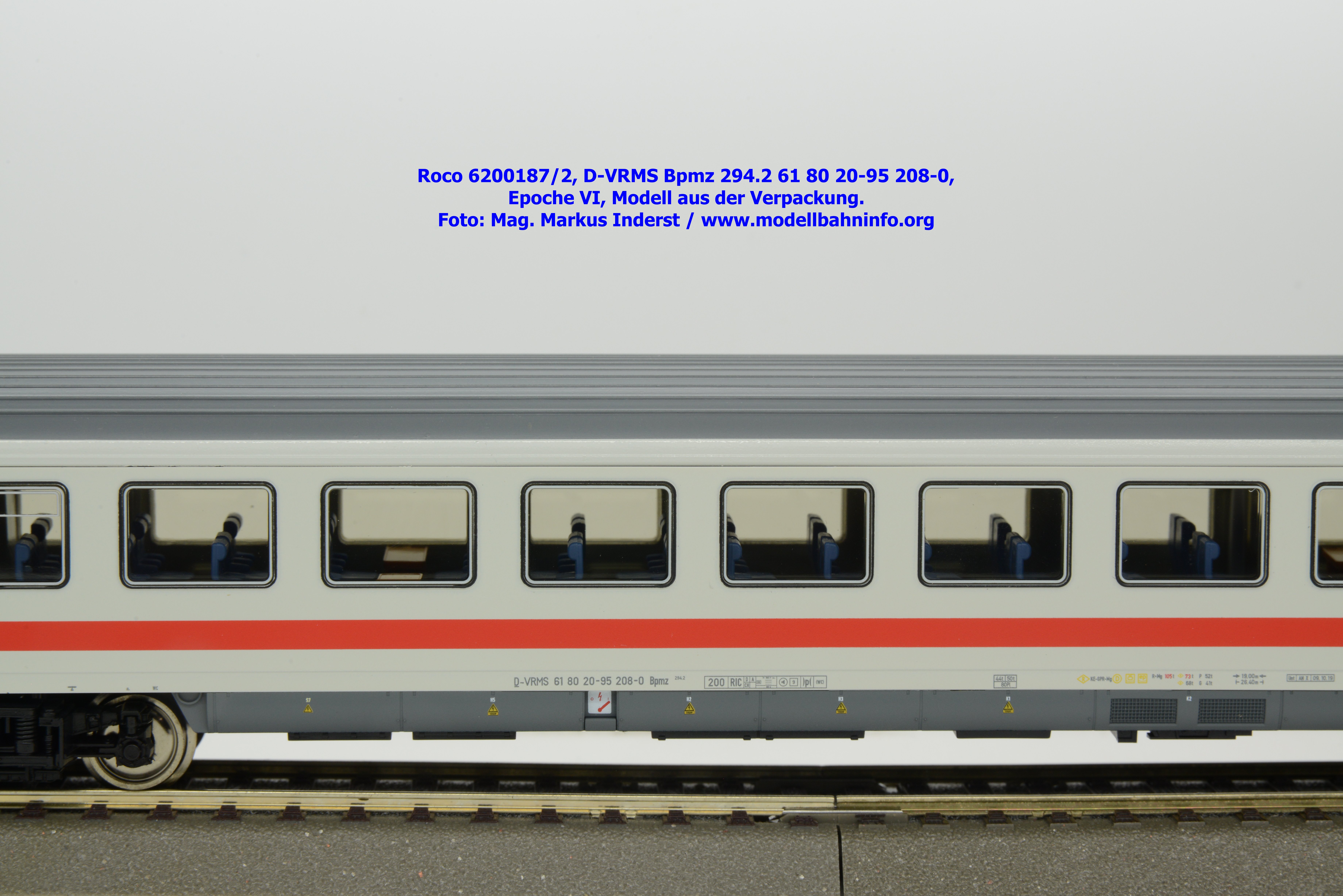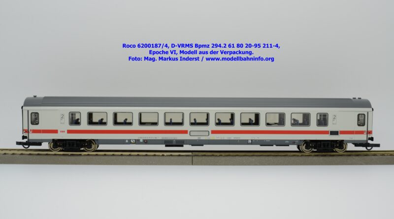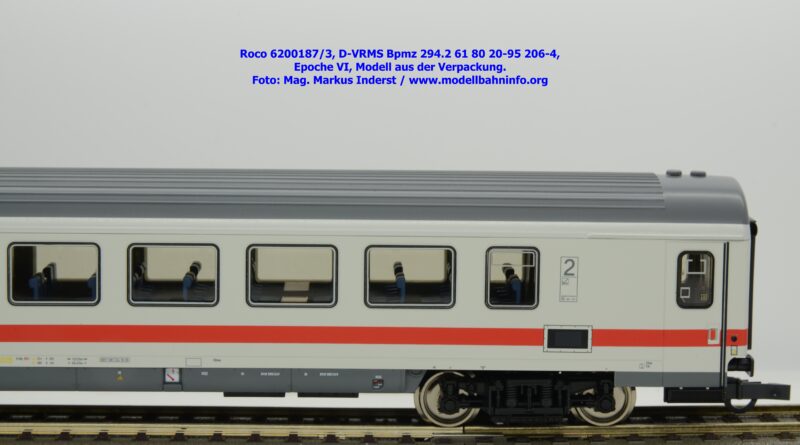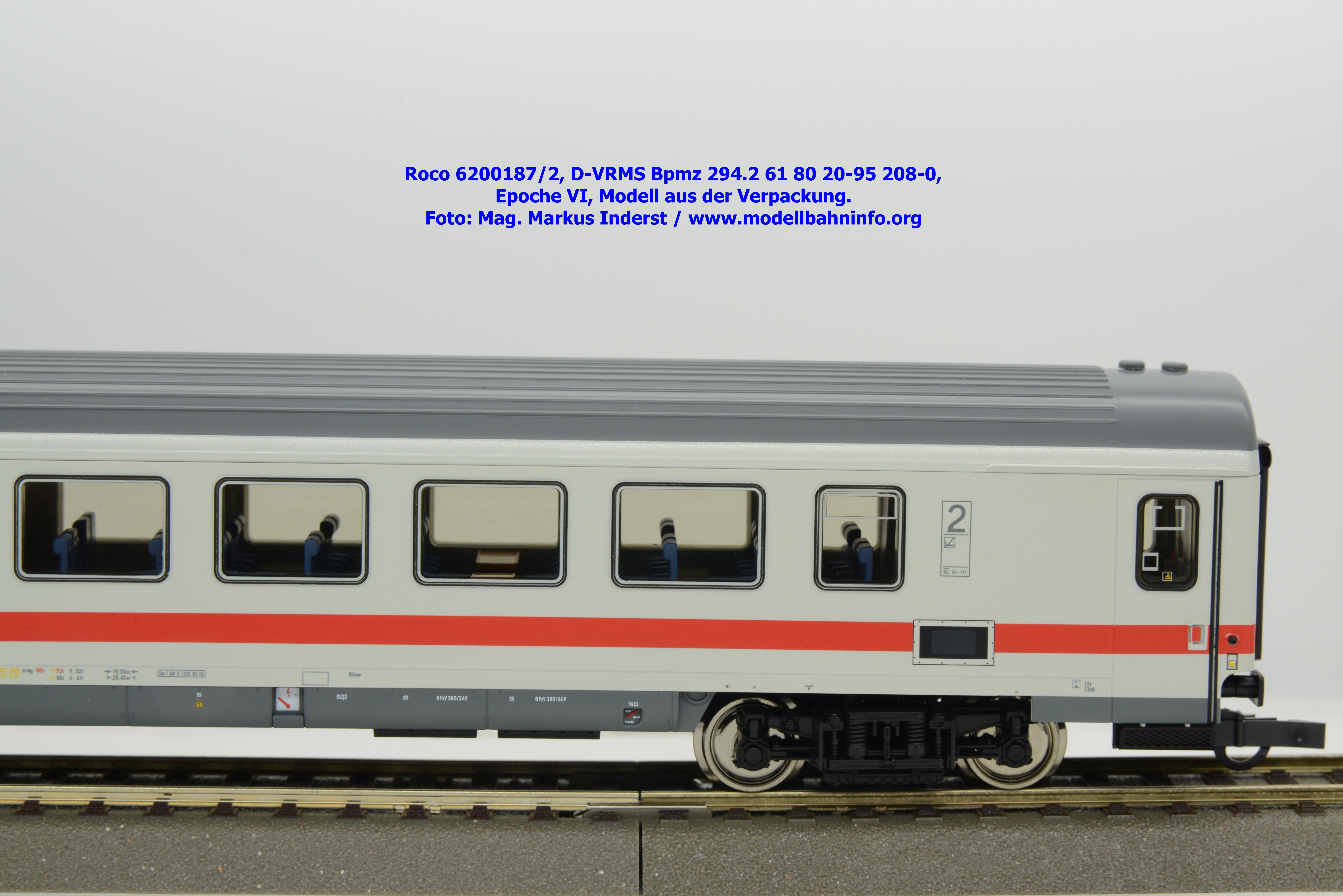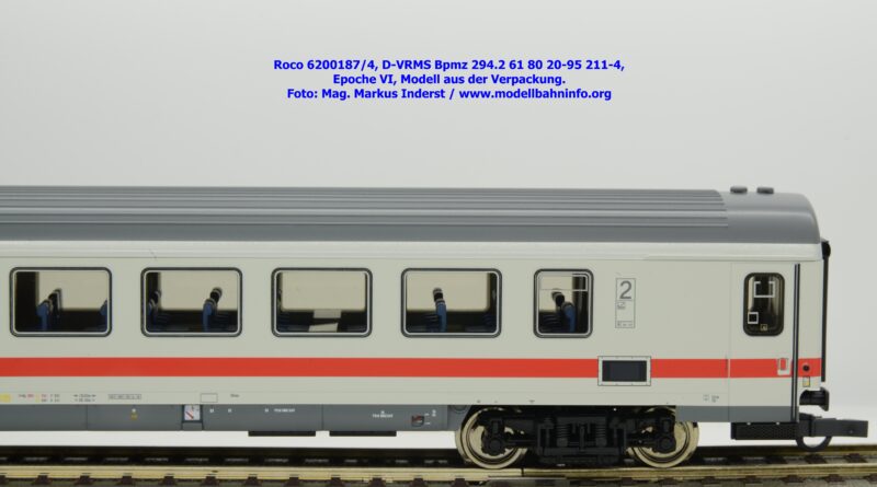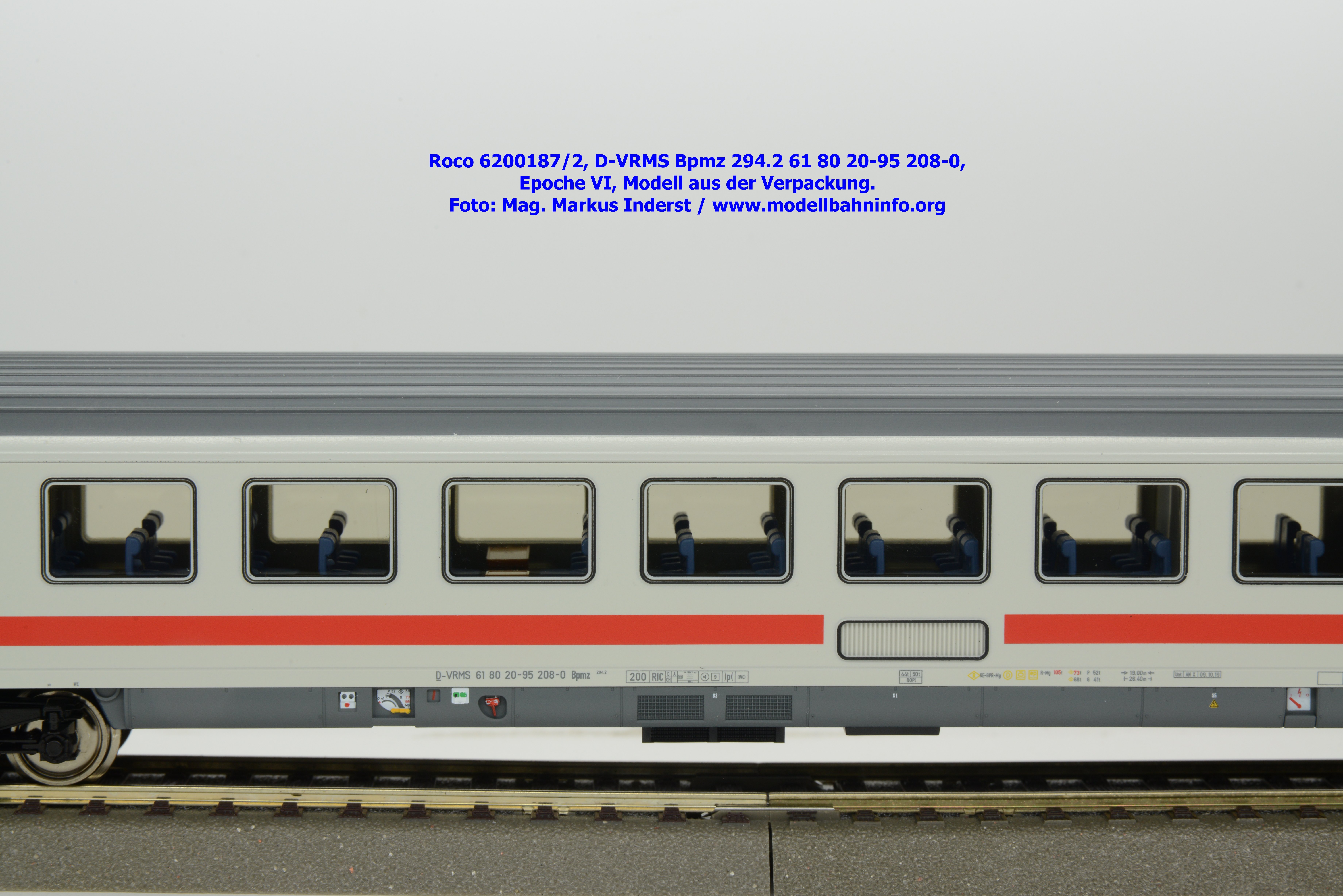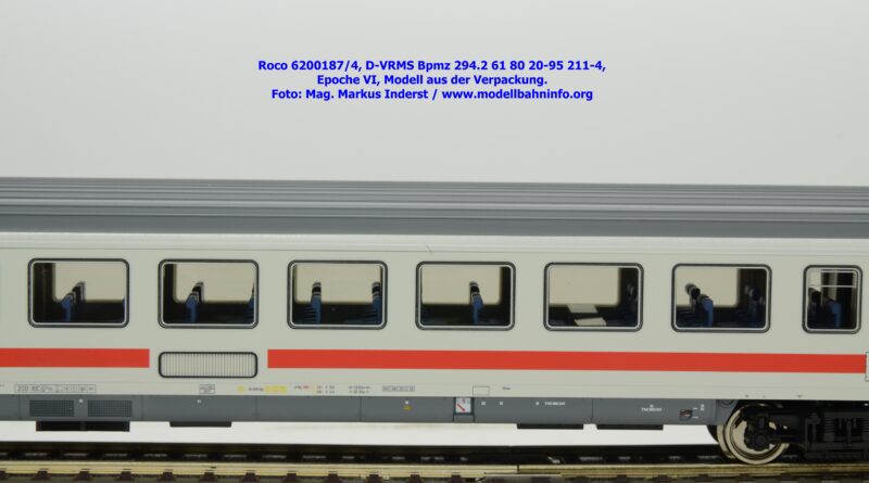 Dieses und die beiden weiteren Modelle gehören der Bauartbezeichnung Bpmz 294.2 an. Dieses Modell ist mit der Wagennummer 61 80 20-95 208-0 beschriftet, die Halterkennung ist wiederum D-VRMS. Im Revisionsraster stehen die Untersuchungsdaten Unt AN X 09.10.19.