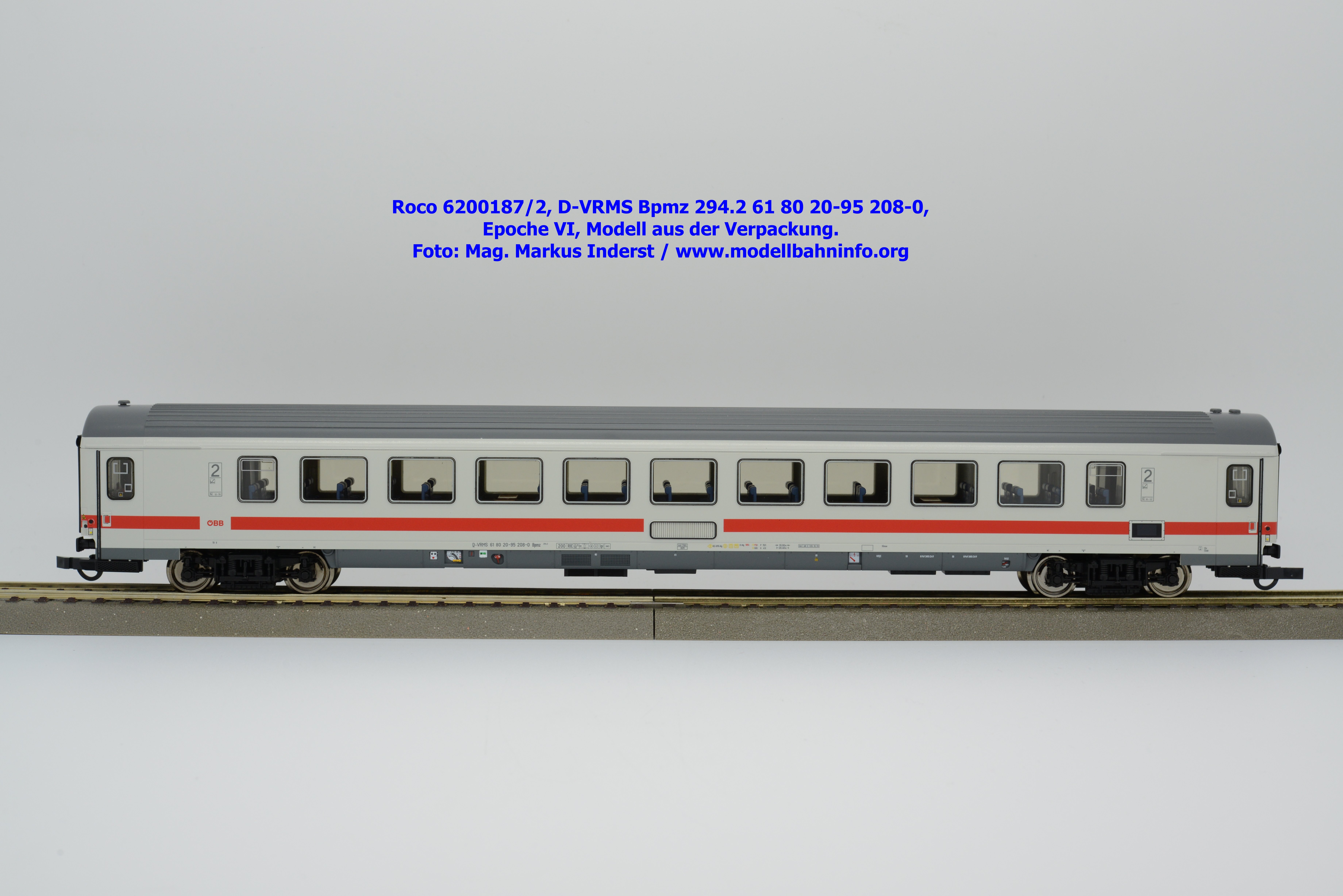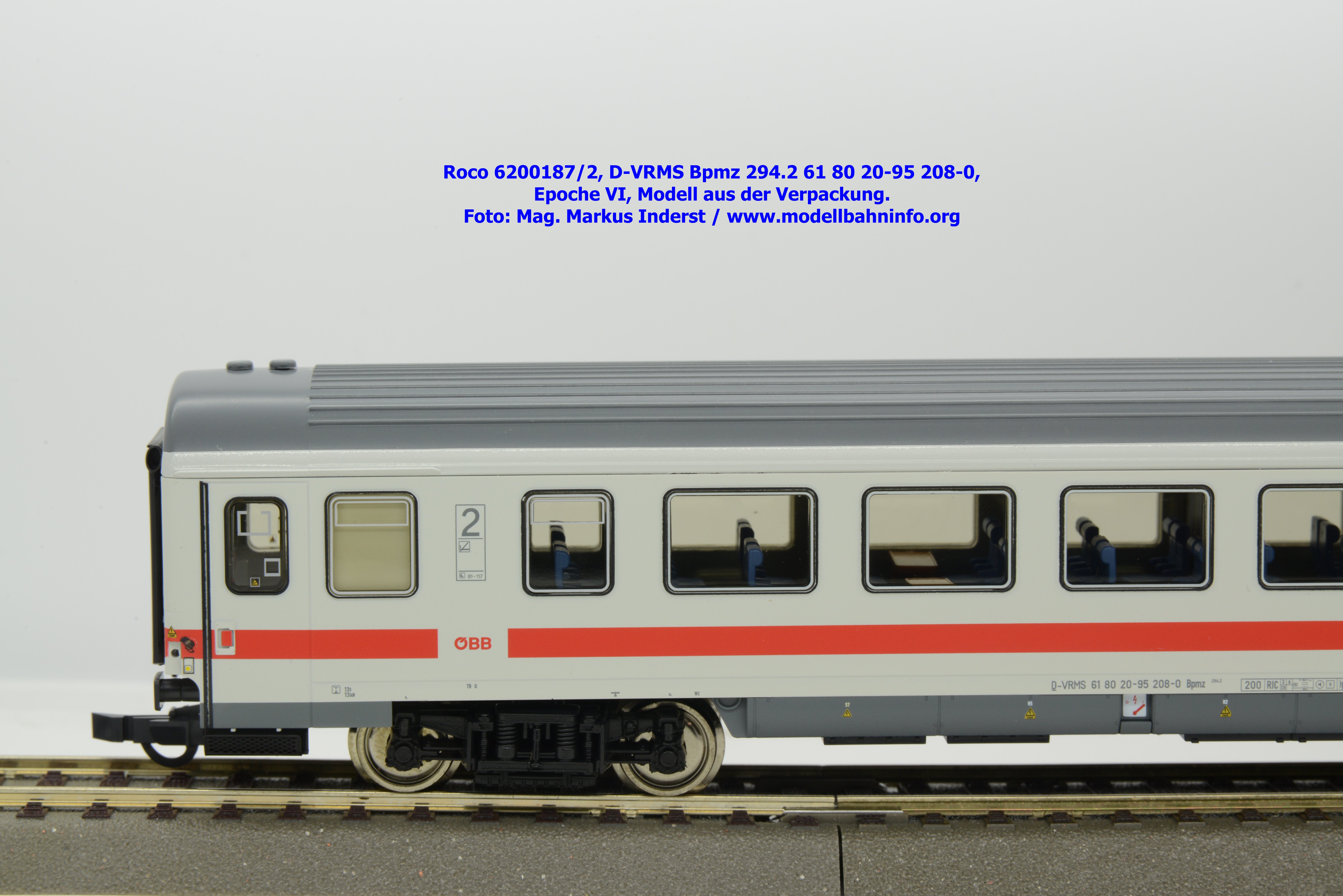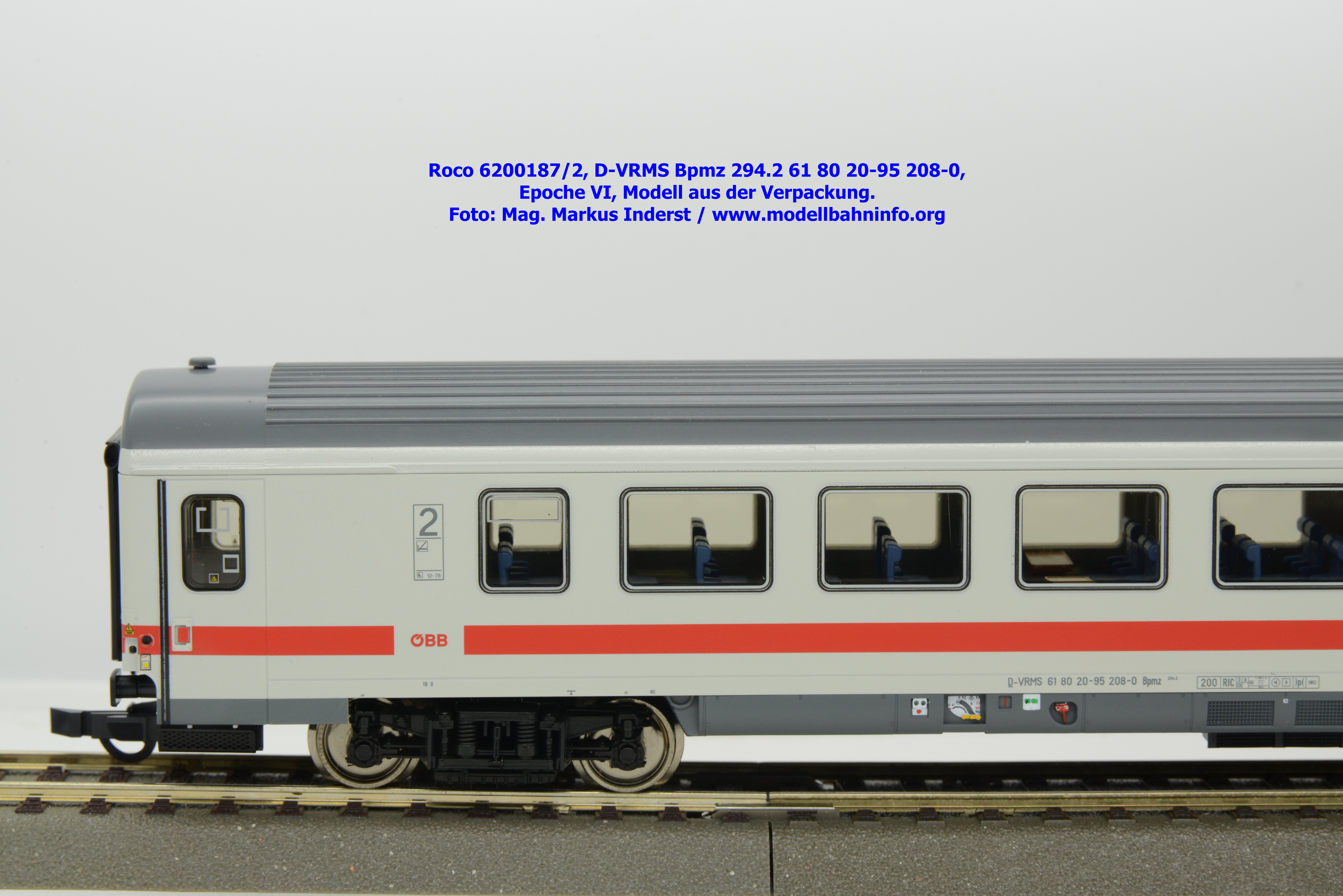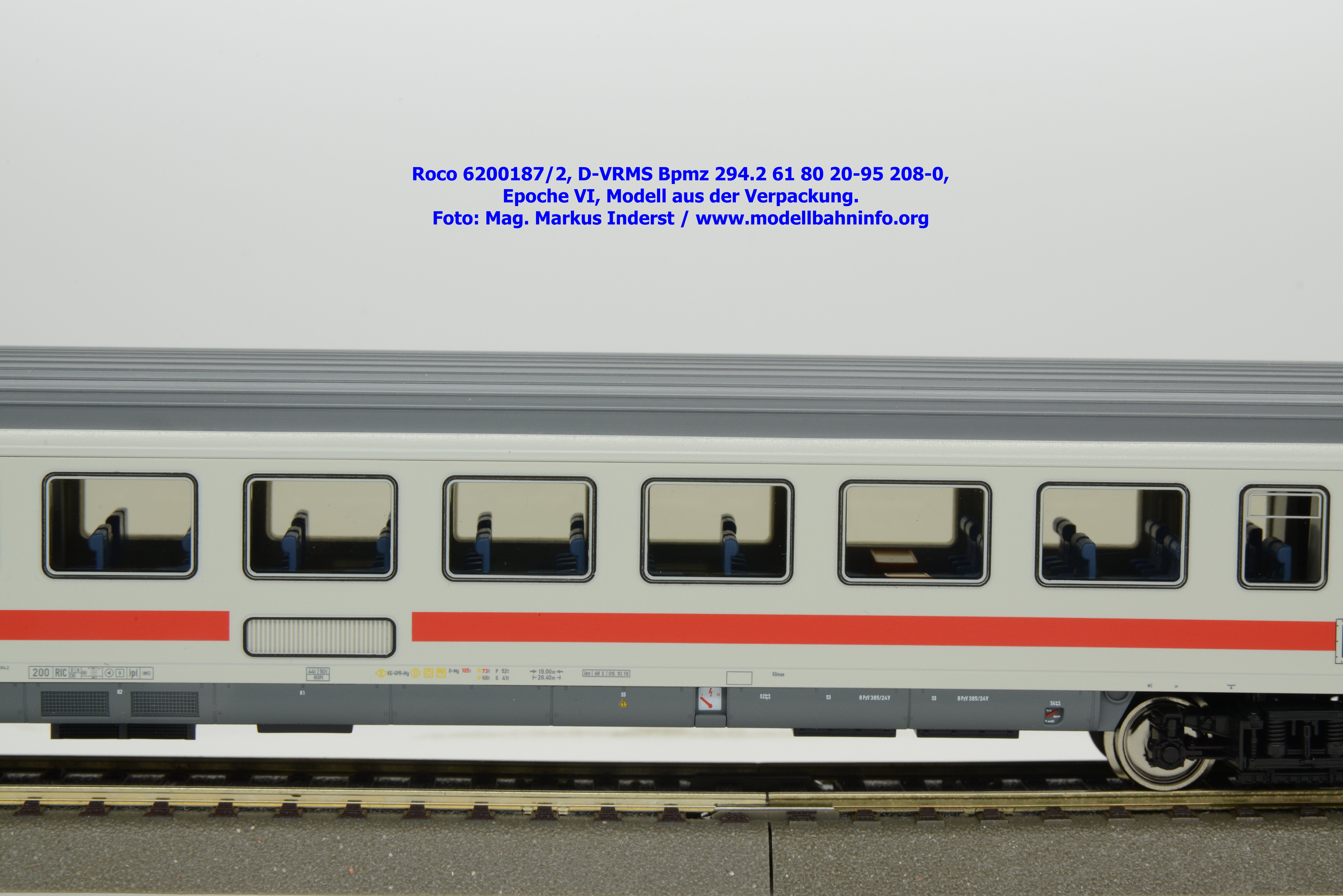 Dieses und die beiden weiteren Modelle gehören der Bauartbezeichnung Bpmz 294.2 an. Dieses Modell ist mit der Wagennummer 61 80 20-95 208-0 beschriftet, die Halterkennung ist wiederum D-VRMS. Im Revisionsraster stehen die Untersuchungsdaten Unt AN X 09.10.19.