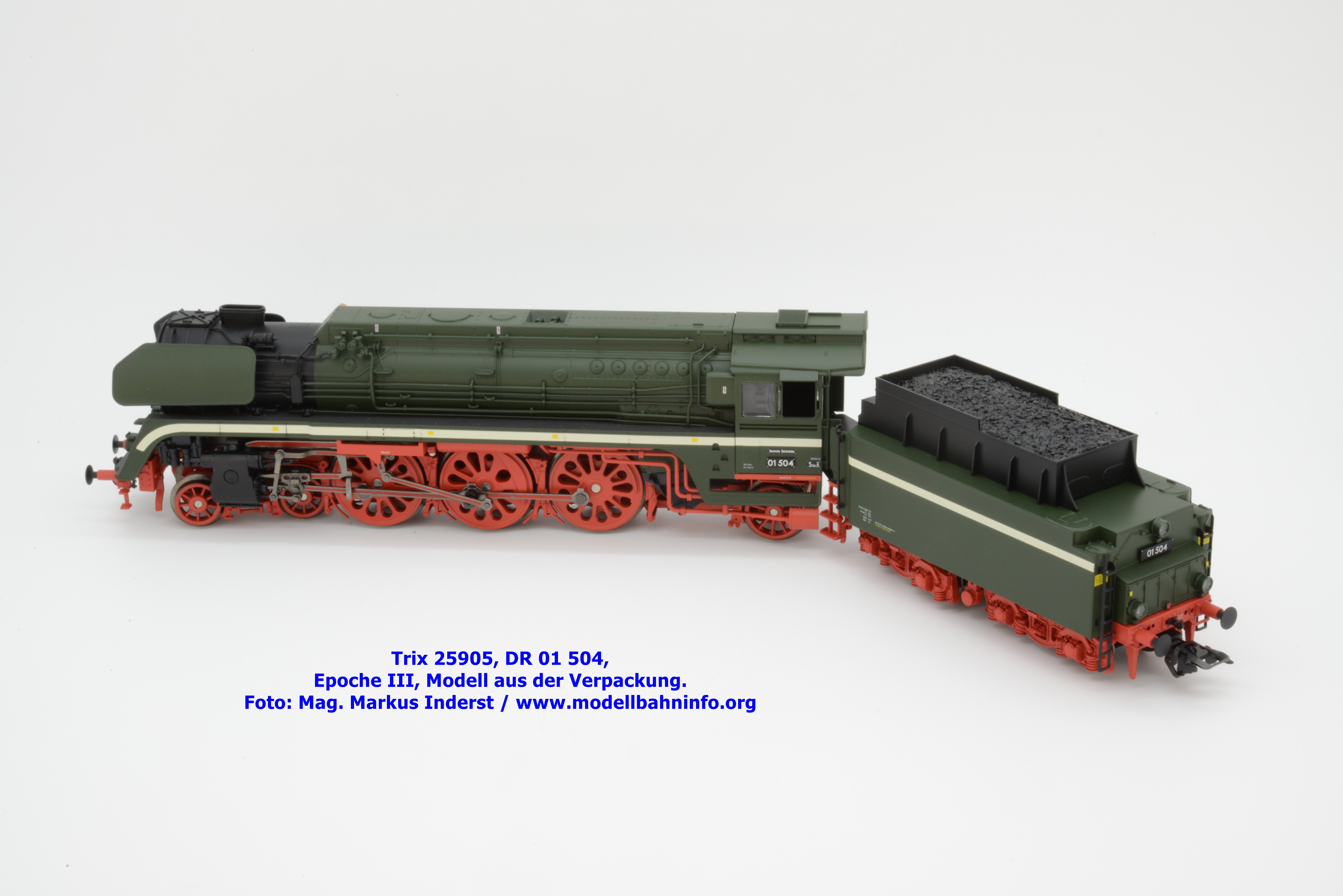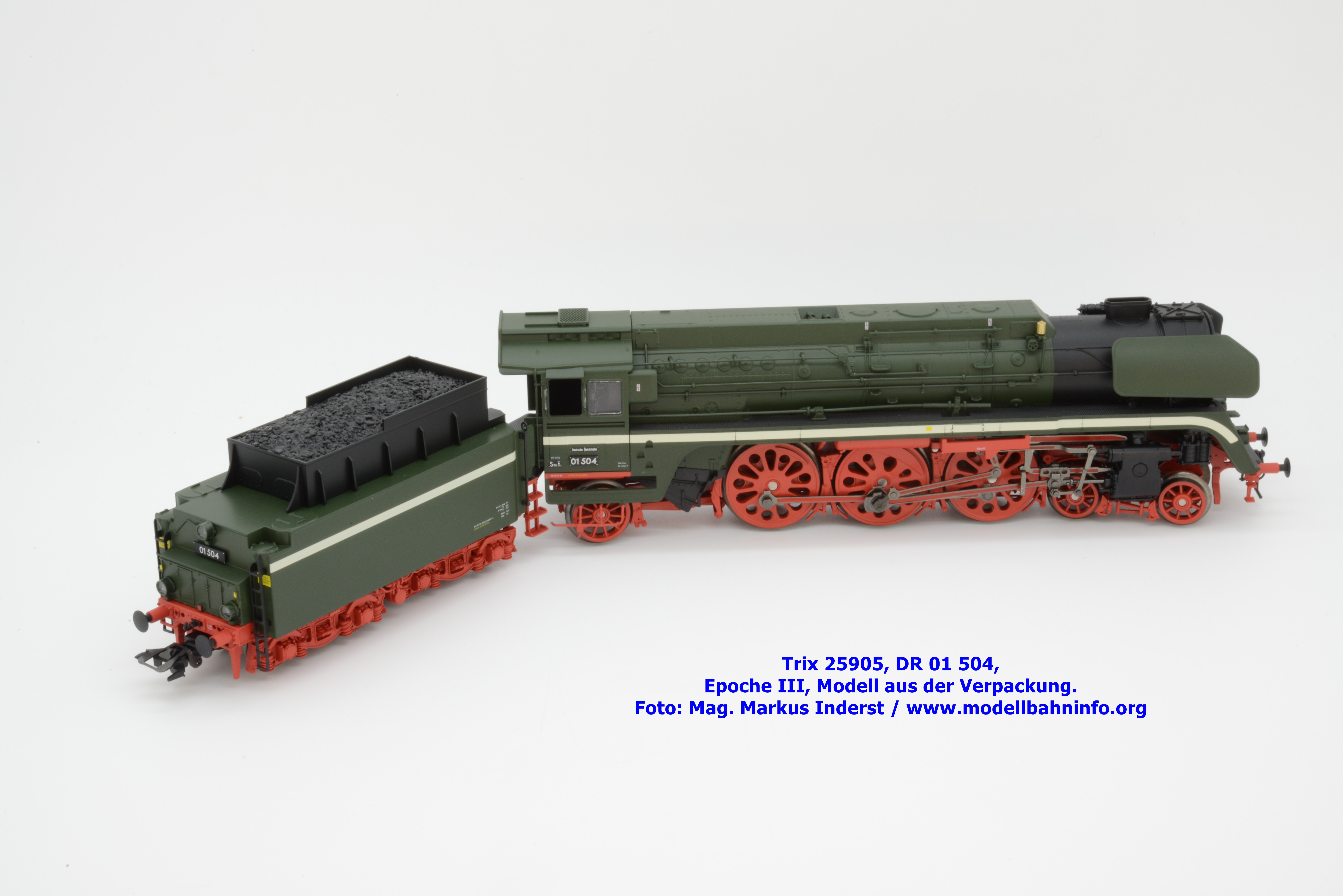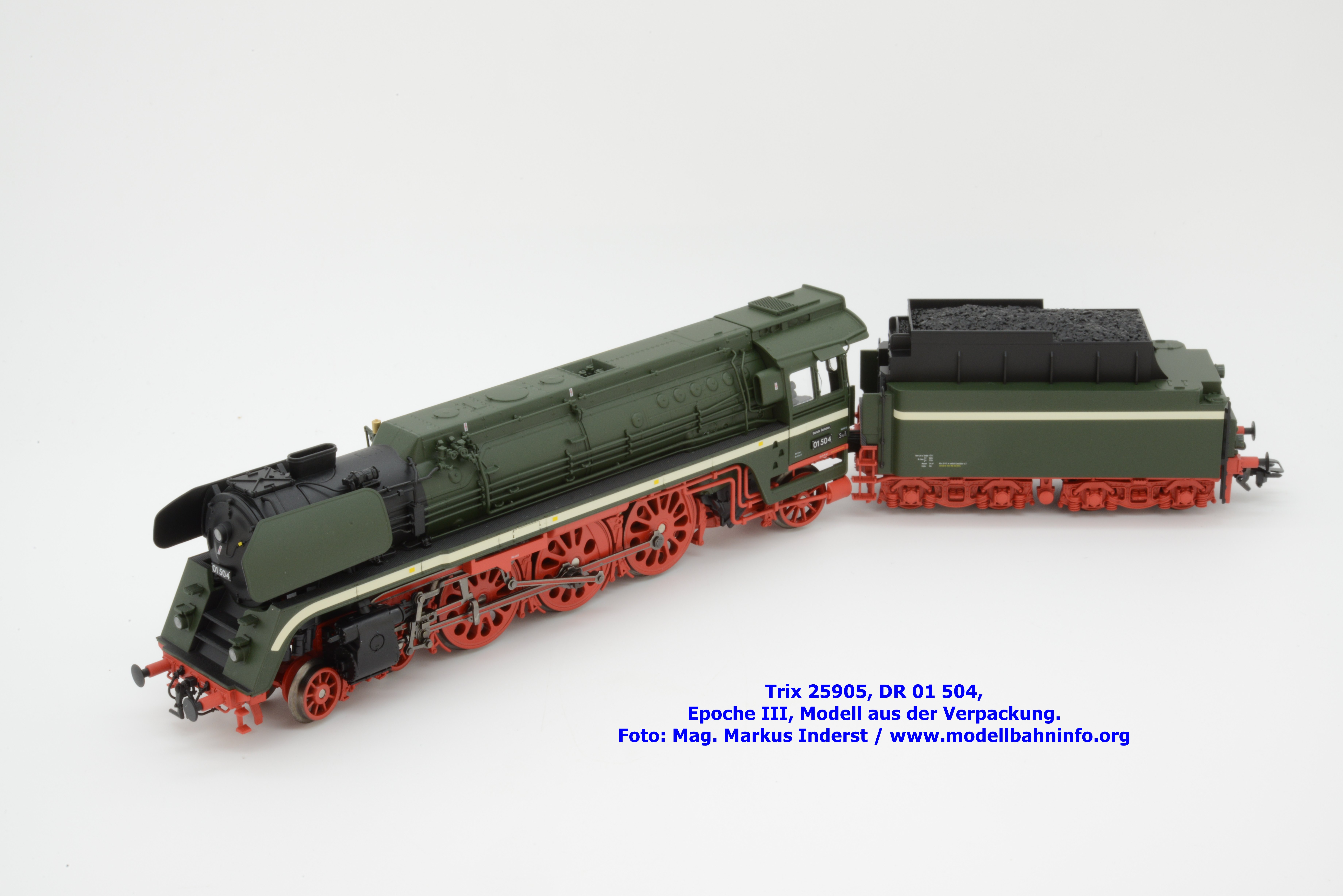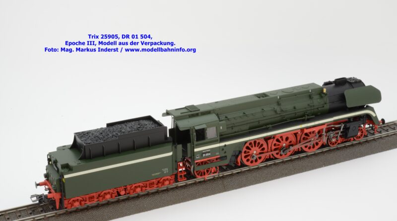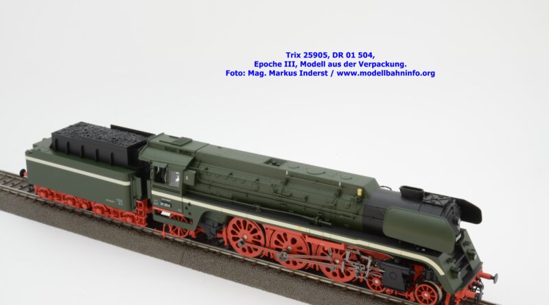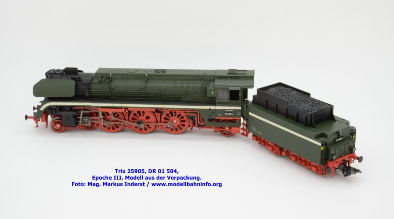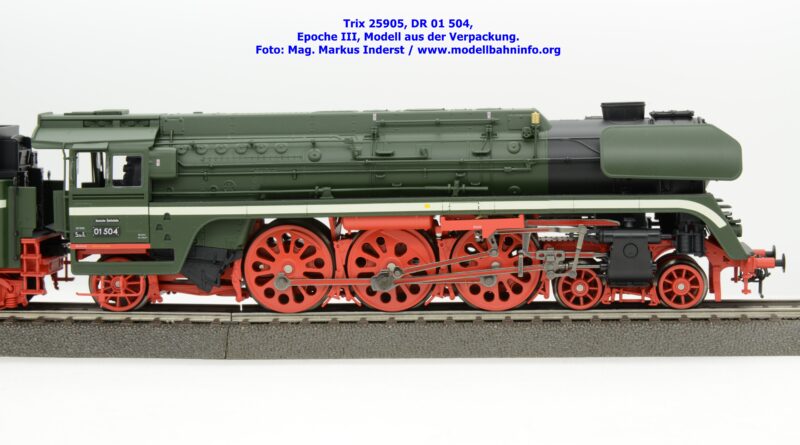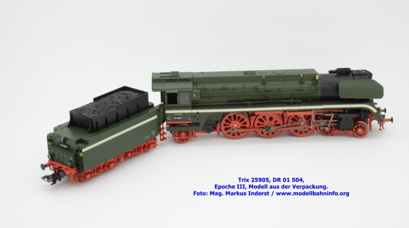 Märklin/Trix produziert nach längerer Pause wiederum eine DR-Dampflok der Baureihe 01.5. Der Hersteller hat sich diesmal für die Modellausführung mit den Boxpok-Rädern entschieden, welche einige der Reko 01.5 erhalten haben. Die Farbgebung stellt eine weitere Besonderheit bei diesem Modell der als 01 504 beschrifteten Lokomotive dar, die in grüner Farbgebung und mit einem weißen Zierstreifen über Lokrahmen und Tender – analog zur den DR-Schnellfahrloks wie 18 201 oder 18 314 – ausgeführt ist. Des weiteren verfügt das Modell über eine durchgehende Domverkleidung samt Giesl-Ejektor und verschlossene Umlaufbleche. Als Tender wurde die Bauart 2′ 2′ T34 mit Kohlekasten verwendet. Ansonsten sind beim technischen Teil keine Abweichungen zu erkennen. Das gegenständliche Modell ist jedoch mit einem Decoder neuerer Bauart ausgestattet, welcher RailCom fähig ist und mit den Datenformaten DCC bzw. mfx zurecht kommt. Die Beschilderung der Lok ist teilweise mit extra angesetzten Teilen versehen worden. Die 01 504 ist beim Bw Erfurt-P in der Rbd. Erfurt beheimatet. Die Untersuchungsdaten werden mit den Angaben „Letzte Br. Unt Mei 30. 9.64“ angegeben. Das Modell ist als Zweileiter-Gleichstrom-Modell bei Trix unter der oben angeführten Artikelnummer zum UVP von € 549,– erhältlich. Die Dreileiter-Wechselstrom-Ausführung wird unter der Märklin-Artikelnummer 38205 geführt.