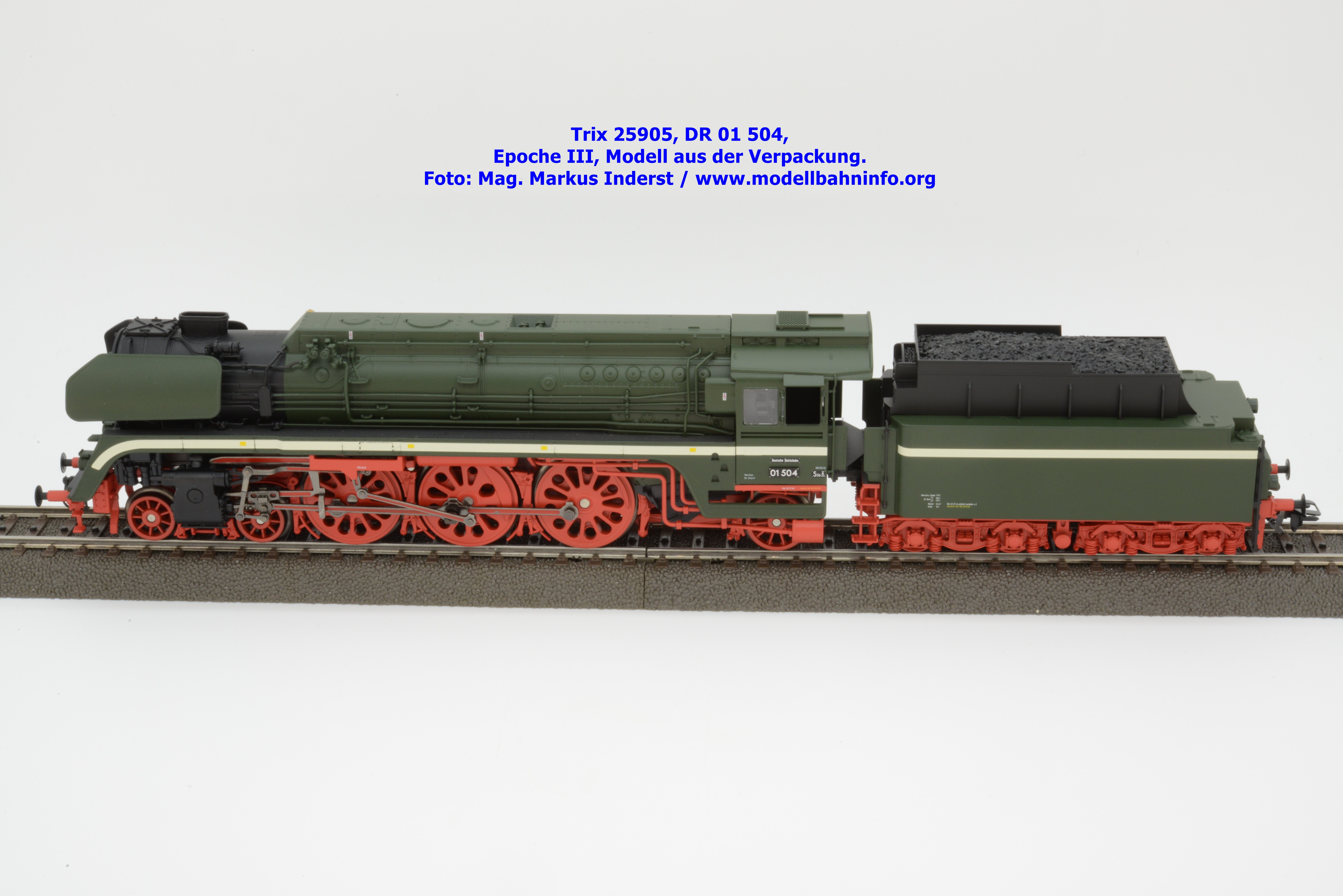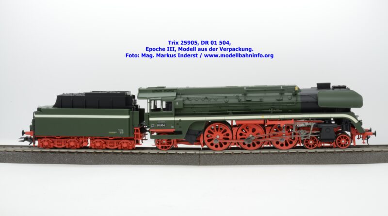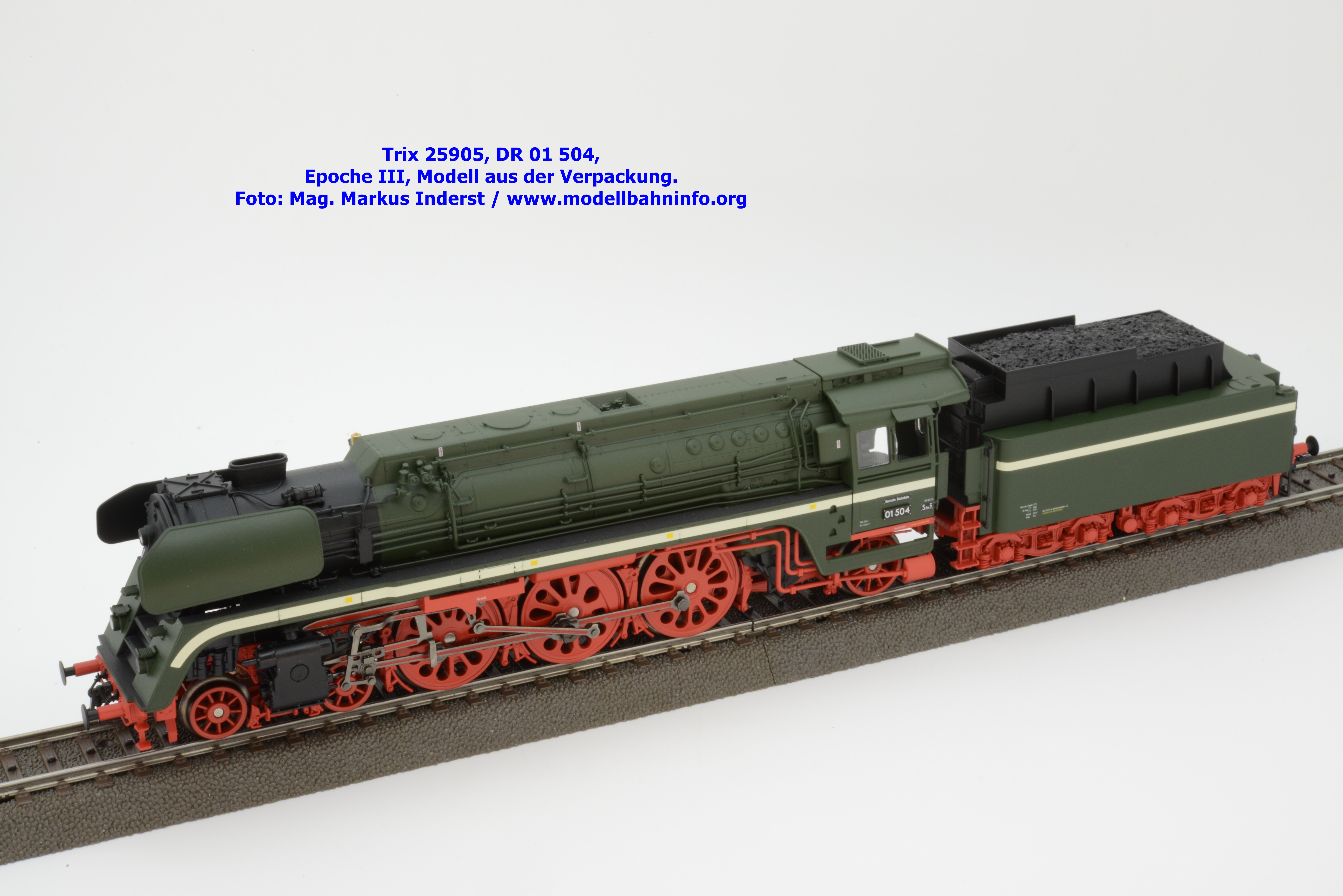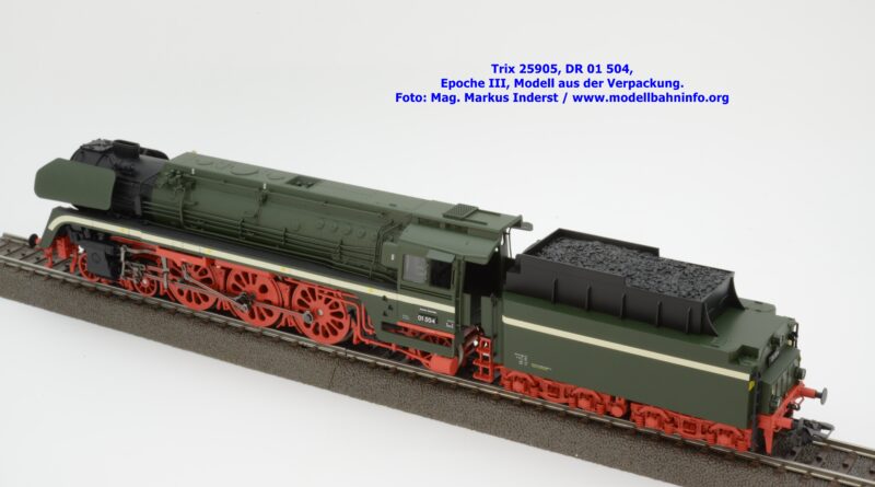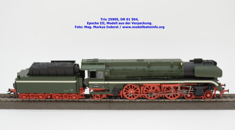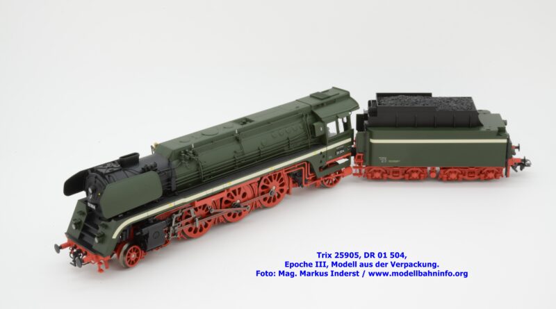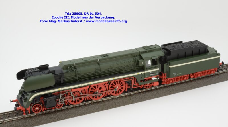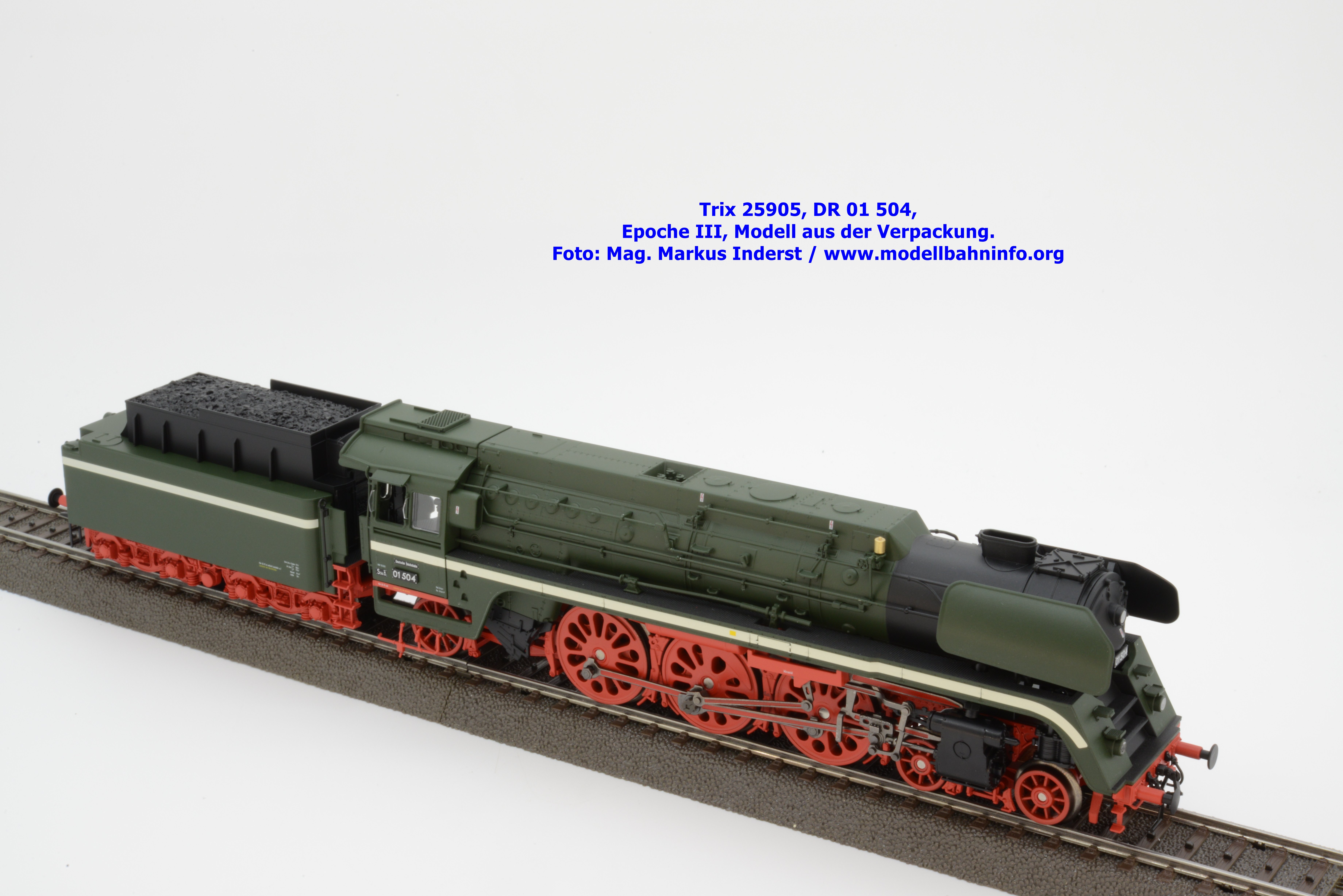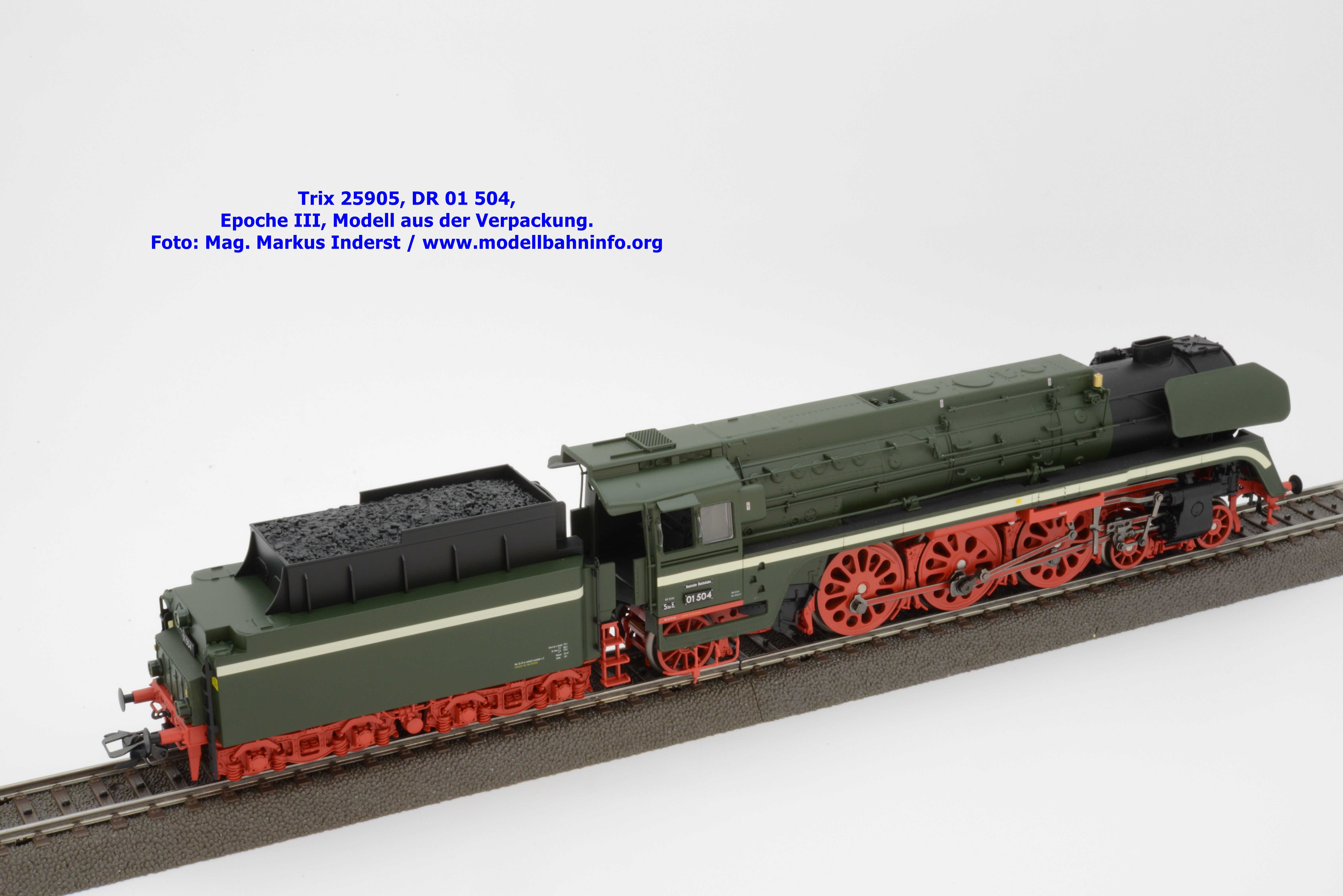 Märklin/Trix produziert nach längerer Pause wiederum eine DR-Dampflok der Baureihe 01.5. Der Hersteller hat sich diesmal für die Modellausführung mit den Boxpok-Rädern entschieden, welche einige der Reko 01.5 erhalten haben. Die Farbgebung stellt eine weitere Besonderheit bei diesem Modell der als 01 504 beschrifteten Lokomotive dar, die in grüner Farbgebung und mit einem weißen Zierstreifen über Lokrahmen und Tender – analog zur den DR-Schnellfahrloks wie 18 201 oder 18 314 – ausgeführt ist. Des weiteren verfügt das Modell über eine durchgehende Domverkleidung samt Giesl-Ejektor und verschlossene Umlaufbleche. Als Tender wurde die Bauart 2′ 2′ T34 mit Kohlekasten verwendet. Ansonsten sind beim technischen Teil keine Abweichungen zu erkennen. Das gegenständliche Modell ist jedoch mit einem Decoder neuerer Bauart ausgestattet, welcher RailCom fähig ist und mit den Datenformaten DCC bzw. mfx zurecht kommt. Die Beschilderung der Lok ist teilweise mit extra angesetzten Teilen versehen worden. Die 01 504 ist beim Bw Erfurt-P in der Rbd. Erfurt beheimatet. Die Untersuchungsdaten werden mit den Angaben „Letzte Br. Unt Mei 30. 9.64“ angegeben. Das Modell ist als Zweileiter-Gleichstrom-Modell bei Trix unter der oben angeführten Artikelnummer zum UVP von € 549,– erhältlich. Die Dreileiter-Wechselstrom-Ausführung wird unter der Märklin-Artikelnummer 38205 geführt.