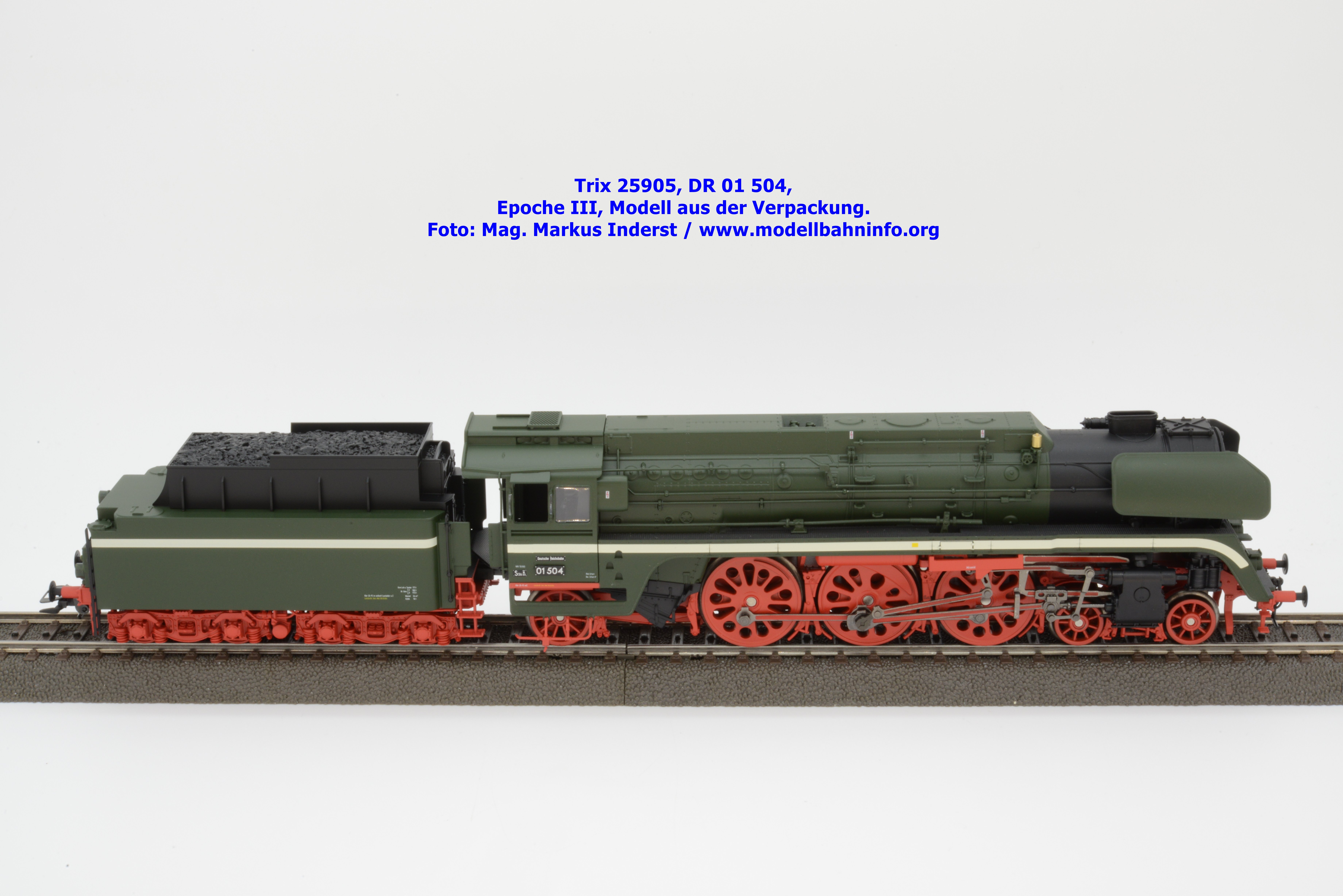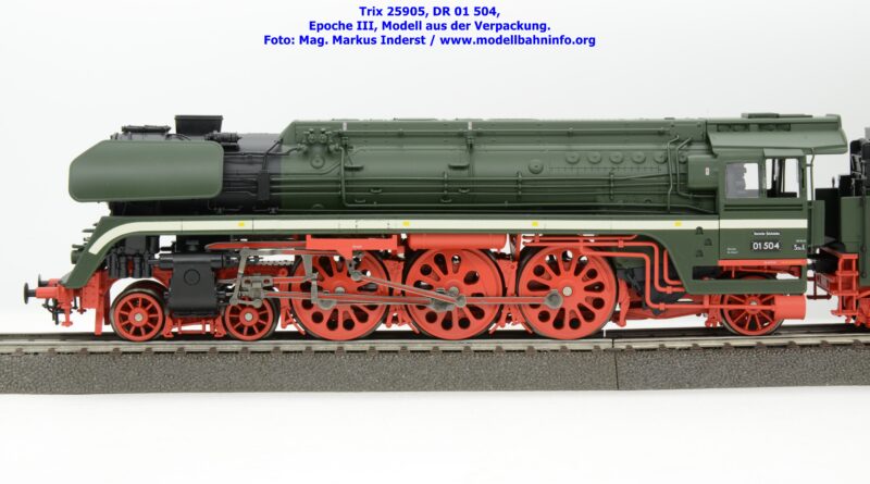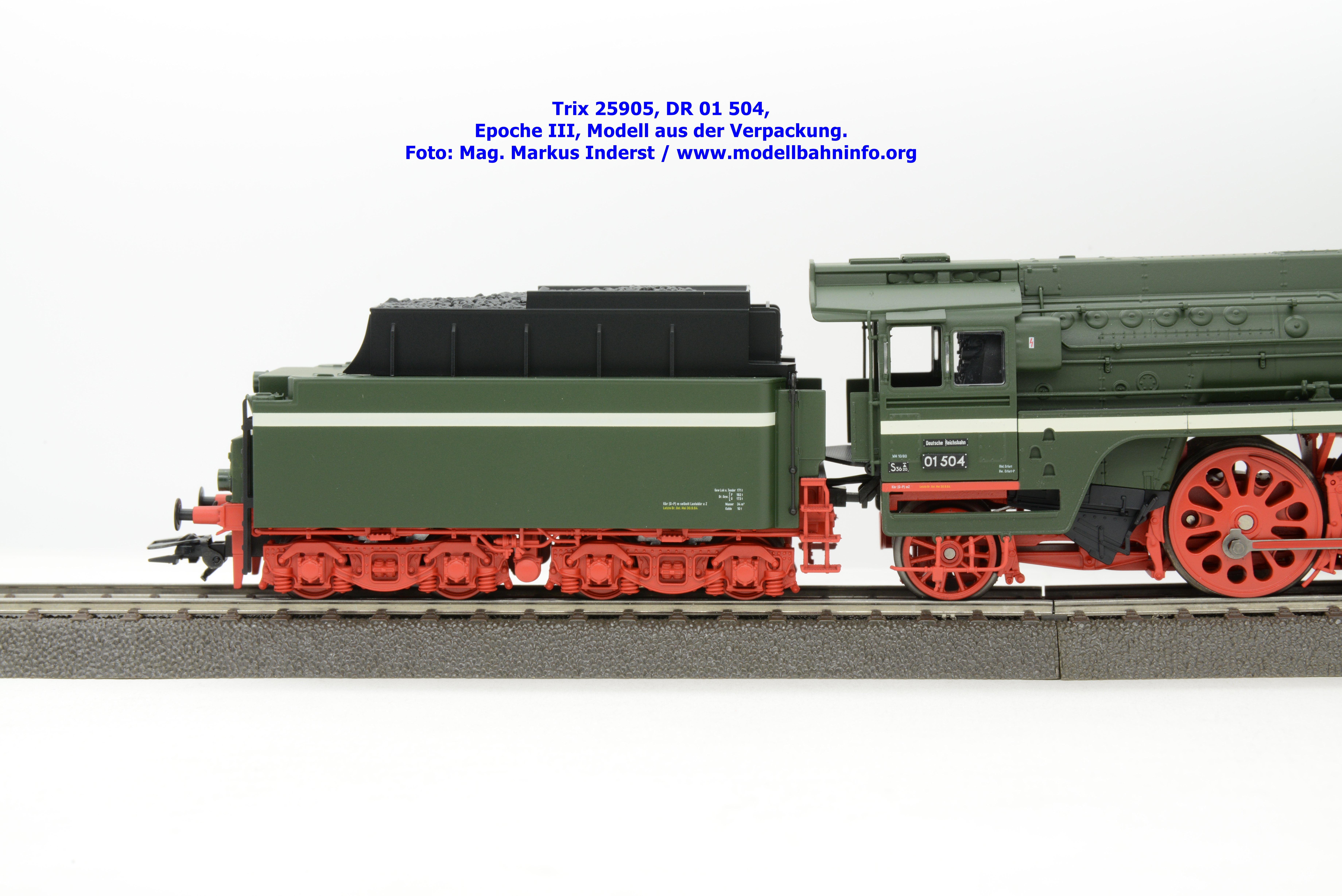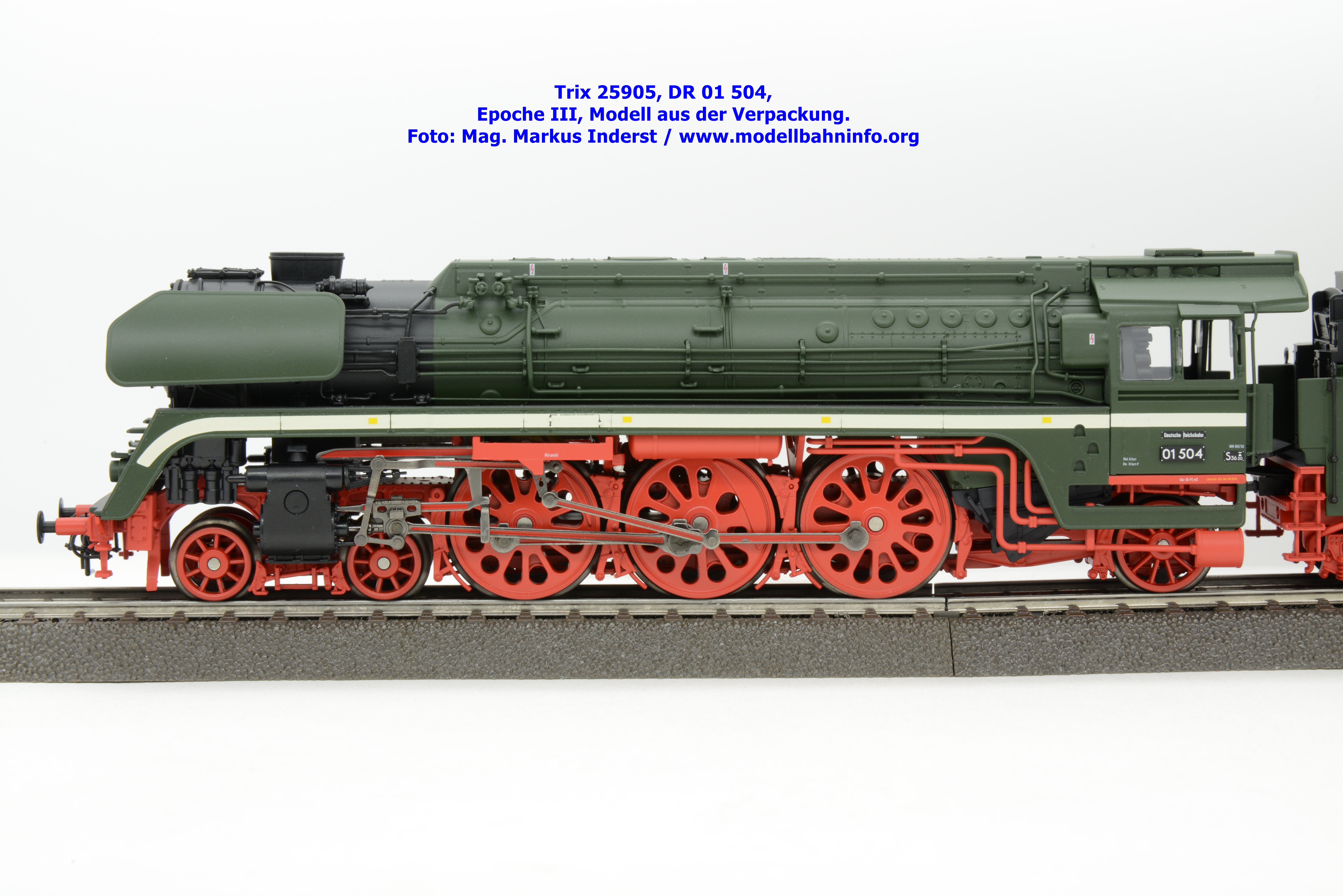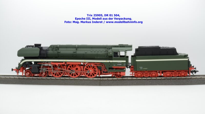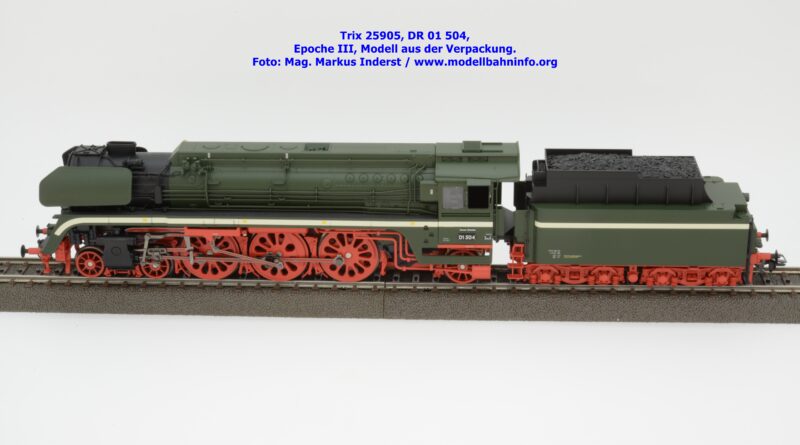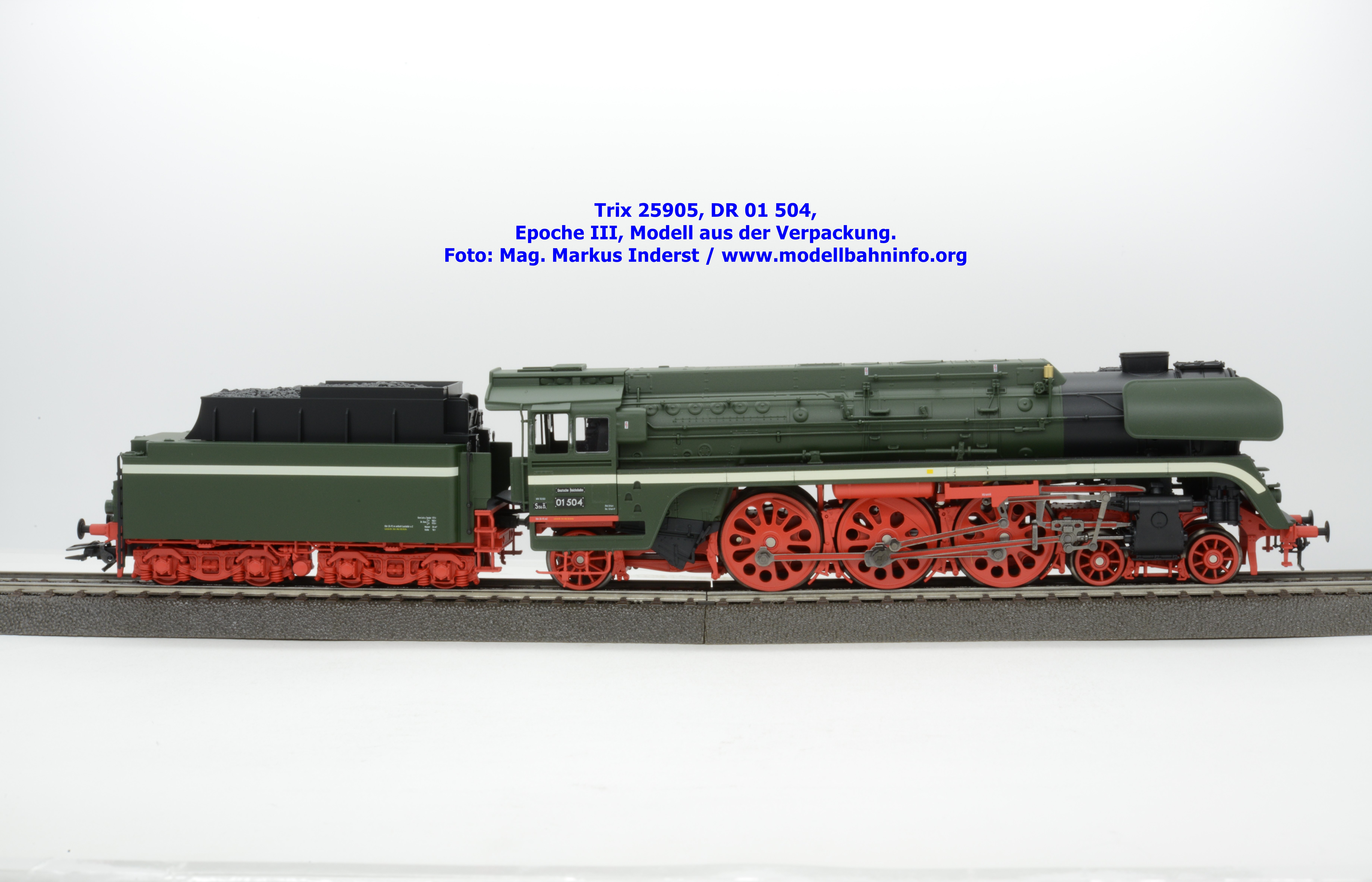 Märklin/Trix produziert nach längerer Pause wiederum eine DR-Dampflok der Baureihe 01.5. Der Hersteller hat sich diesmal für die Modellausführung mit den Boxpok-Rädern entschieden, welche einige der Reko 01.5 erhalten haben. Die Farbgebung stellt eine weitere Besonderheit bei diesem Modell der als 01 504 beschrifteten Lokomotive dar, die in grüner Farbgebung und mit einem weißen Zierstreifen über Lokrahmen und Tender – analog zur den DR-Schnellfahrloks wie 18 201 oder 18 314 – ausgeführt ist. Des weiteren verfügt das Modell über eine durchgehende Domverkleidung samt Giesl-Ejektor und verschlossene Umlaufbleche. Als Tender wurde die Bauart 2′ 2′ T34 mit Kohlekasten verwendet. Ansonsten sind beim technischen Teil keine Abweichungen zu erkennen. Das gegenständliche Modell ist jedoch mit einem Decoder neuerer Bauart ausgestattet, welcher RailCom fähig ist und mit den Datenformaten DCC bzw. mfx zurecht kommt. Die Beschilderung der Lok ist teilweise mit extra angesetzten Teilen versehen worden. Die 01 504 ist beim Bw Erfurt-P in der Rbd. Erfurt beheimatet. Die Untersuchungsdaten werden mit den Angaben „Letzte Br. Unt Mei 30. 9.64“ angegeben. Das Modell ist als Zweileiter-Gleichstrom-Modell bei Trix unter der oben angeführten Artikelnummer zum UVP von € 549,– erhältlich. Die Dreileiter-Wechselstrom-Ausführung wird unter der Märklin-Artikelnummer 38205 geführt.
