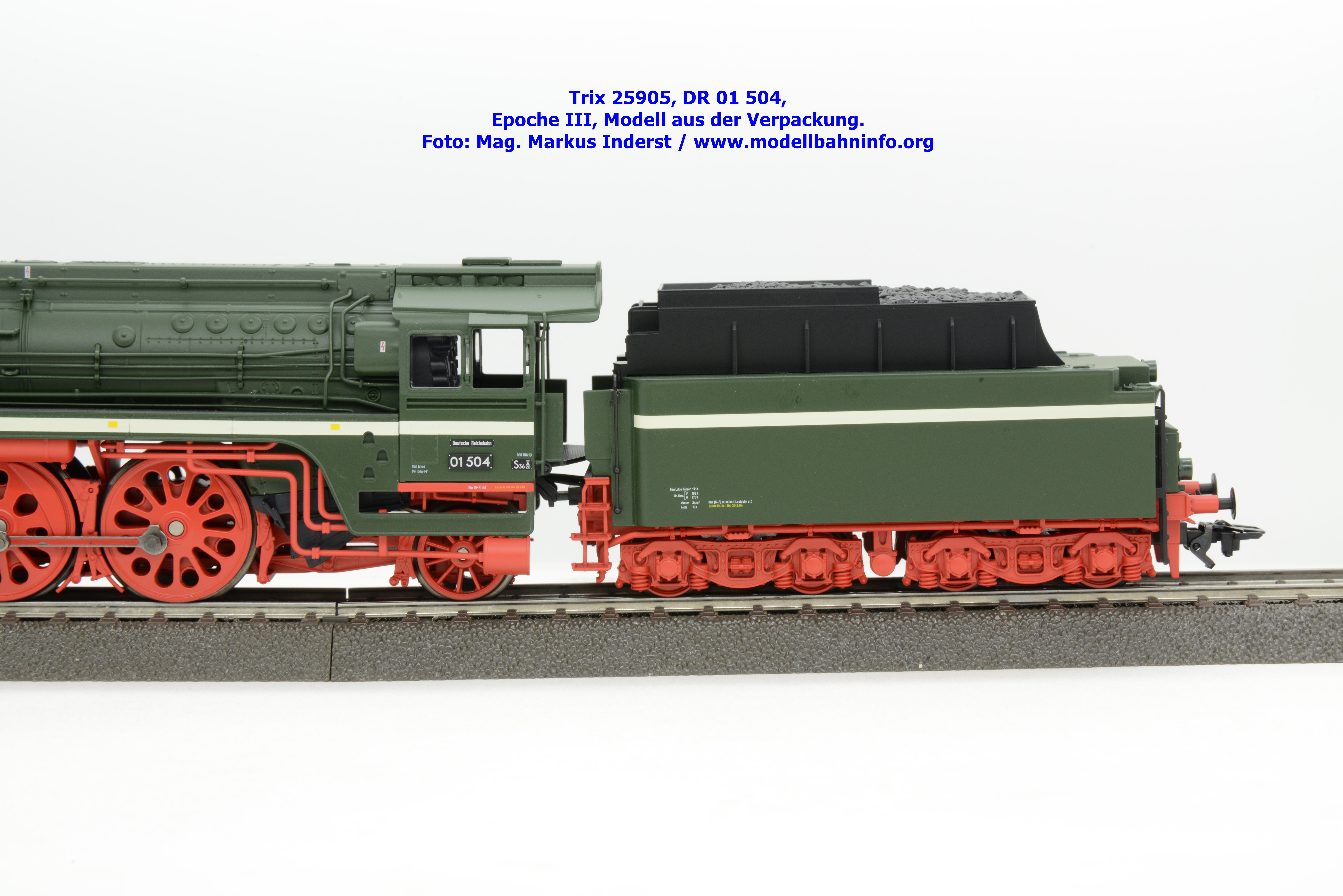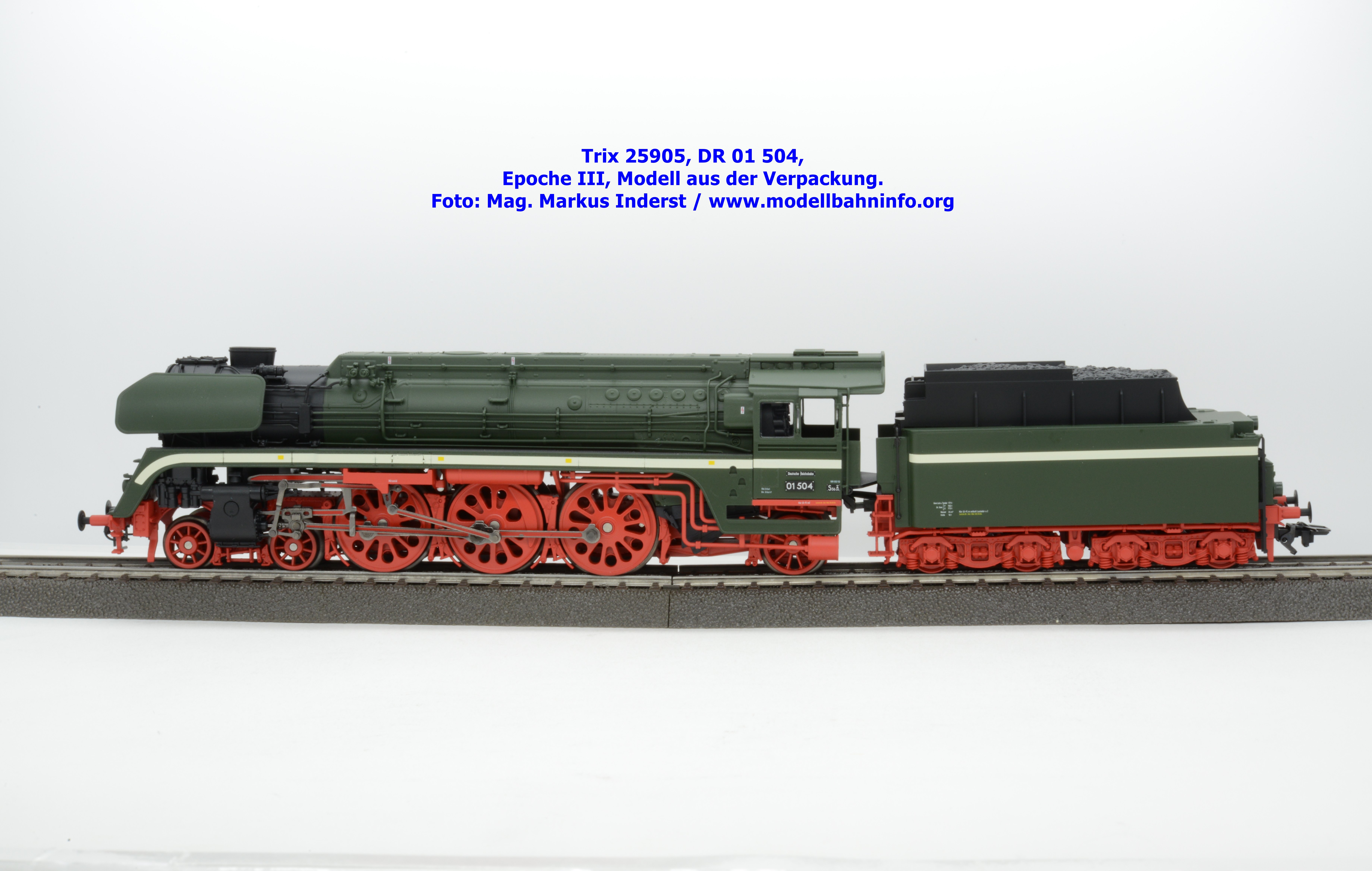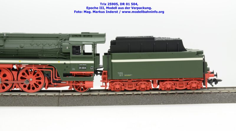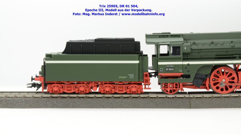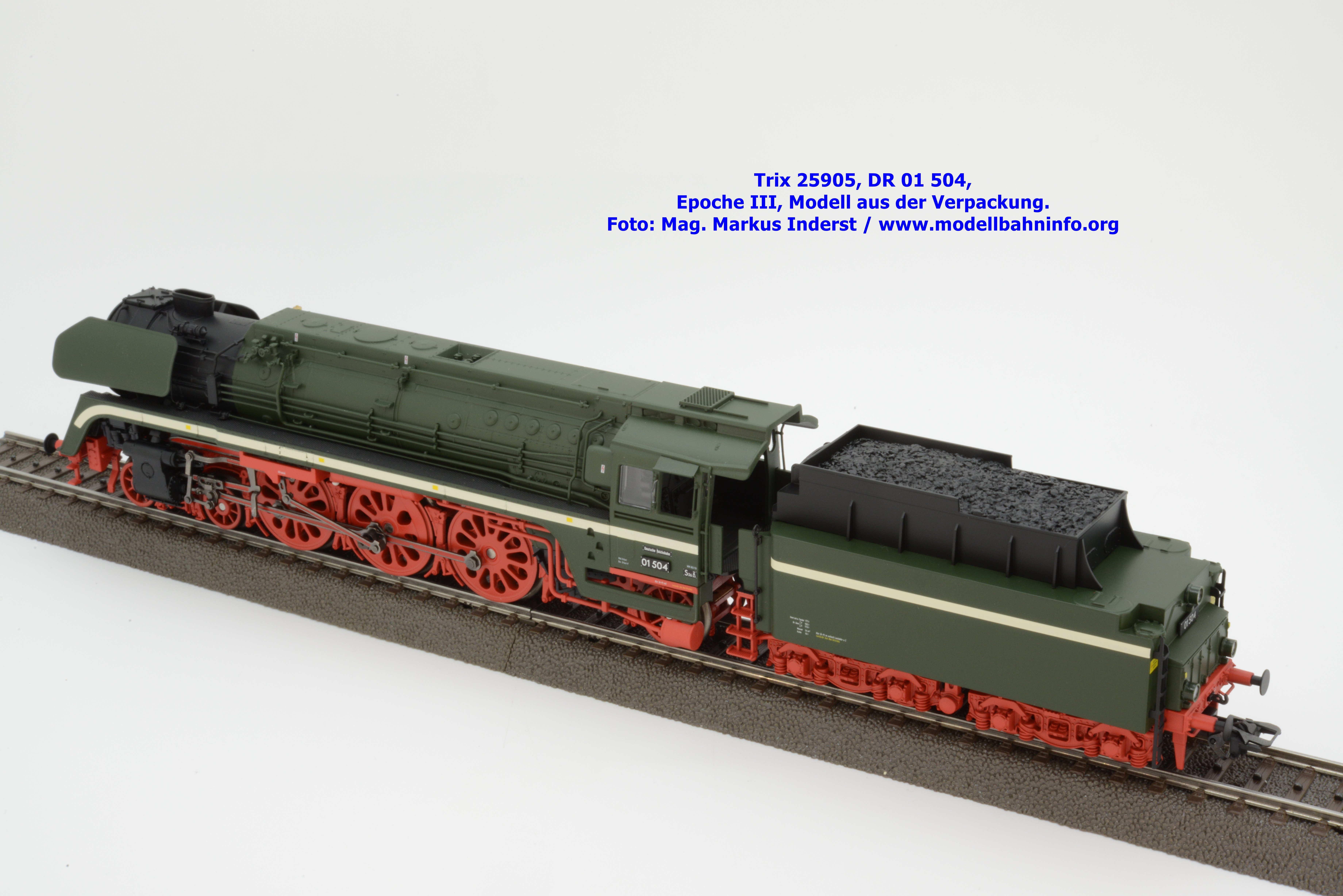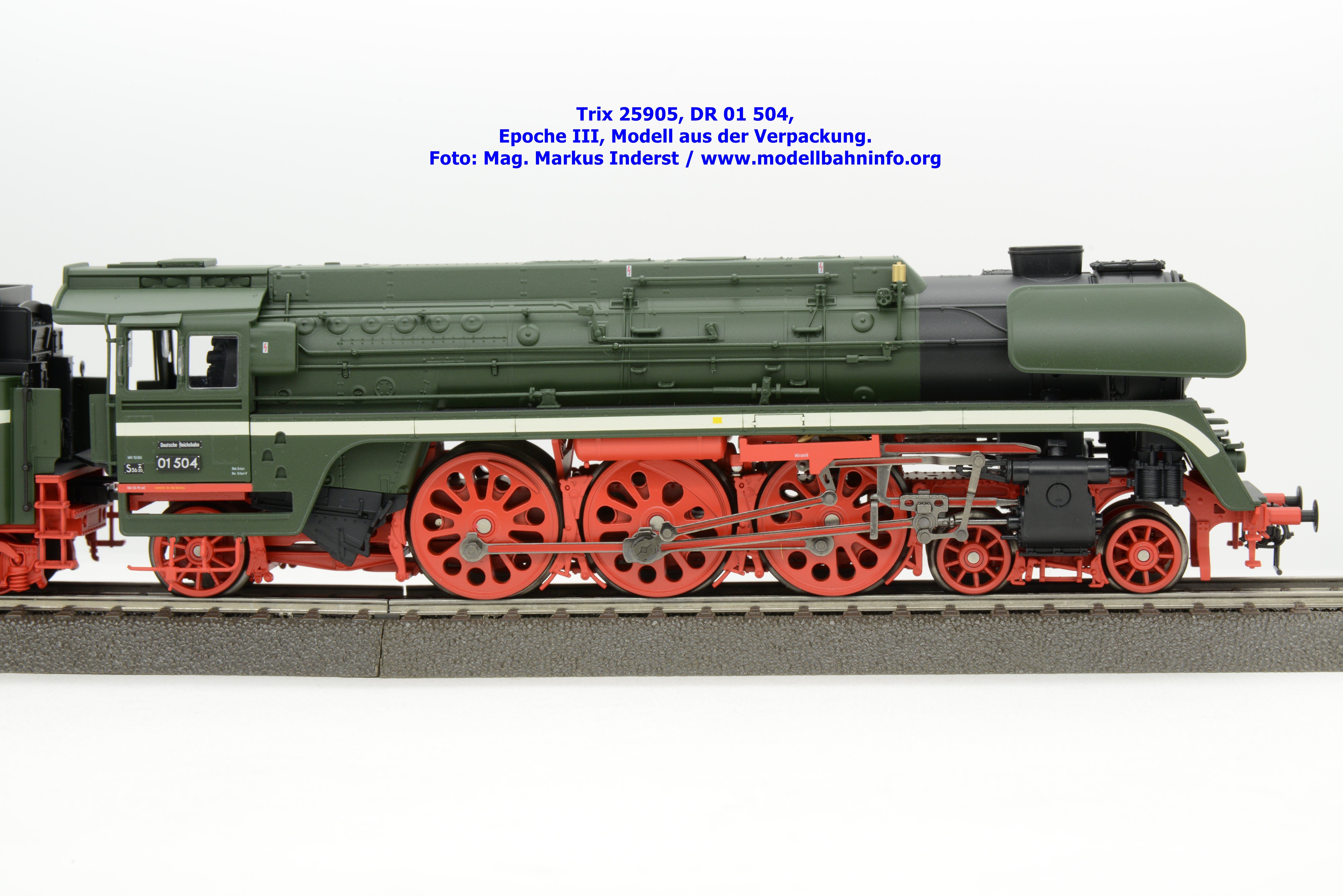 Märklin/Trix produziert nach längerer Pause wiederum eine DR-Dampflok der Baureihe 01.5. Der Hersteller hat sich diesmal für die Modellausführung mit den Boxpok-Rädern entschieden, welche einige der Reko 01.5 erhalten haben. Die Farbgebung stellt eine weitere Besonderheit bei diesem Modell der als 01 504 beschrifteten Lokomotive dar, die in grüner Farbgebung und mit einem weißen Zierstreifen über Lokrahmen und Tender – analog zur den DR-Schnellfahrloks wie 18 201 oder 18 314 – ausgeführt ist. Des weiteren verfügt das Modell über eine durchgehende Domverkleidung samt Giesl-Ejektor und verschlossene Umlaufbleche. Als Tender wurde die Bauart 2′ 2′ T34 mit Kohlekasten verwendet. Ansonsten sind beim technischen Teil keine Abweichungen zu erkennen. Das gegenständliche Modell ist jedoch mit einem Decoder neuerer Bauart ausgestattet, welcher RailCom fähig ist und mit den Datenformaten DCC bzw. mfx zurecht kommt. Die Beschilderung der Lok ist teilweise mit extra angesetzten Teilen versehen worden. Die 01 504 ist beim Bw Erfurt-P in der Rbd. Erfurt beheimatet. Die Untersuchungsdaten werden mit den Angaben „Letzte Br. Unt Mei 30. 9.64“ angegeben. Das Modell ist als Zweileiter-Gleichstrom-Modell bei Trix unter der oben angeführten Artikelnummer zum UVP von € 549,– erhältlich. Die Dreileiter-Wechselstrom-Ausführung wird unter der Märklin-Artikelnummer 38205 geführt.