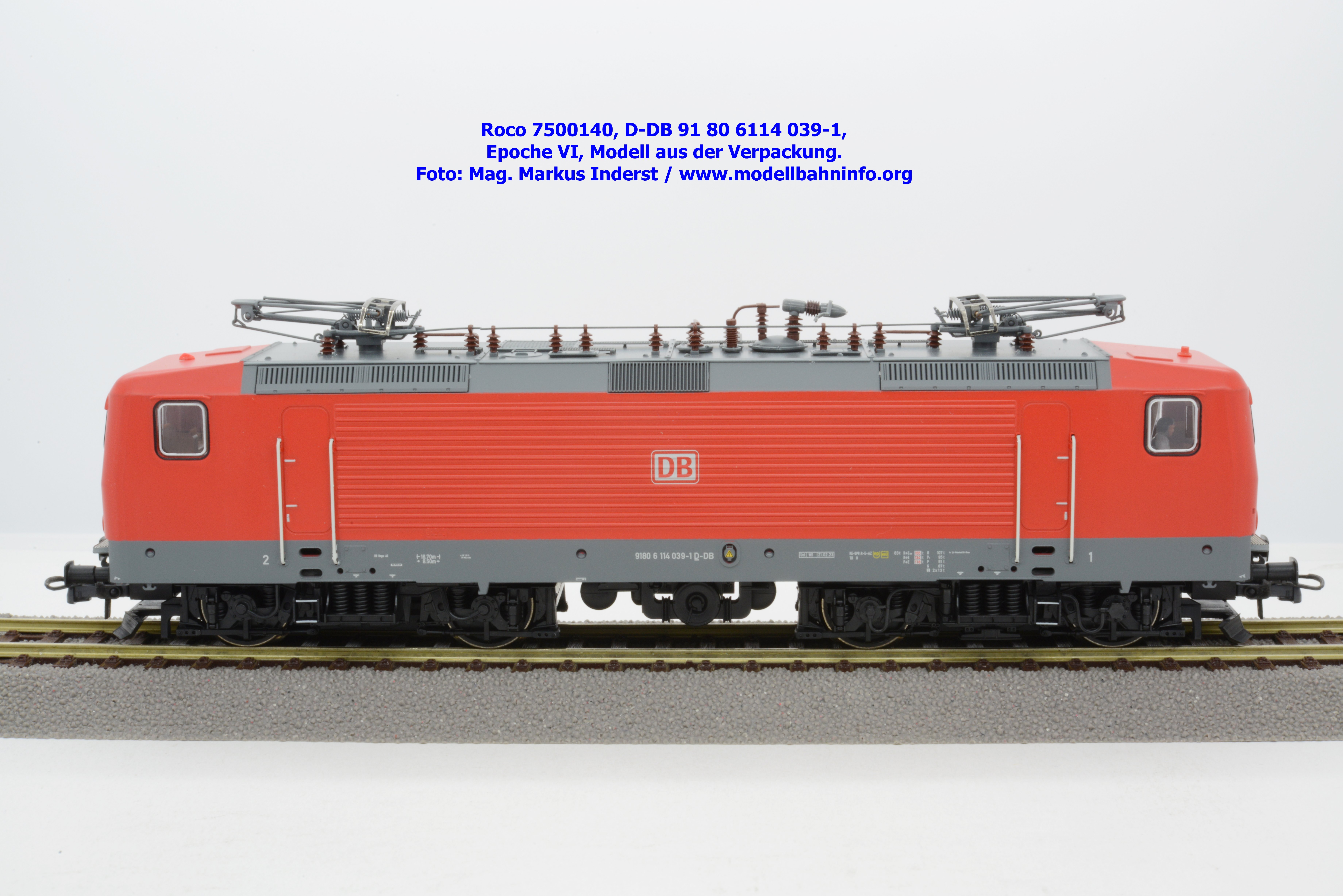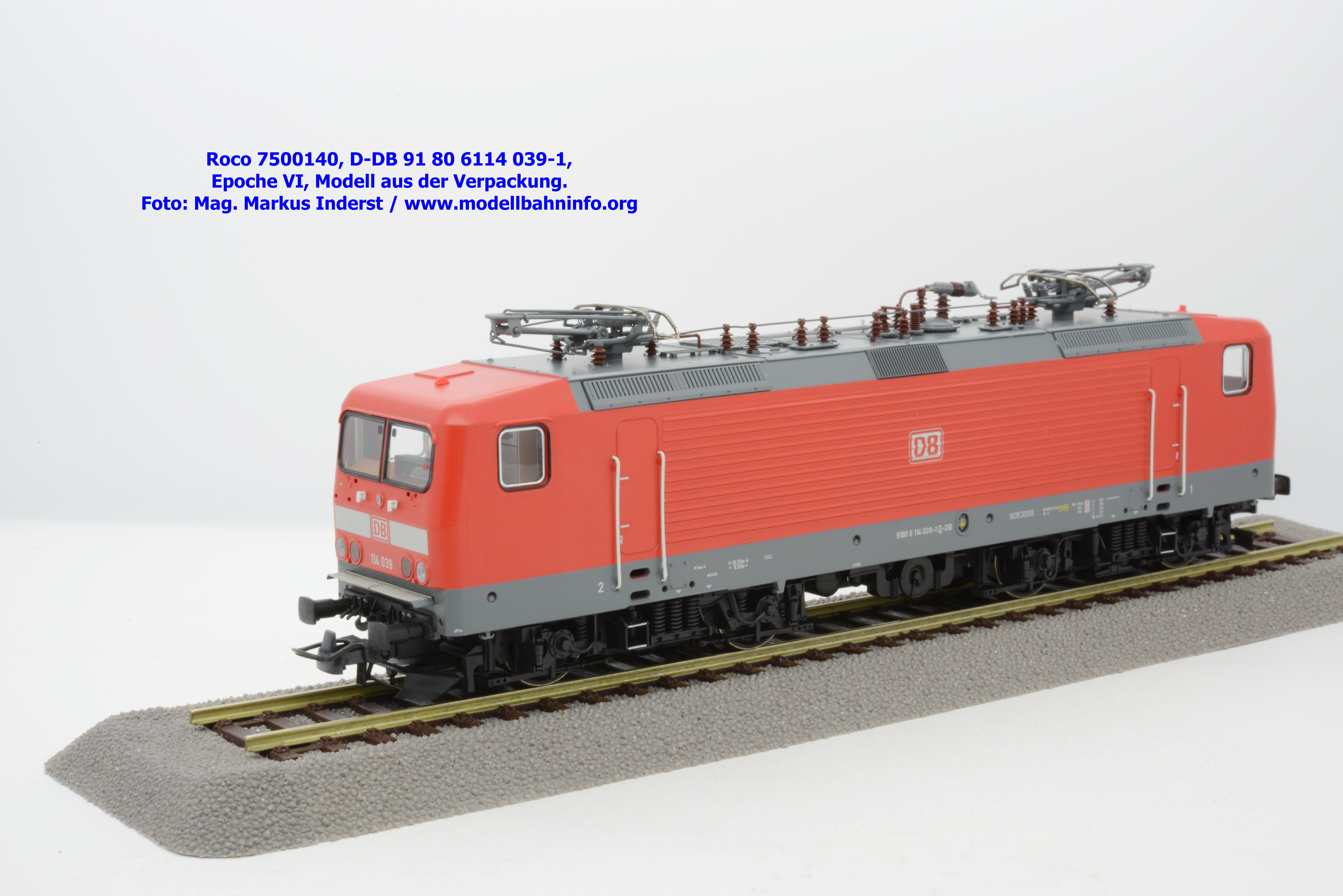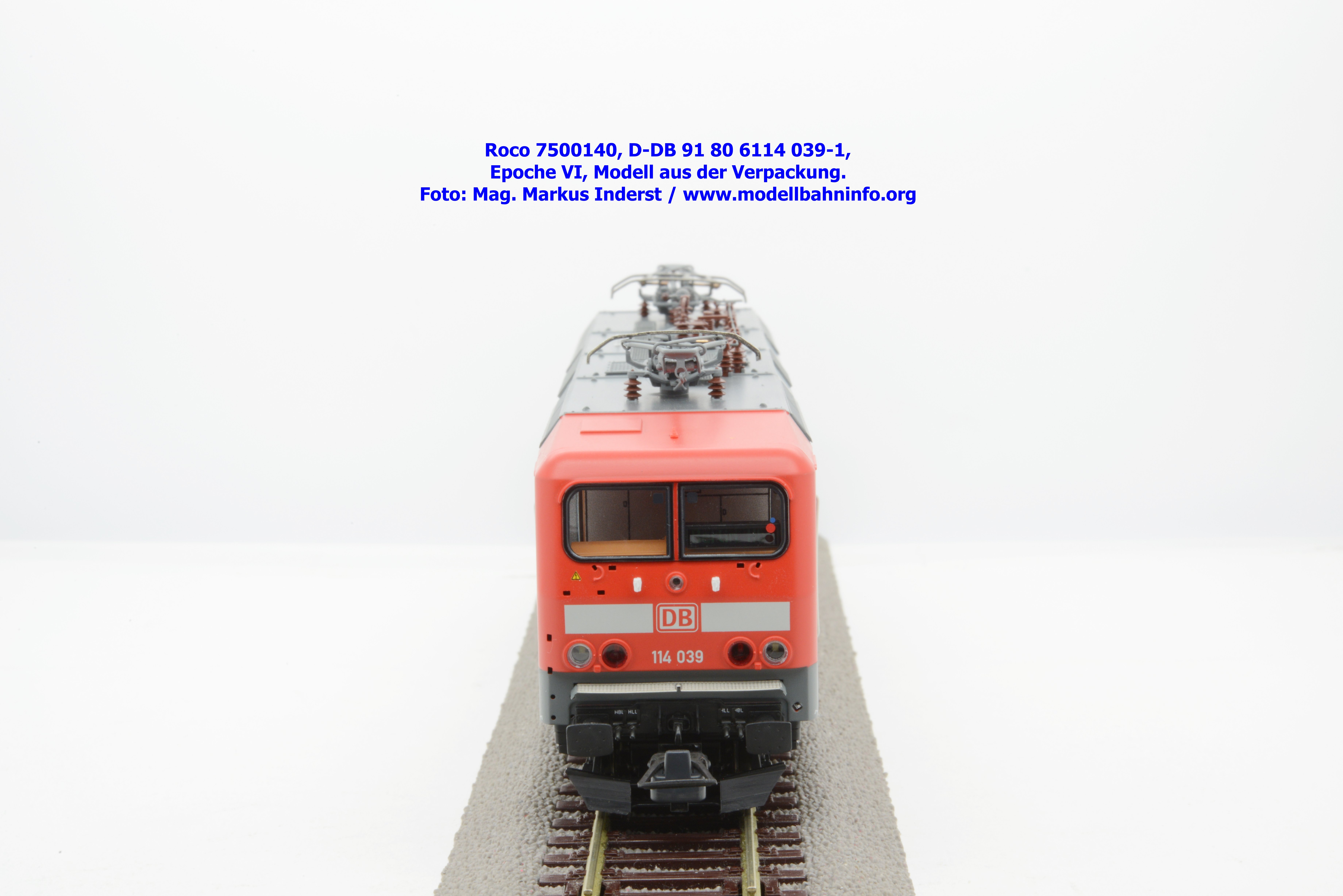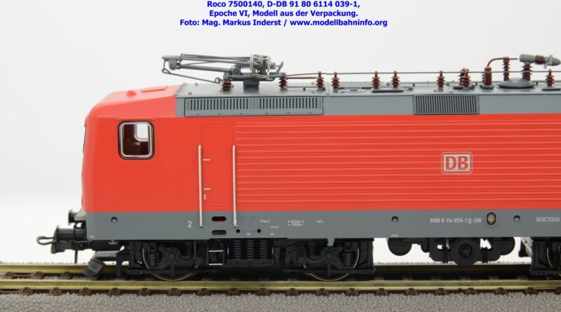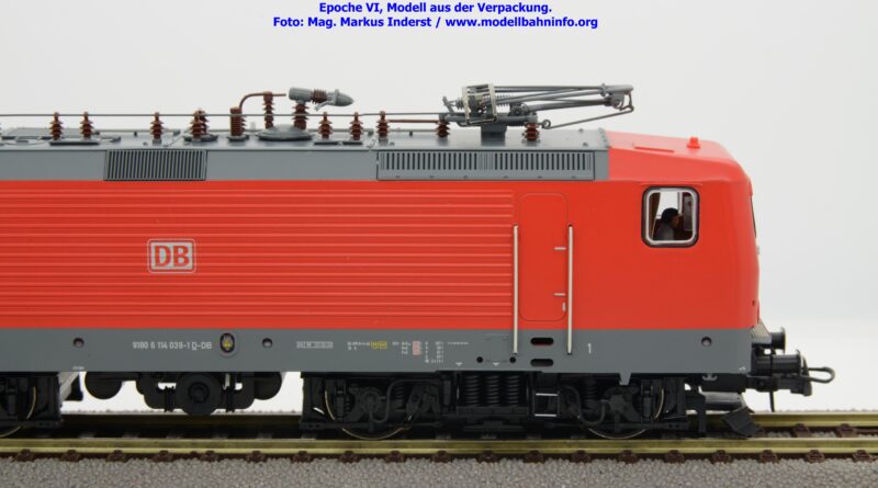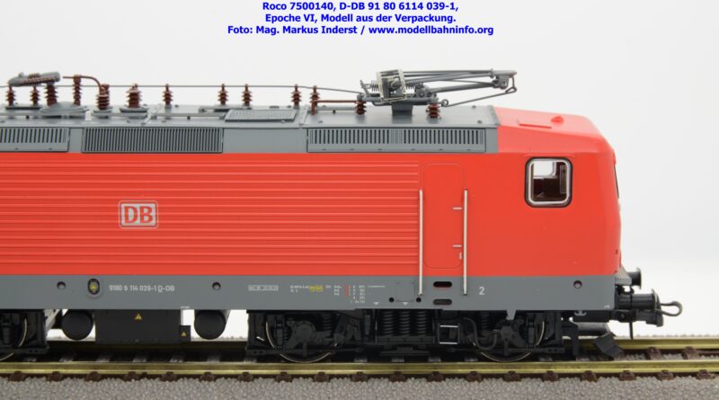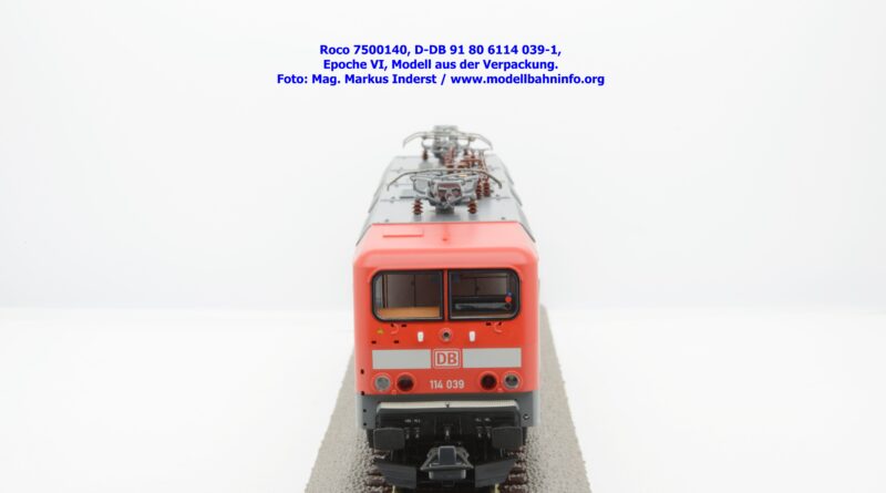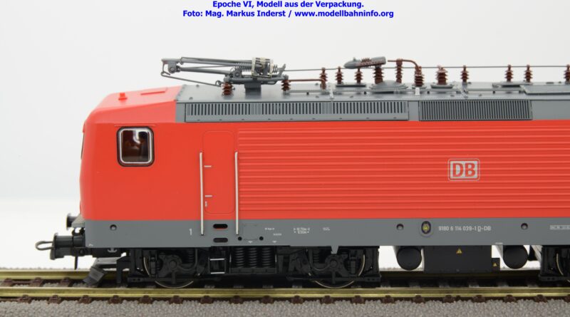 Roco hat in den Jahresneuheiten 2025 eine verkehrsrote Lok der Baureihe 114 mit Epoche VI-Beschriftung angekündigt. Die DB-Lok ist mit der Halterkennung D-DB und der NVR-Nummer 91 80 6114 039-1 bedruckt. Im Revisionsraster stehen die Untersuchungsdaten mit Unt WR 21.02.23. Organisatorisch ist die Lok der DB Regio AG zugewiesen. Die Produktion des Modell geht auf die Überlegung zurück, eine passende Lok für die neuen Doppelstockwagen der DB AG zu haben. Das Modell steht in drei Ausführungen zur Verfügung. Unter der Artikelnummer 7500140 ist die analoge Zweileiter-Gleichstrom-Ausführung verfügbar, die mit einem UVP von € 269,90 belegt ist. Die digitale Zweileiter-Gleichstrom-Ausführung wird unter der Artikelnummer 7510140 zum UVP von € 369,90 geführt, wobei die digitale Dreileiter-Wechselstrom-Ausführung unter der Artikelnummer 7520140 zu haben ist.