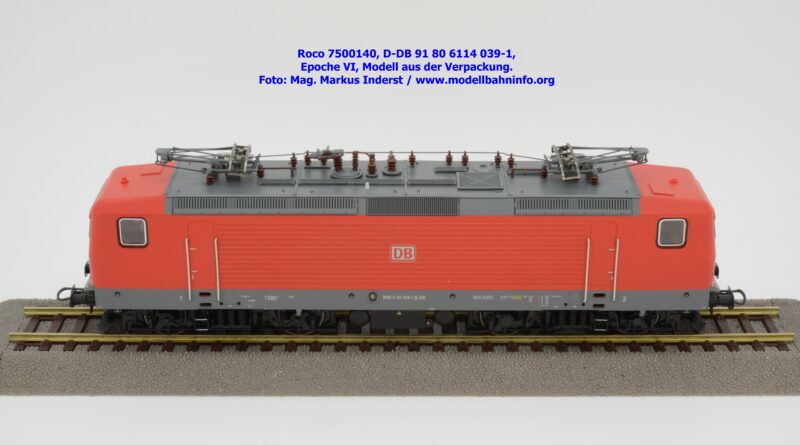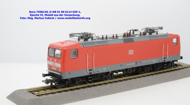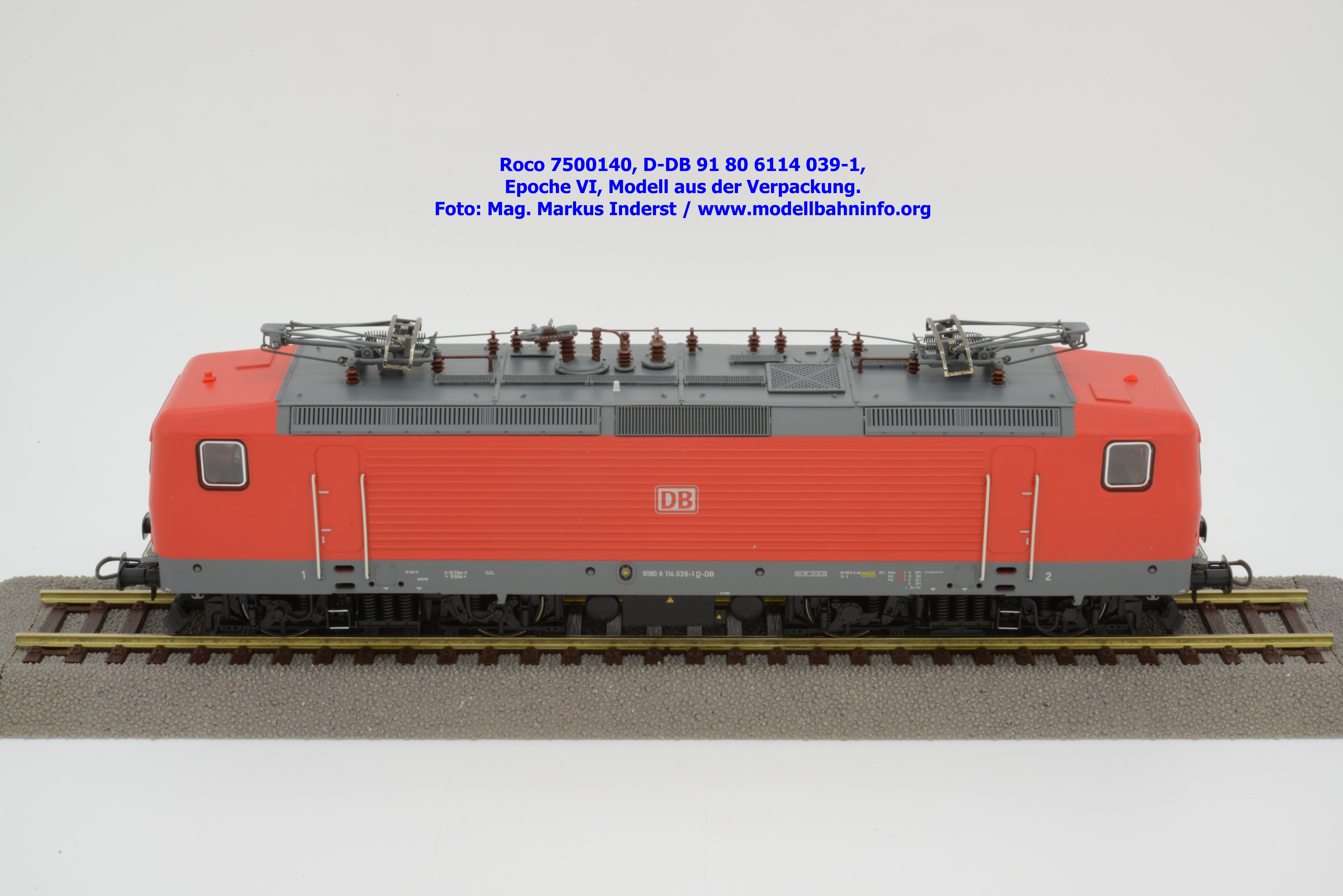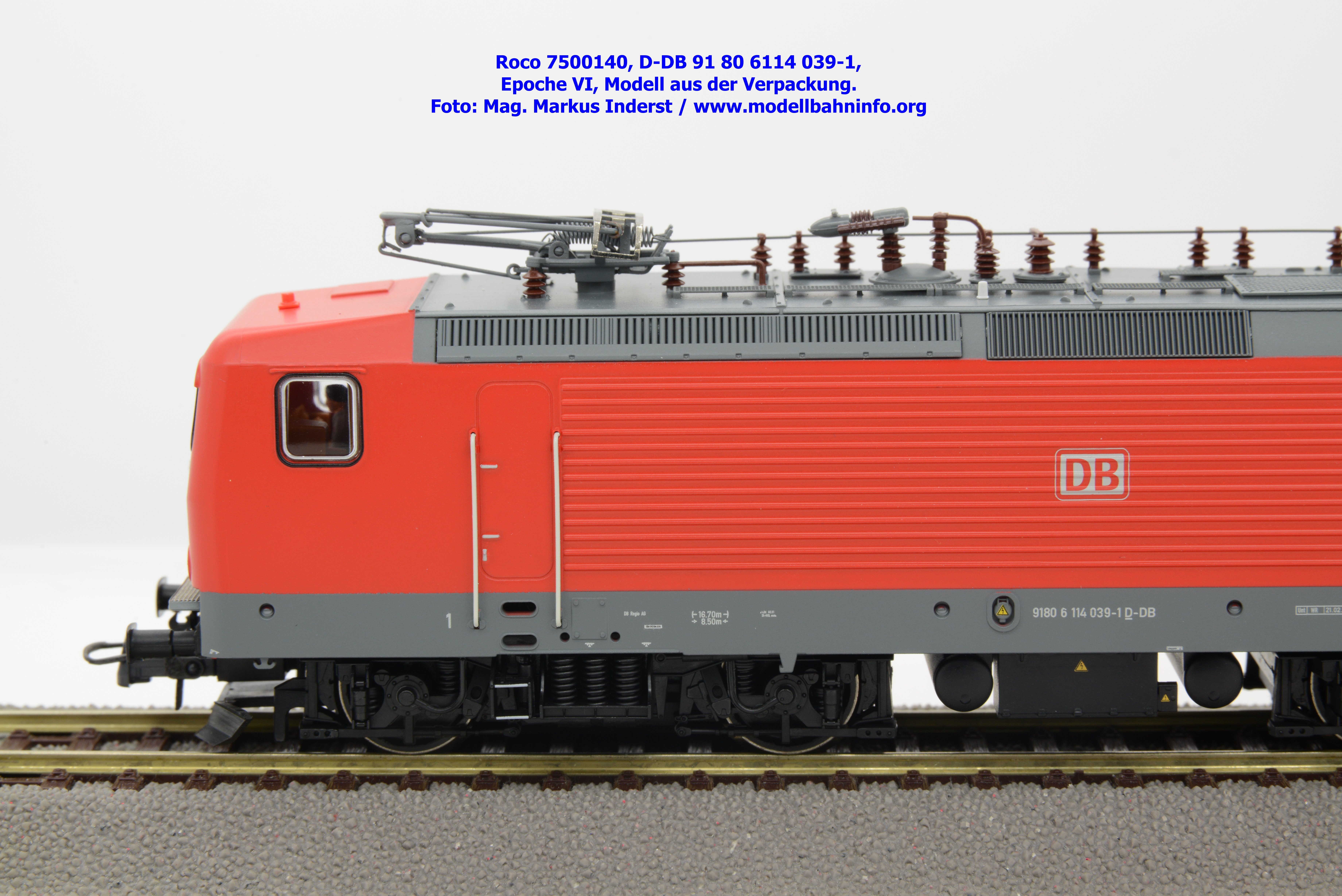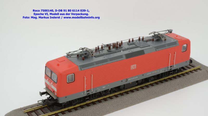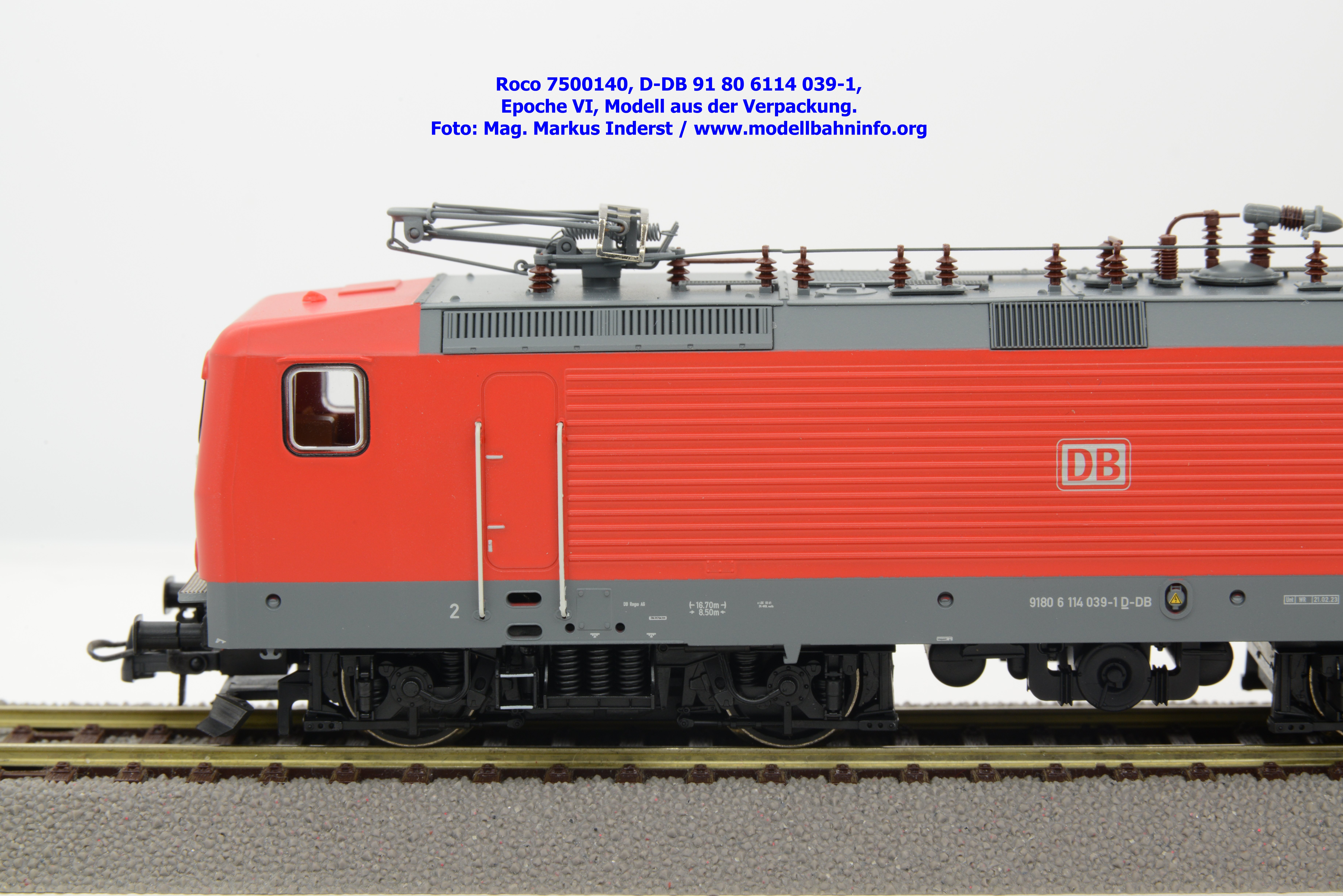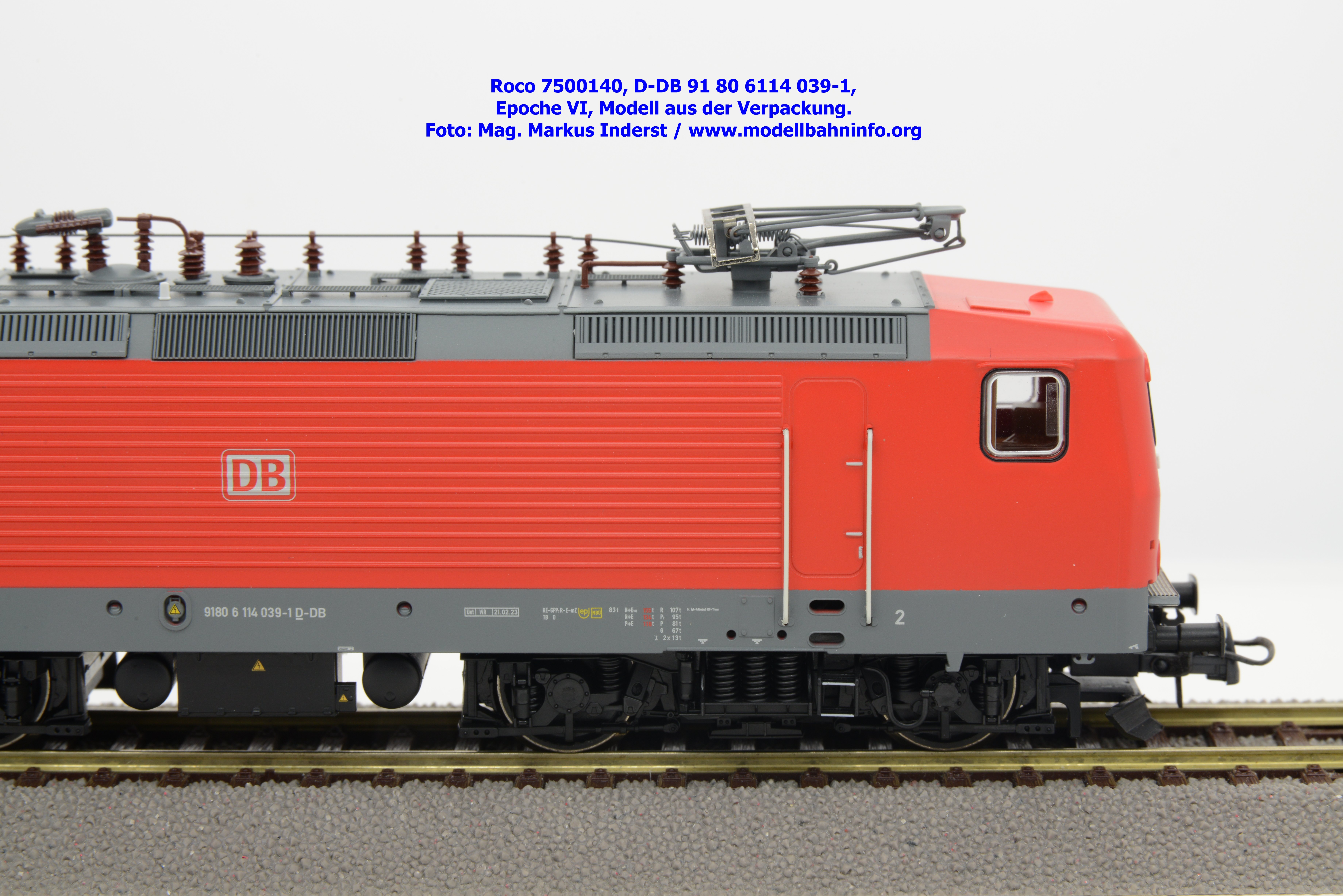 Roco hat in den Jahresneuheiten 2025 eine verkehrsrote Lok der Baureihe 114 mit Epoche VI-Beschriftung angekündigt. Die DB-Lok ist mit der Halterkennung D-DB und der NVR-Nummer 91 80 6114 039-1 bedruckt. Im Revisionsraster stehen die Untersuchungsdaten mit Unt WR 21.02.23. Organisatorisch ist die Lok der DB Regio AG zugewiesen. Die Produktion des Modell geht auf die Überlegung zurück, eine passende Lok für die neuen Doppelstockwagen der DB AG zu haben. Das Modell steht in drei Ausführungen zur Verfügung. Unter der Artikelnummer 7500140 ist die analoge Zweileiter-Gleichstrom-Ausführung verfügbar, die mit einem UVP von € 269,90 belegt ist. Die digitale Zweileiter-Gleichstrom-Ausführung wird unter der Artikelnummer 7510140 zum UVP von € 369,90 geführt, wobei die digitale Dreileiter-Wechselstrom-Ausführung unter der Artikelnummer 7520140 zu haben ist.