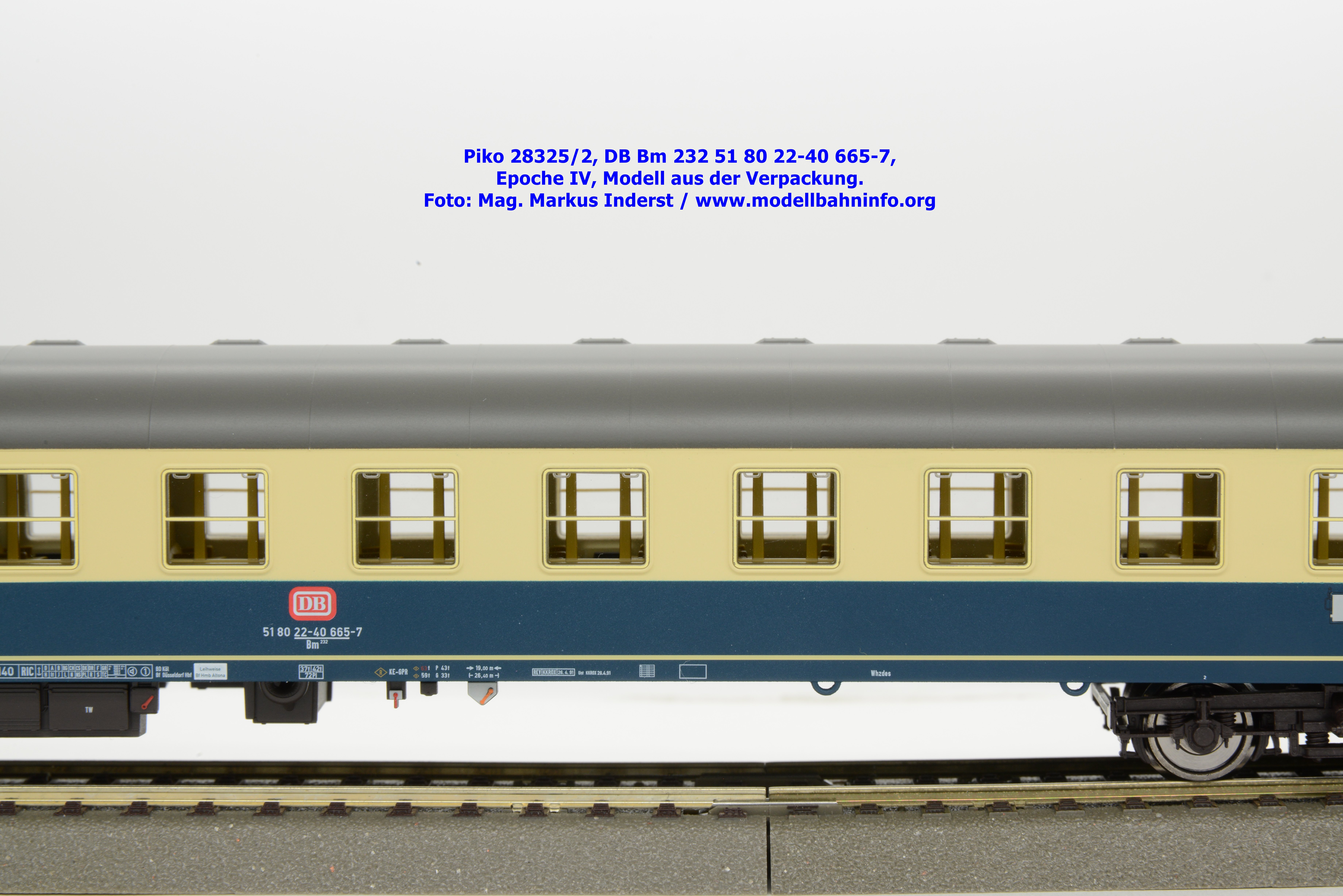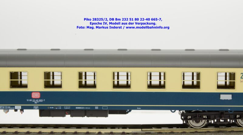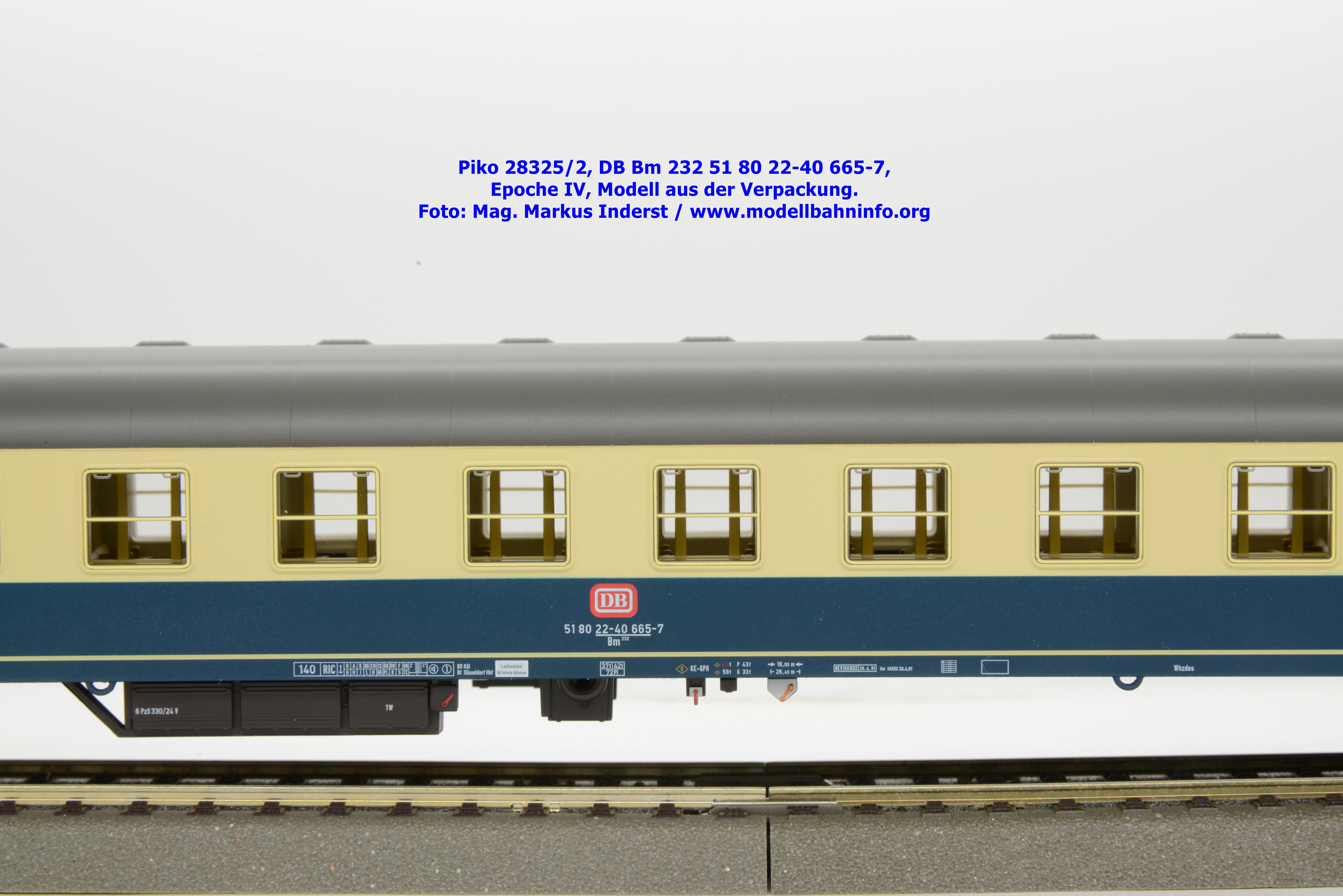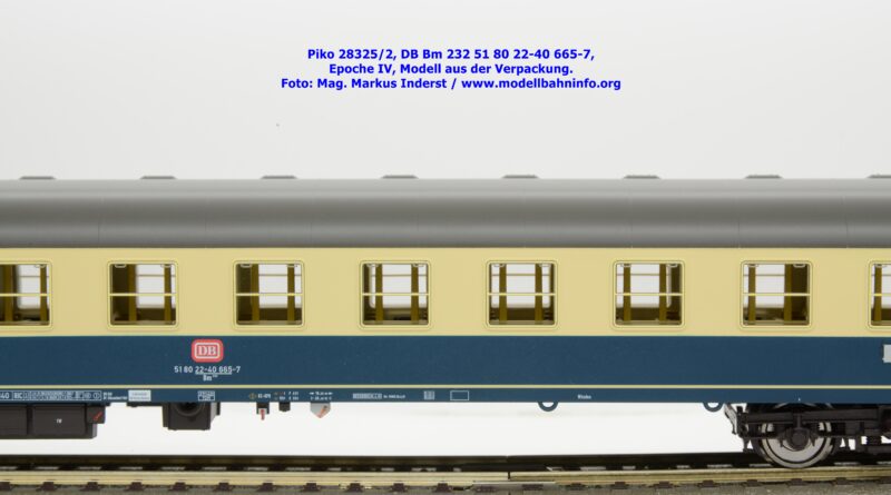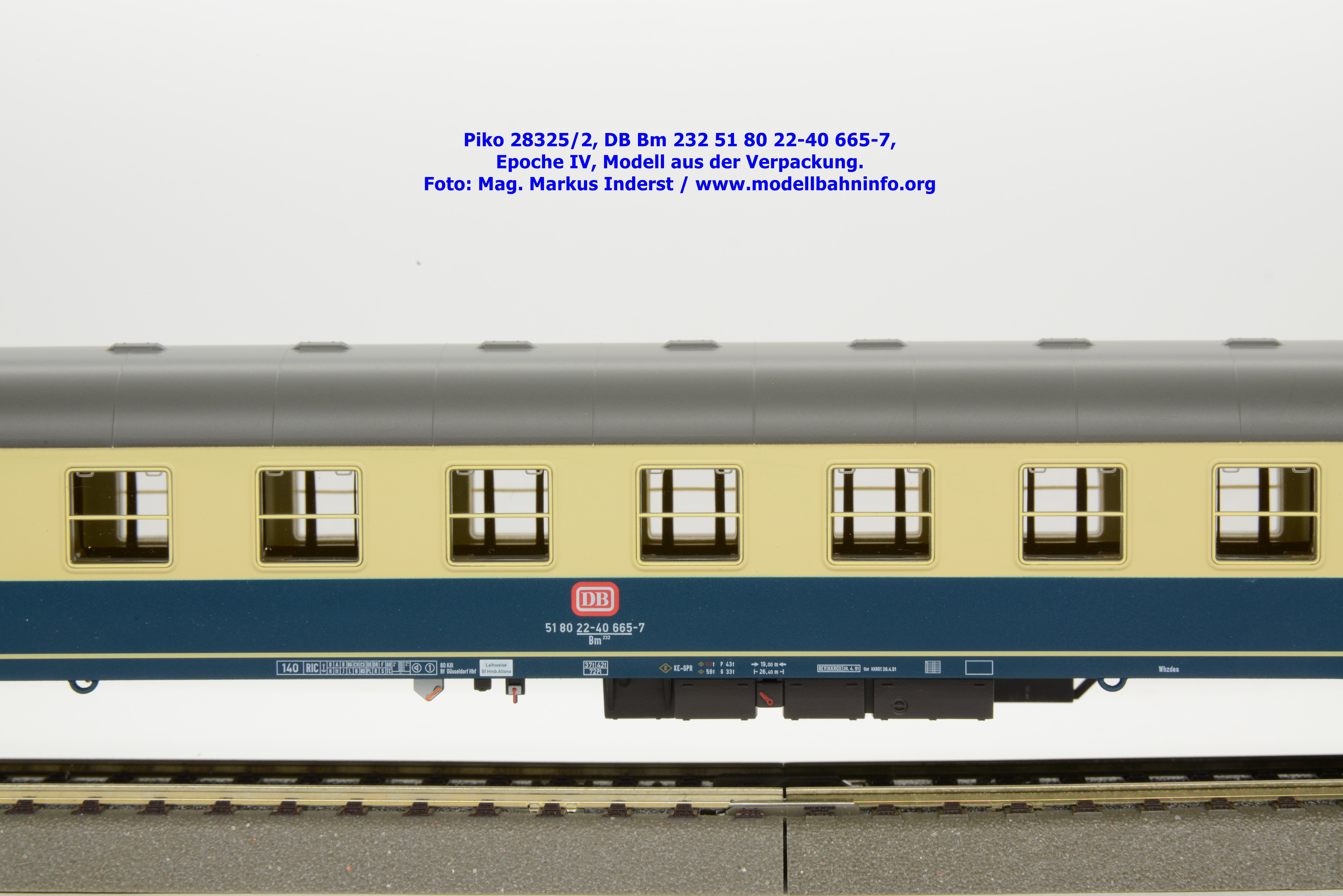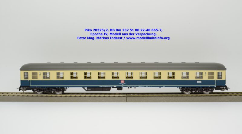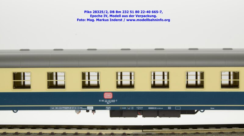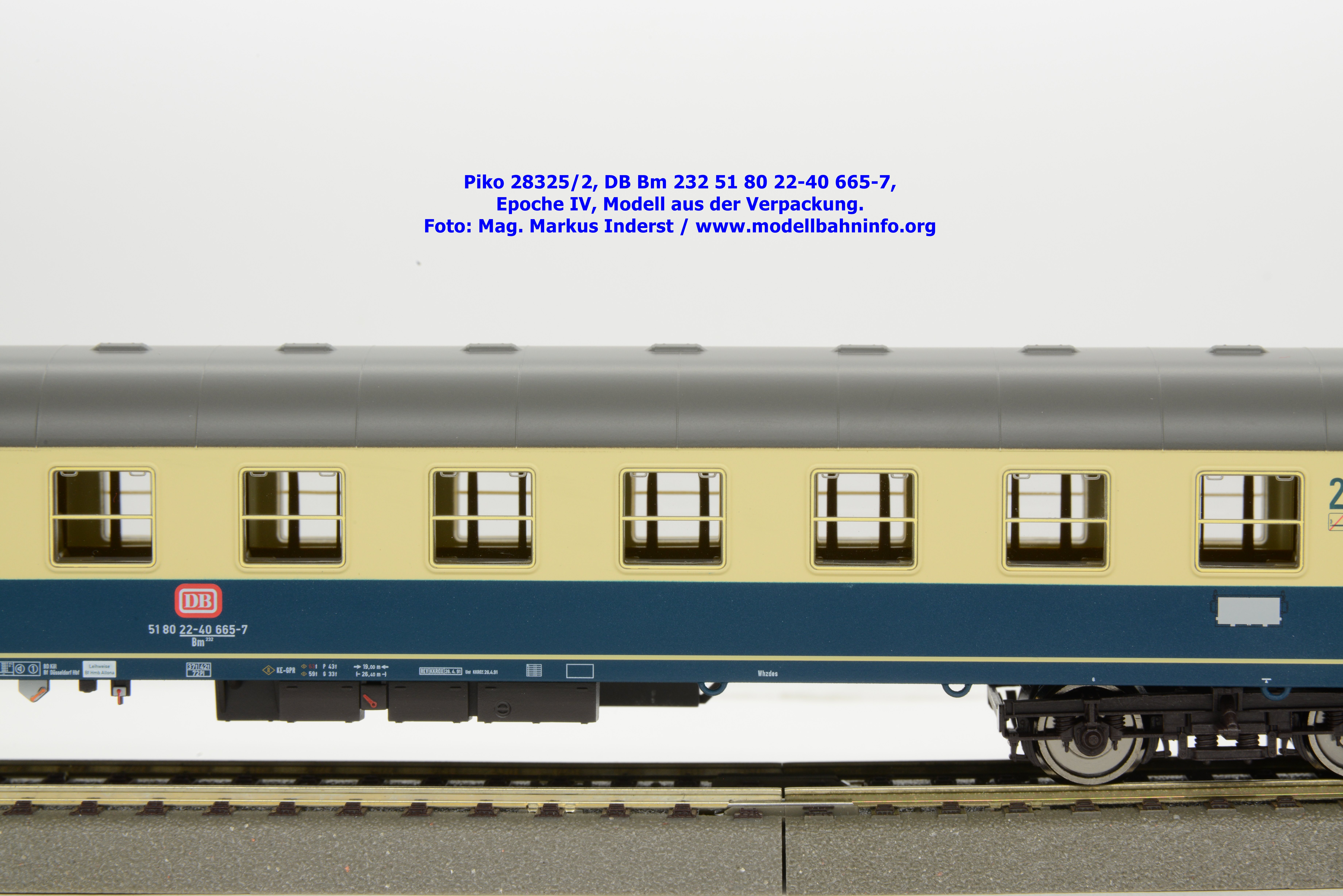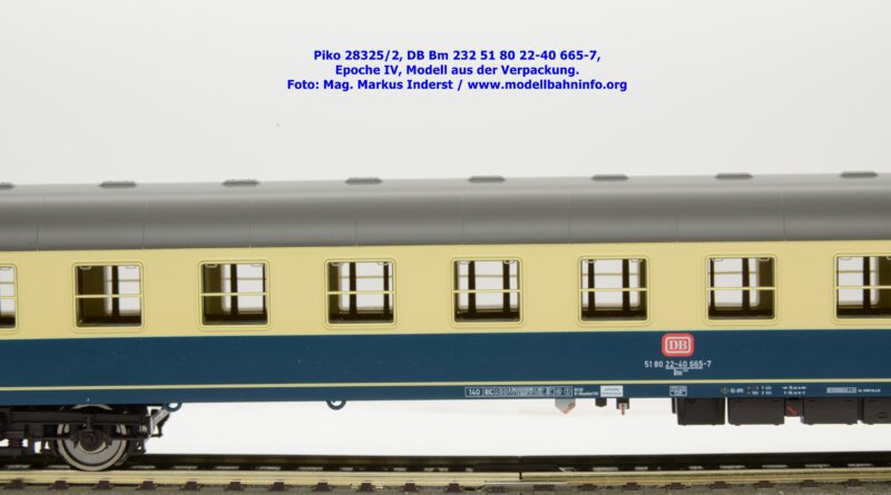 Der bestehende Formenschatz des Sonneberger Herstellers ermöglicht die Fertigung dieses zweiteiligen Wagensets. Dieses besteht aus einem 1./2. Klasse Silberling mit der Gattungsbezeichnung ABnb 703 und einem 2. Klasse Schnellzugwagen Bm 232 in ozeanblau/beiger Farbgebung. Beide Modelle haben eines gemeinsam, den roten DB-Keks. Der Bm 232 ist mit der Wagennummer 51 80 22-40 665-7 bedruckt und gehört somit der Epoche IV an. Die Heimatdienststelle ist mit Düsseldorf Hbf angeben, wobei ein Hinweis auf die leihweise Verwendung durch den Bahnhof Hamburg-Altona gegeben ist. Das Heimat-BD ist Köln. Im Revisionsraster stehen die Untersuchungsdaten REV KKROX 26. 4.91 bzw. Unt KKROX 26. 4.91 . Nachdem dieser Wagen Teil eines zweiteiligen Wagensets ist, beträgt der UVP € 129,–.