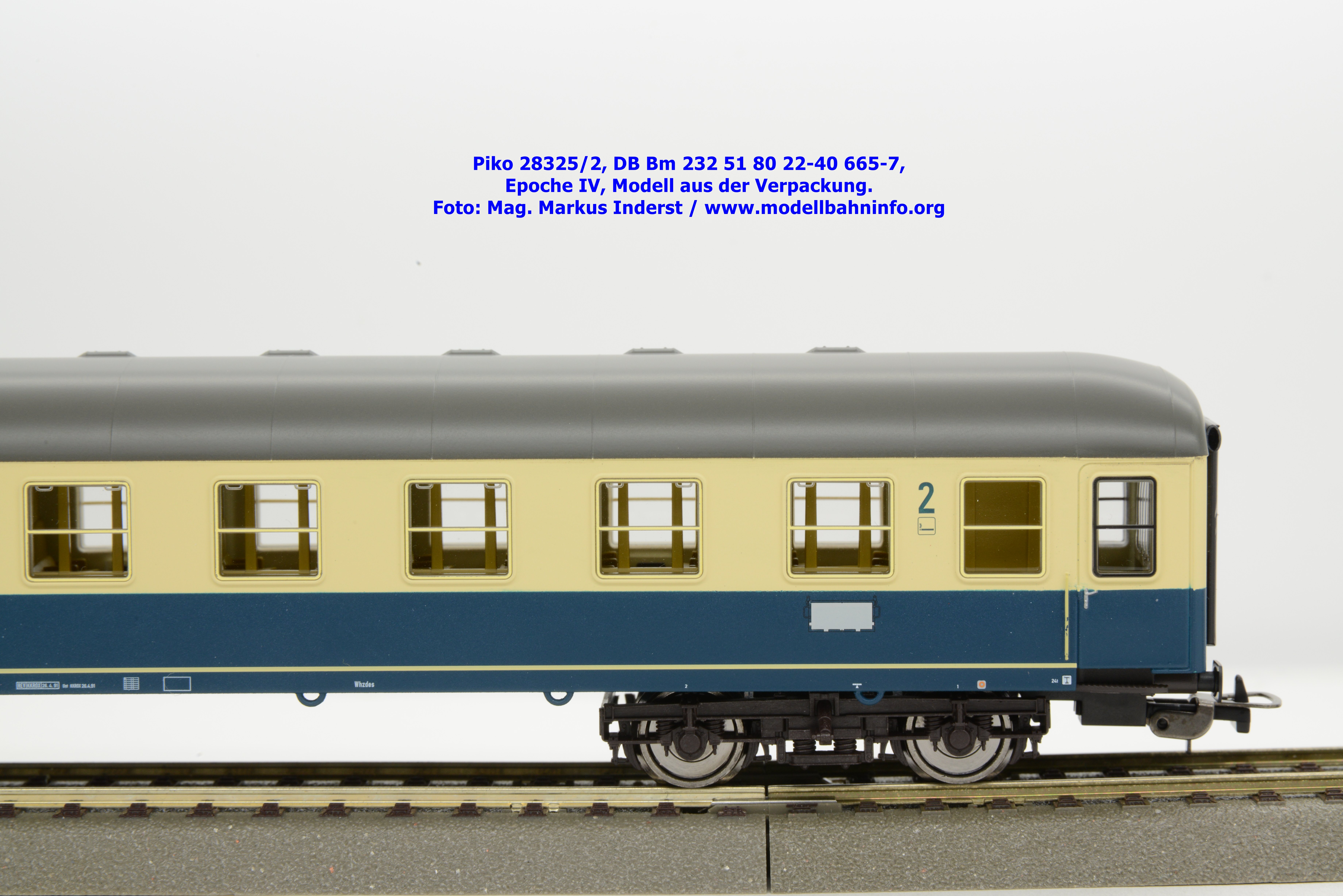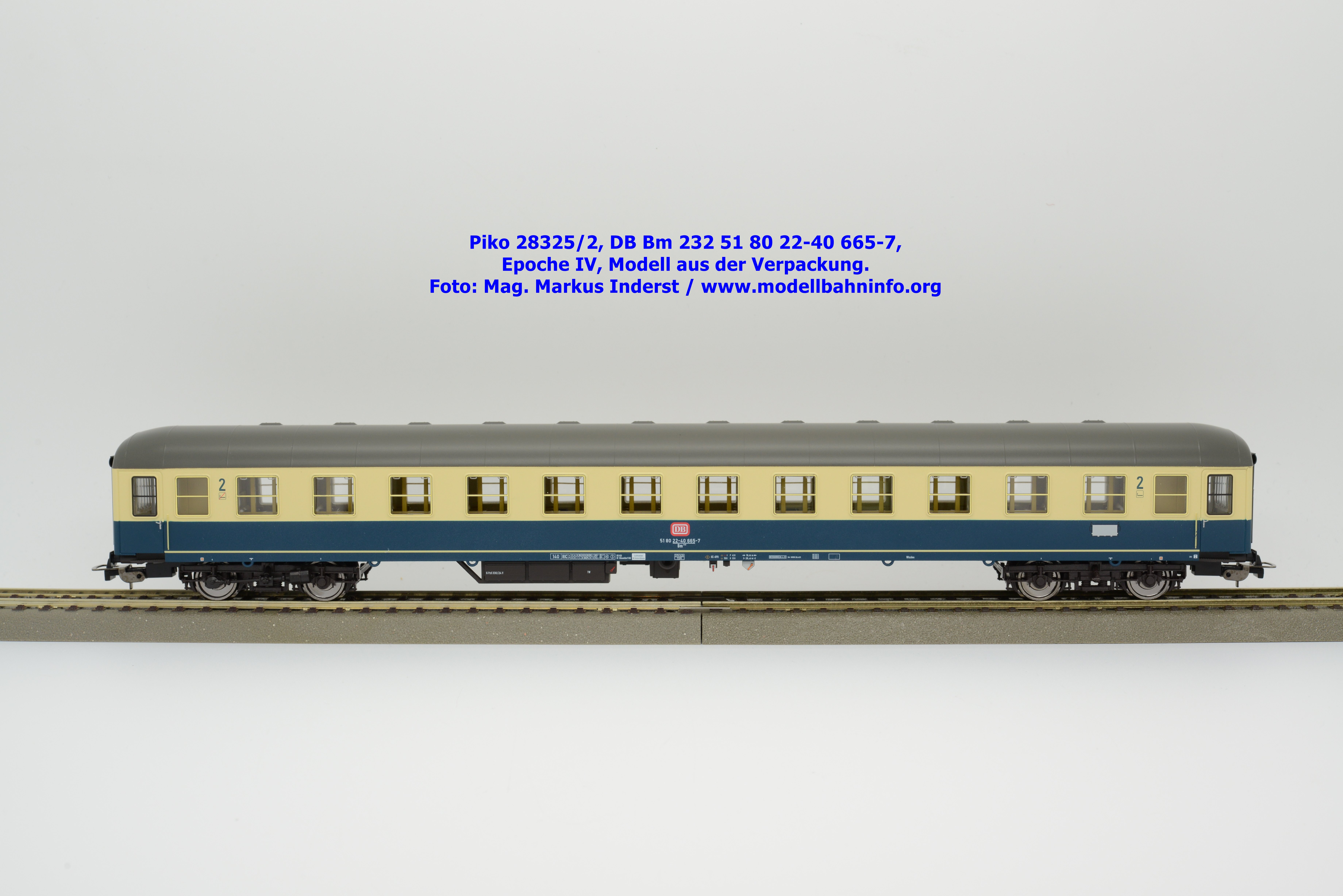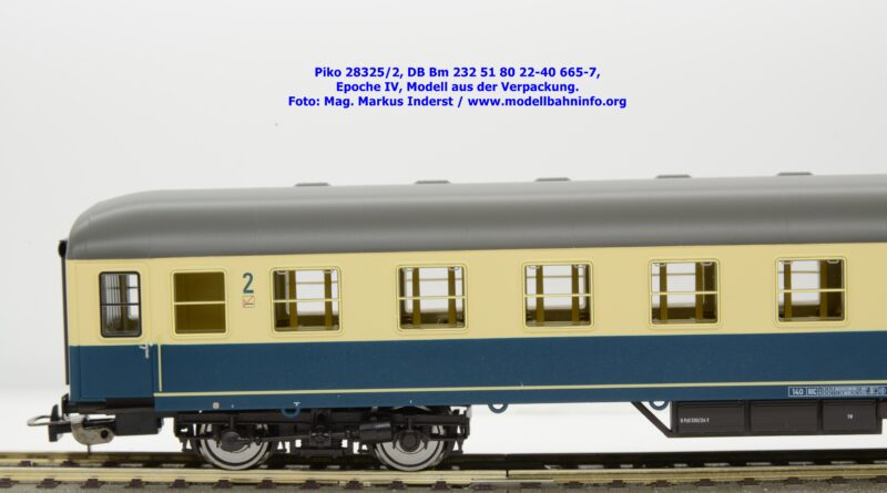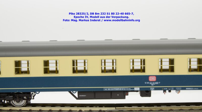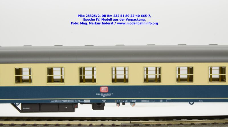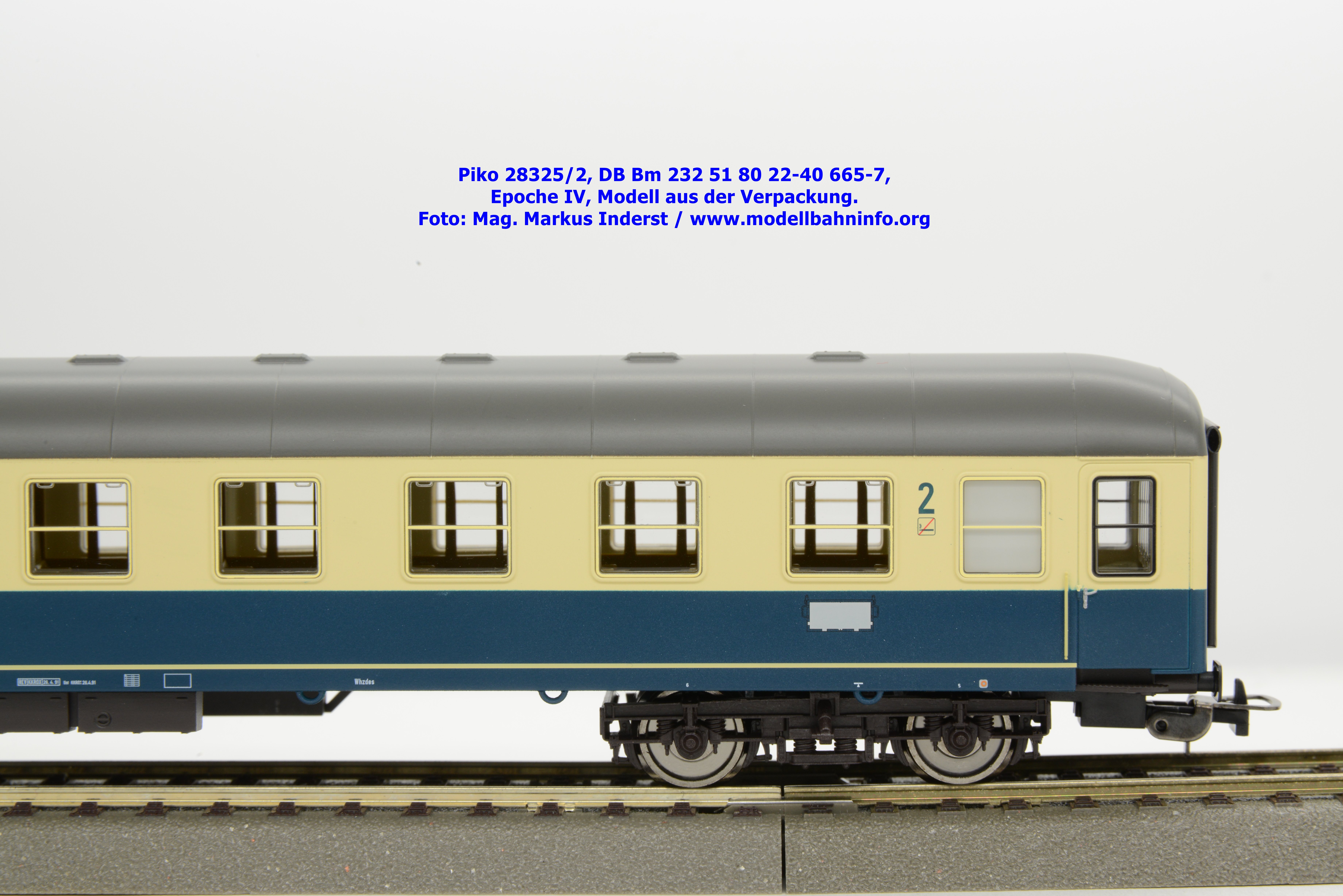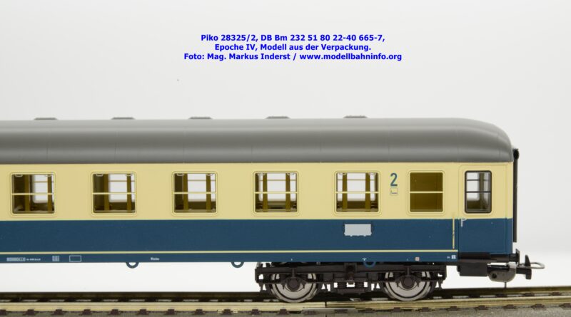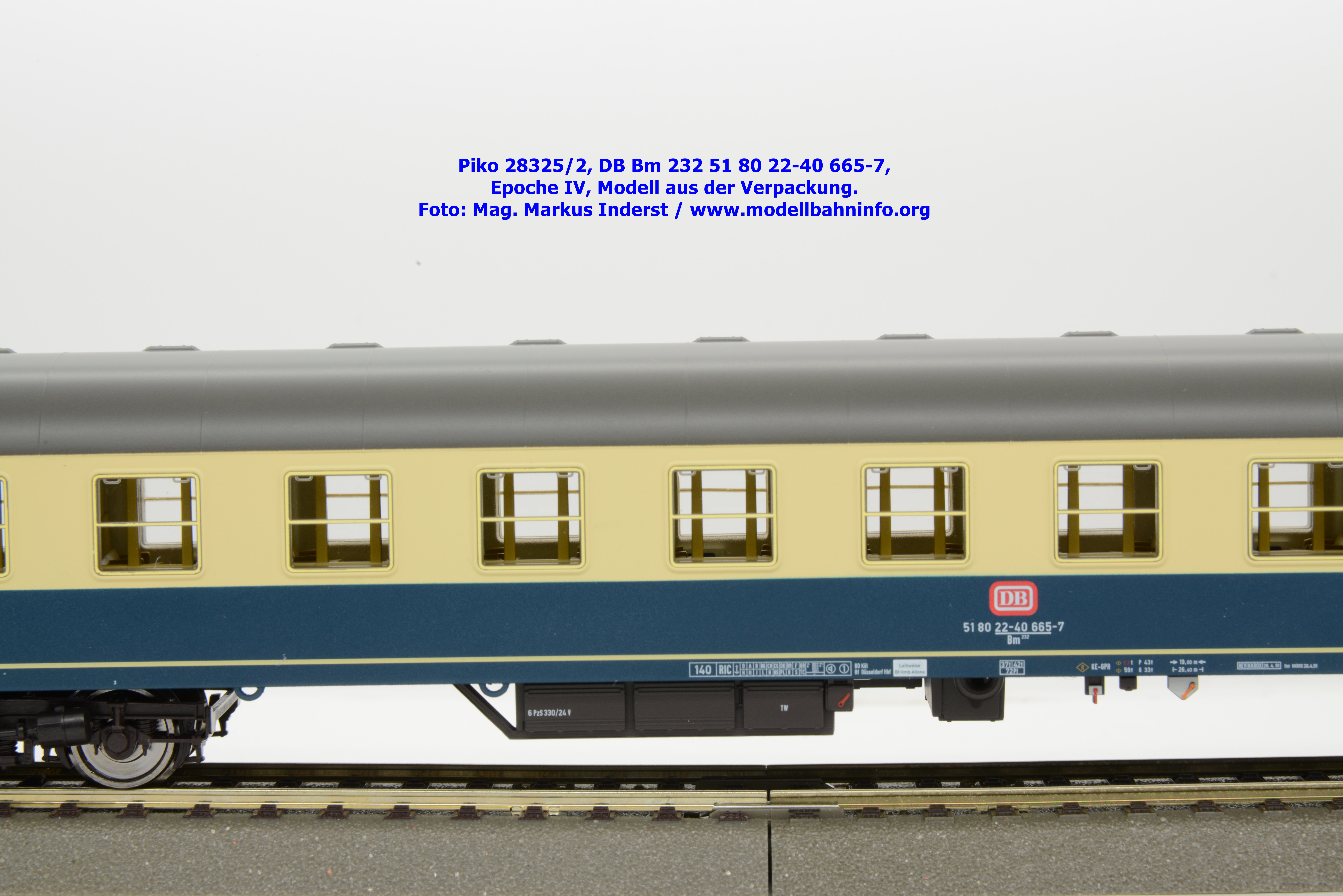 Der bestehende Formenschatz des Sonneberger Herstellers ermöglicht die Fertigung dieses zweiteiligen Wagensets. Dieses besteht aus einem 1./2. Klasse Silberling mit der Gattungsbezeichnung ABnb 703 und einem 2. Klasse Schnellzugwagen Bm 232 in ozeanblau/beiger Farbgebung. Beide Modelle haben eines gemeinsam, den roten DB-Keks. Der Bm 232 ist mit der Wagennummer 51 80 22-40 665-7 bedruckt und gehört somit der Epoche IV an. Die Heimatdienststelle ist mit Düsseldorf Hbf angeben, wobei ein Hinweis auf die leihweise Verwendung durch den Bahnhof Hamburg-Altona gegeben ist. Das Heimat-BD ist Köln. Im Revisionsraster stehen die Untersuchungsdaten REV KKROX 26. 4.91 bzw. Unt KKROX 26. 4.91 . Nachdem dieser Wagen Teil eines zweiteiligen Wagensets ist, beträgt der UVP € 129,–.