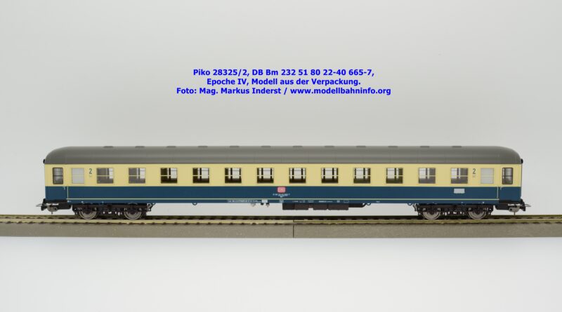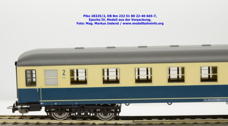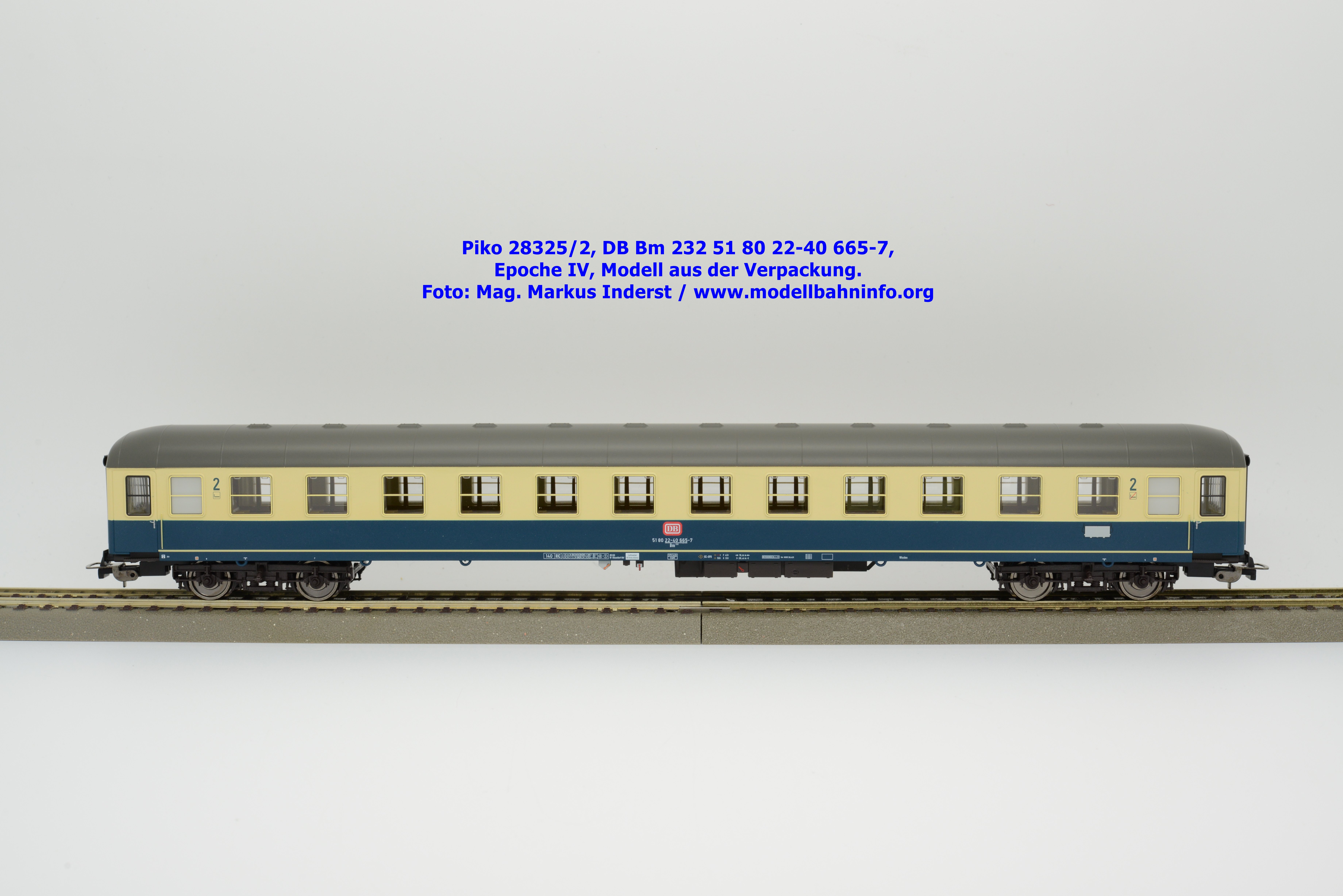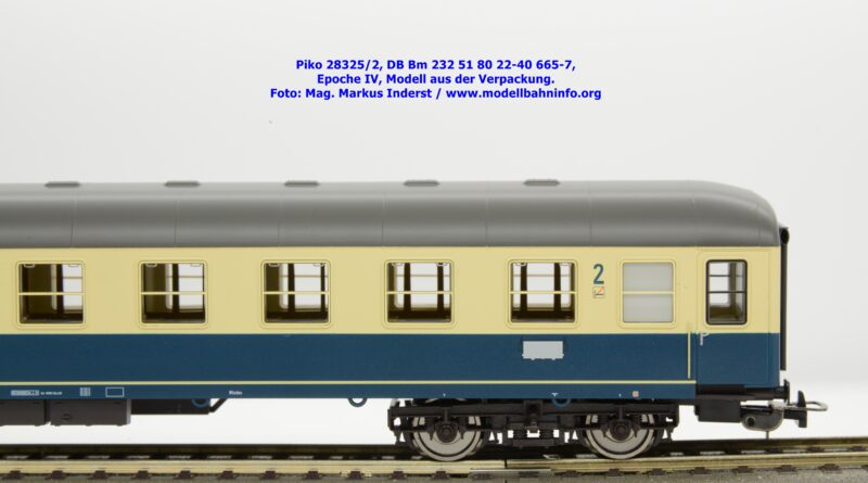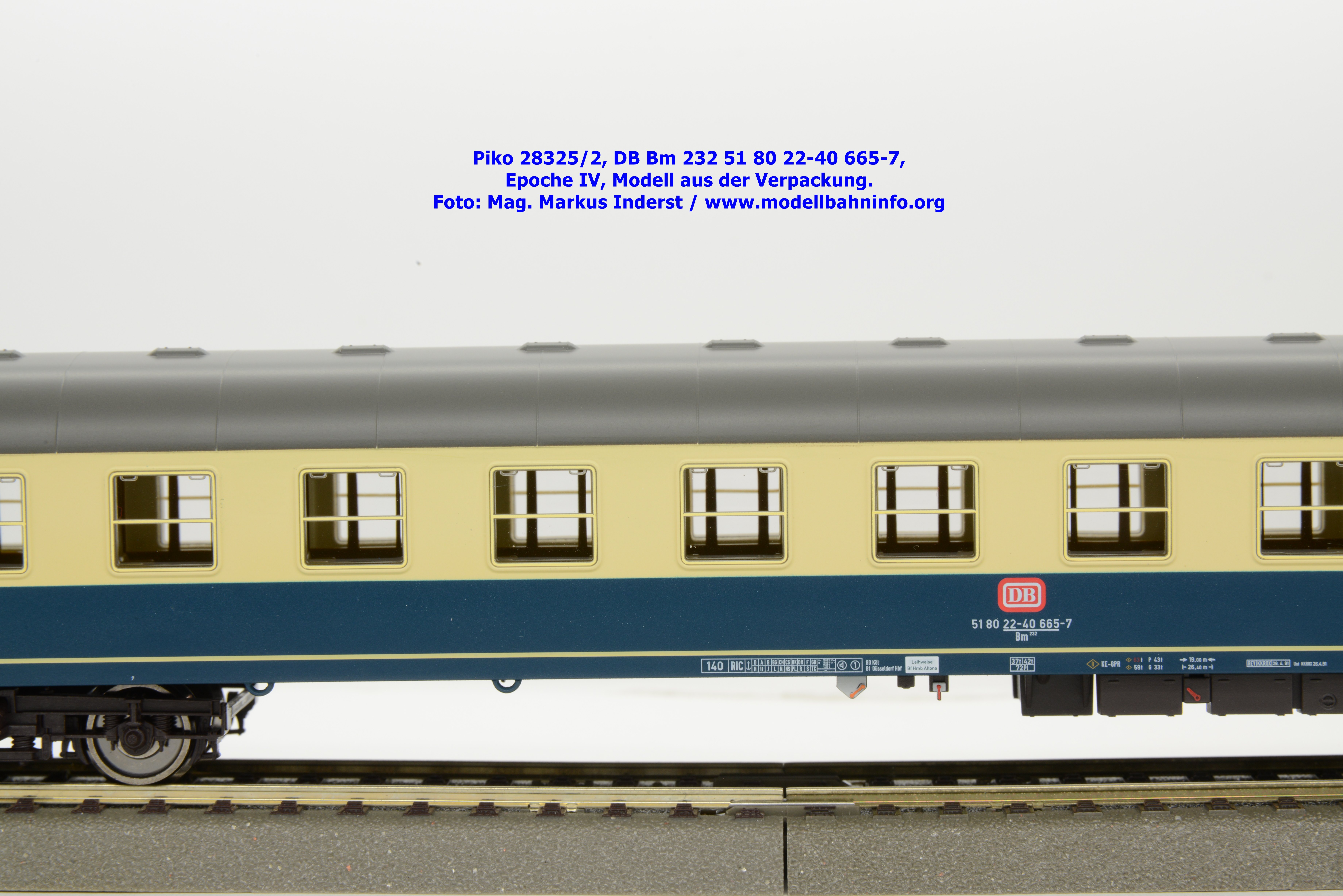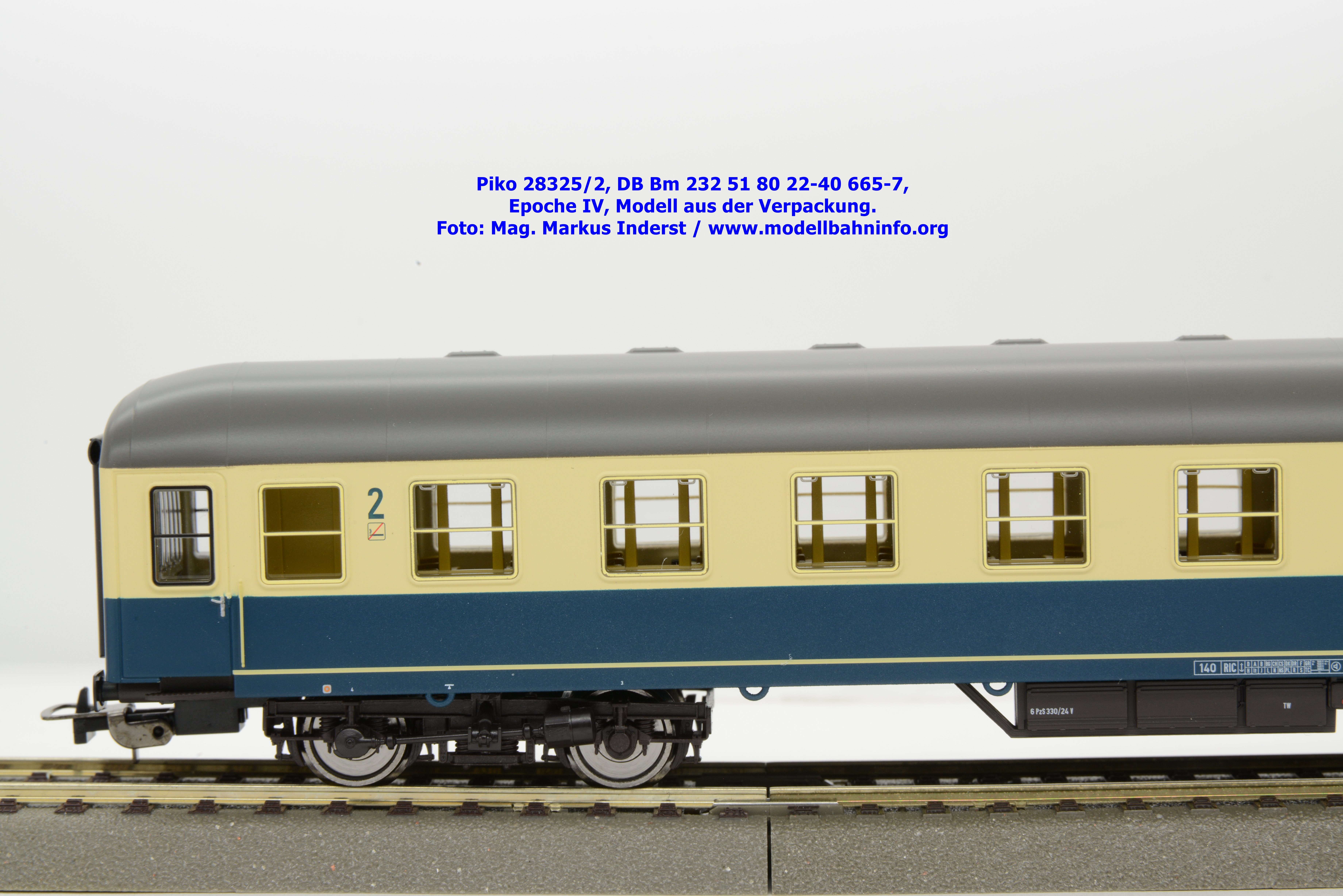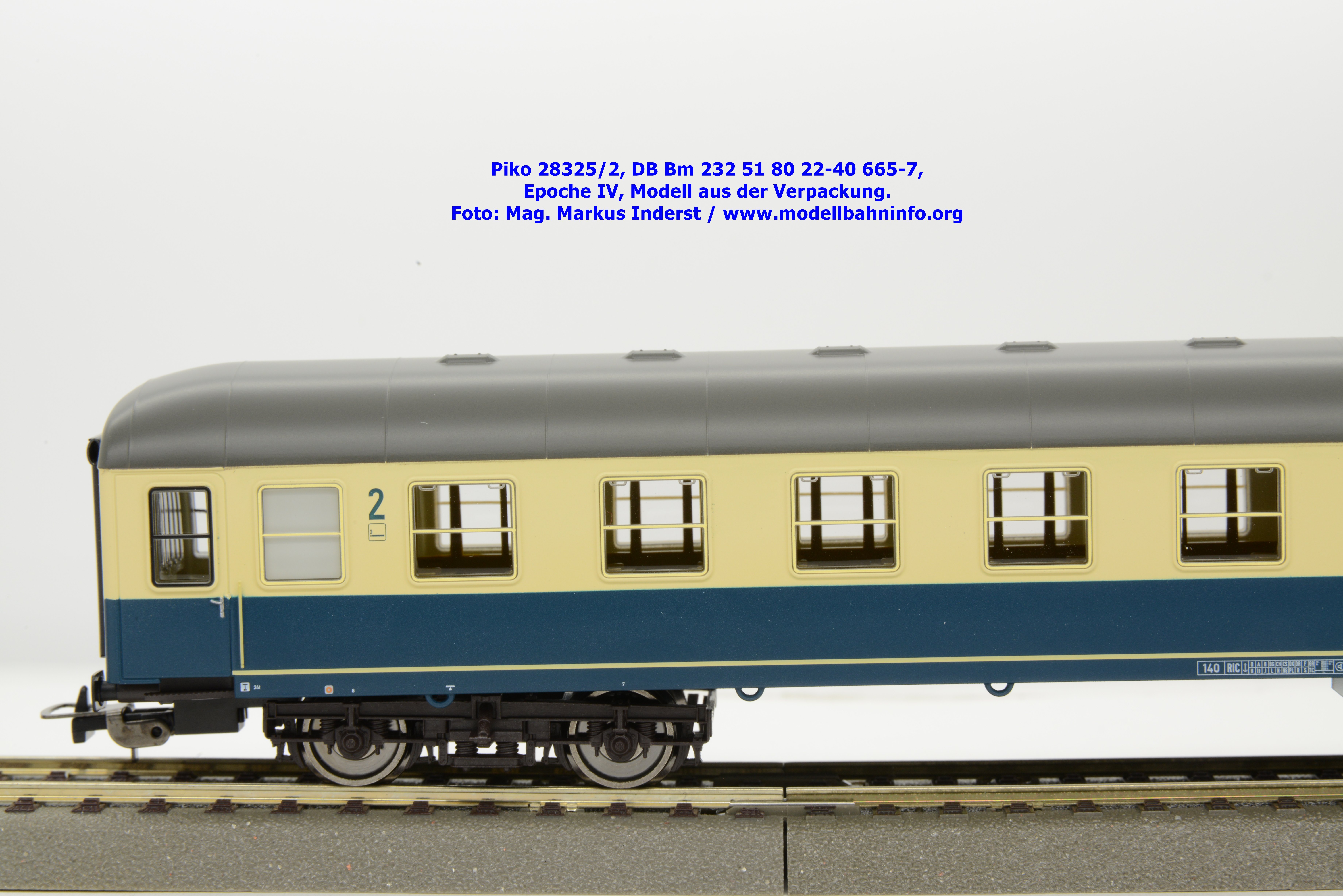 Der bestehende Formenschatz des Sonneberger Herstellers ermöglicht die Fertigung dieses zweiteiligen Wagensets. Dieses besteht aus einem 1./2. Klasse Silberling mit der Gattungsbezeichnung ABnb 703 und einem 2. Klasse Schnellzugwagen Bm 232 in ozeanblau/beiger Farbgebung. Beide Modelle haben eines gemeinsam, den roten DB-Keks. Der Bm 232 ist mit der Wagennummer 51 80 22-40 665-7 bedruckt und gehört somit der Epoche IV an. Die Heimatdienststelle ist mit Düsseldorf Hbf angeben, wobei ein Hinweis auf die leihweise Verwendung durch den Bahnhof Hamburg-Altona gegeben ist. Das Heimat-BD ist Köln. Im Revisionsraster stehen die Untersuchungsdaten REV KKROX 26. 4.91 bzw. Unt KKROX 26. 4.91 . Nachdem dieser Wagen Teil eines zweiteiligen Wagensets ist, beträgt der UVP € 129,–.