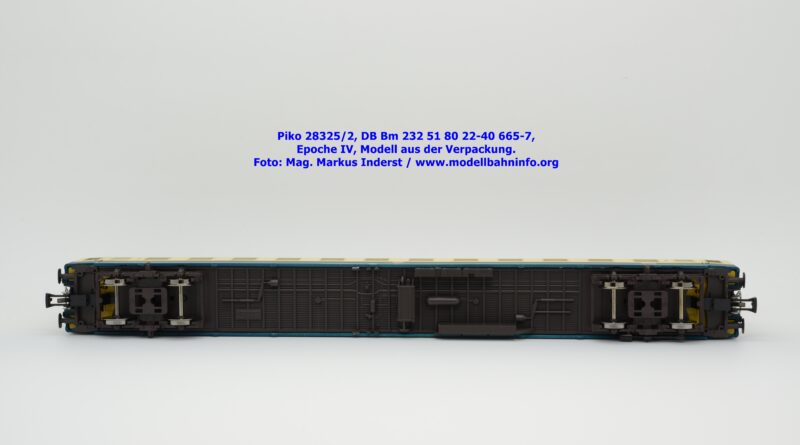 Die zweite Neuheit des Jahres 2019 stellt der Schnellzugwagen der Gattung Bm 232 in ebenfalls ozeanblau/beiger Lackierung dar. Das Modell ist mit der Betriebsnummer 51 80 22-40 181-5 bedruckt. Der Heimatbahnhof, das Zuglaufschild und der UVP sind ident zum ABm 223. Das Revisionsraster nennt die Daten REV Om 03.02.82.