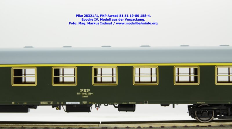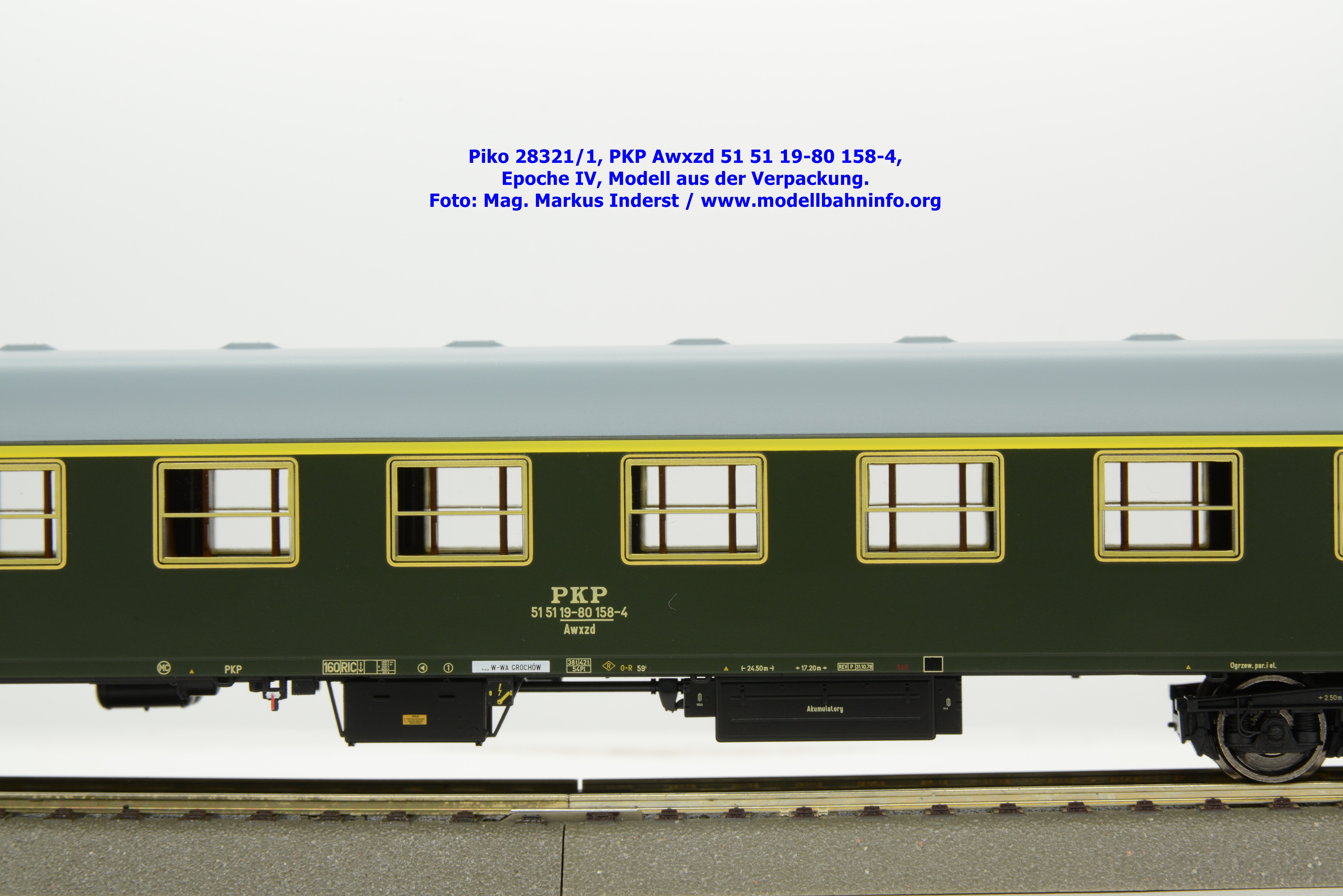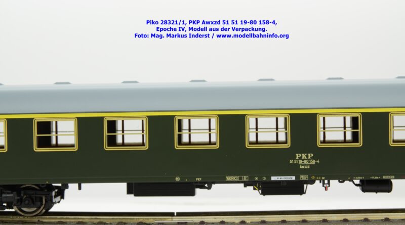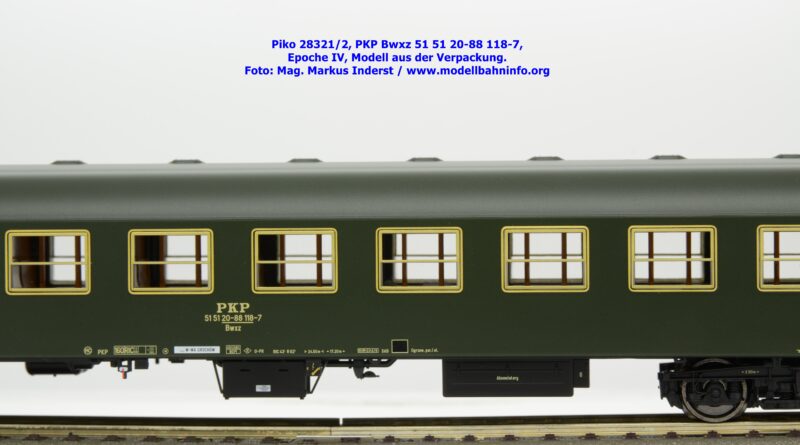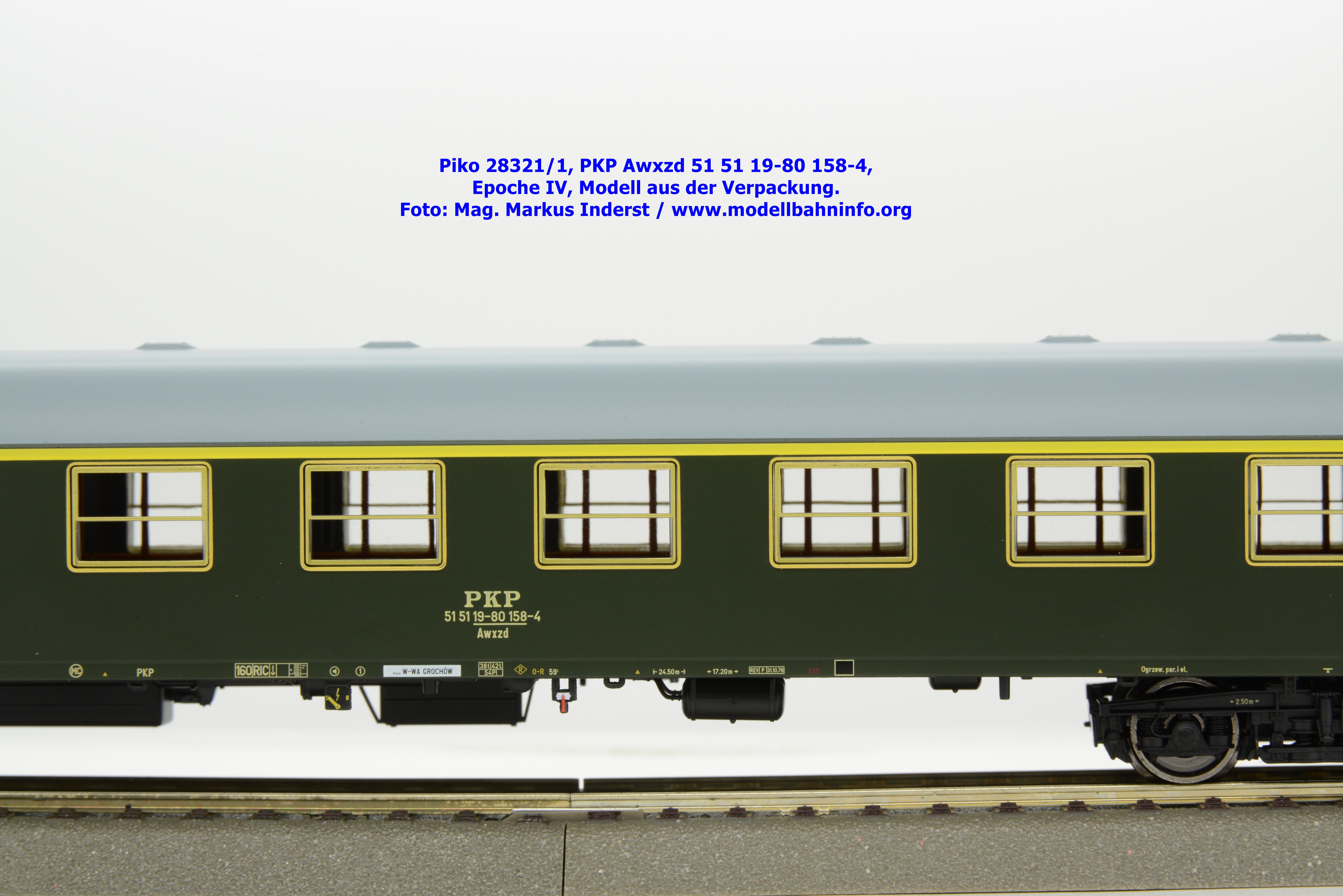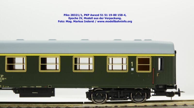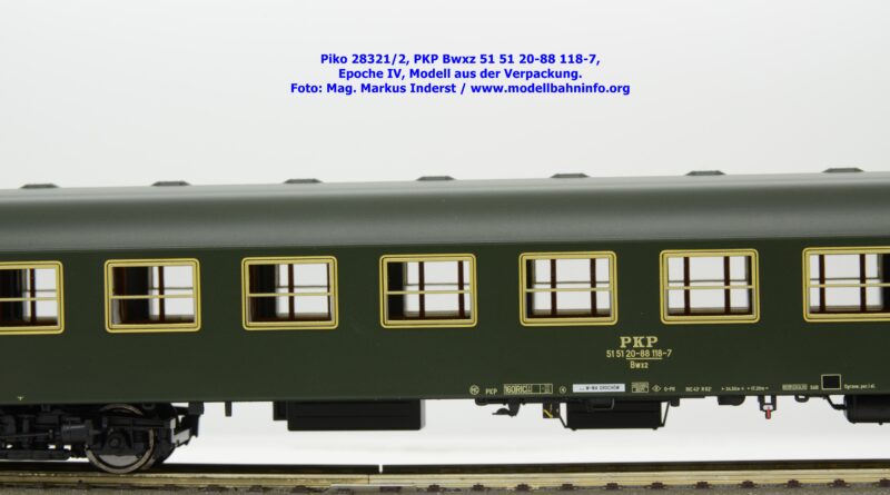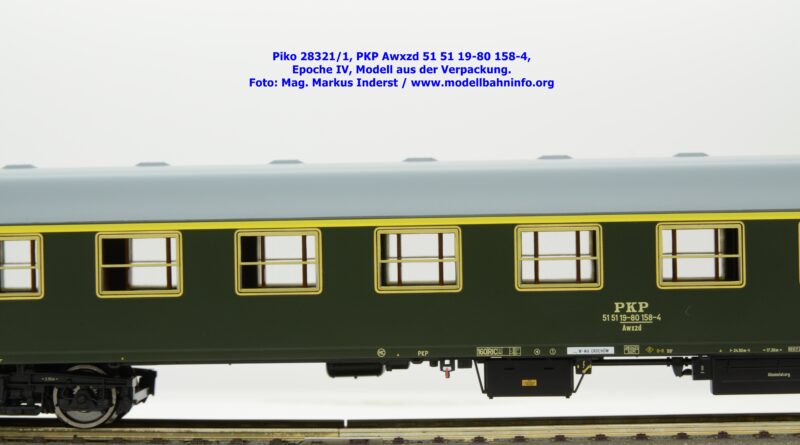 Der Sonneberger Hersteller fällt bei seinem Neuheitenprogramm durch verschiedene Schwerpunkte seines Sortiments auf. Eines dieser Akzente ist in der Sortimentsausrichtung mit Fahrzeugen der polnischen Staatsbahn PKP zu erkennen. Nach der Neukonstruktion von Triebfahrzeugen und Güterwagen wurden als Formneuheit 2018 die Personenwagen der PKP-Typen 111A und 112A angekündigt. Die Angaben im Neuheitenblatt sind zwar nicht ganz korrekt, aber mit der Auslieferung der neukonstruierten Fahrzeuge schließt Piko eine weitere Lücke, die auch für den heimischen Modellbahner von Interesse sein könnten. Die ausgelieferten Fahrzeuge kamen bis ungefähr zum Jahrtausendwechsel mit internationalen Schnellzügen bis nach Wien und waren vor Triebfahrzeugen wie den Reihen 1014 oder 1146 gereiht. Piko liefert die Wagen in dunkelgrüner Farbgebung sowie zweifärbig aus, wobei der Wagen 1. Klasse rot/creme lackiert ist und der Wagen 2. Klasse hellgrün/creme. Die zweifärbigen Schnellzugwagen erhielten die Betriebsnummern Adu 50 51 19-40 029-7 und Bdu 51 51 20-30 295-2 und weisen Revisionsdaten aus dem Jahr 2000 auf. Die dunkelgrünen Personenwagen sind mit den Betriebsnummern Ad 51 51 19-80 146-9 und B 51 51 20-88 874-5 versehen und wurden letztmalig 1988 einer Revision unterzogen. Alle Modelle weisen feine Gravuren in der Fahrzeugkonstruktion, paßgenaue Fenstereinsätze, eine saubere und lupenreine Bedruckung sowie einen nachgebildeten Wagenboden auf.