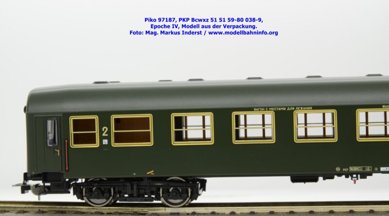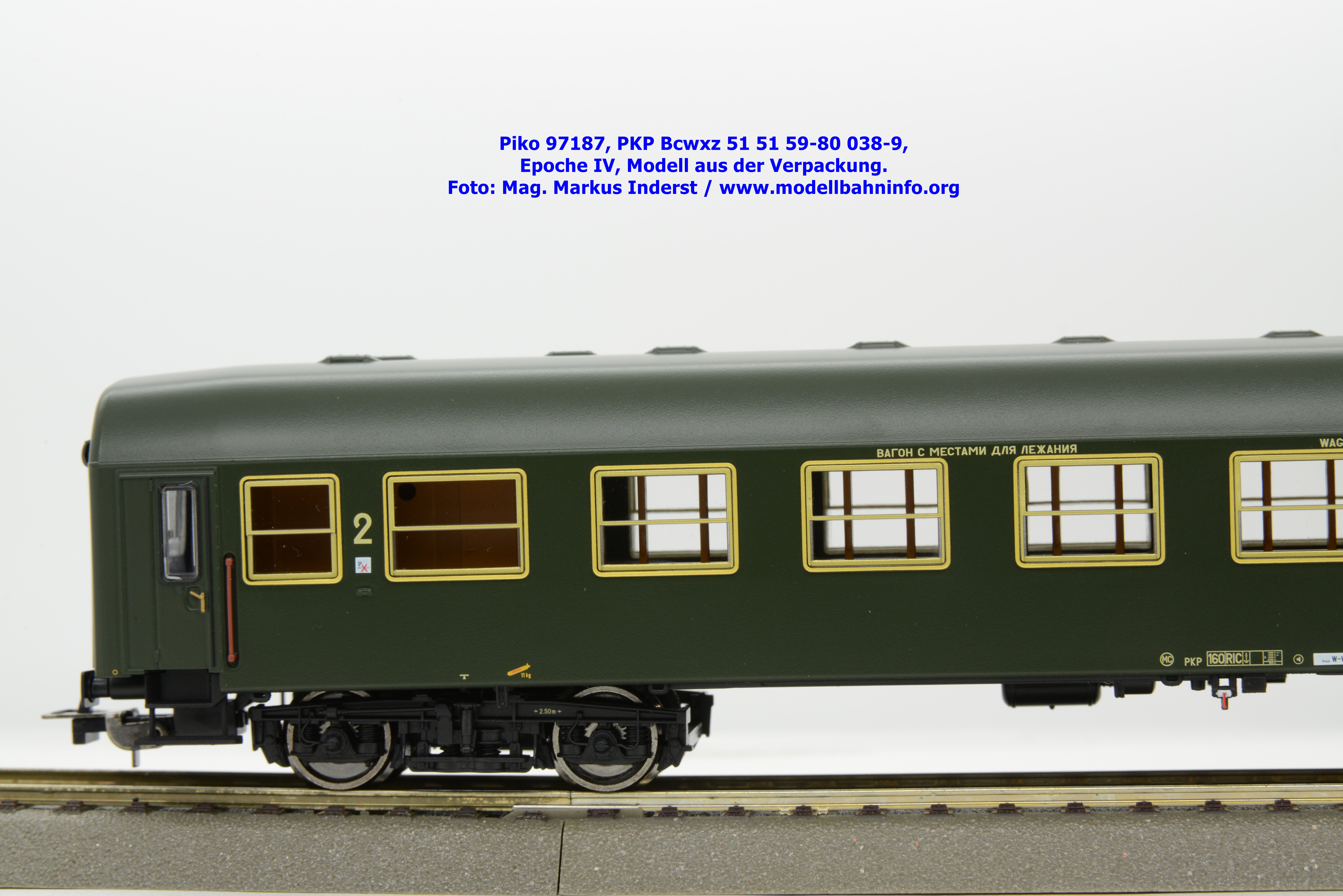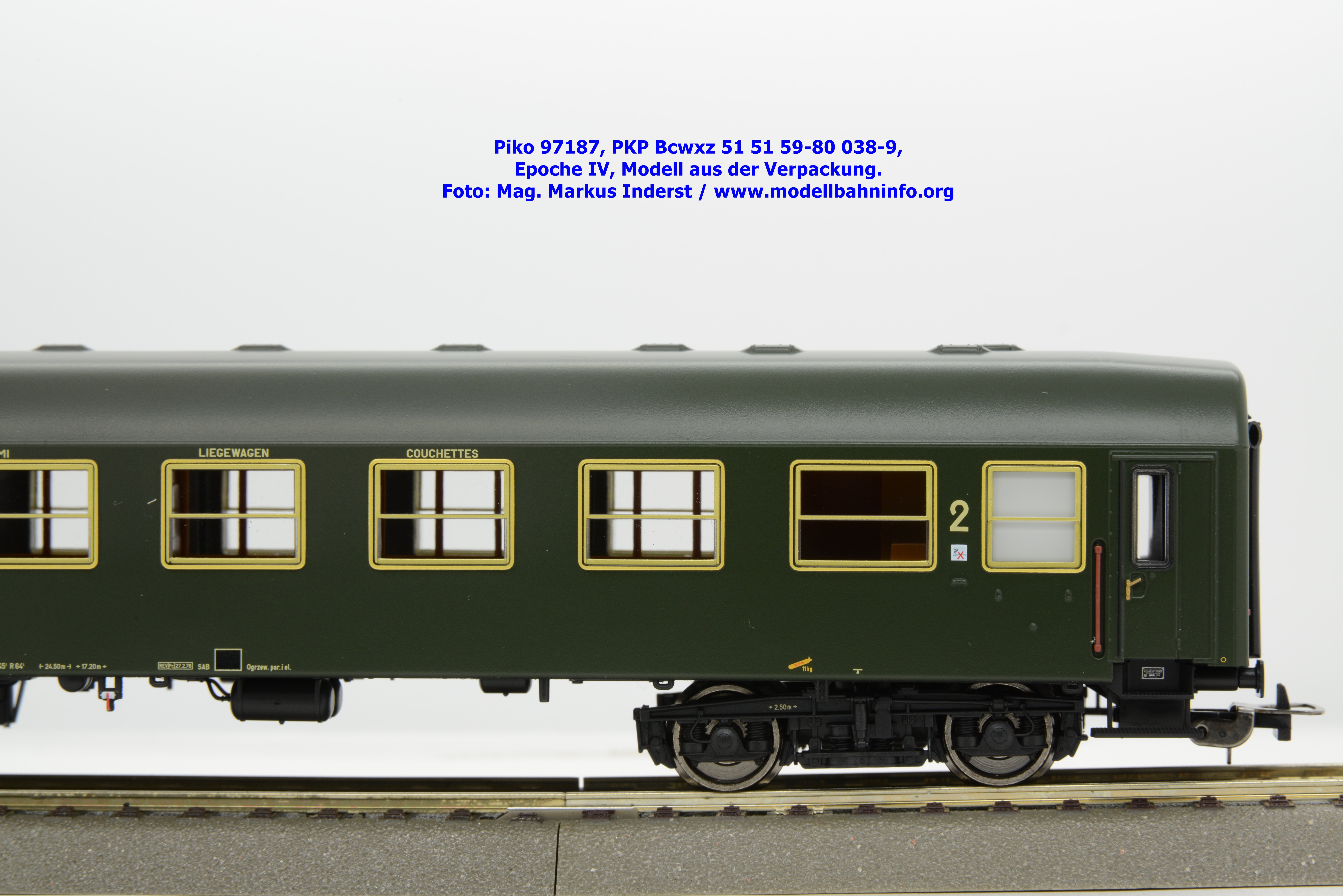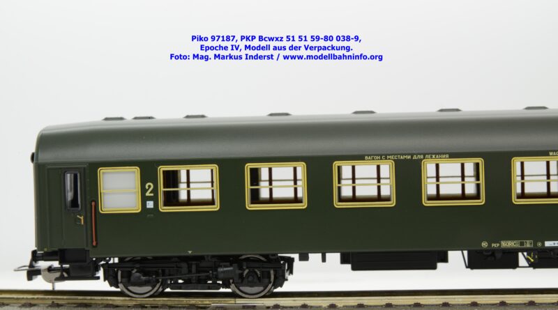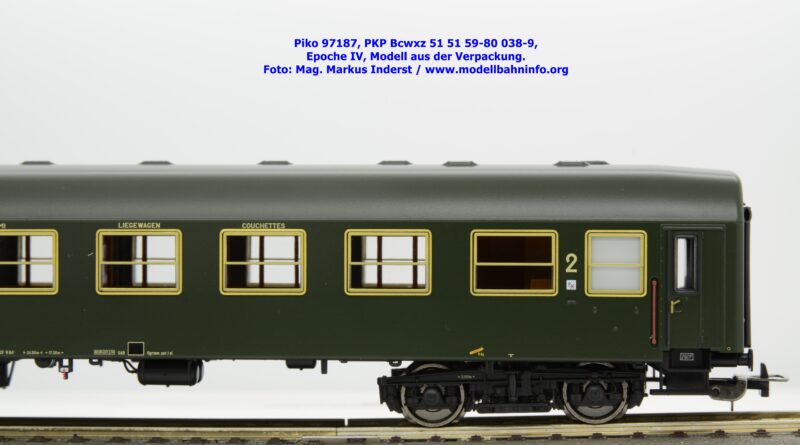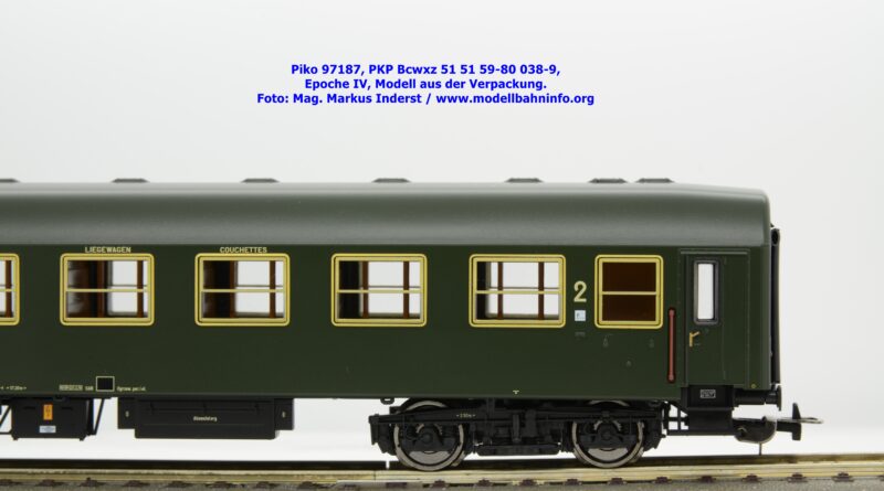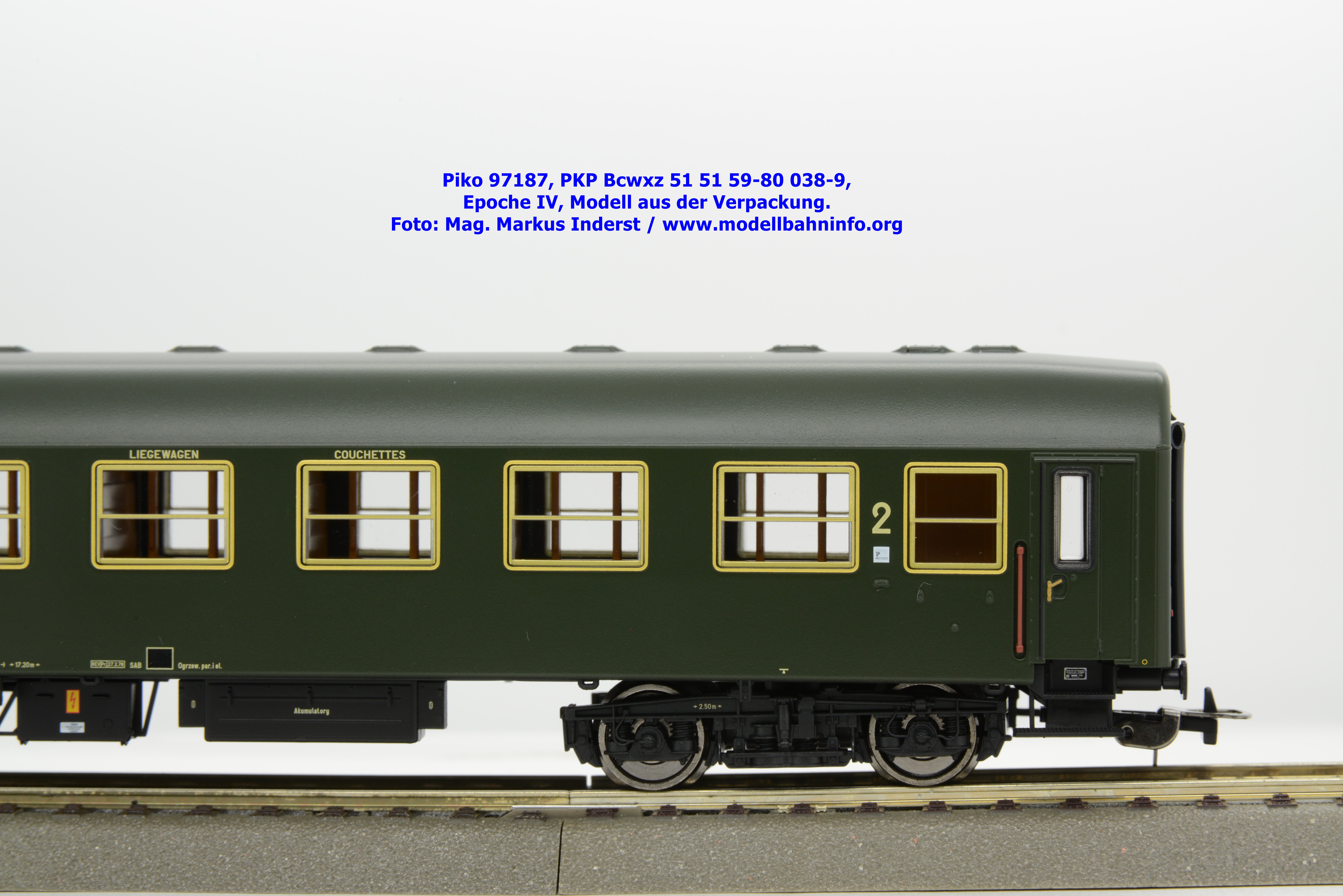 Der 2. Klasse Liegewagen wurde im Rahmen der neuen PKP-Modelle als Einzelwagen angekündigt und orientiert sich in der Aufmachung am vorigen Wagenset. Der grün lackierte Liegewagen ist mit der Gattungsbezeichnung Bcwxz und der Wagennummer 51 51 59-80 038-9 bedruckt. Heimatbahnhof ist wiederum Warschau-Grochów. Im Revisionsraster steht das Untersuchungsdatum REV Pr 27. 2.78. Das Modell ist zum UVP von € 71,99.