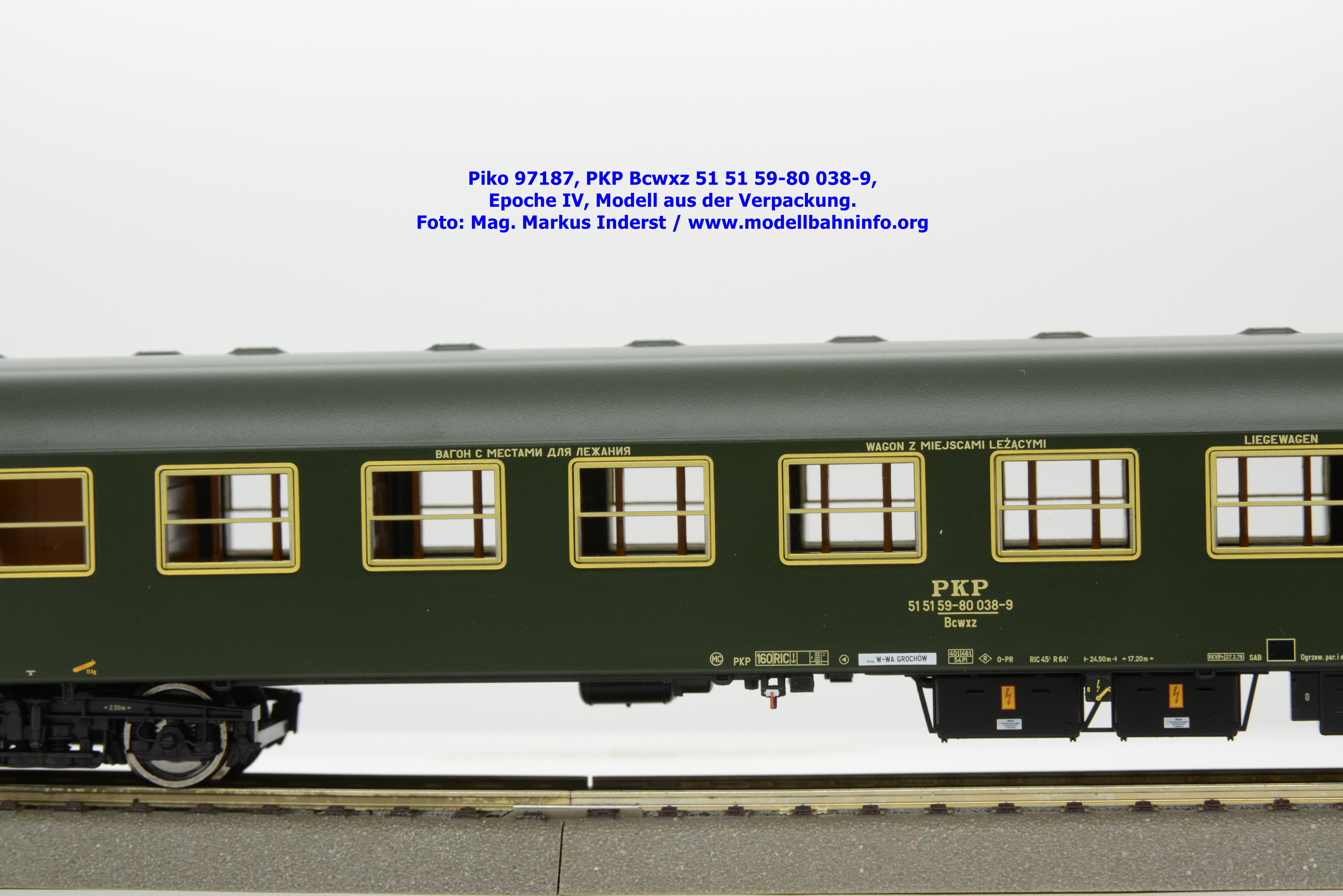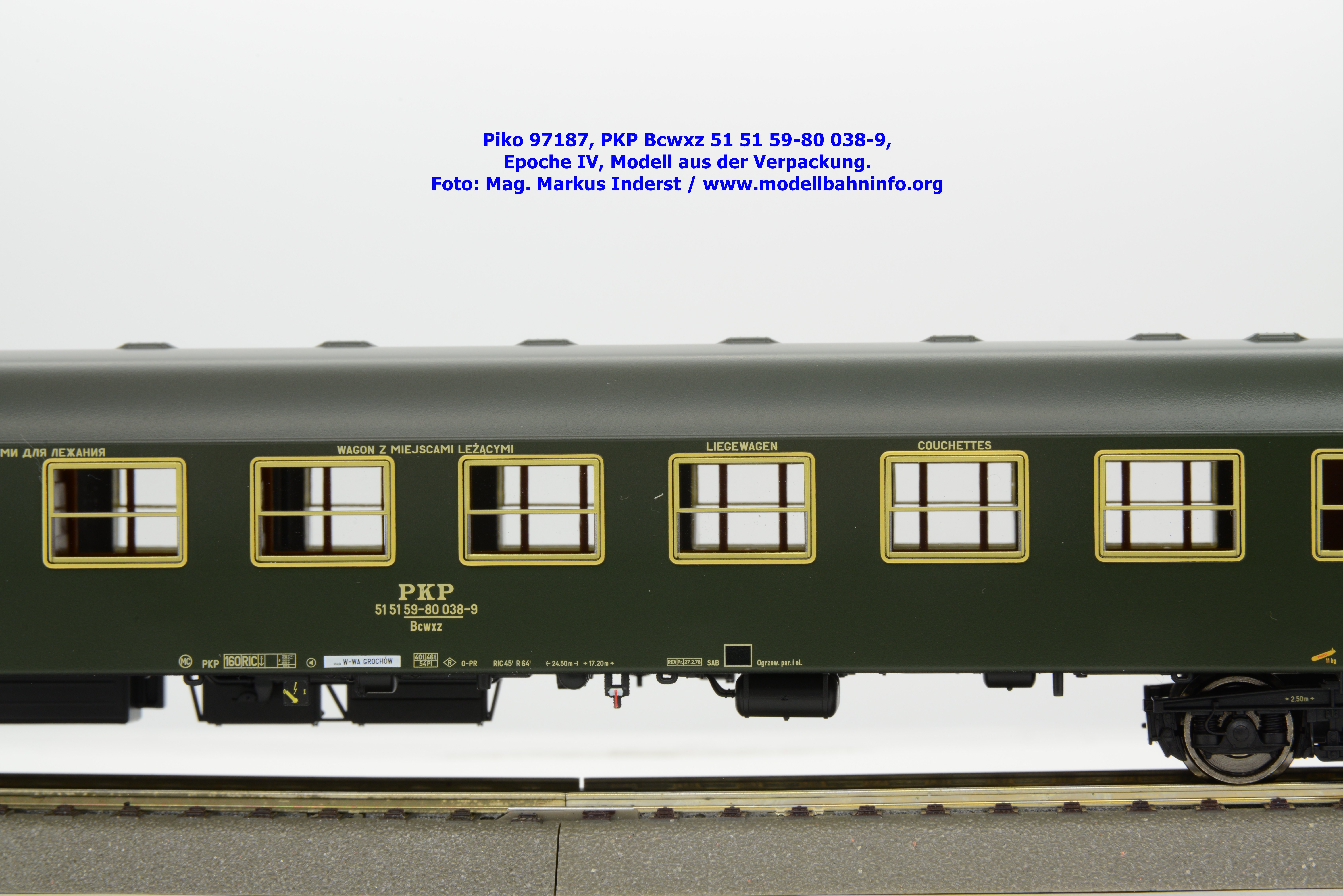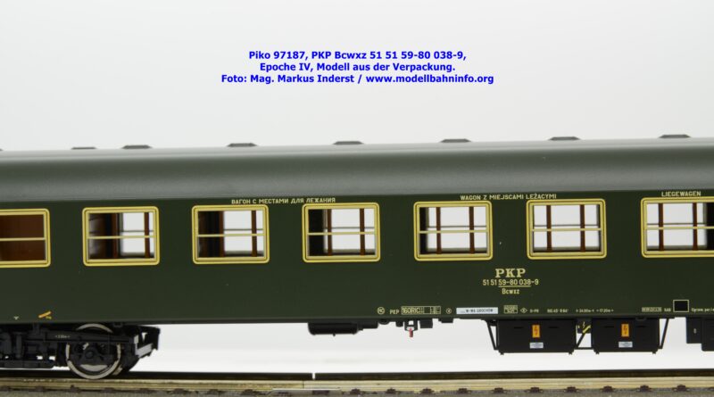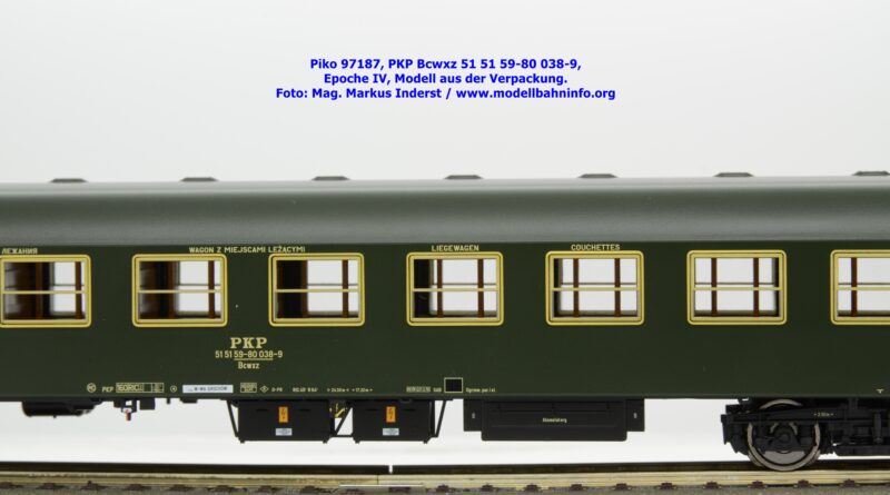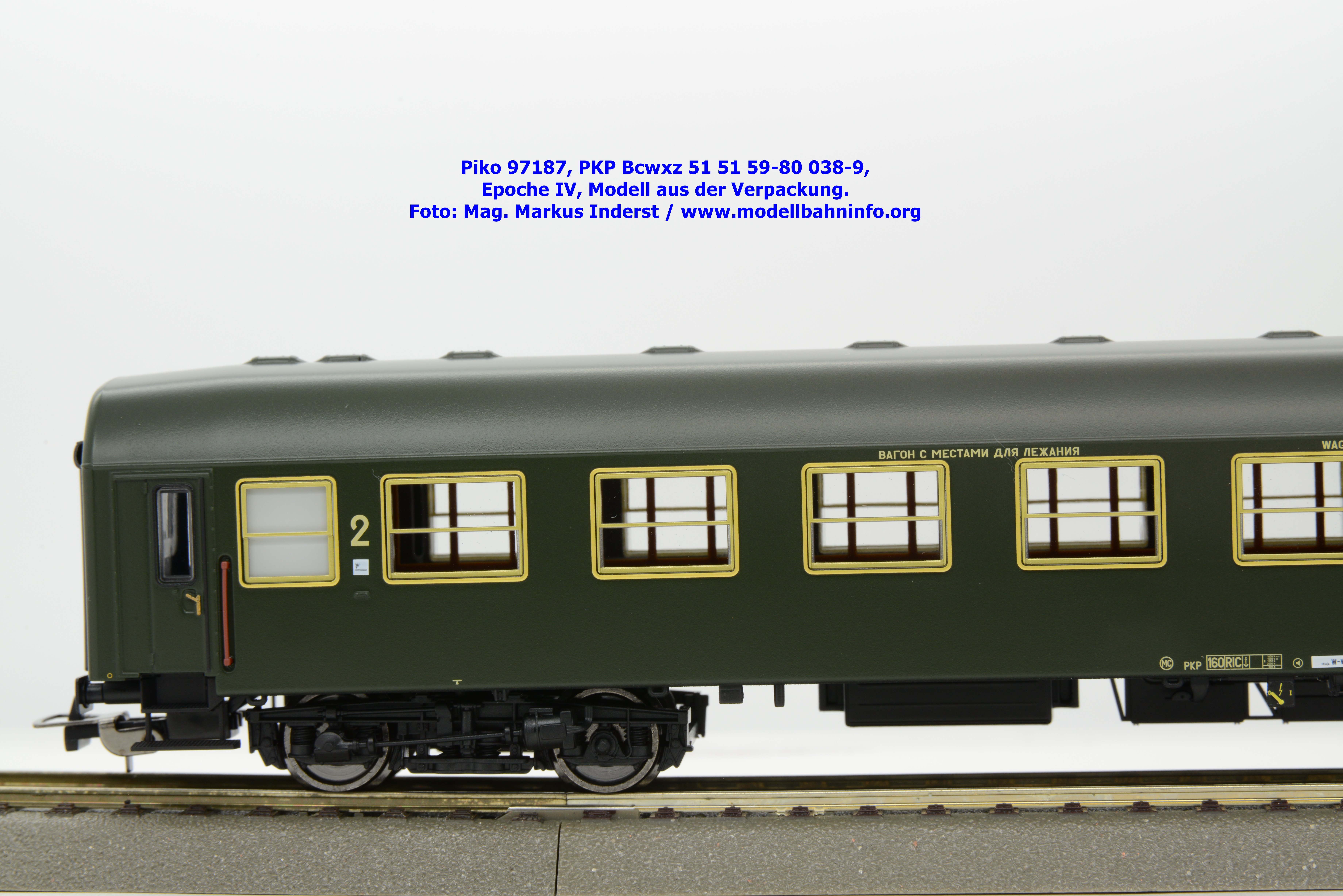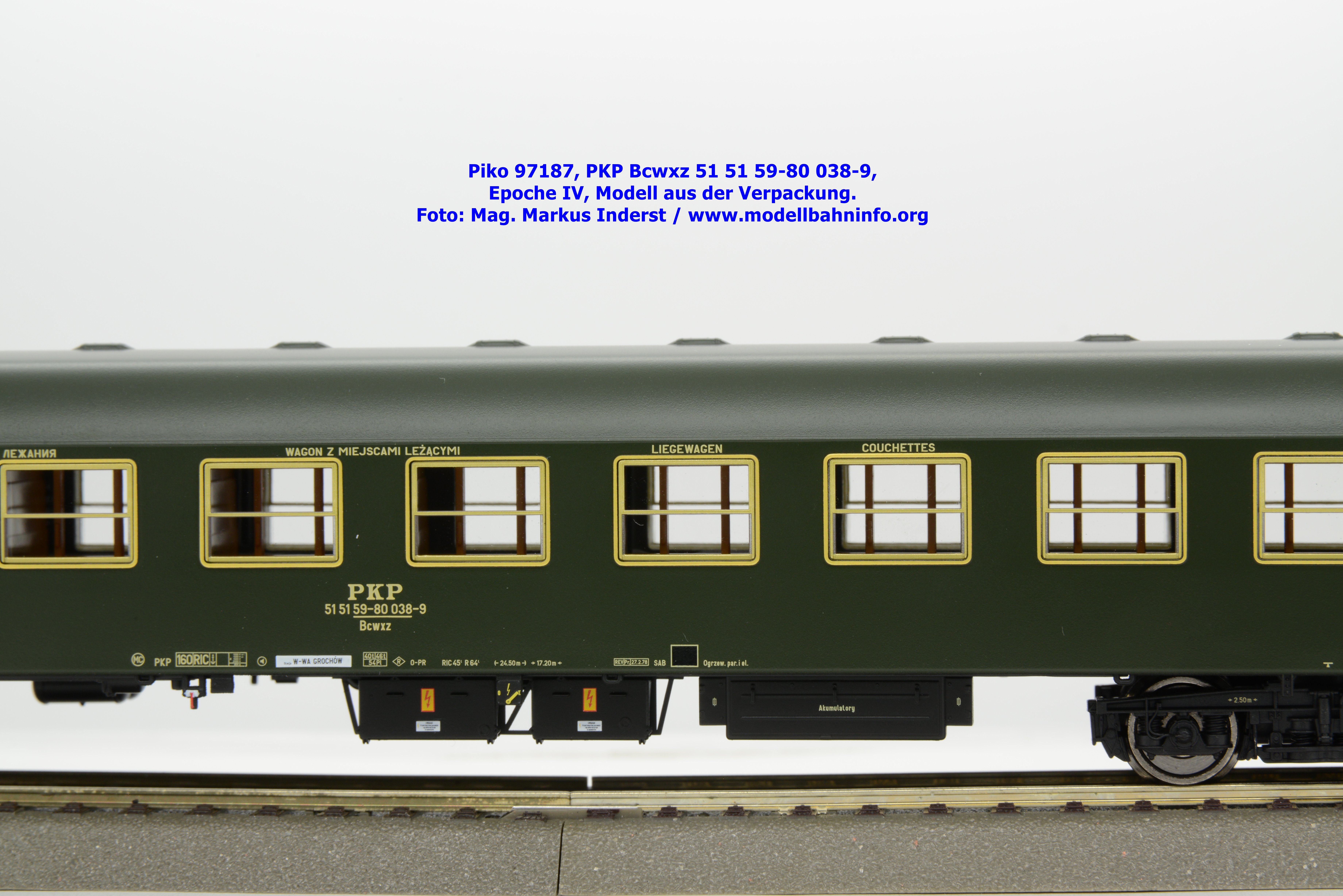 Der 2. Klasse Liegewagen wurde im Rahmen der neuen PKP-Modelle als Einzelwagen angekündigt und orientiert sich in der Aufmachung am vorigen Wagenset. Der grün lackierte Liegewagen ist mit der Gattungsbezeichnung Bcwxz und der Wagennummer 51 51 59-80 038-9 bedruckt. Heimatbahnhof ist wiederum Warschau-Grochów. Im Revisionsraster steht das Untersuchungsdatum REV Pr 27. 2.78. Das Modell ist zum UVP von € 71,99.