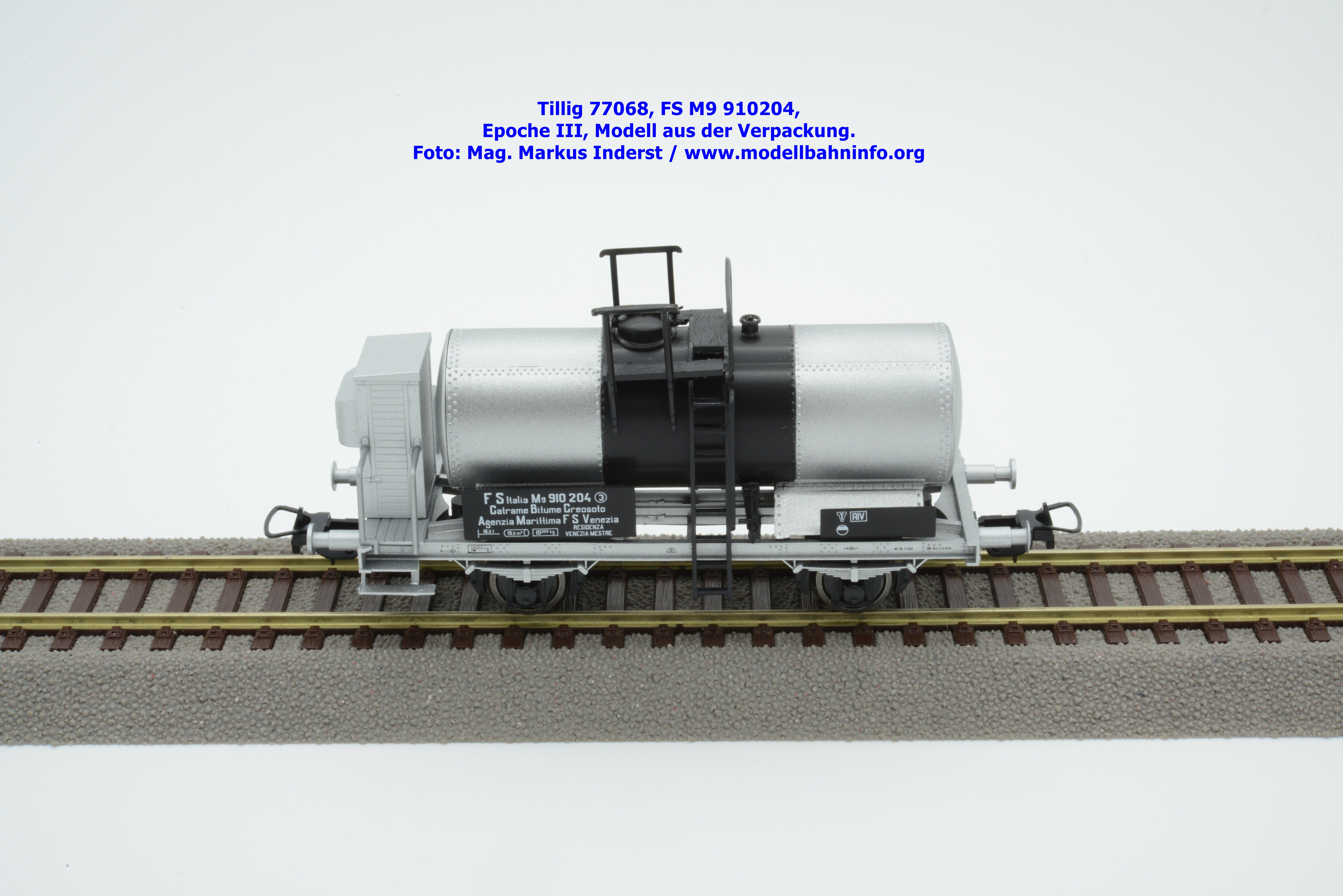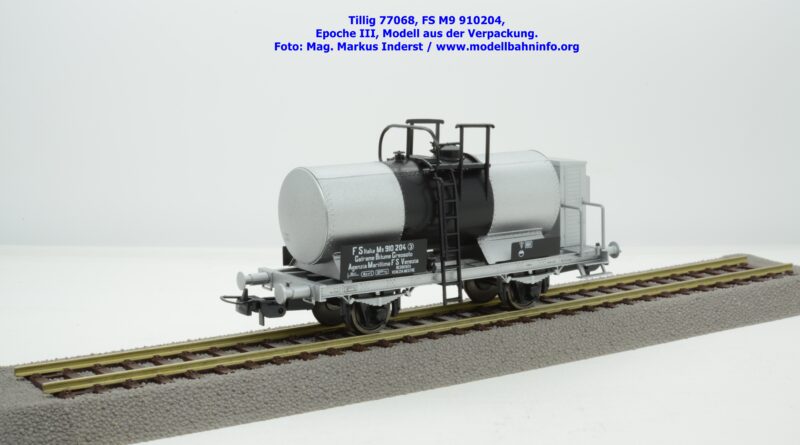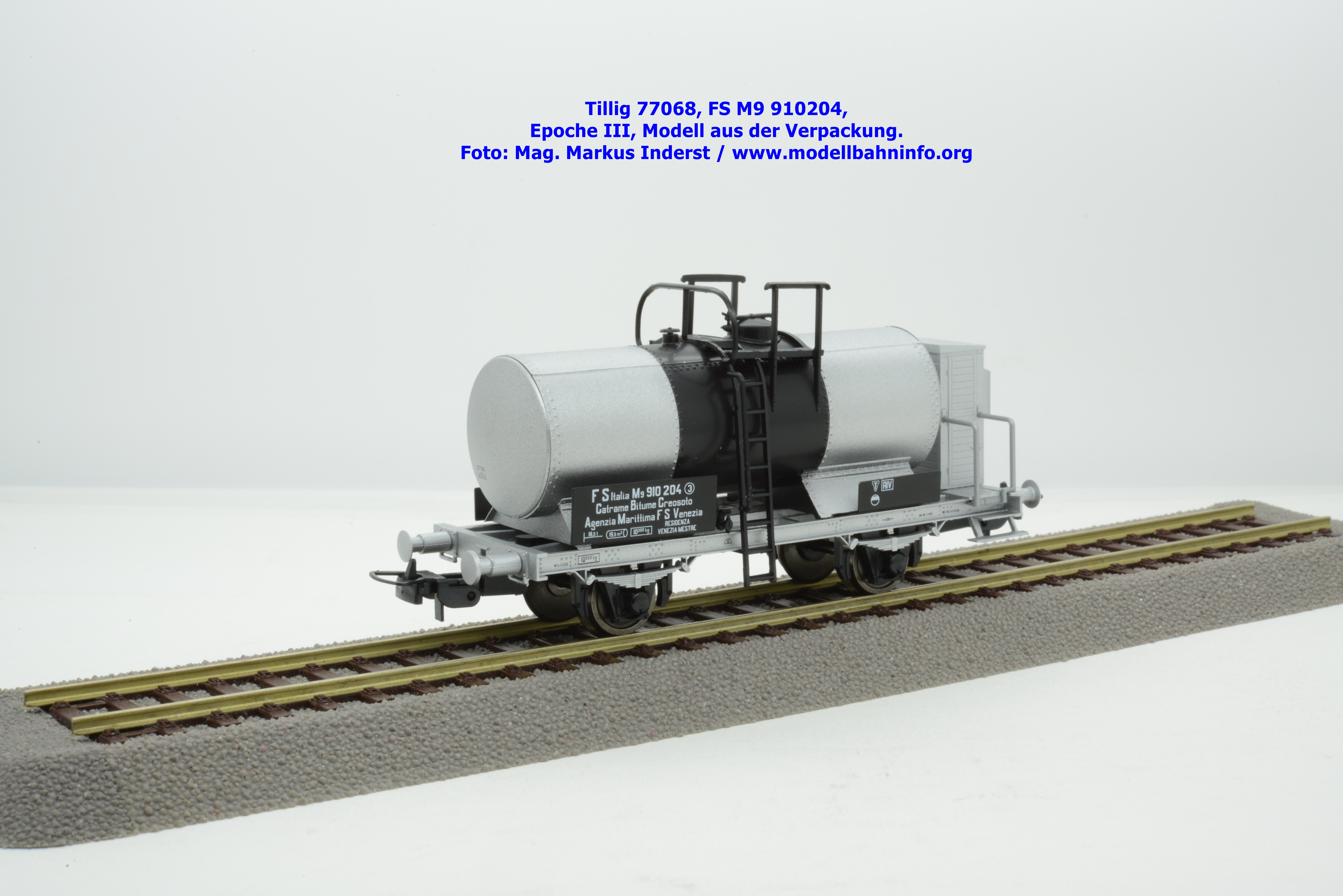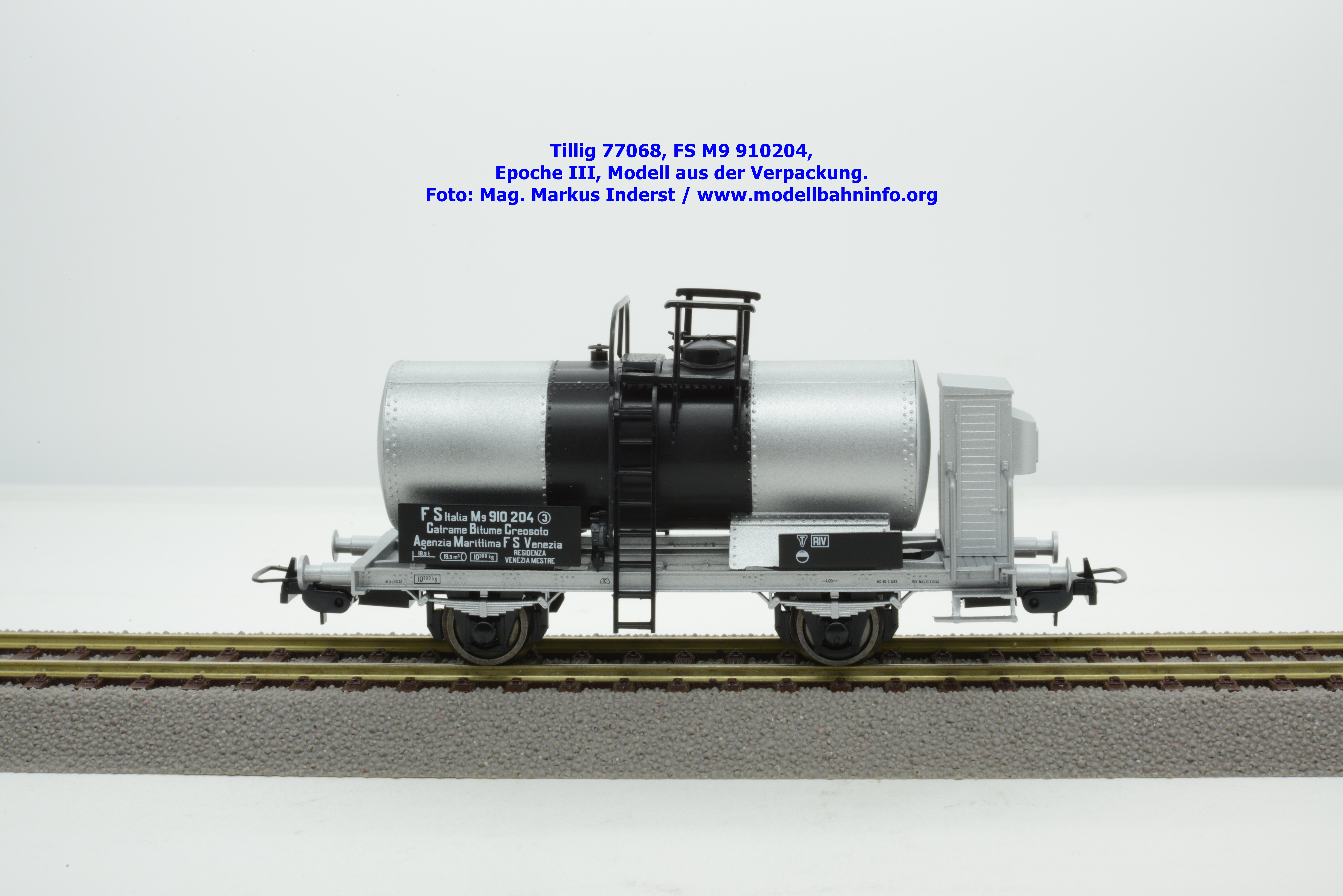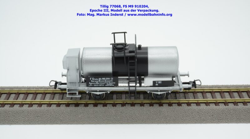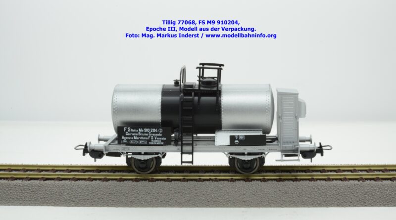 Die Herbstneuheiten 2025 beinhalten einen zweiachsigen Kesselwagen älterer Bauform für die Italienischen Staatsbahnen FS. Der Kesselwagen ist mit den Anschriften M9 910204 versehen und dient scheinbar dem Transport von Bitumen. Als Heimatbahnhof ist Venedig angeschrieben. Im Revisionsraster stehen die Untersuchungsdaten mit MC 80 3. 5.53. Der Wagen ist dem RIV-Austauschverhältnis unterstellt. Das Modell ist zum UVP von € 44,90 belegt.