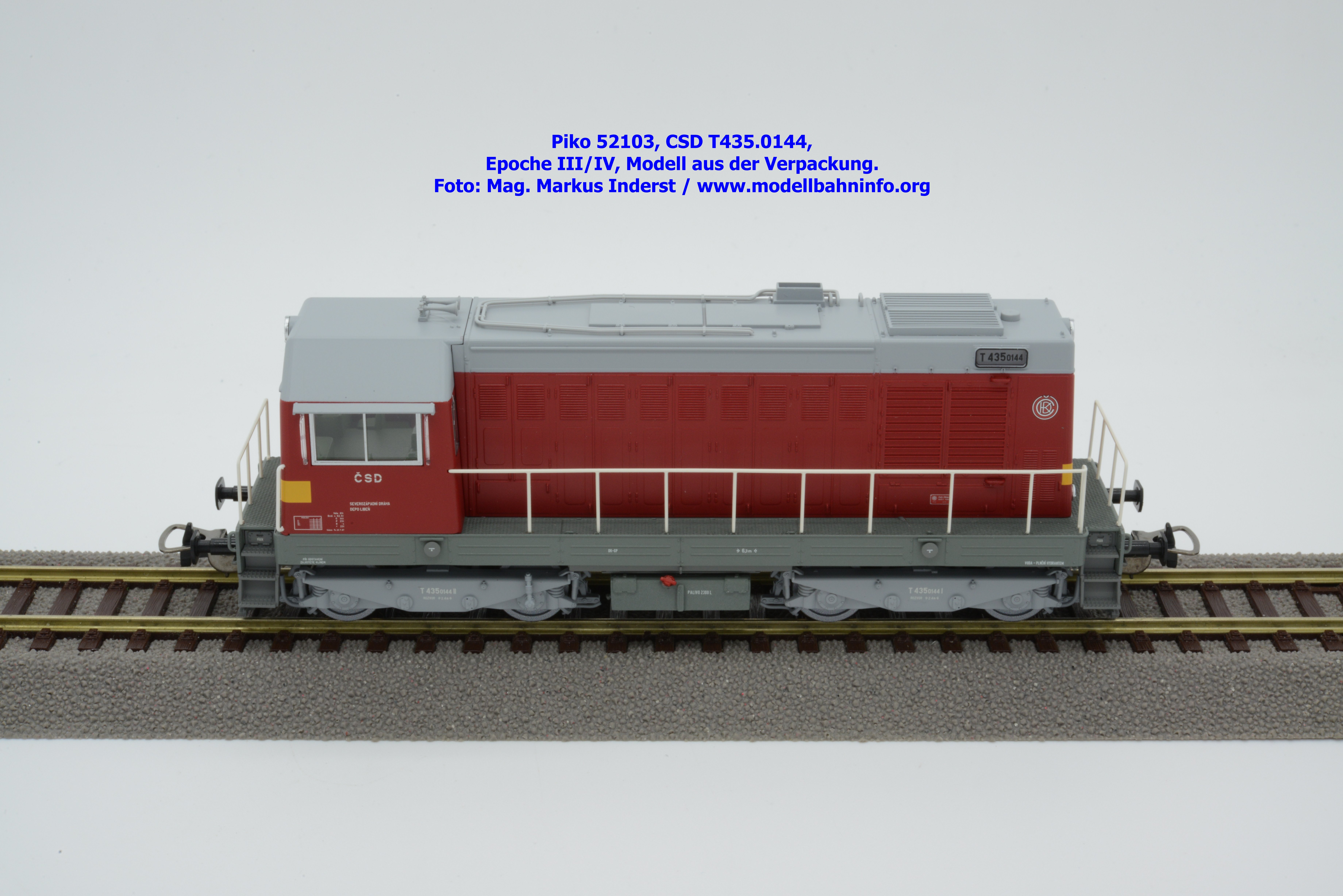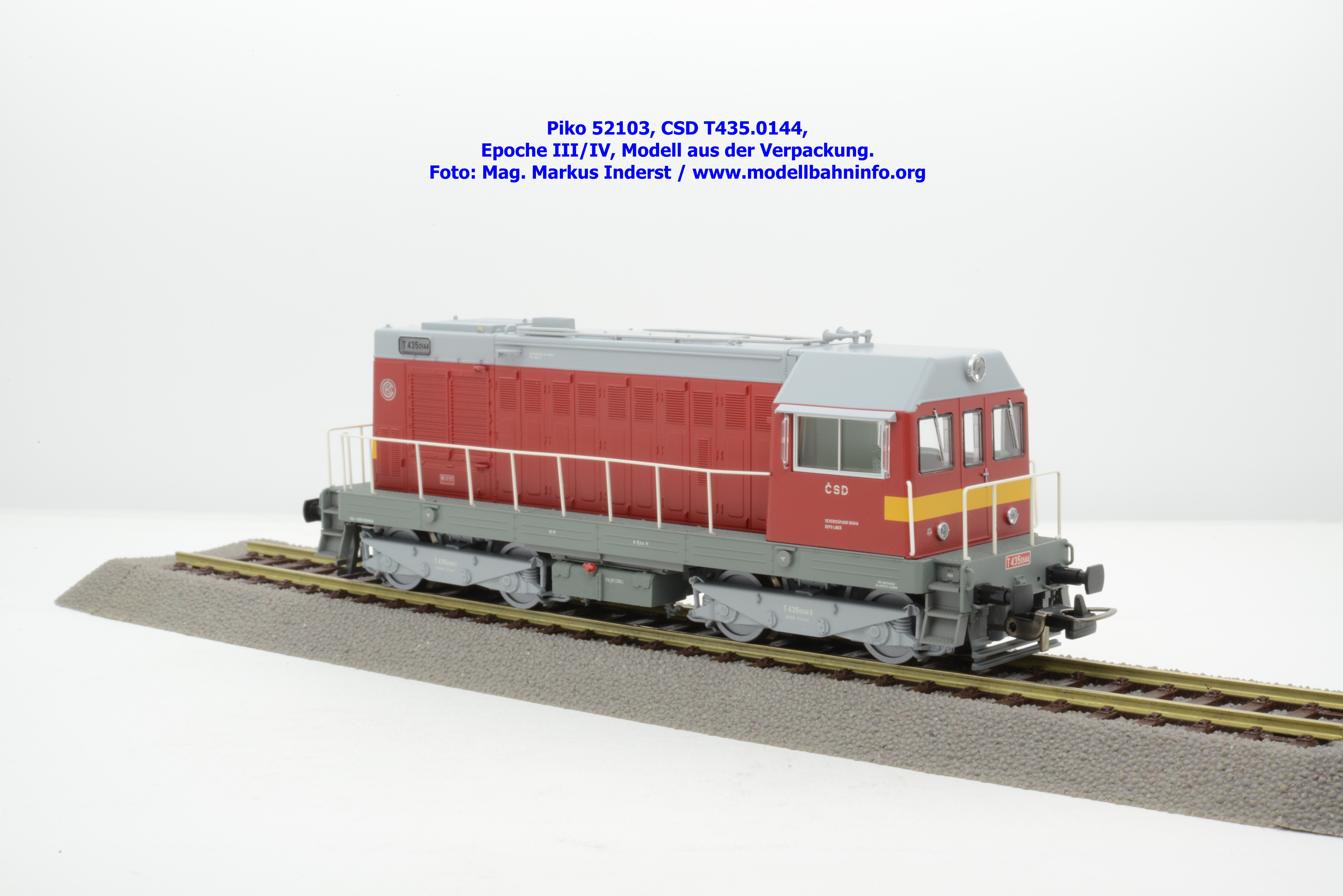 Auch diese Farbvariante der Baureihe T435 der CSD hat es schon gegeben. Piko legte diese Variante nochmals im Rahmen der Herbstneuheiten 2025 auf, allerdings verfügt das Modell an den Stirnfronten über einen gelben Warnbalken. Die T435.0144 ist dem Depot Liben zugewiesen. Auf der linken Seitenwand des Führerhauses sind einige Betriebsanschriften zu sehen, unter anderem auch das letzte Untersuchungsdatum mit Tb. 20. 7.87. Die Mittelführerstandslokomotive ist nur als Zweileiter-Gleichstrommodell erhältlich. Die analoge Ausführung ist unter der oben genannten Artikelnummer und zum UVP von € 209,– verfügbar, die digitale Gleichstrom-Ausführung unter der Artikelnummer 52104 und zum erhöhten UVP von € 319,–.