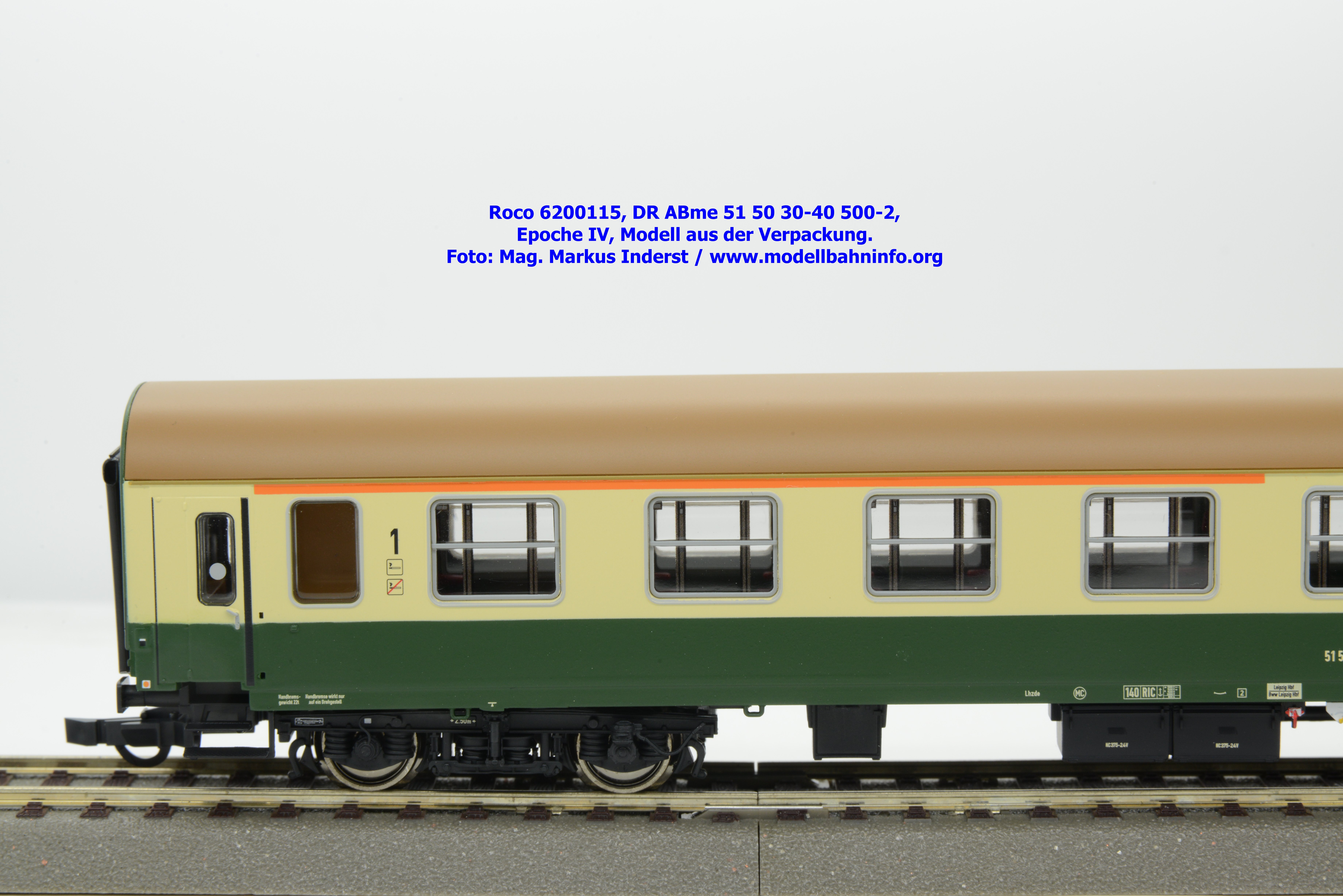 Im letztjährigen Neuheitenprogramm sind auch die Halberstädter Schnellzugwagen der 1. Klasse im IEx-Design enthalten. Von dieser Lackierungsvariante hat Roco zwei Modelle mit unterschiedlichen Betriebsnummern angekündigt. Das erste Modell ist mit der Wagennummer 51 50 10-80 012-3 und der Gattungsbezeichnung Am angeschrieben. Der sauber lackierte Wagen hadert etwas mit der Digitalbedruckung, indem einzelne Anschriften nicht ganz lupenrein lesbar sind. Der Wagen ist in Berlin-Rummelsberg beheimatet und weist die Revisionsanschriften REV Hlb 27.10.89. Das Modell ist zum UVP von € 64,90 erhältlich.